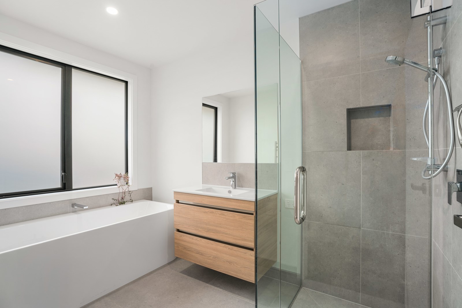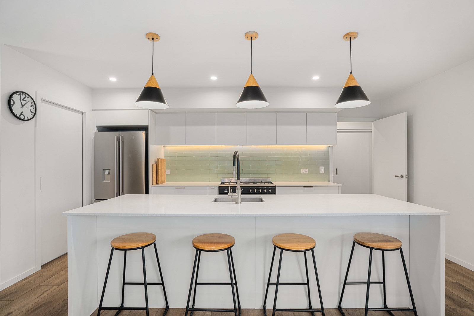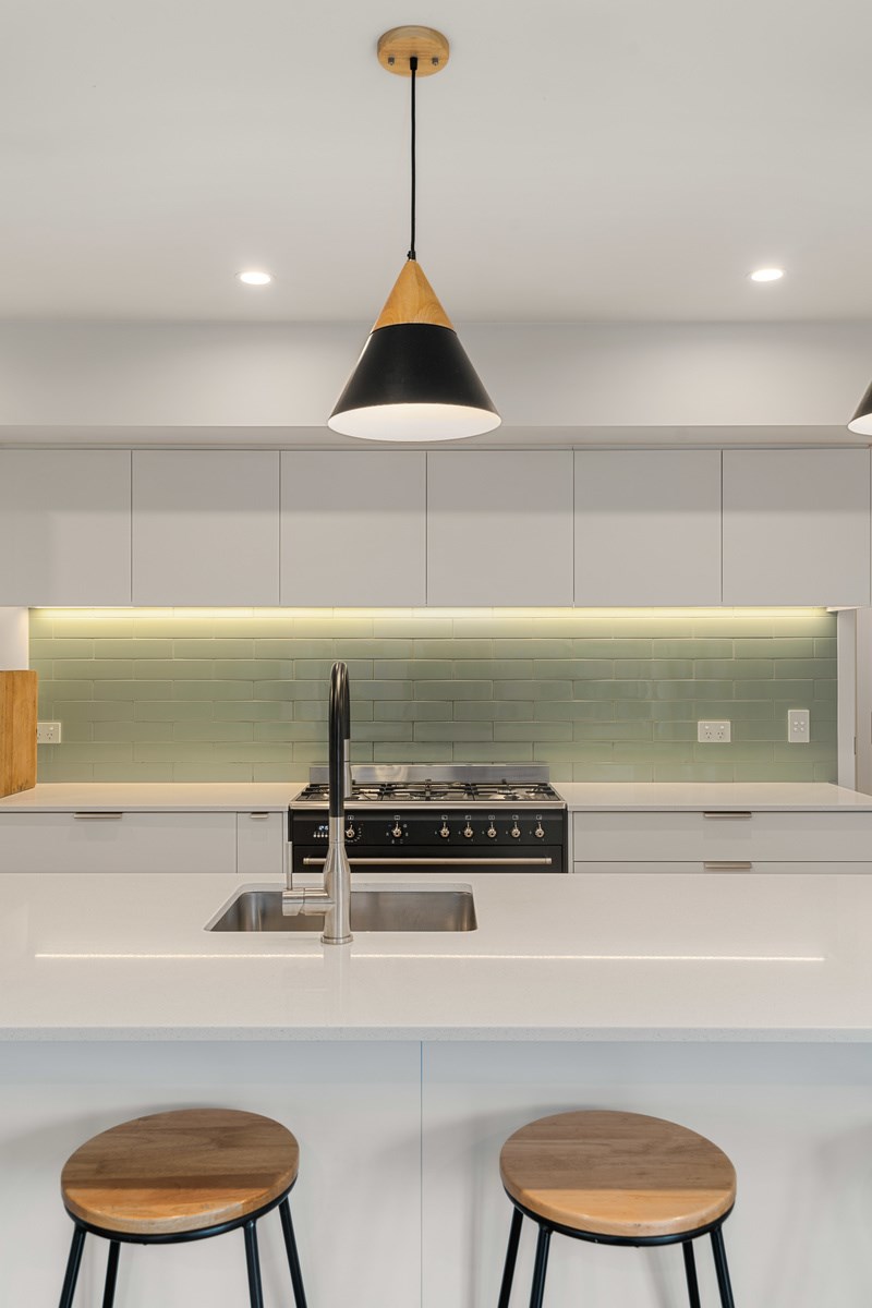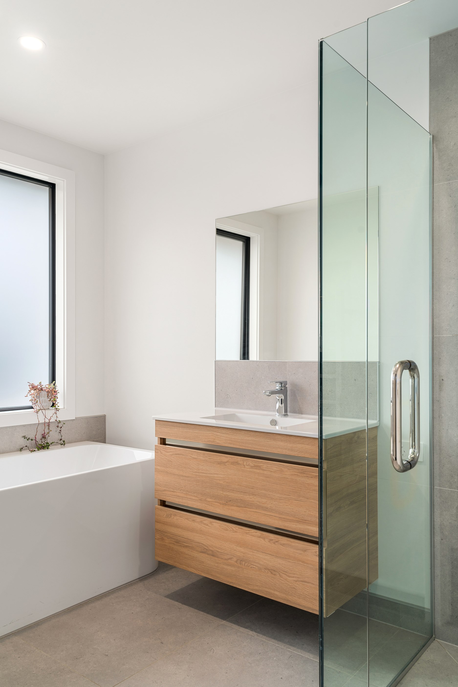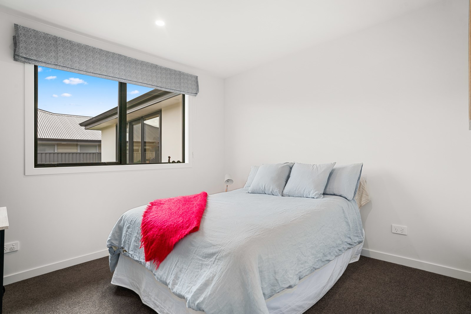 Twin gables, open-plan living, four bedrooms and two bathrooms — welcome to your ideal family home. Add a double garage, separate lounge, flat section and L-shaped deck, and this 180sqm house goes from ideal to next-level appeal. You can never go wrong with a classic design and this one, with a vertical western red cedar and plaster exterior and dark steel roof, is a case in point. Lines of stacked schist break up the front lawn and tie the house to its Central Otago locale. Open the front door and you won’t be disappointed. There’s an instant feeling of space, thanks to crisp walls and a streamlined white-on-white kitchen with a walk-in pantry. Don’t assume that pale means boring. Far from it. A trio of pendants hovering above the island and a splashback in pale mint tiles ramp up the interest. The carpeted lounge off the side of the open-plan zone benefits from lots of double glazing and can be closed off with double cavity sliders. Anyone for a movie? A central hallway leads to the bedrooms and bathroom with a tiled shower, wood-look floating vanity and bath. The main bedroom, at the end of hall for privacy and space, has a walk-in wardrobe, ensuite and plenty of natural light. This is a modern classic, pure and simple.