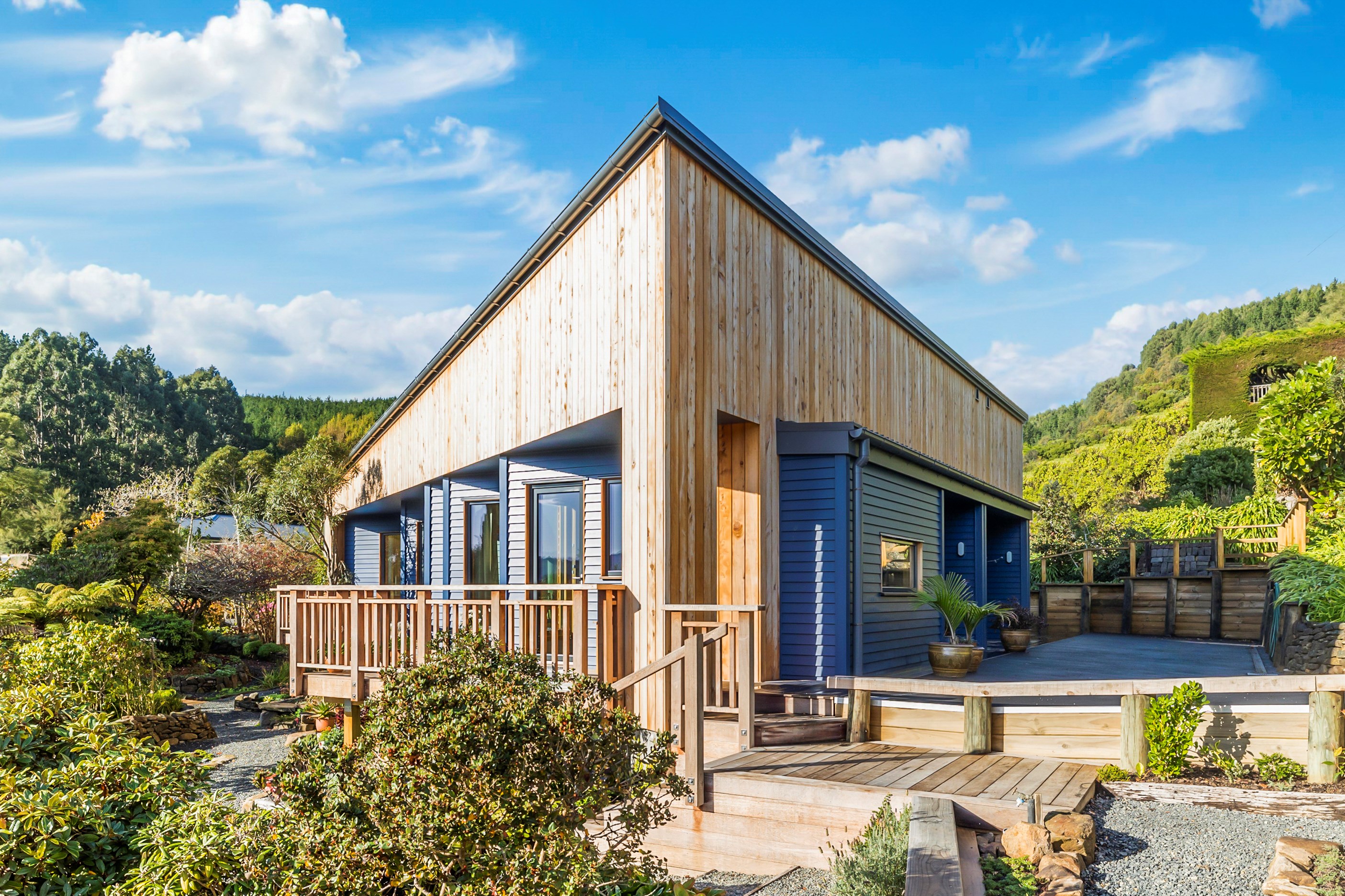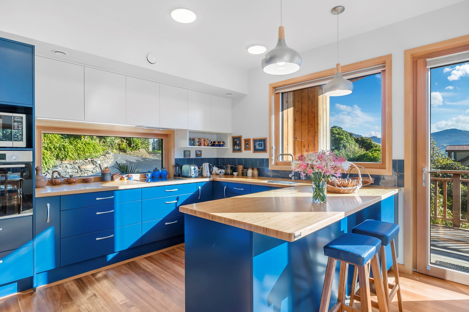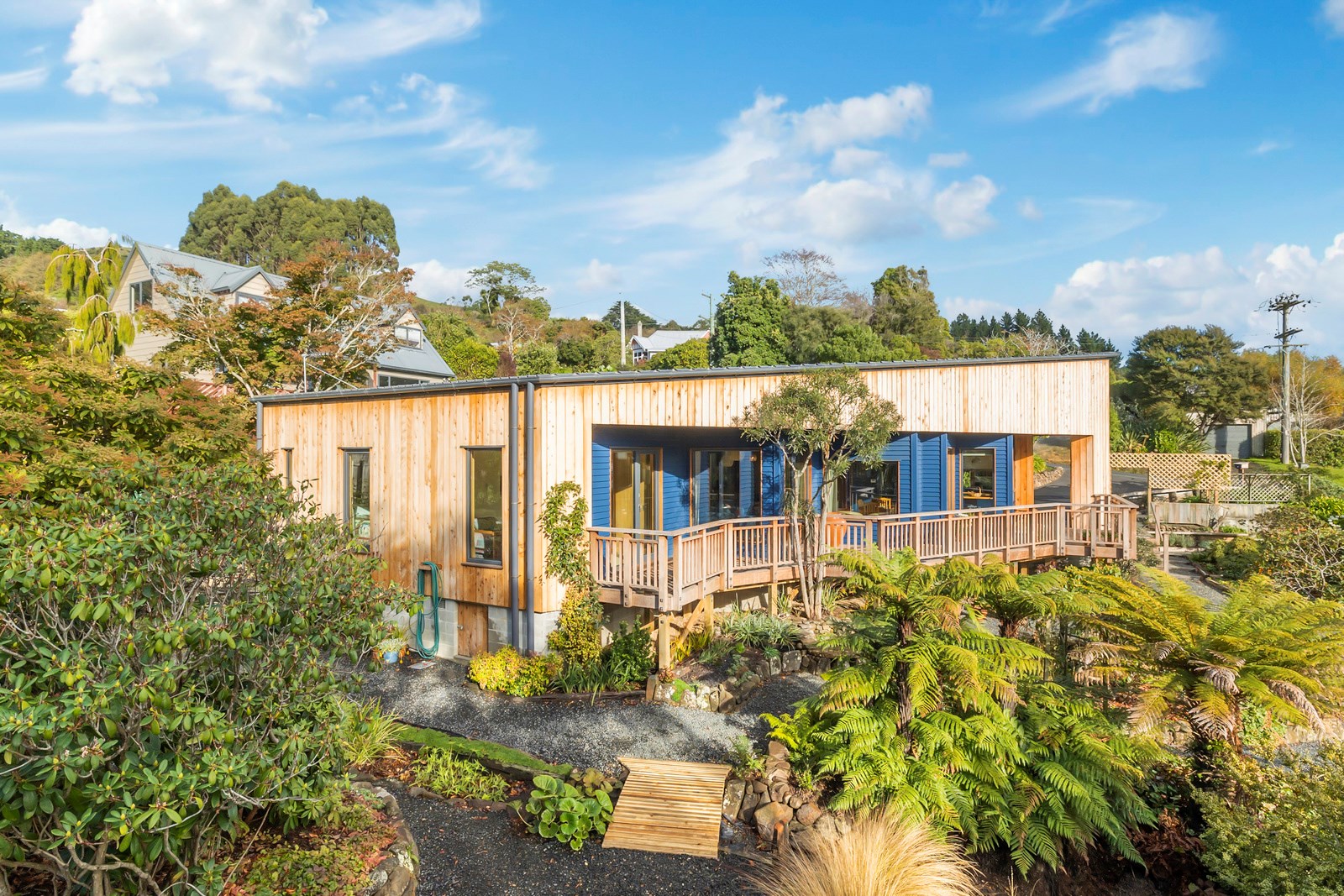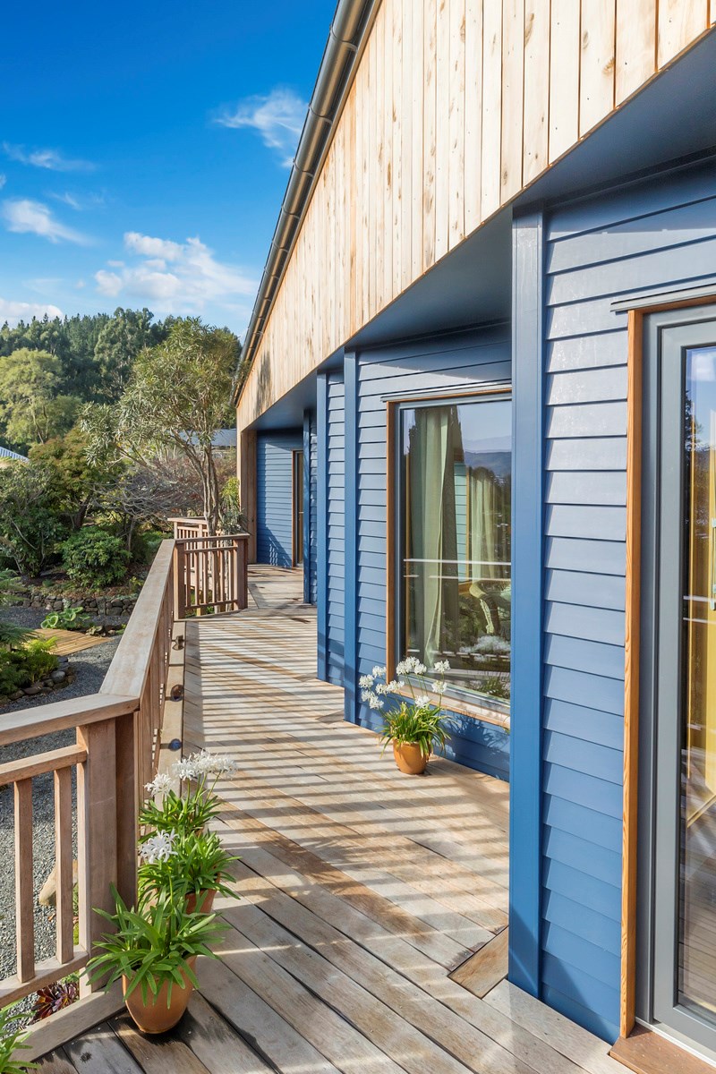 The owners of this Dunedin home had been living in a house on the lower part of their elevated peninsula section, so knew exactly what they wanted. Their new home, in vertical macrocarpa shiplap and azure-coloured weatherboards to reflect its coastal position, had to settle into the south-west corner of the site. From here they could enjoy views of the garden from every room of the house and every part of the deck. And what a garden it is: think meandering gravel paths, native plants, flowers and drystone volcanic rock walls. So important was this wonderland, that the house layout was determined by the location of trees, and a deck outside one bedroom was built around a native lancewood. The 141sqm wedge-shape monopitch-roof design also enjoys carefully planned views over the trees to the blue of the Otago harbour. The three-bedroom house offers further clues about the clients’ appreciation of nature and natural materials. Features such as cut-outs, like the one at the entry, and stepped windows put the spotlight on the great outdoors. Inside more of the vivid blue is contrasted with timber — in the floorboards, architraves, joinery, skirting, doors, trims and furniture. It’s a natural-born winner.