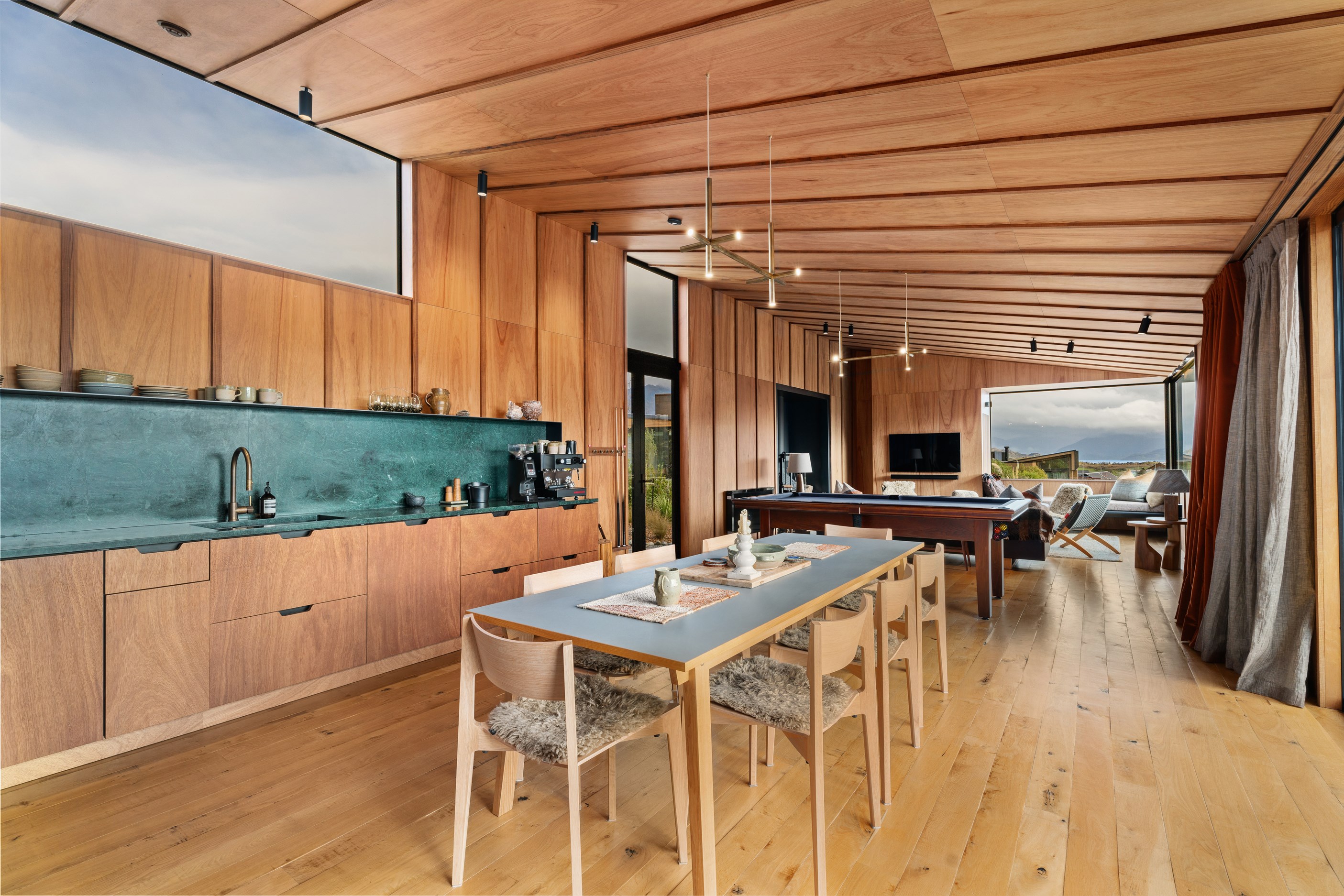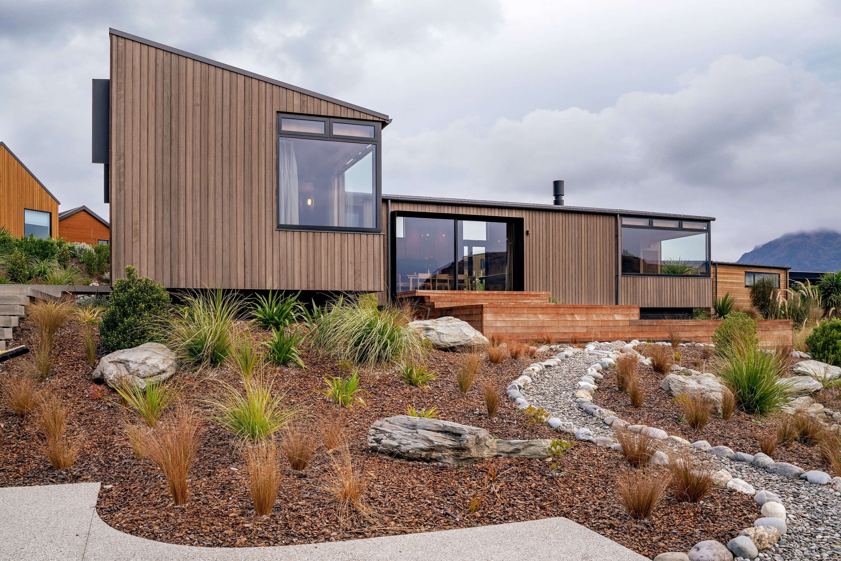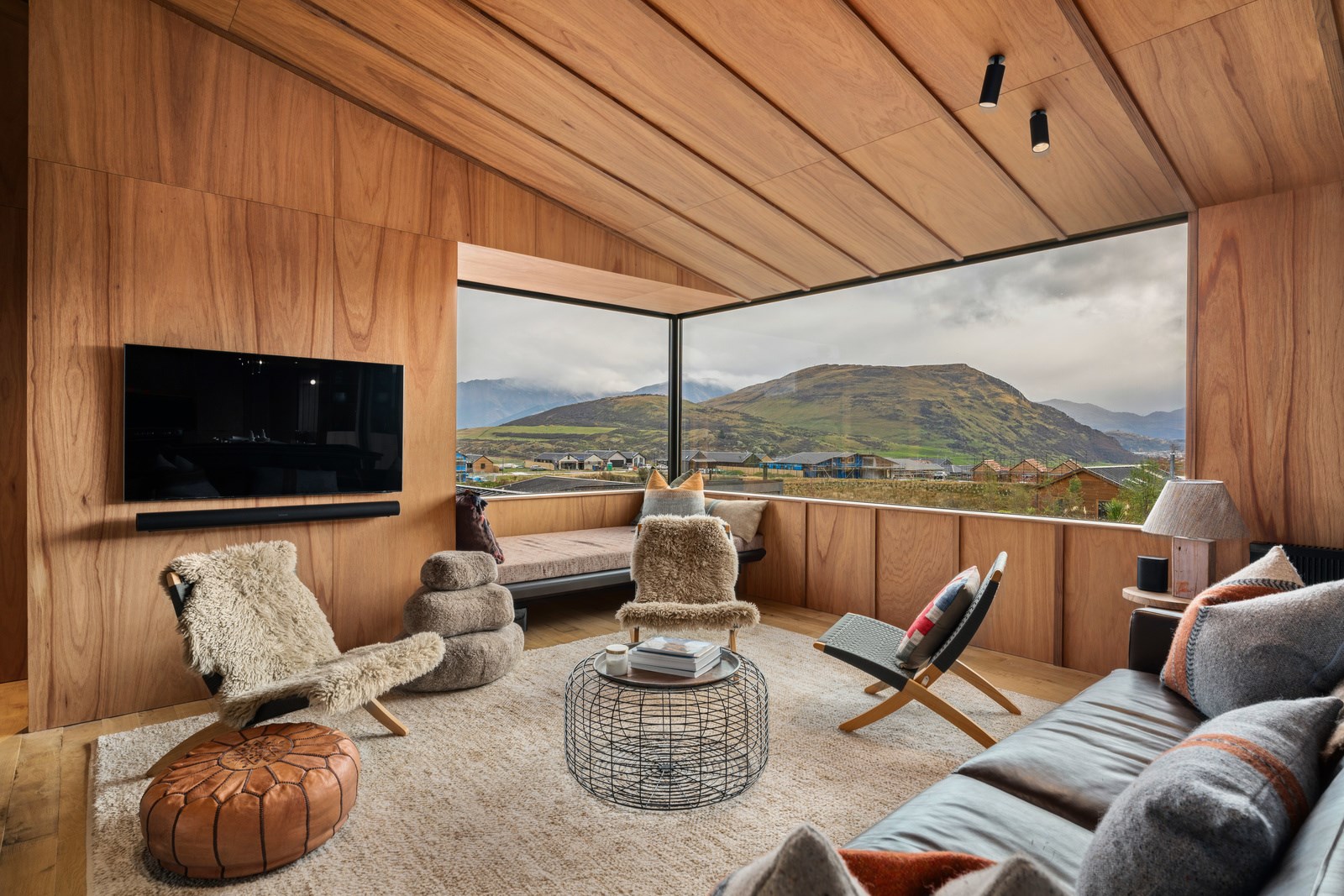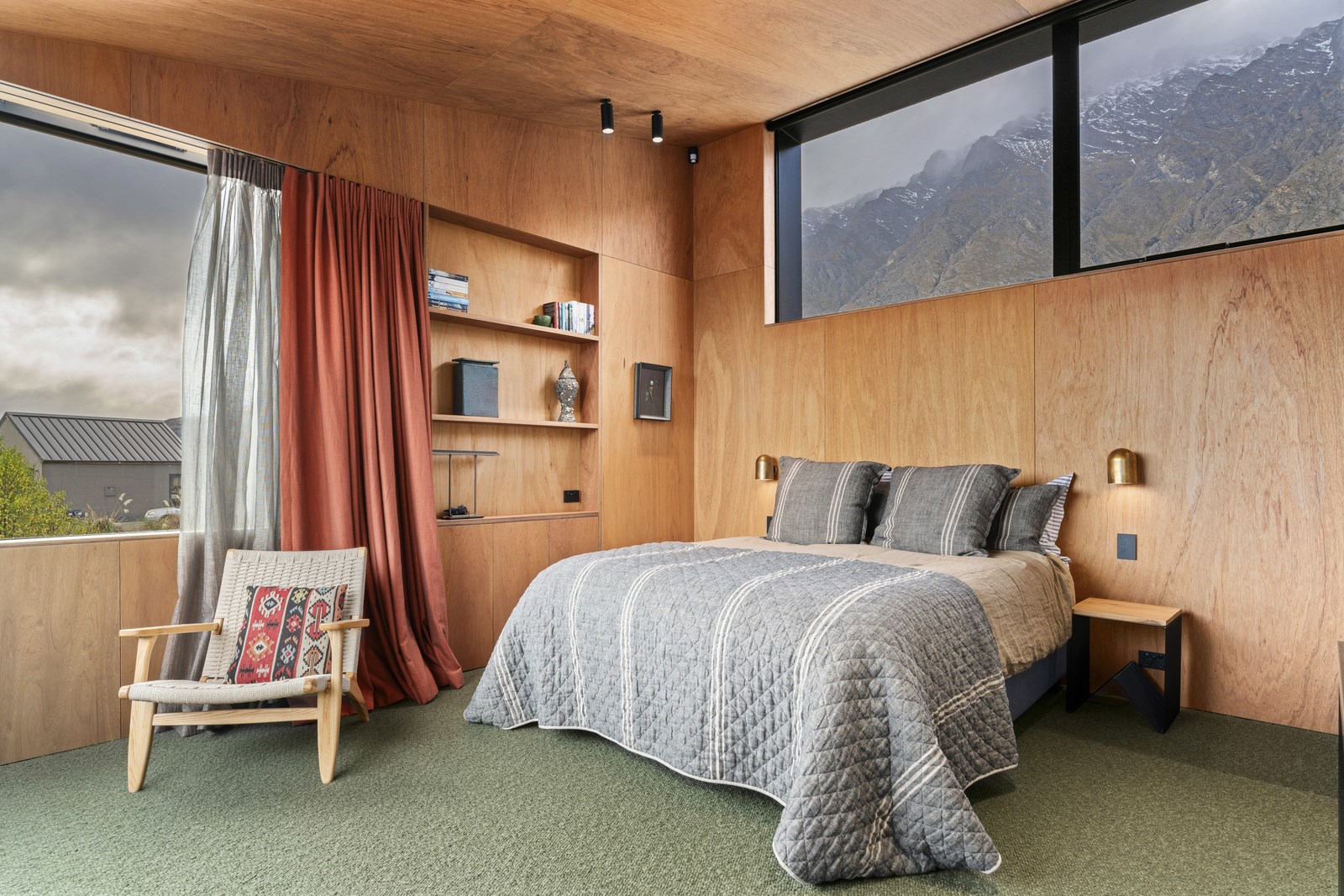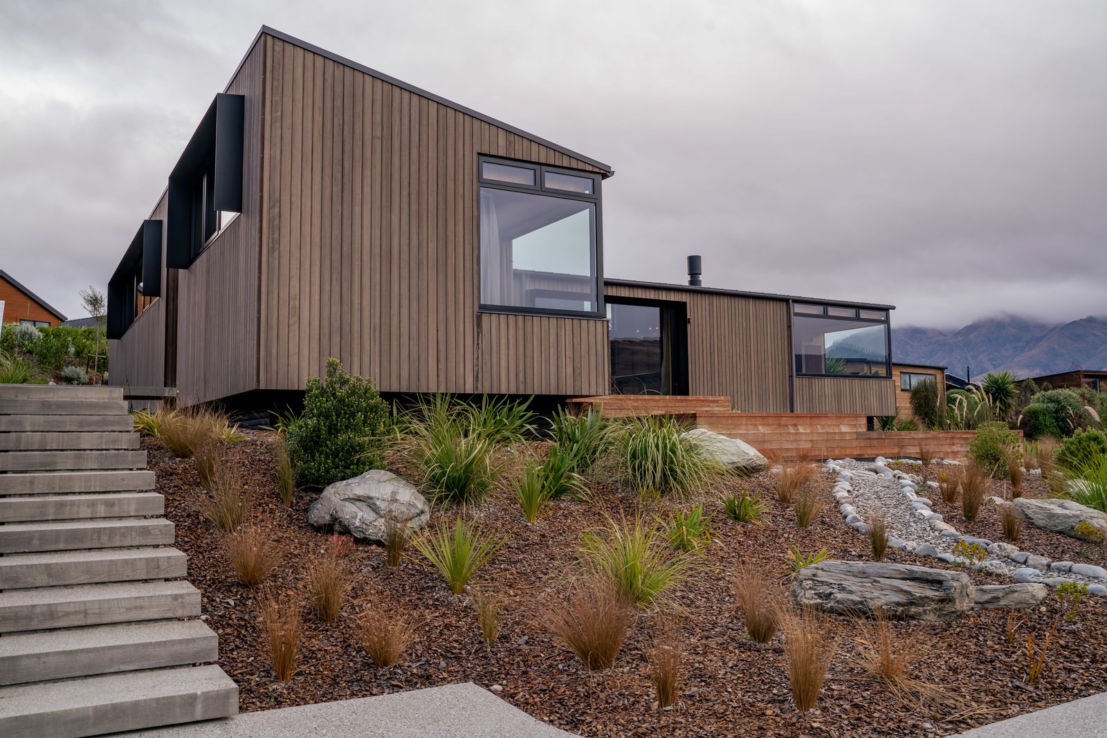 This holiday house and eventual retirement home is inspired by simple Nordic cabins, but the architecture and craftsmanship on display here are anything but basic. Top-notch carpentry and materials are pillars of the project. Pods arranged in a T-shape are wrapped in vertical timber cladding with steel-eyebrow eaves and corner windows with concealed blinds. A separate garage pod has externally accessed mezzanine storage. Internal finishing is a showcase for the builders’ skills. It’s obvious in the walls of negative-jointed meranti marine plywood with battens, bespoke wooden bunks, furniture and cabinetry. The timber is punctuated with pops of colour throughout the three-bedroom home. You’ll notice terracotta and blue porcelain tiles in the two bathrooms and pounamu-hued granite benchtops in the splashback in the kitchen, and in bathroom and laundry benches. In the living space and bedrooms, earthy-toned carpets and fabrics add natural touches that are also luxurious. Framed views of the moody mountain-scape are everywhere — even in bathrooms where windows are positioned up high for privacy. Landscaping that’s perfectly in tune with the Central Otago environment settles the house into its site.