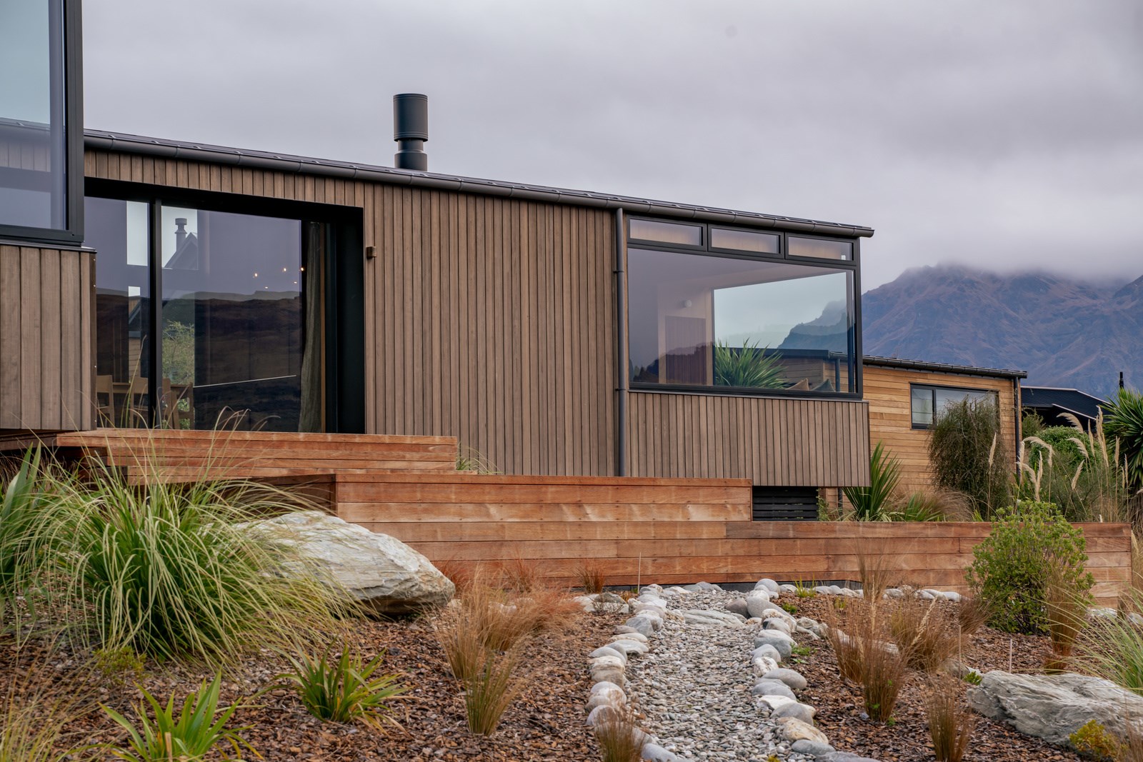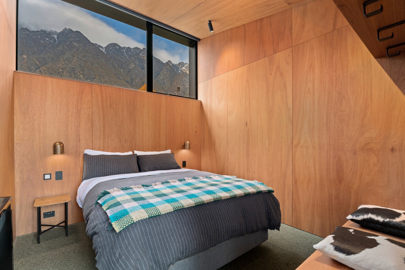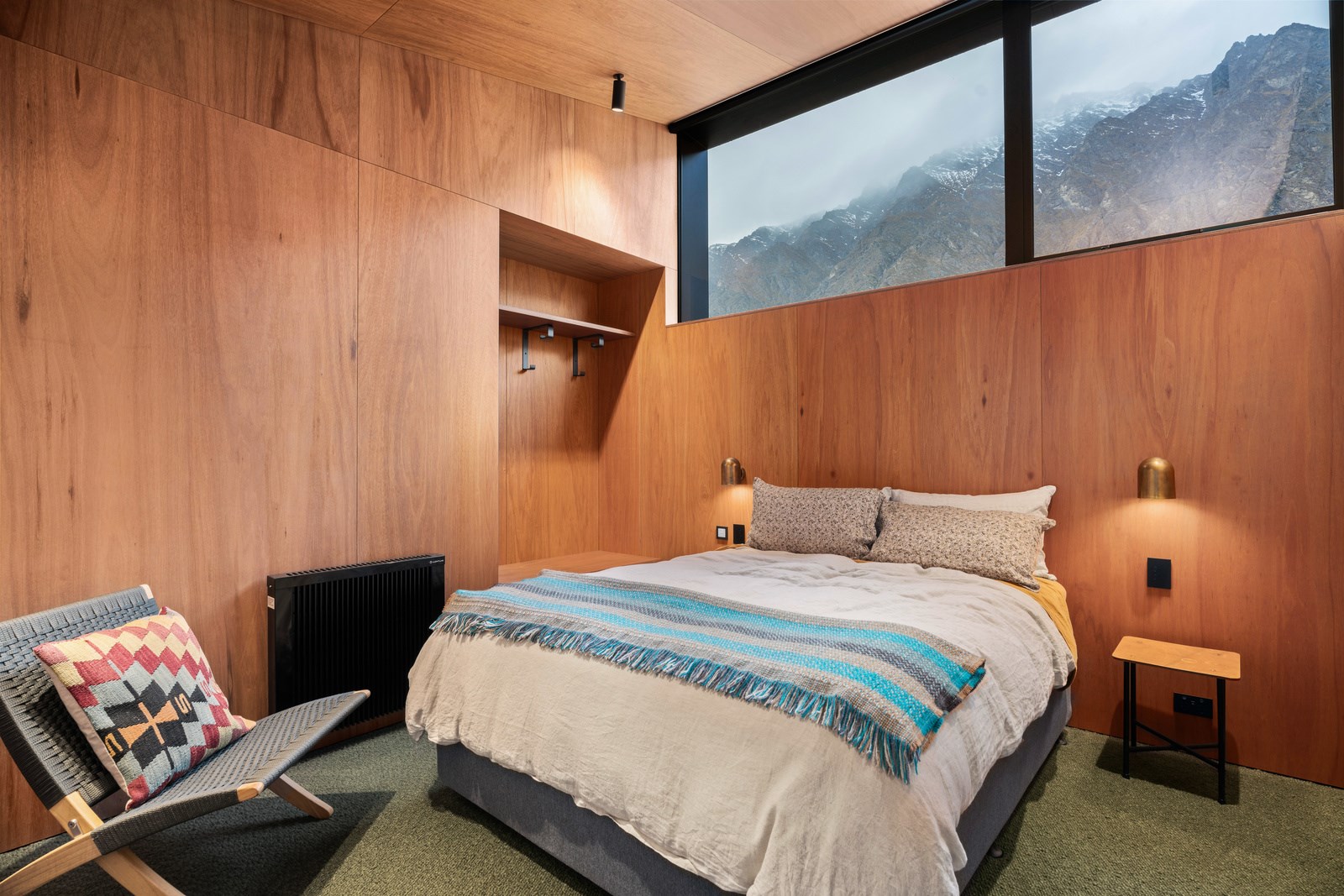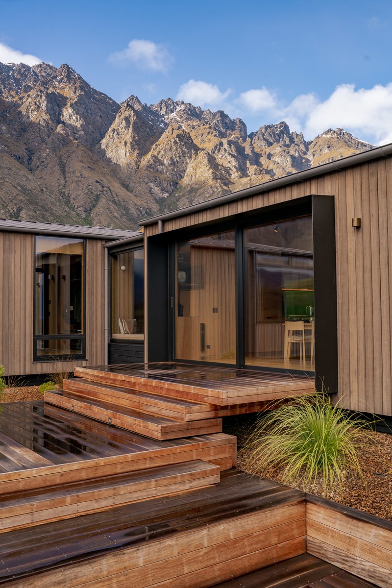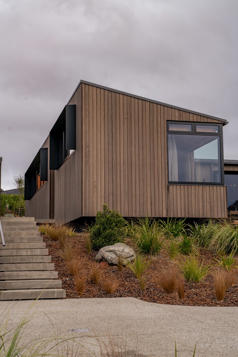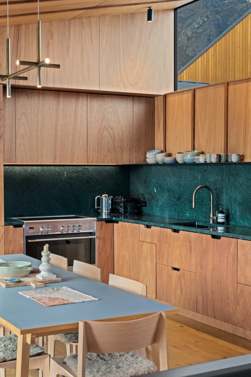 This holiday house and eventual retirement home is inspired by simple Nordic cabins, but the architecture and craftsmanship on display here are anything but basic. Top-notch carpentry and materials are pillars of the project. Pods arranged in a T-shape are wrapped in vertical timber cladding with steel-eyebrow eaves and corner windows with concealed blinds. A separate garage pod has externally accessed mezzanine storage. Internal finishing is a showcase for the builders’ skills. It’s obvious in the walls of negative-jointed meranti marine plywood with battens, bespoke wooden bunks, furniture and cabinetry. The timber is punctuated with pops of colour throughout the three-bedroom home. You’ll notice terracotta and blue porcelain tiles in the two bathrooms and pounamu-hued granite benchtops in the splashback in the kitchen, and in bathroom and laundry benches. In the living space and bedrooms, earthy-toned carpets and fabrics add natural touches that are also luxurious. Framed views of the moody mountain-scape are everywhere — even in bathrooms where windows are positioned up high for privacy. Landscaping that’s perfectly in tune with the Central Otago environment settles the house into its site.