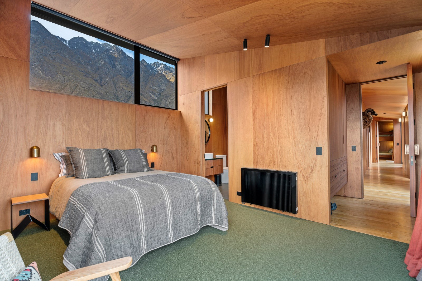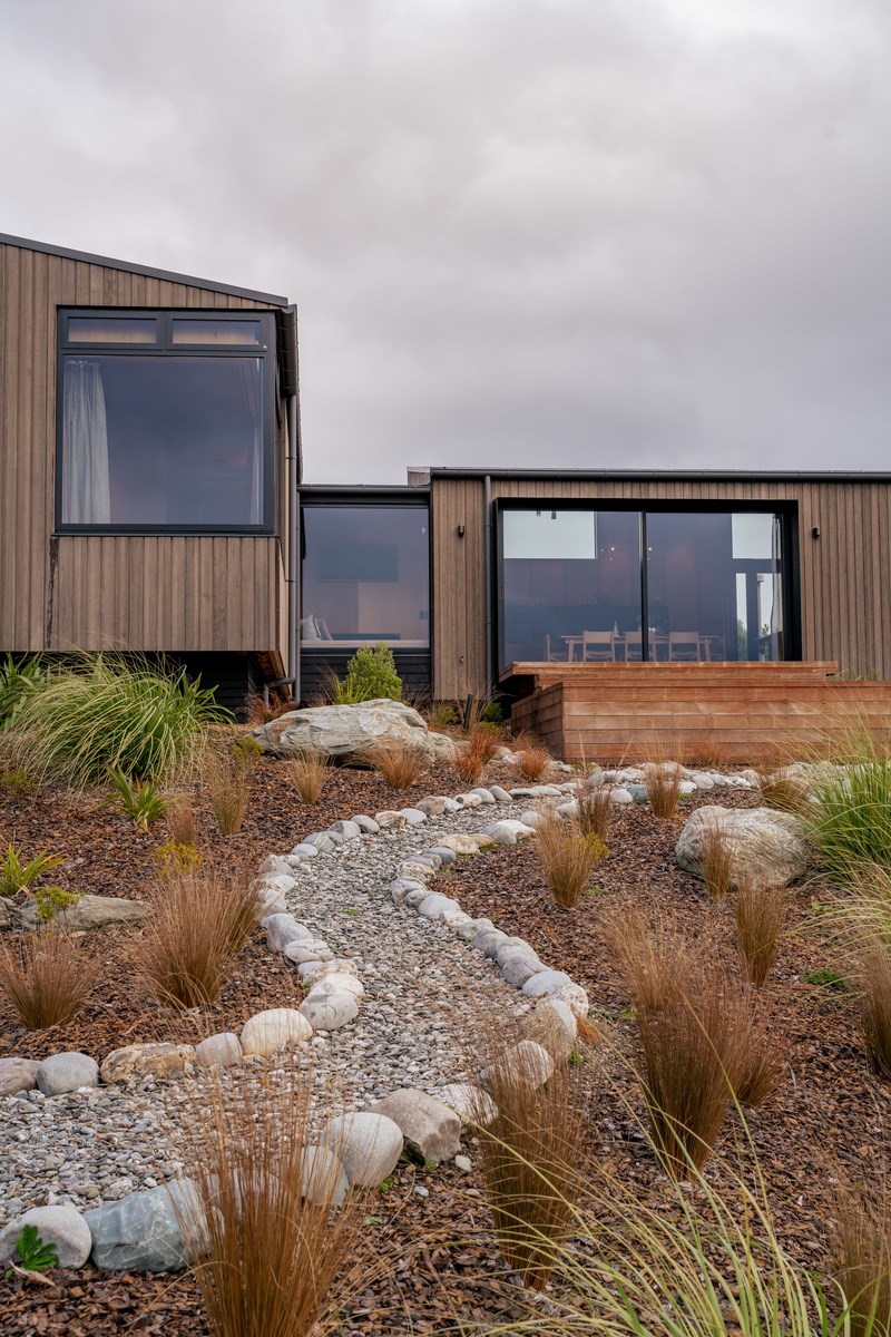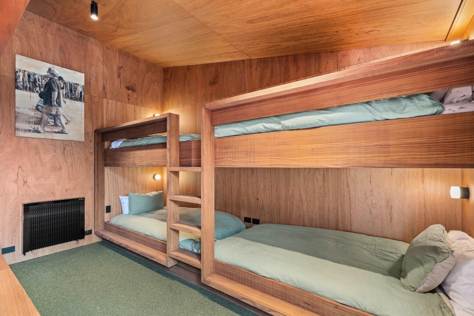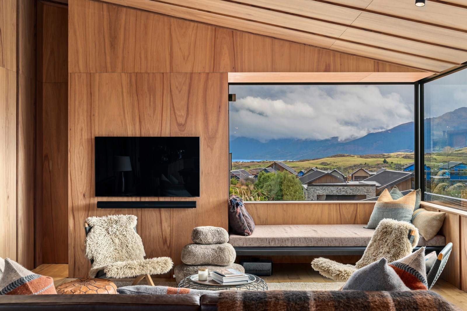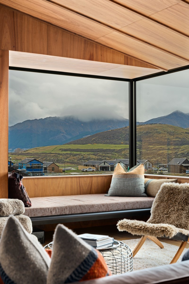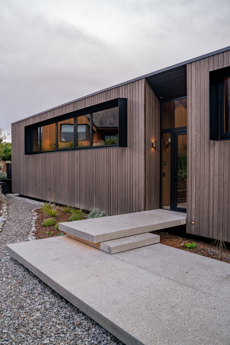 This holiday house and eventual retirement home is inspired by simple Nordic cabins, but the architecture and craftsmanship on display here are anything but basic. Top-notch carpentry and materials are pillars of the project. Pods arranged in a T-shape are wrapped in vertical timber cladding with steel-eyebrow eaves and corner windows with concealed blinds. A separate garage pod has externally accessed mezzanine storage. Internal finishing is a showcase for the builders’ skills. It’s obvious in the walls of negative-jointed meranti marine plywood with battens, bespoke wooden bunks, furniture and cabinetry. The timber is punctuated with pops of colour throughout the three-bedroom home. You’ll notice terracotta and blue porcelain tiles in the two bathrooms and pounamu-hued granite benchtops in the splashback in the kitchen, and in bathroom and laundry benches. In the living space and bedrooms, earthy-toned carpets and fabrics add natural touches that are also luxurious. Framed views of the moody mountain-scape are everywhere — even in bathrooms where windows are positioned up high for privacy. Landscaping that’s perfectly in tune with the Central Otago environment settles the house into its site.