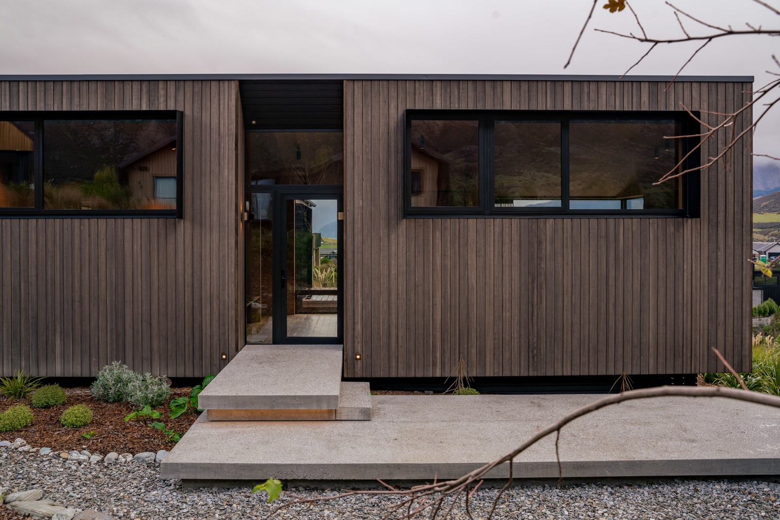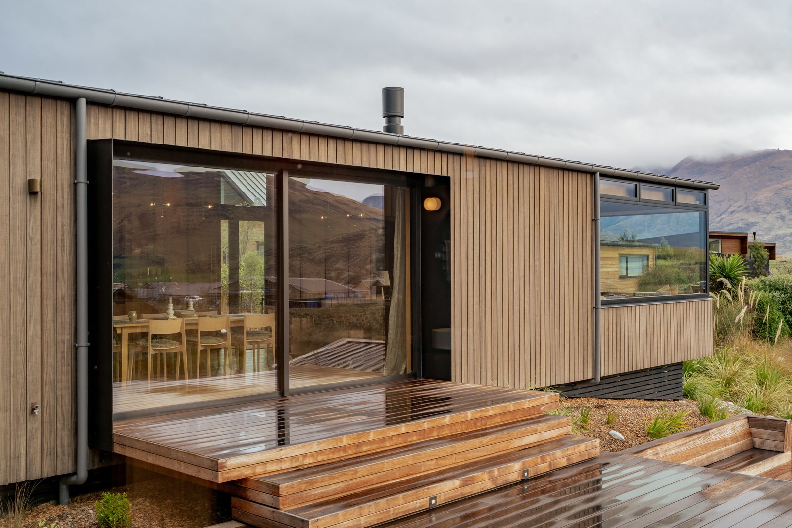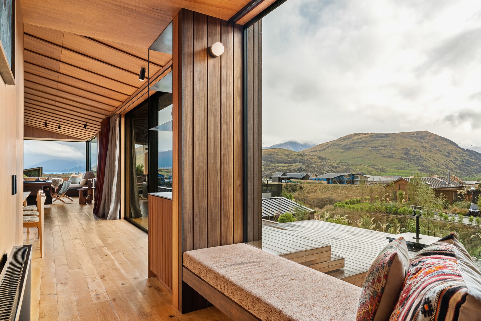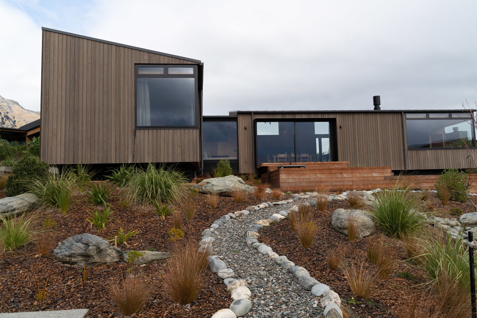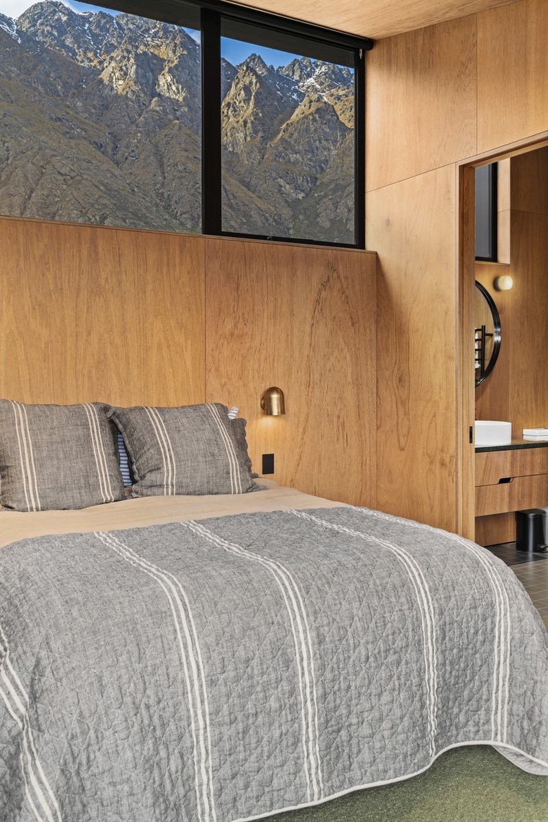 This holiday house and eventual retirement home is inspired by simple Nordic cabins, but the architecture and craftsmanship on display here are anything but basic. Top-notch carpentry and materials are pillars of the project. Pods arranged in a T-shape are wrapped in vertical timber cladding with steel-eyebrow eaves and corner windows with concealed blinds. A separate garage pod has externally accessed mezzanine storage. Internal finishing is a showcase for the builders’ skills. It’s obvious in the walls of negative-jointed meranti marine plywood with battens, bespoke wooden bunks, furniture and cabinetry. The timber is punctuated with pops of colour throughout the three-bedroom home. You’ll notice terracotta and blue porcelain tiles in the two bathrooms and pounamu-hued granite benchtops in the splashback in the kitchen, and in bathroom and laundry benches. In the living space and bedrooms, earthy-toned carpets and fabrics add natural touches that are also luxurious. Framed views of the moody mountain-scape are everywhere — even in bathrooms where windows are positioned up high for privacy. Landscaping that’s perfectly in tune with the Central Otago environment settles the house into its site.