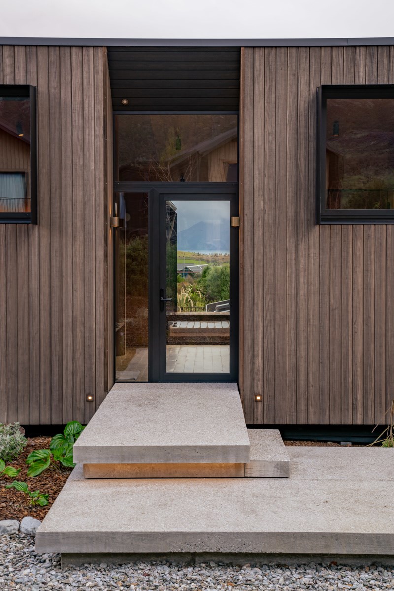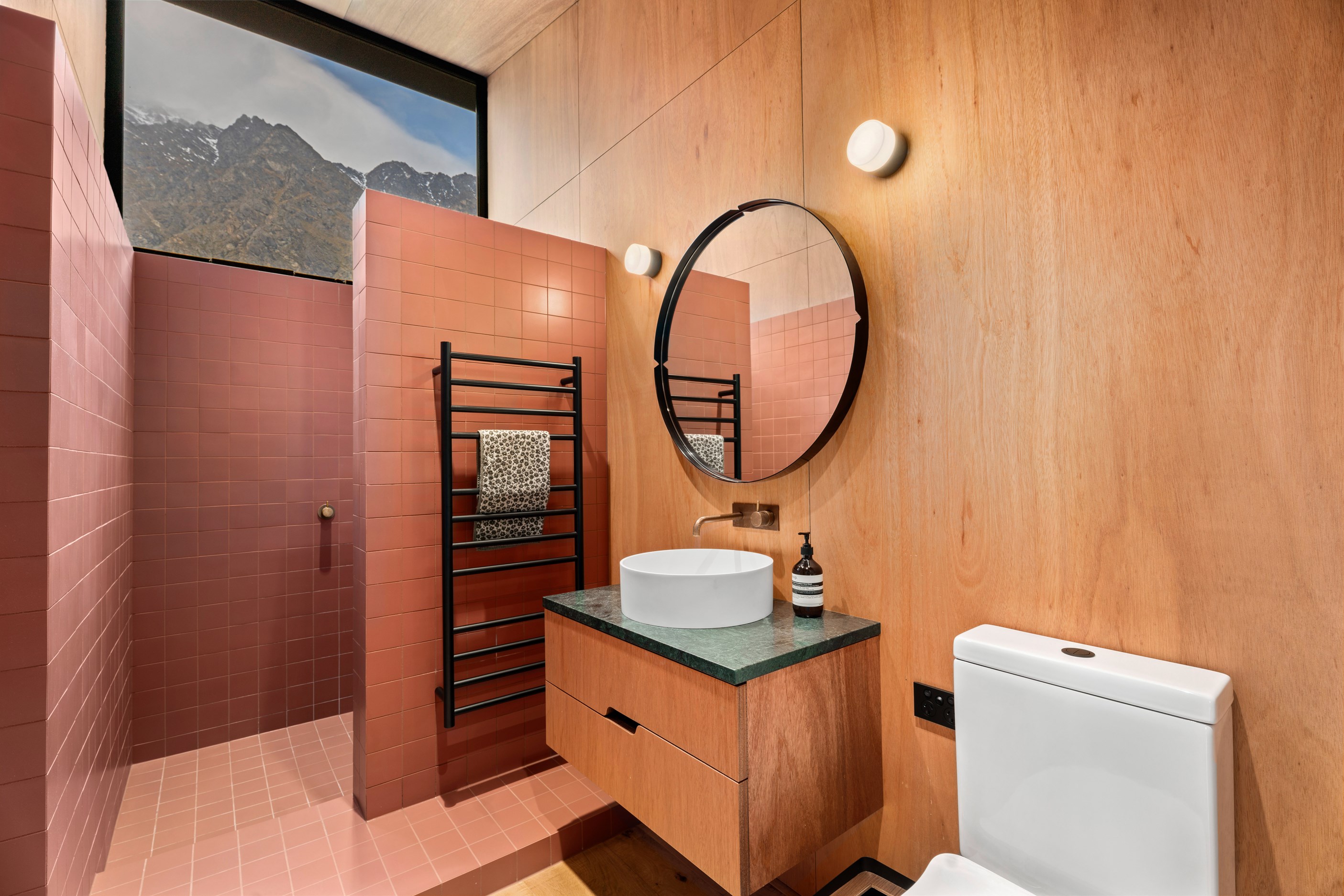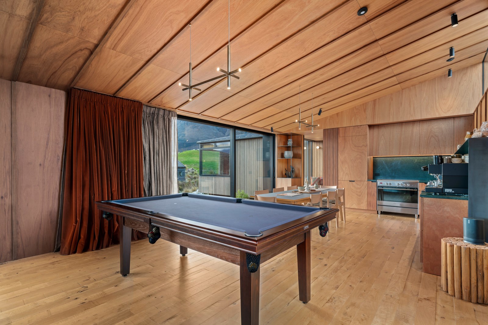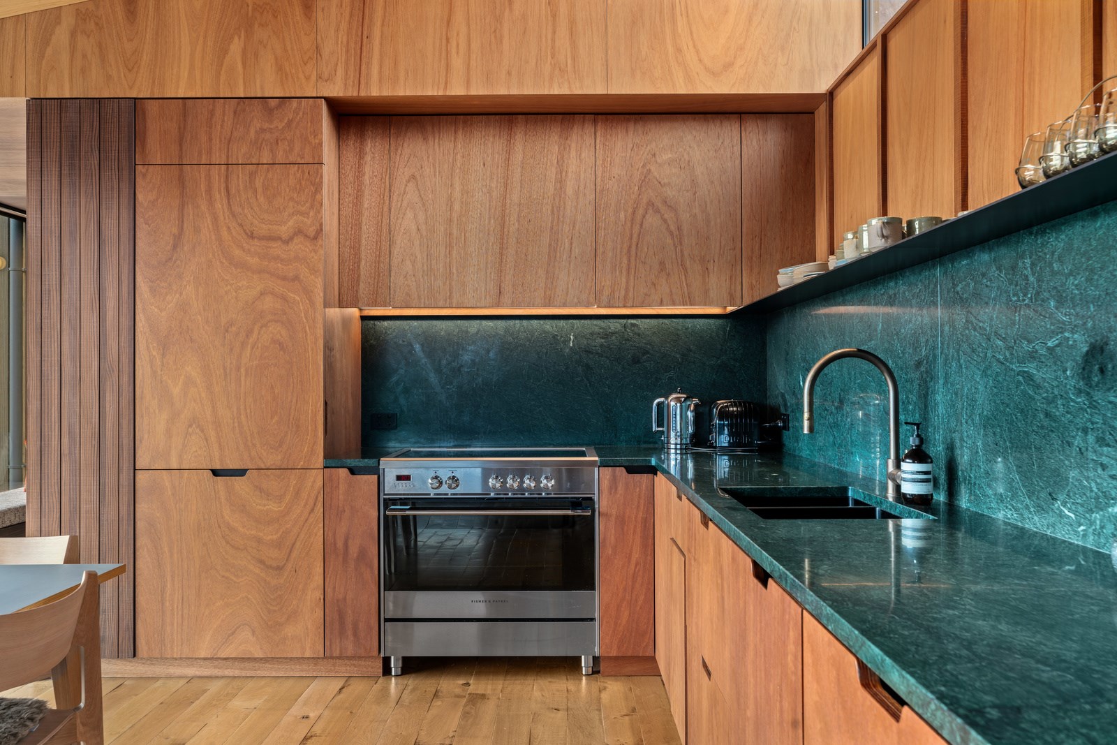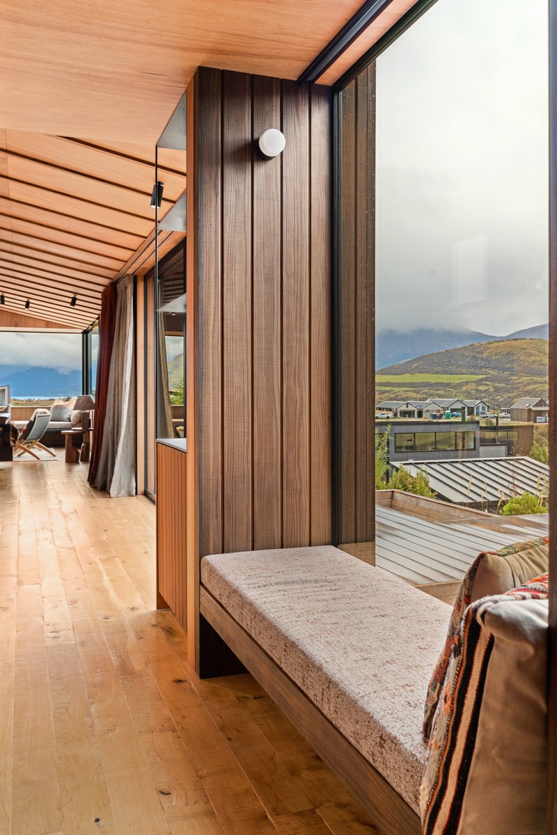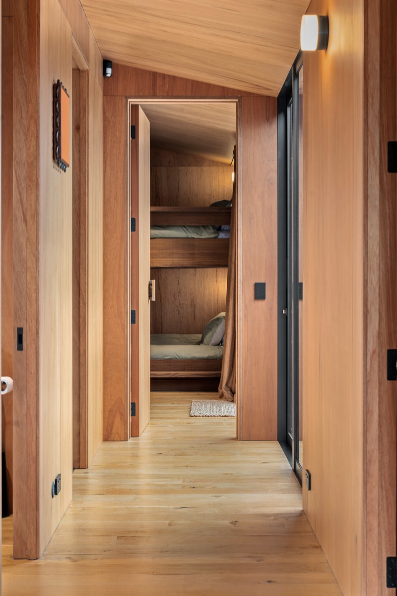 This holiday house and eventual retirement home is inspired by simple Nordic cabins, but the architecture and craftsmanship on display here are anything but basic. Top-notch carpentry and materials are pillars of the project. Pods arranged in a T-shape are wrapped in vertical timber cladding with steel-eyebrow eaves and corner windows with concealed blinds. A separate garage pod has externally accessed mezzanine storage. Internal finishing is a showcase for the builders’ skills. It’s obvious in the walls of negative-jointed meranti marine plywood with battens, bespoke wooden bunks, furniture and cabinetry. The timber is punctuated with pops of colour throughout the three-bedroom home. You’ll notice terracotta and blue porcelain tiles in the two bathrooms and pounamu-hued granite benchtops in the splashback in the kitchen, and in bathroom and laundry benches. In the living space and bedrooms, earthy-toned carpets and fabrics add natural touches that are also luxurious. Framed views of the moody mountain-scape are everywhere — even in bathrooms where windows are positioned up high for privacy. Landscaping that’s perfectly in tune with the Central Otago environment settles the house into its site.
