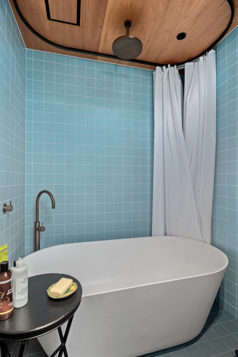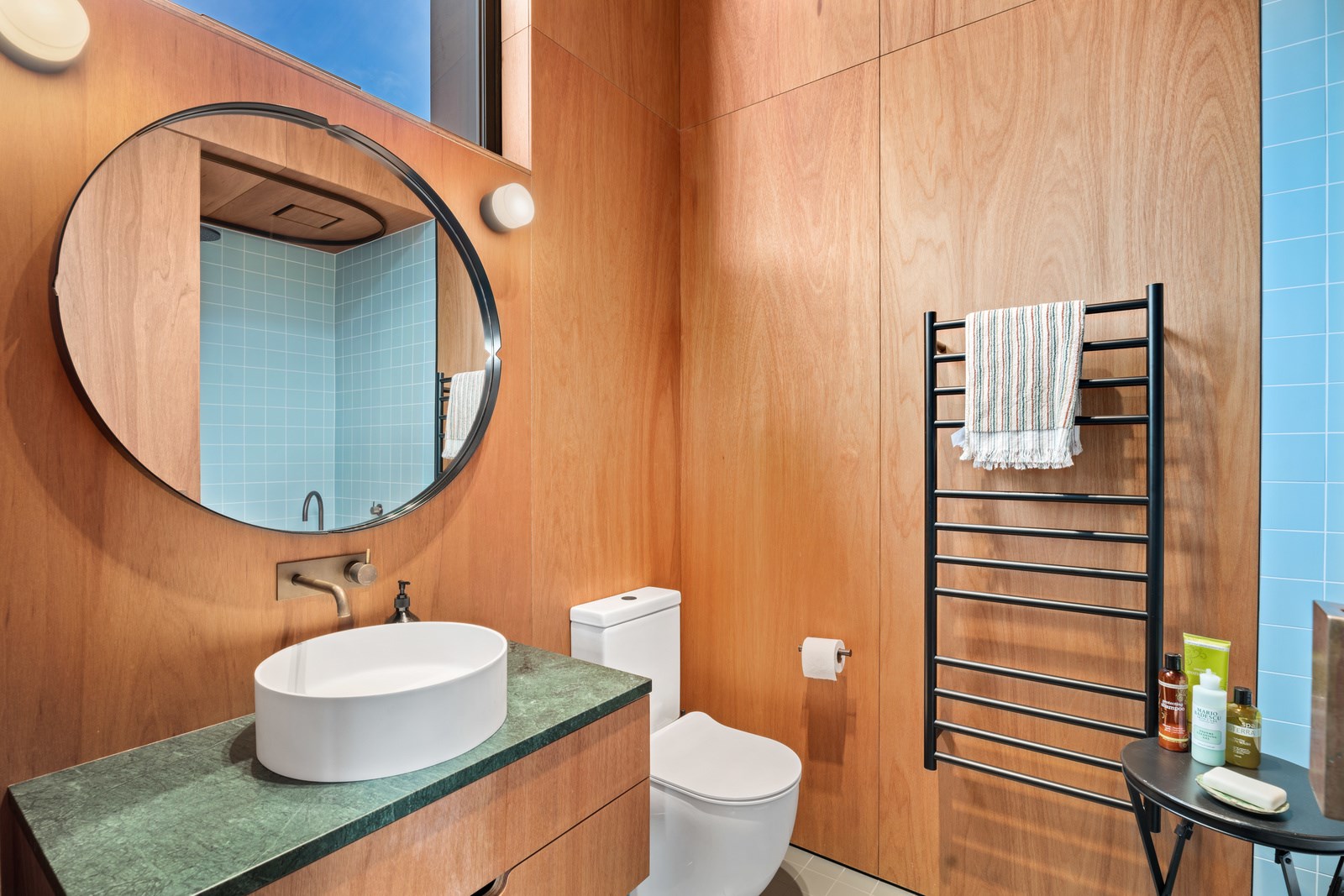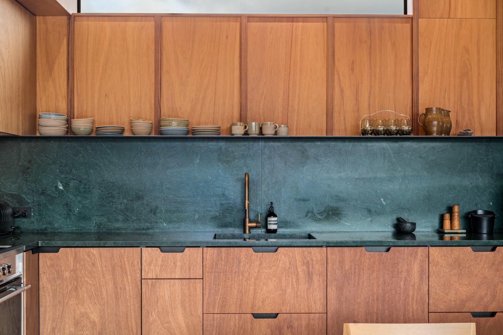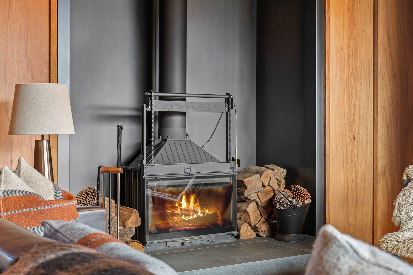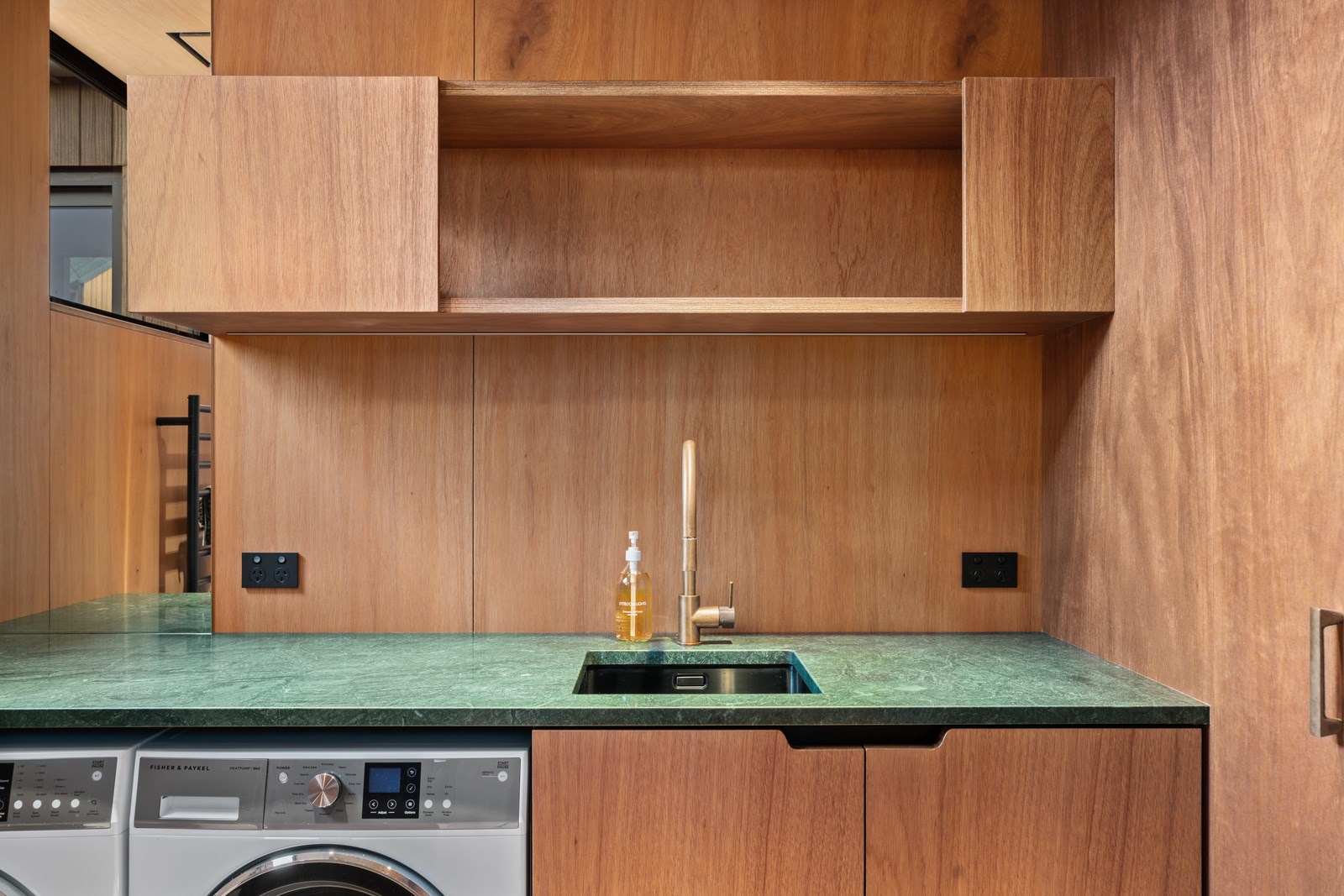 This holiday house and eventual retirement home is inspired by simple Nordic cabins, but the architecture and craftsmanship on display here are anything but basic. Top-notch carpentry and materials are pillars of the project. Pods arranged in a T-shape are wrapped in vertical timber cladding with steel-eyebrow eaves and corner windows with concealed blinds. A separate garage pod has externally accessed mezzanine storage. Internal finishing is a showcase for the builders’ skills. It’s obvious in the walls of negative-jointed meranti marine plywood with battens, bespoke wooden bunks, furniture and cabinetry. The timber is punctuated with pops of colour throughout the three-bedroom home. You’ll notice terracotta and blue porcelain tiles in the two bathrooms and pounamu-hued granite benchtops in the splashback in the kitchen, and in bathroom and laundry benches. In the living space and bedrooms, earthy-toned carpets and fabrics add natural touches that are also luxurious. Framed views of the moody mountain-scape are everywhere — even in bathrooms where windows are positioned up high for privacy. Landscaping that’s perfectly in tune with the Central Otago environment settles the house into its site.