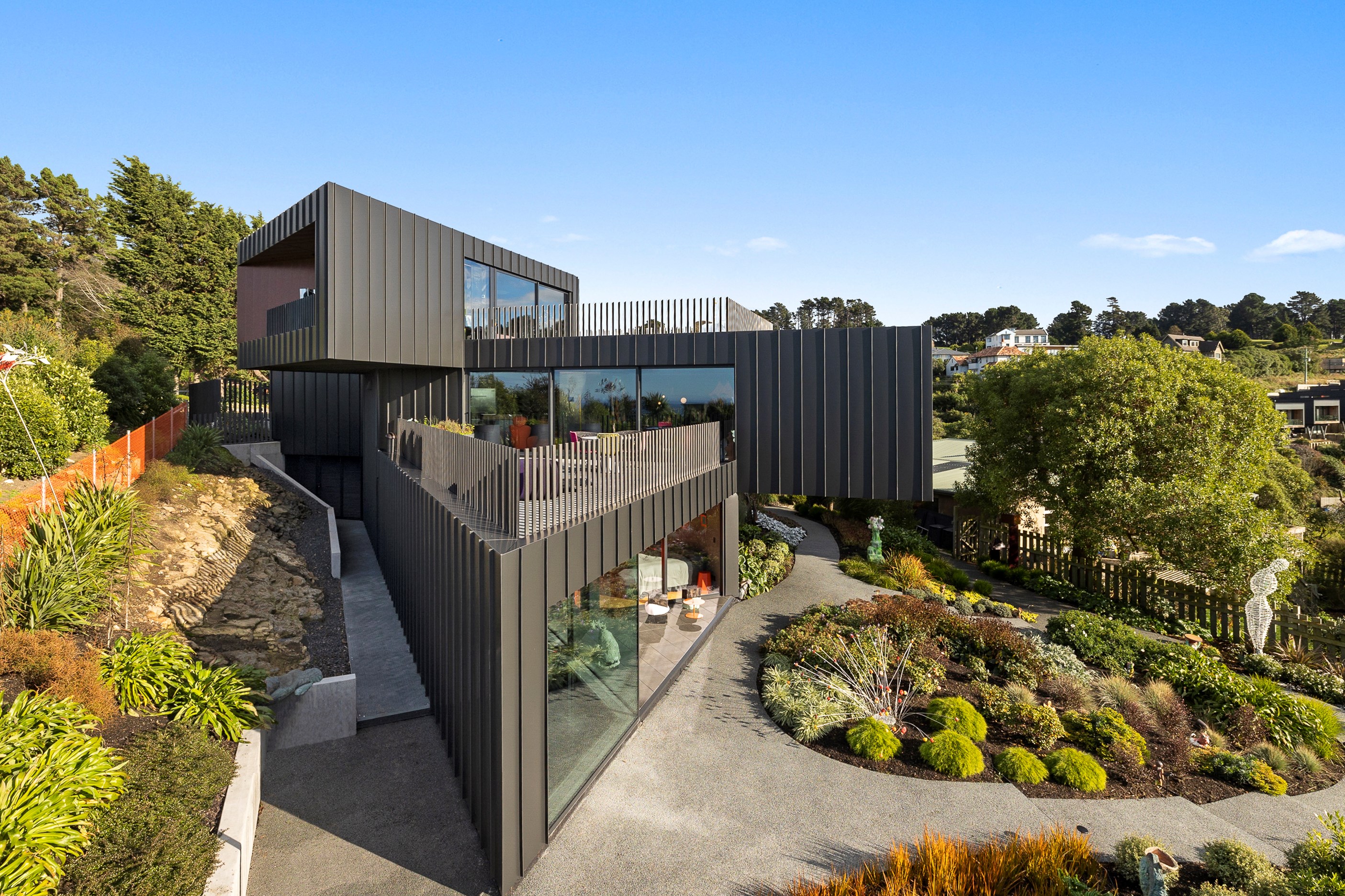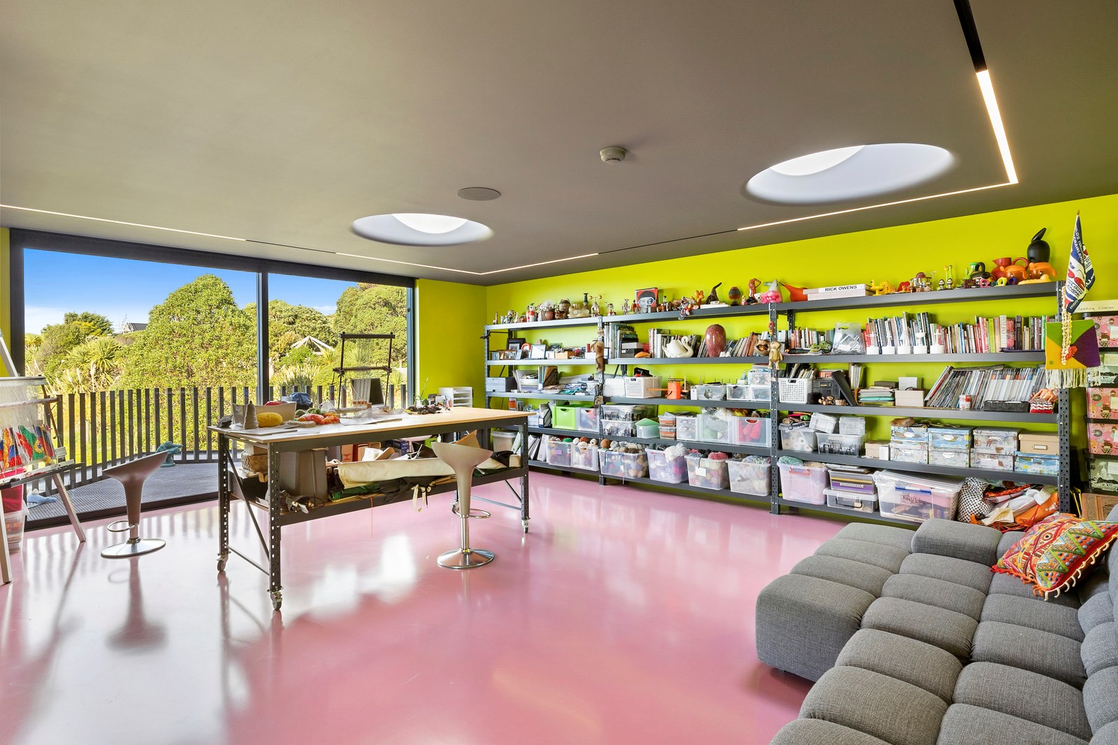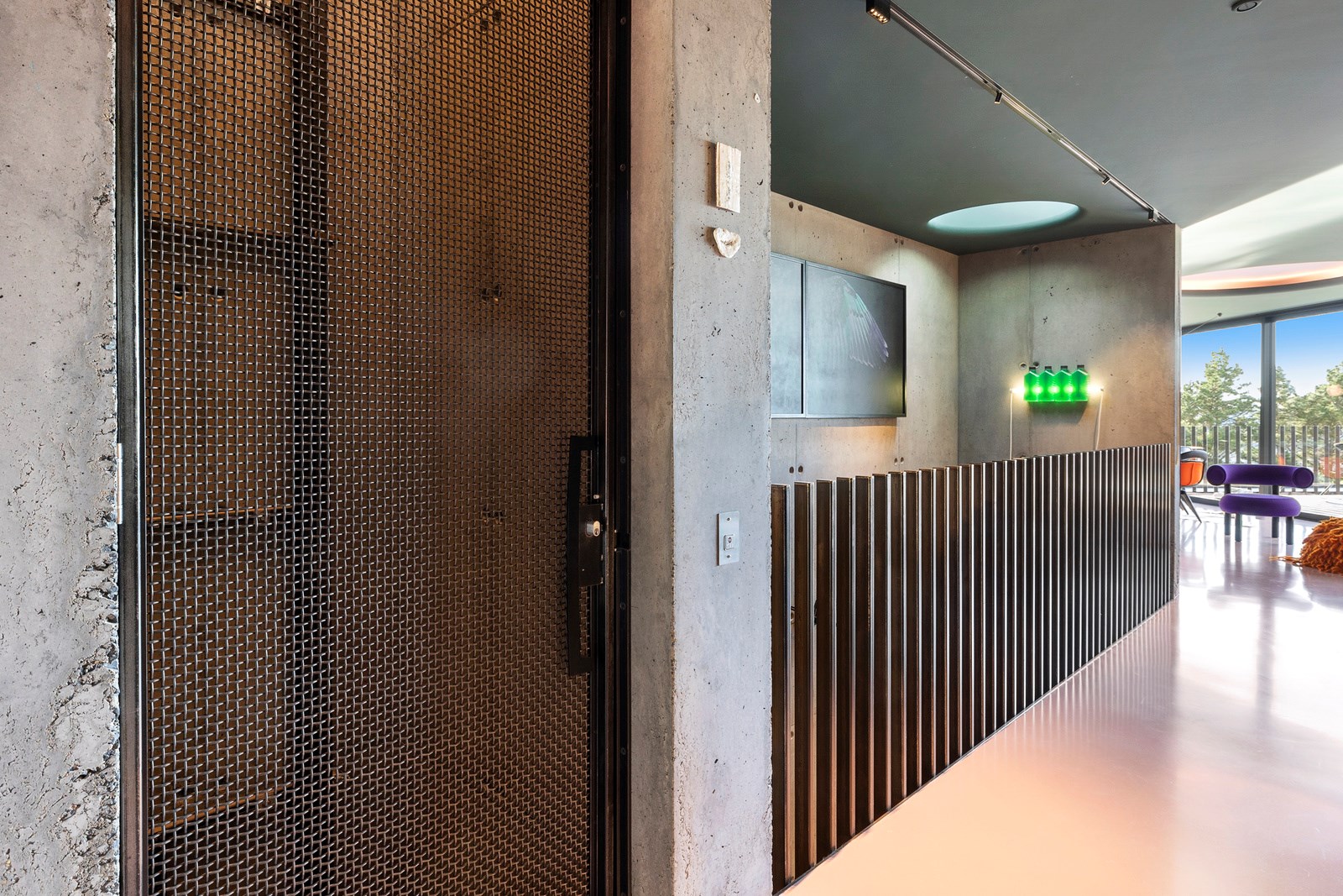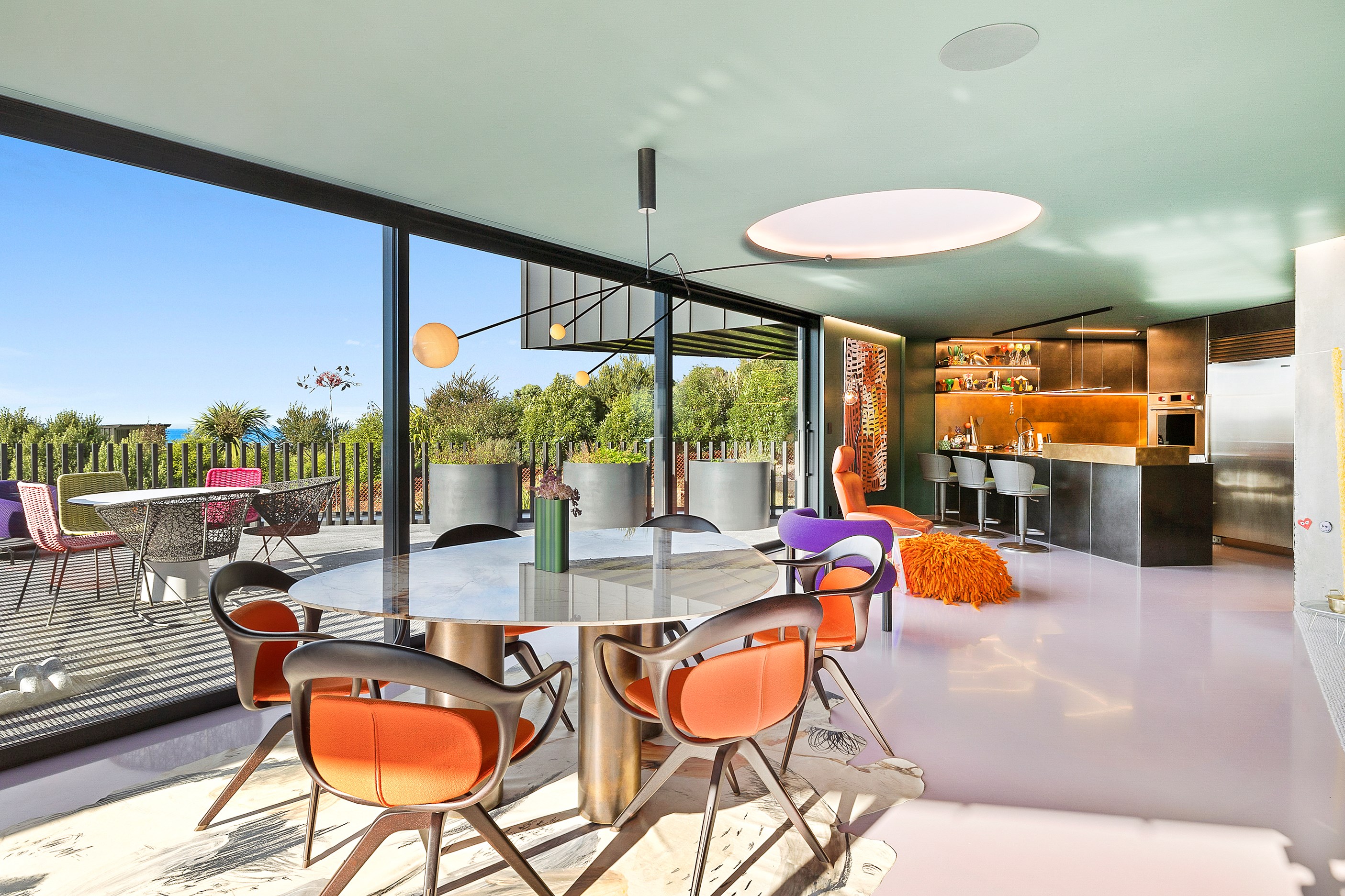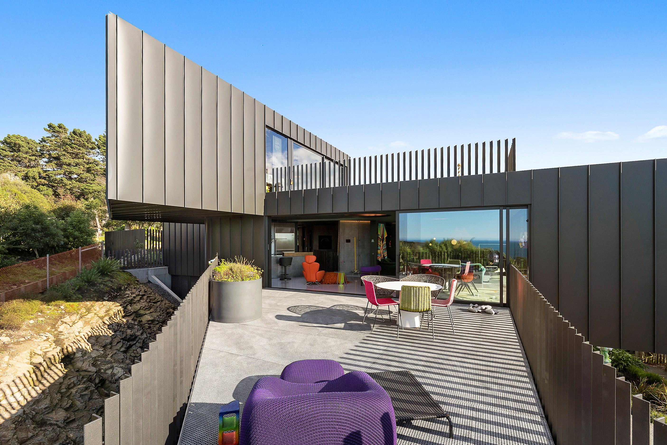 From the city to the ocean, the views are all there for the taking. But there’s more to cast your eyes upon within this seaside delight. This Dunedin home is a piece of art itself. Between the architectural flourishes and pops of colour (including on the ceiling and floors), there’s a lot to admire. On paper, the three-story address has two bedrooms, two bathrooms and two spacious living areas. But add to that the following: a storage room complete with bespoke racking, plus a separate arts and crafts room. There’s an indoor pool as well. The structure of the 415sqm home is concrete, poured in situ. The exterior, including the soffits, is clad in standing seam Eurotray with a flush mounted entry door and garage door. Steel beams support the home’s many cantilevered sections. Concrete and bespoke steelwork also feature in the internal finishing: leading off the entry lobby there’s a lift, finished with handmade mesh metal doors, and a curved metal staircase that was craned in before the hot roof was completed. This climate-controlled smart home is also decked out with tech, with entertainment and lighting activated by the touch of a smartphone.