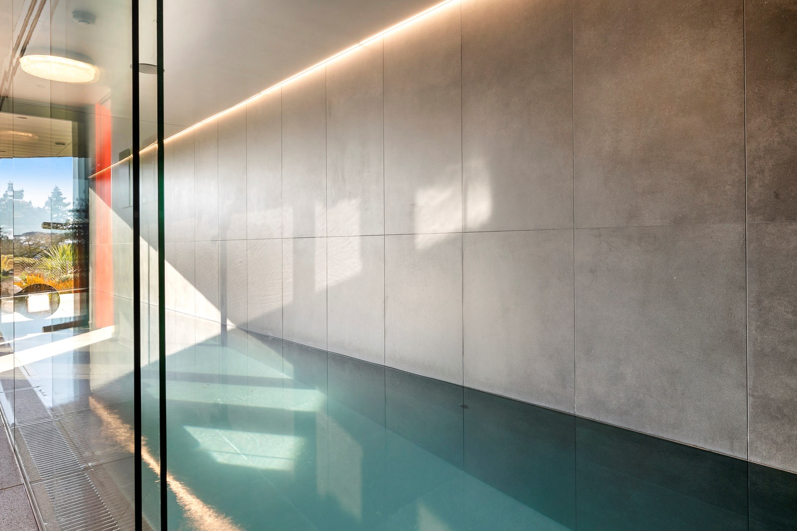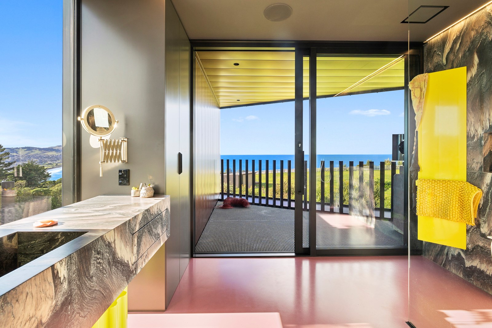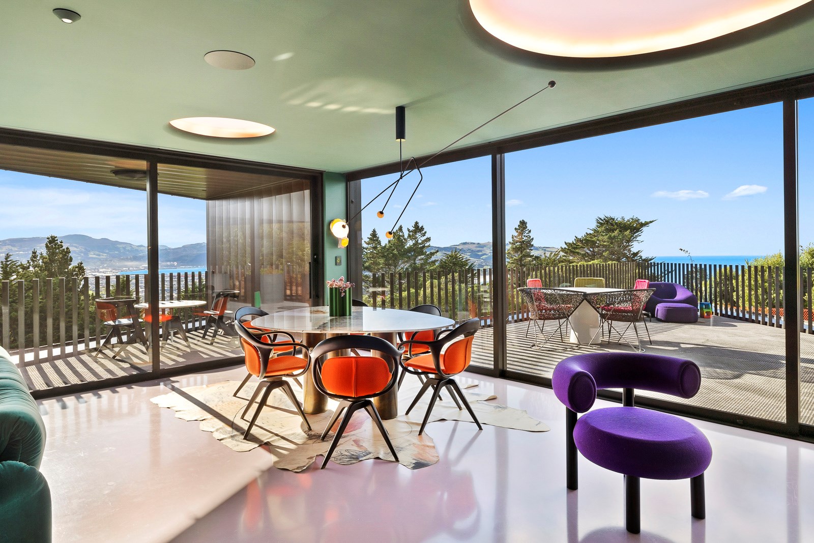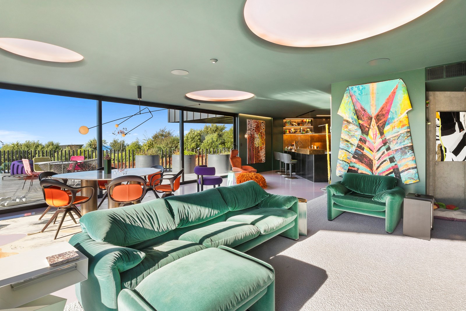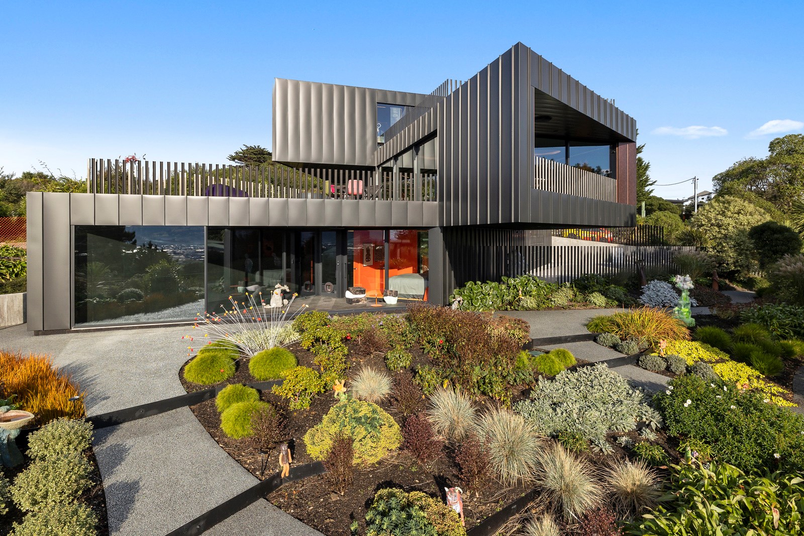 From the city to the ocean, the views are all there for the taking. But there’s more to cast your eyes upon within this seaside delight. This Dunedin home is a piece of art itself. Between the architectural flourishes and pops of colour (including on the ceiling and floors), there’s a lot to admire. On paper, the three-story address has two bedrooms, two bathrooms and two spacious living areas. But add to that the following: a storage room complete with bespoke racking, plus a separate arts and crafts room. There’s an indoor pool as well. The structure of the 415sqm home is concrete, poured in situ. The exterior, including the soffits, is clad in standing seam Eurotray with a flush mounted entry door and garage door. Steel beams support the home’s many cantilevered sections. Concrete and bespoke steelwork also feature in the internal finishing: leading off the entry lobby there’s a lift, finished with handmade mesh metal doors, and a curved metal staircase that was craned in before the hot roof was completed. This climate-controlled smart home is also decked out with tech, with entertainment and lighting activated by the touch of a smartphone.