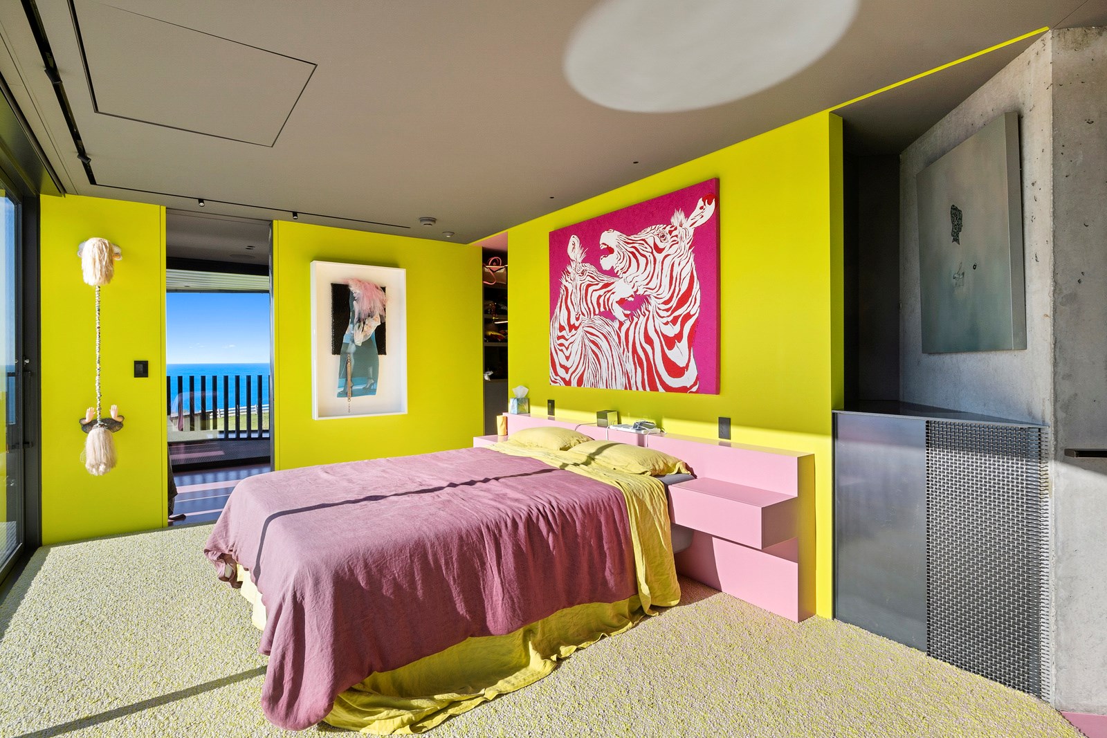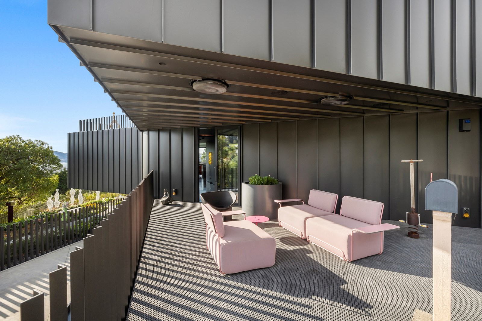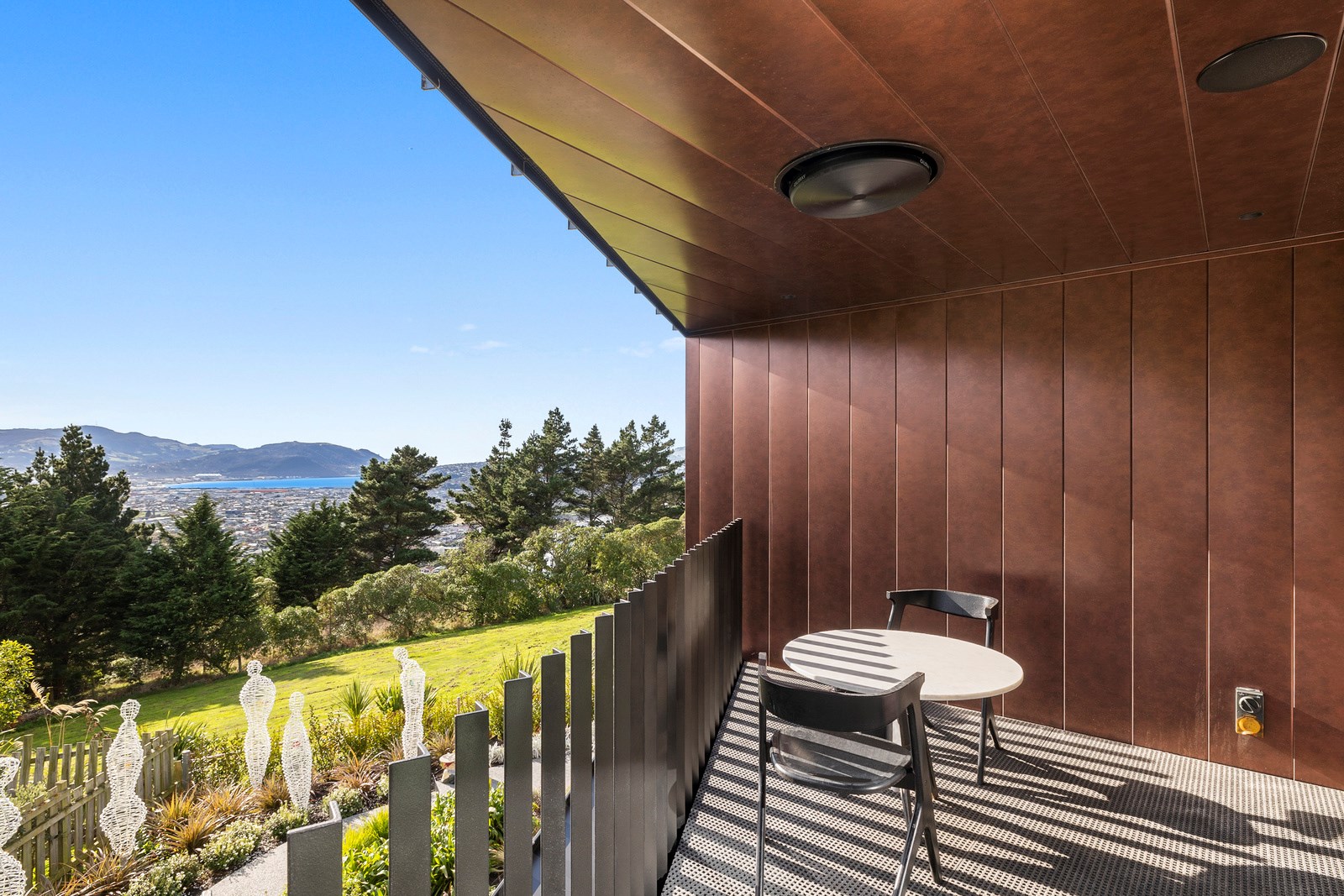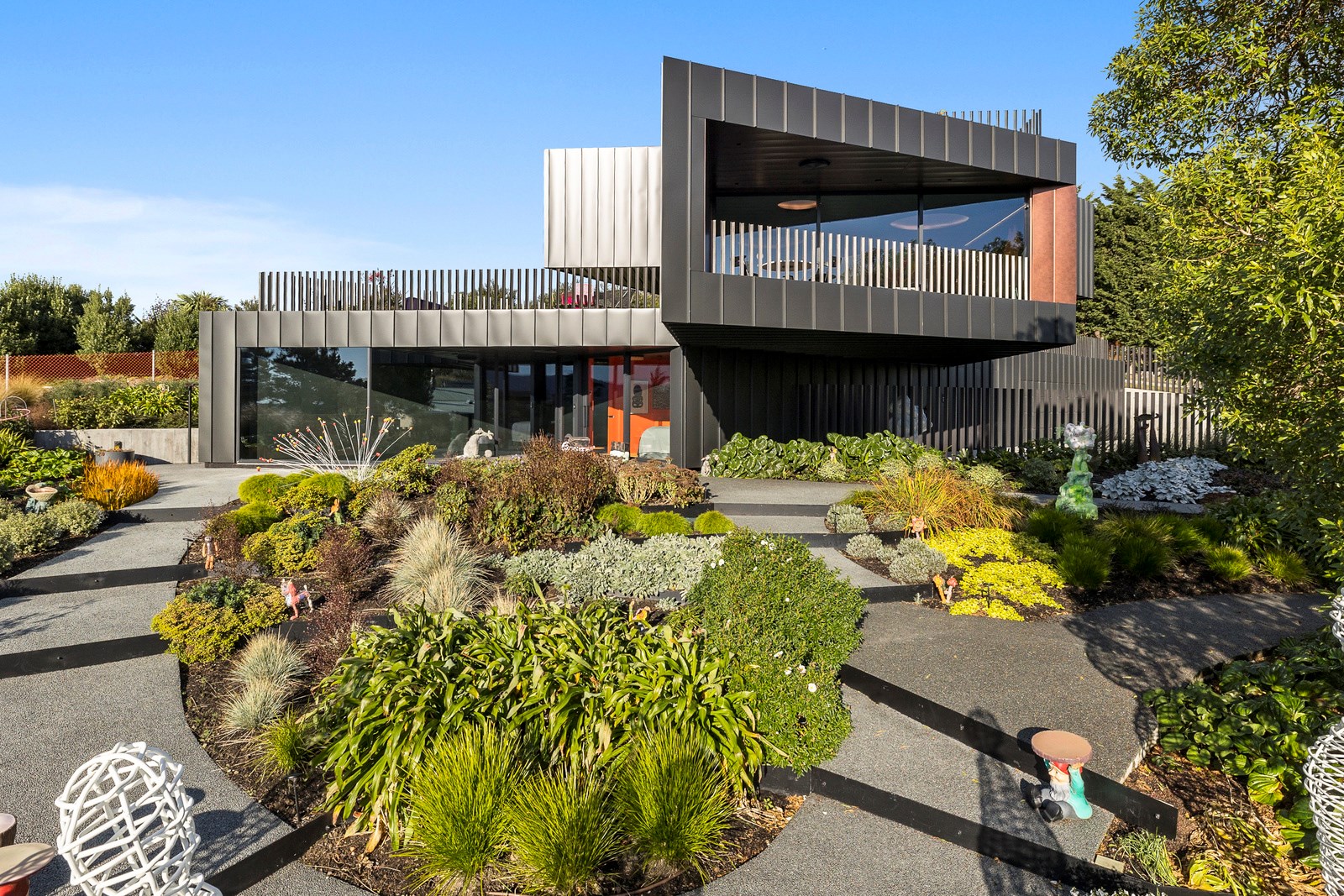 From the city to the ocean, the views are all there for the taking. But there’s more to cast your eyes upon within this seaside delight. This Dunedin home is a piece of art itself. Between the architectural flourishes and pops of colour (including on the ceiling and floors), there’s a lot to admire. On paper, the three-story address has two bedrooms, two bathrooms and two spacious living areas. But add to that the following: a storage room complete with bespoke racking, plus a separate arts and crafts room. There’s an indoor pool as well. The structure of the 415sqm home is concrete, poured in situ. The exterior, including the soffits, is clad in standing seam Eurotray with a flush mounted entry door and garage door. Steel beams support the home’s many cantilevered sections. Concrete and bespoke steelwork also feature in the internal finishing: leading off the entry lobby there’s a lift, finished with handmade mesh metal doors, and a curved metal staircase that was craned in before the hot roof was completed. This climate-controlled smart home is also decked out with tech, with entertainment and lighting activated by the touch of a smartphone.