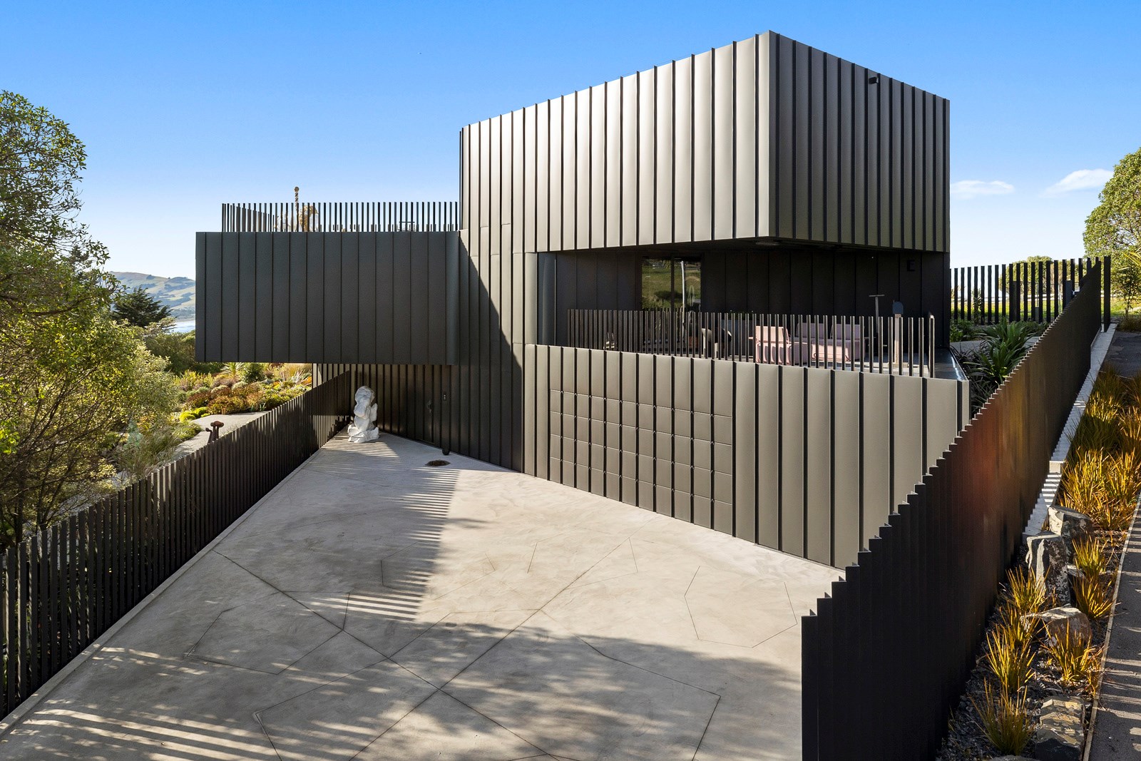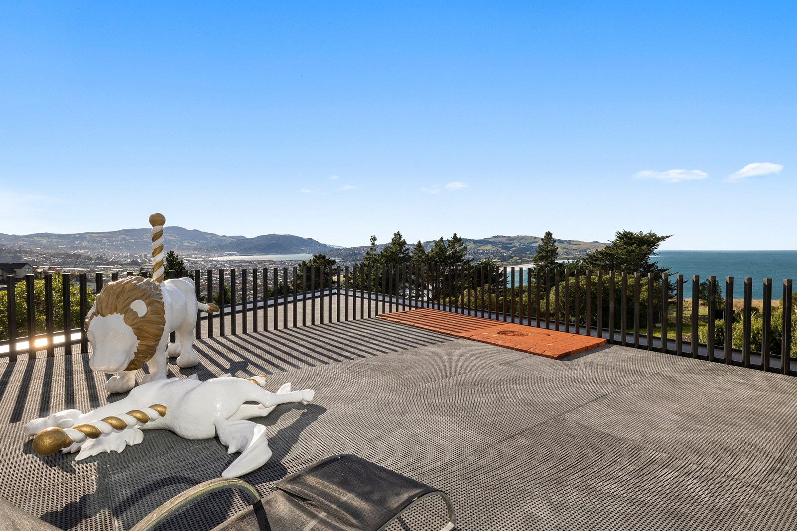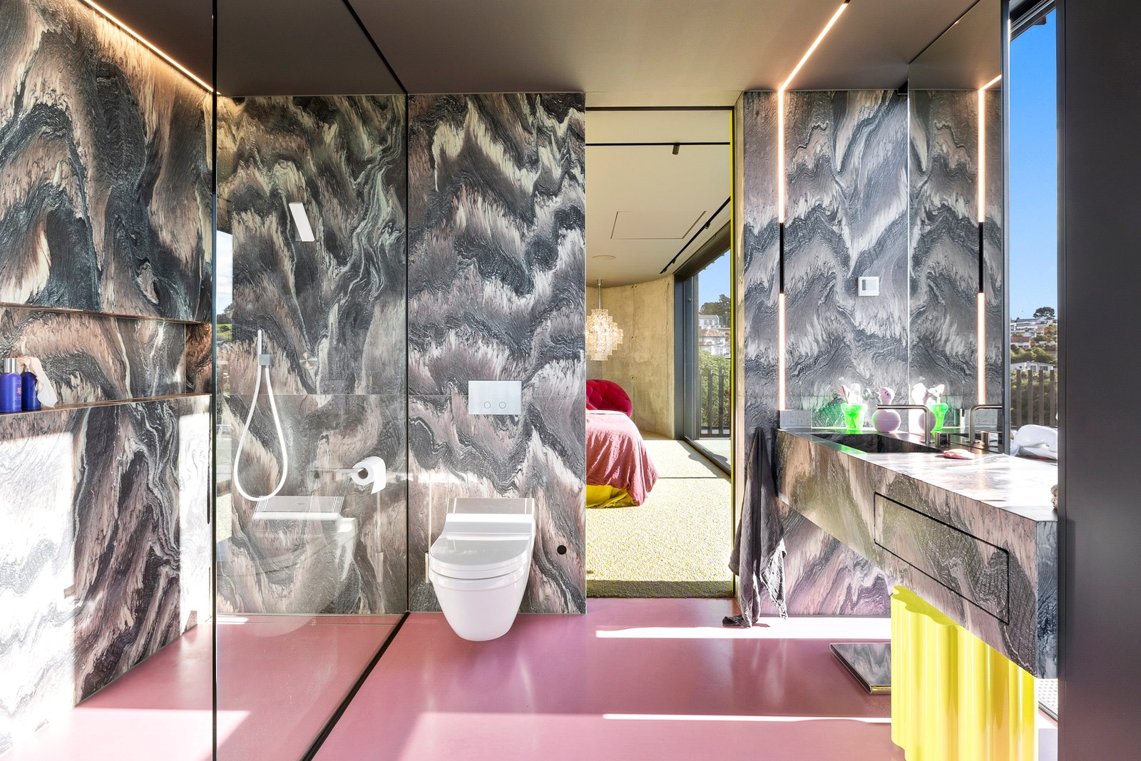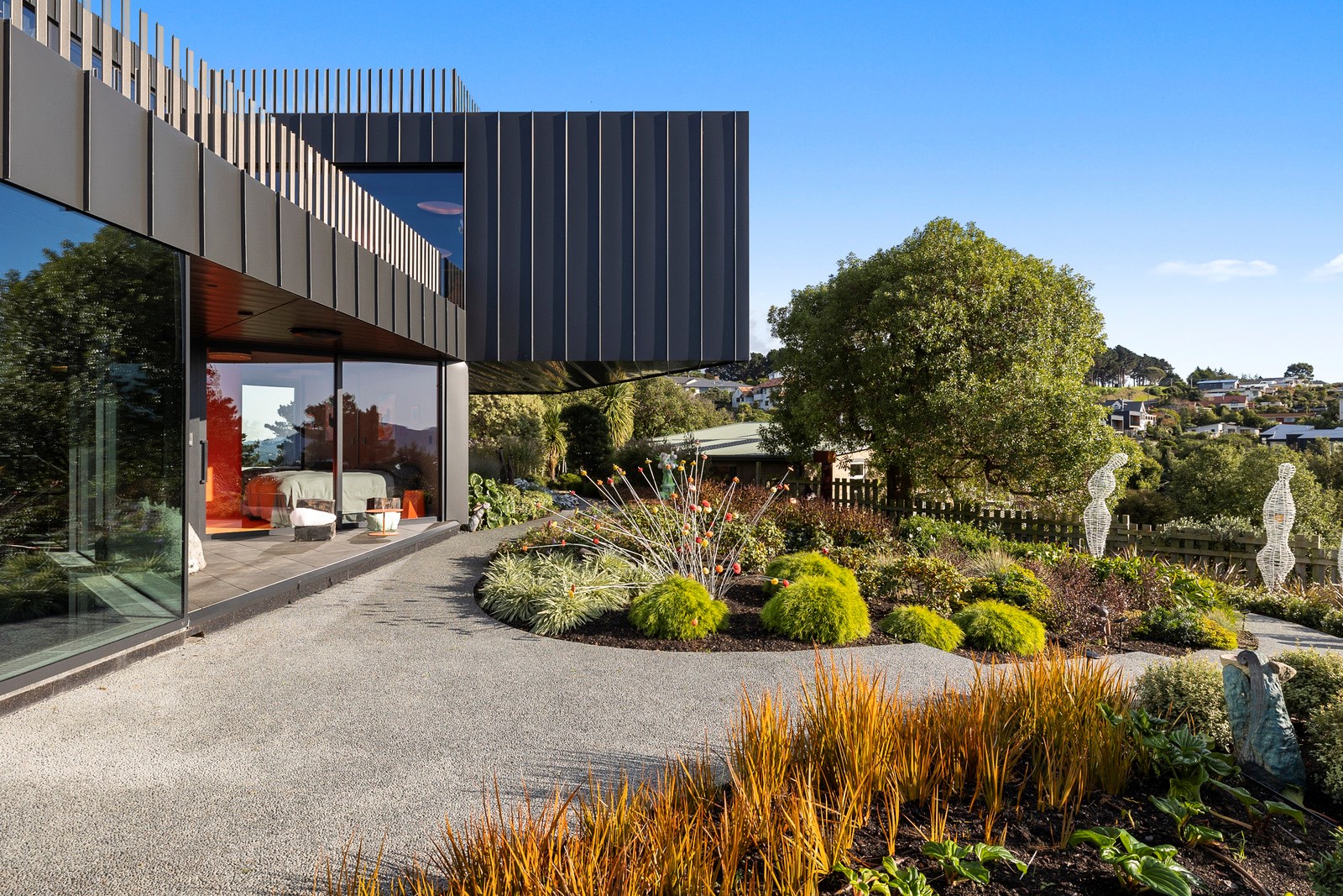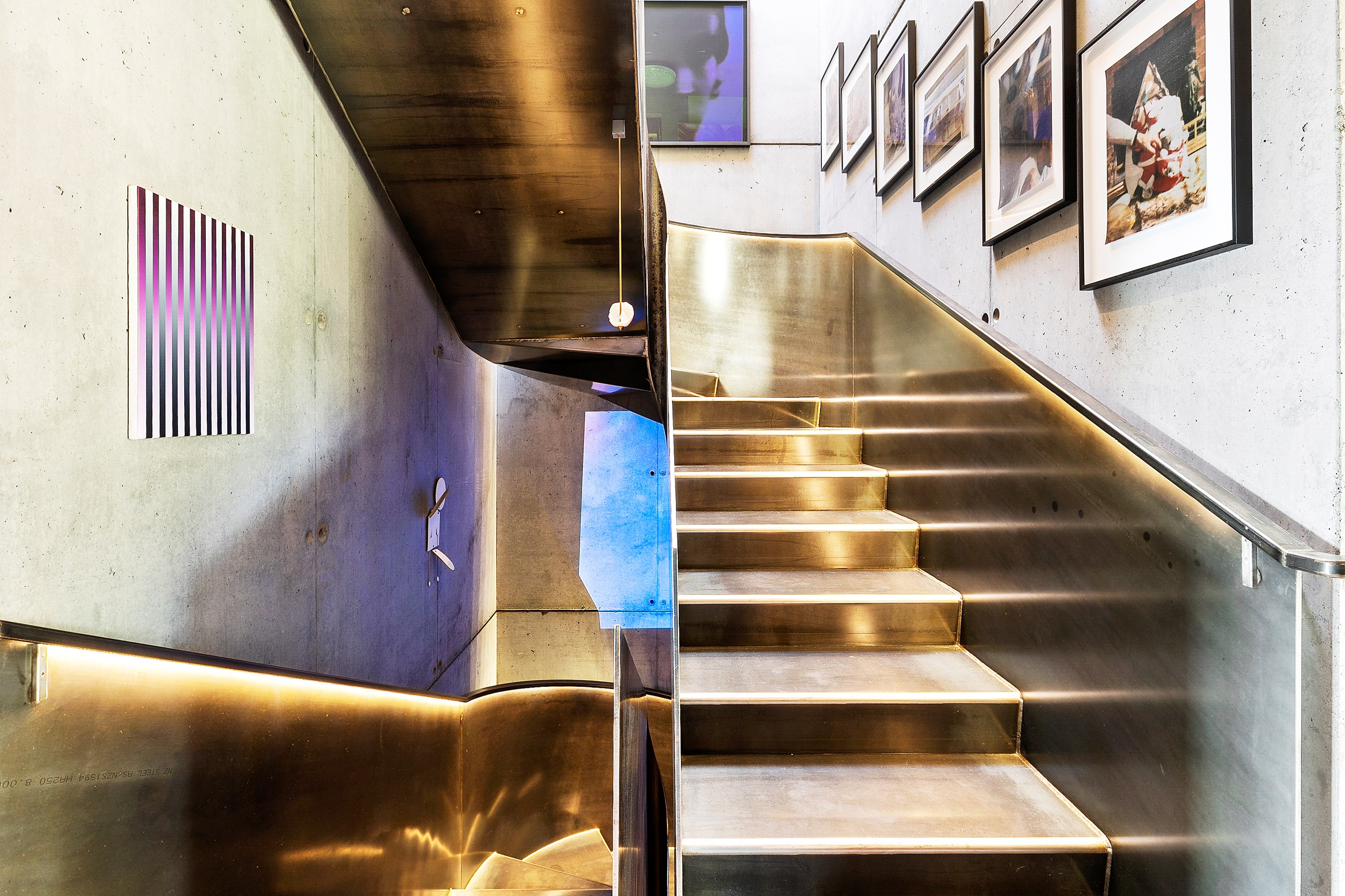 From the city to the ocean, the views are all there for the taking. But there’s more to cast your eyes upon within this seaside delight. This Dunedin home is a piece of art itself. Between the architectural flourishes and pops of colour (including on the ceiling and floors), there’s a lot to admire. On paper, the three-story address has two bedrooms, two bathrooms and two spacious living areas. But add to that the following: a storage room complete with bespoke racking, plus a separate arts and crafts room. There’s an indoor pool as well. The structure of the 415sqm home is concrete, poured in situ. The exterior, including the soffits, is clad in standing seam Eurotray with a flush mounted entry door and garage door. Steel beams support the home’s many cantilevered sections. Concrete and bespoke steelwork also feature in the internal finishing: leading off the entry lobby there’s a lift, finished with handmade mesh metal doors, and a curved metal staircase that was craned in before the hot roof was completed. This climate-controlled smart home is also decked out with tech, with entertainment and lighting activated by the touch of a smartphone.