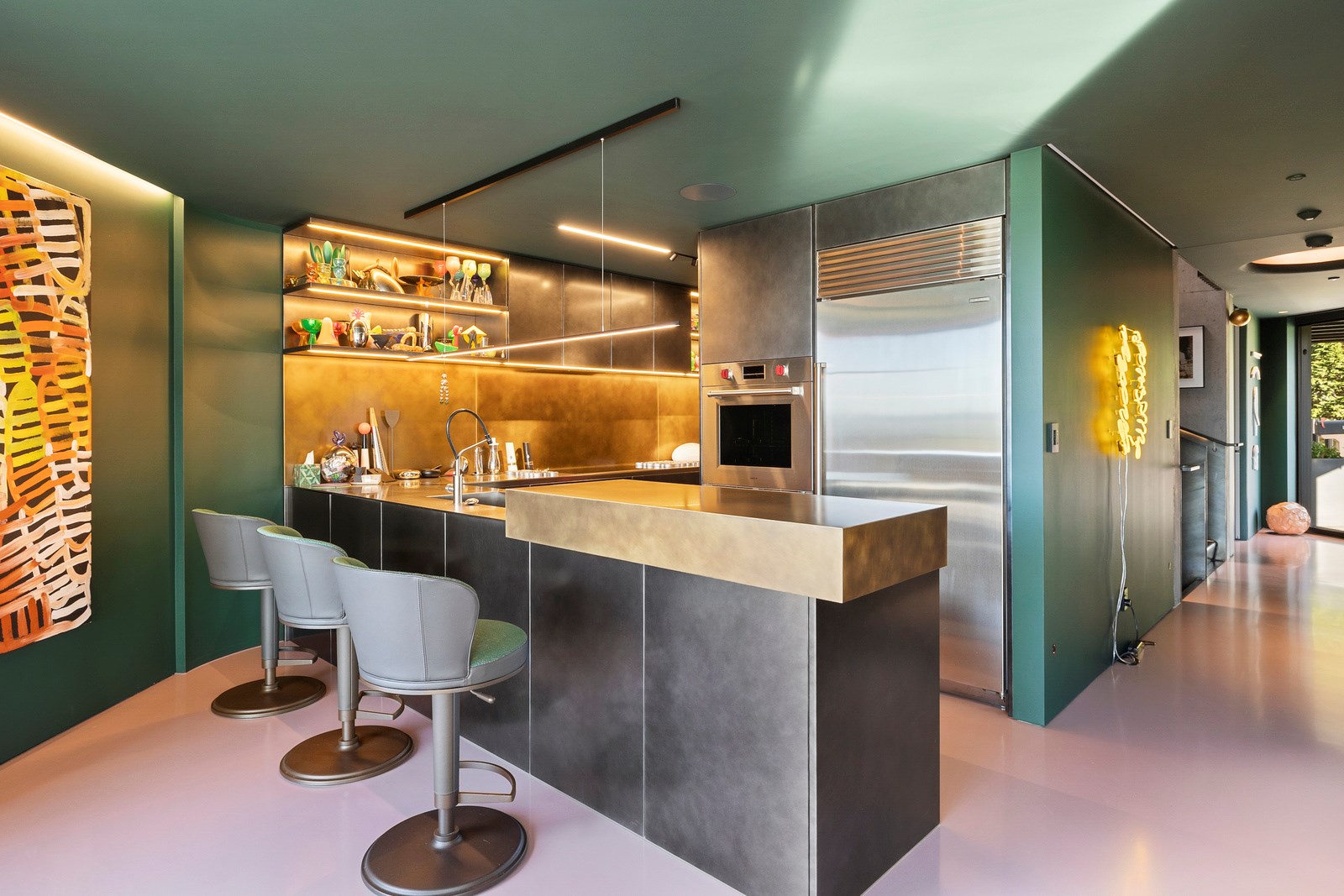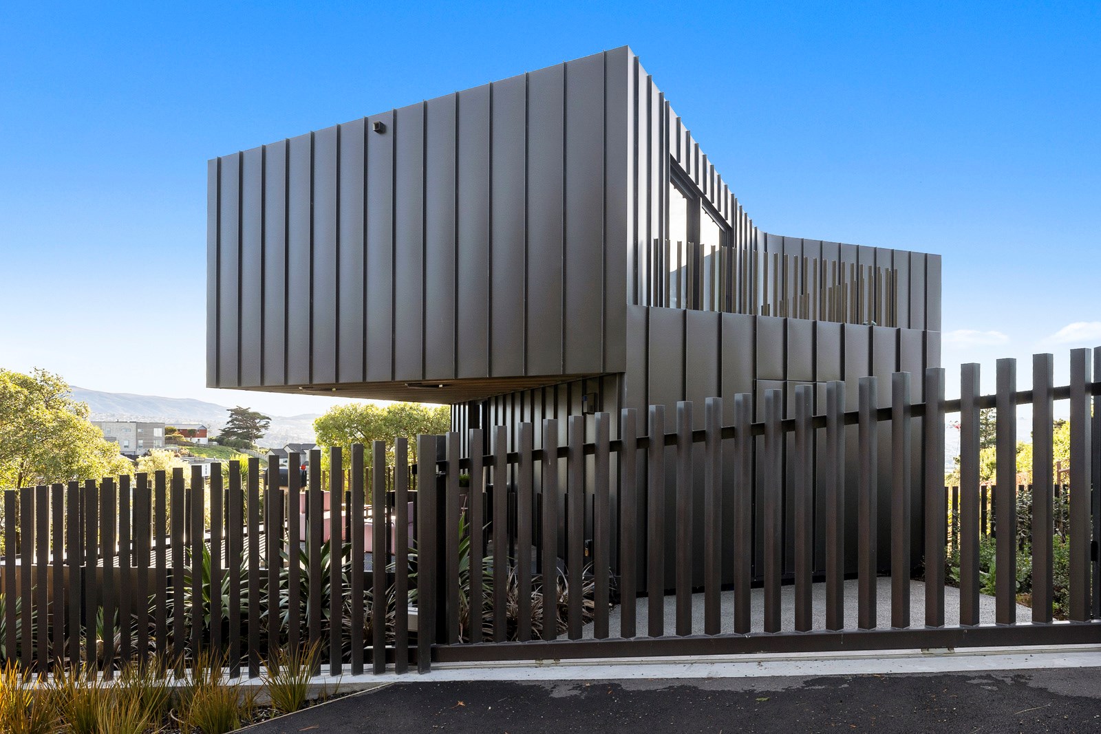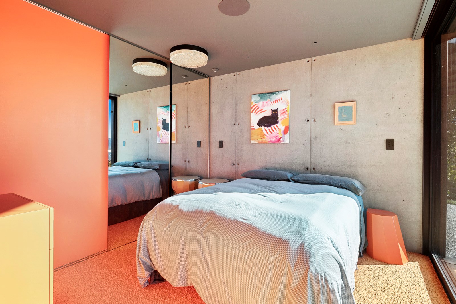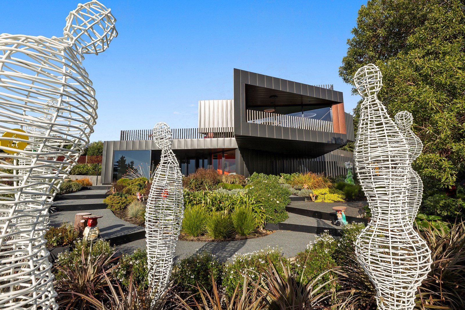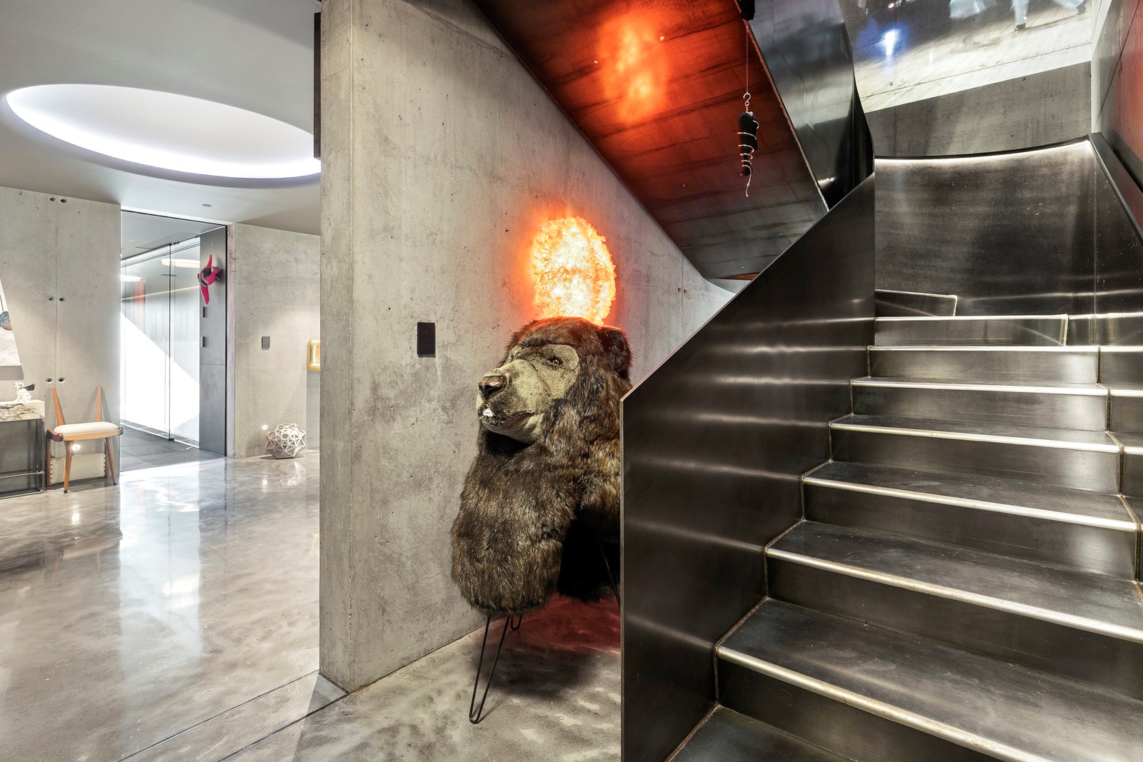 From the city to the ocean, the views are all there for the taking. But there’s more to cast your eyes upon within this seaside delight. This Dunedin home is a piece of art itself. Between the architectural flourishes and pops of colour (including on the ceiling and floors), there’s a lot to admire. On paper, the three-story address has two bedrooms, two bathrooms and two spacious living areas. But add to that the following: a storage room complete with bespoke racking, plus a separate arts and crafts room. There’s an indoor pool as well. The structure of the 415sqm home is concrete, poured in situ. The exterior, including the soffits, is clad in standing seam Eurotray with a flush mounted entry door and garage door. Steel beams support the home’s many cantilevered sections. Concrete and bespoke steelwork also feature in the internal finishing: leading off the entry lobby there’s a lift, finished with handmade mesh metal doors, and a curved metal staircase that was craned in before the hot roof was completed. This climate-controlled smart home is also decked out with tech, with entertainment and lighting activated by the touch of a smartphone.