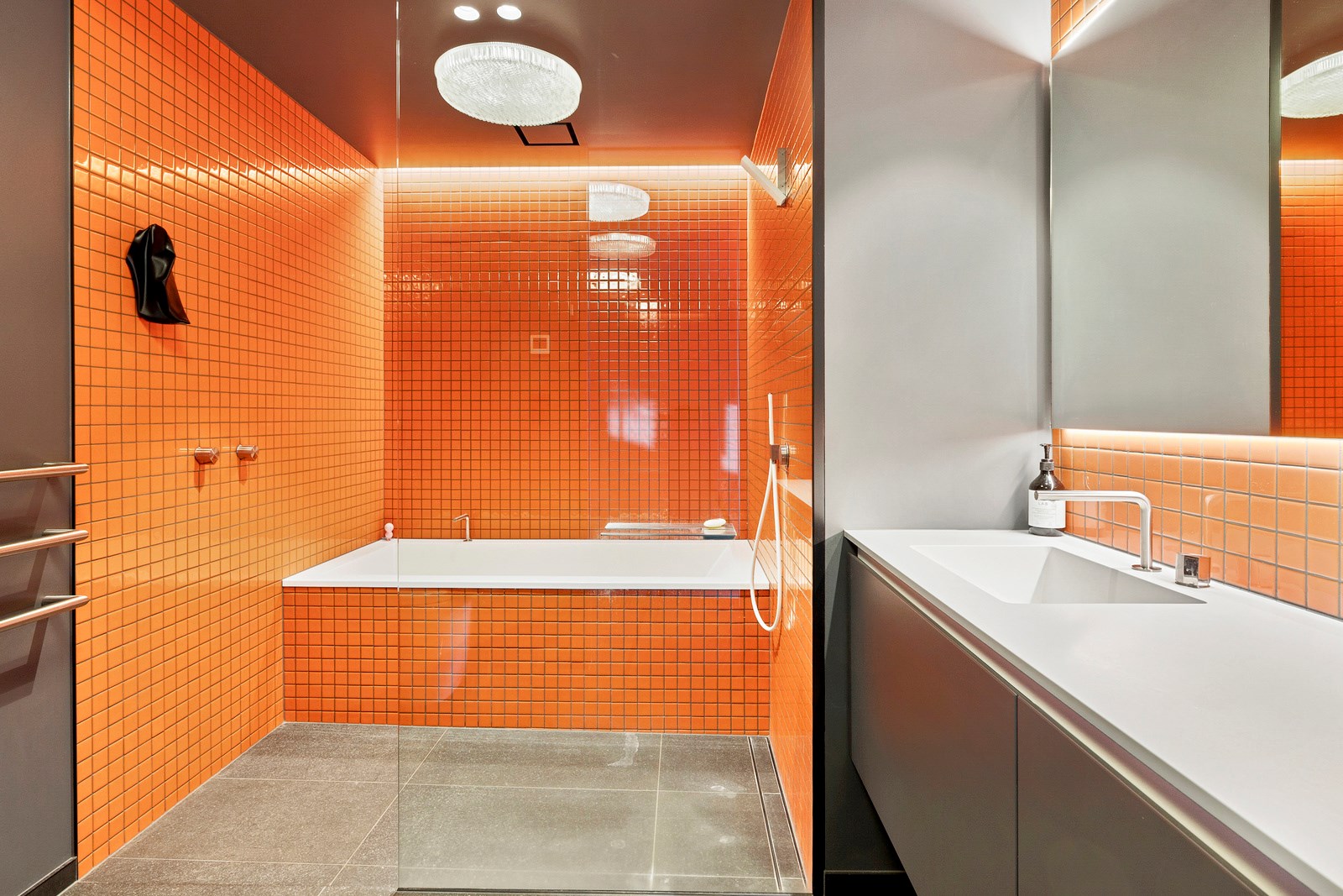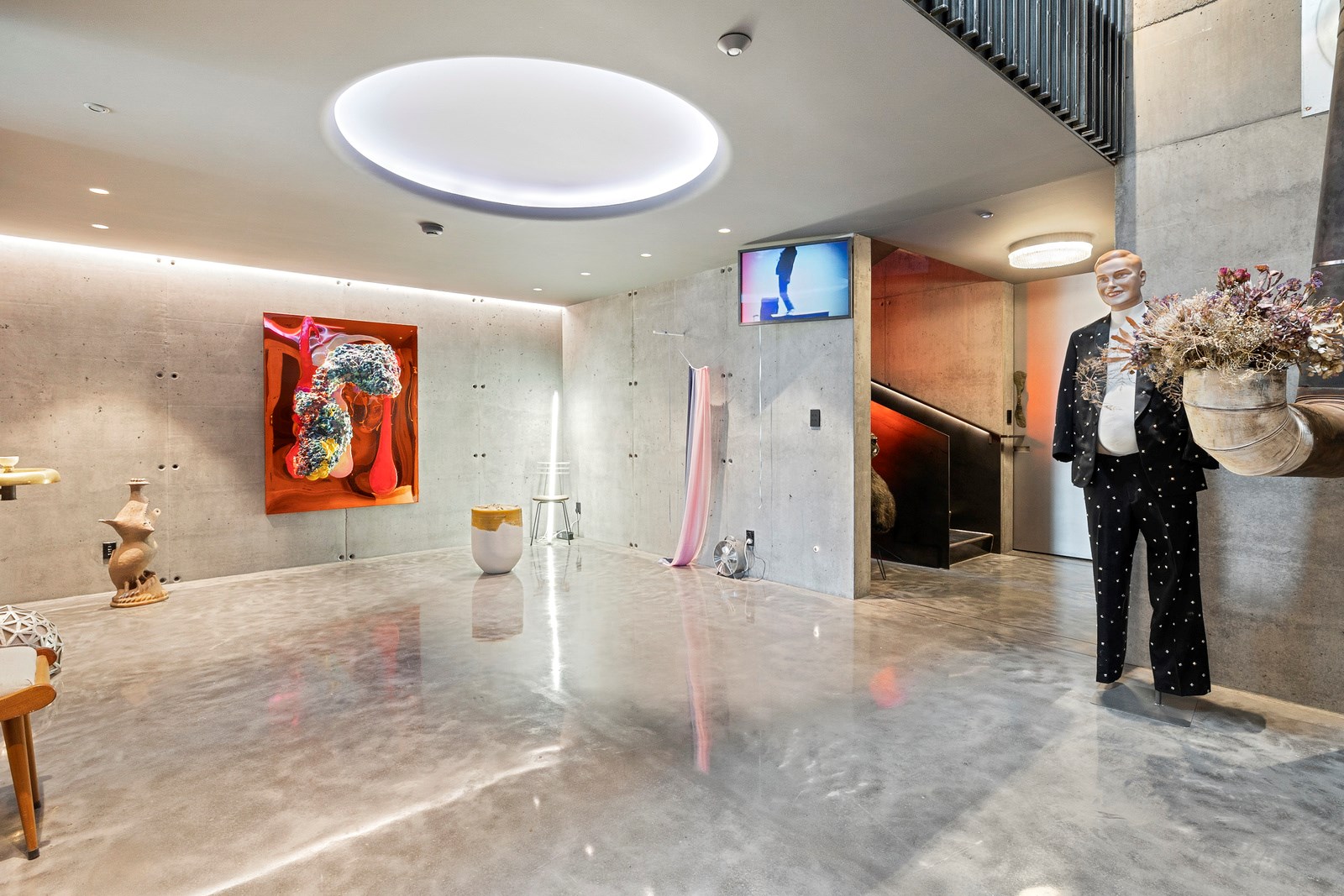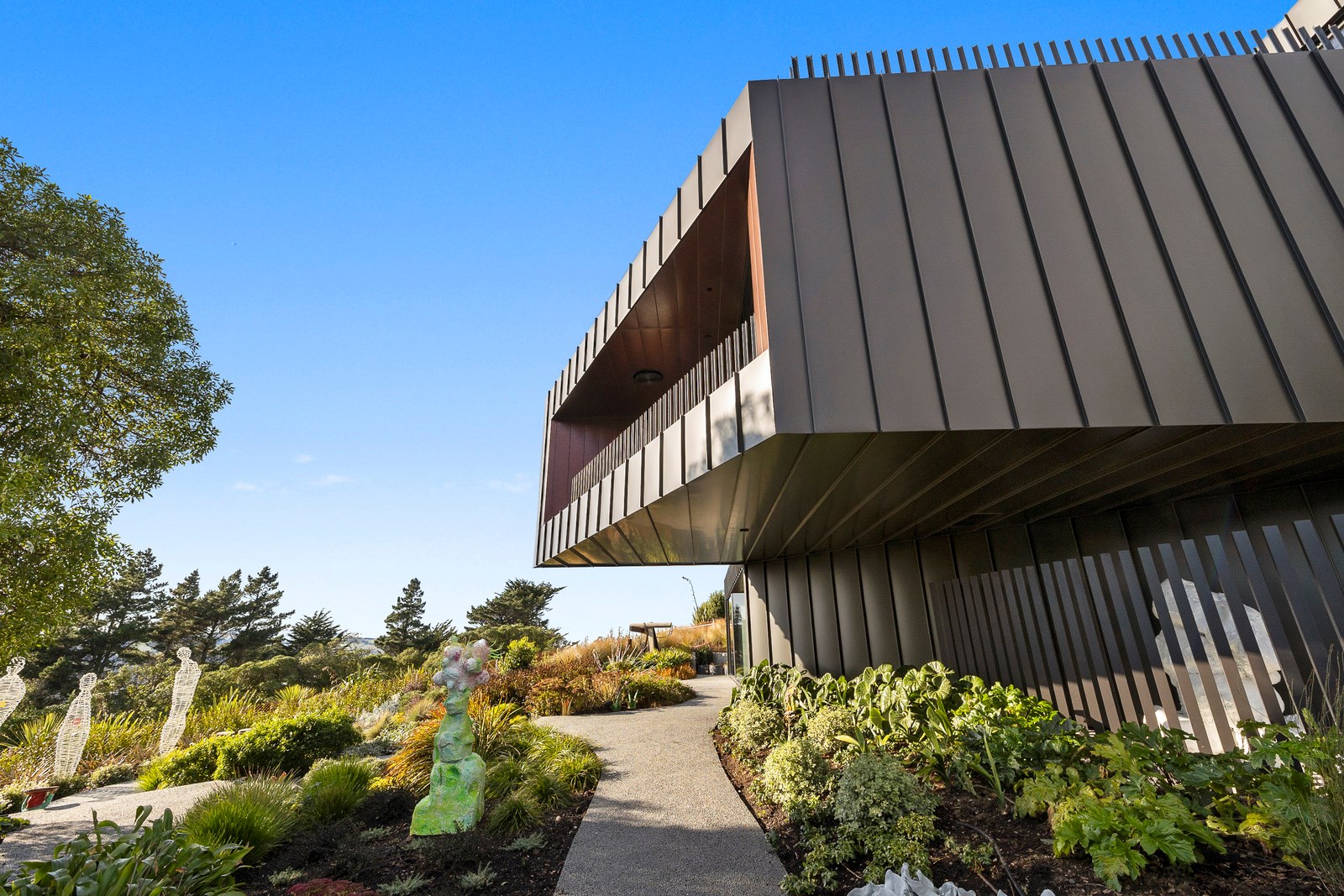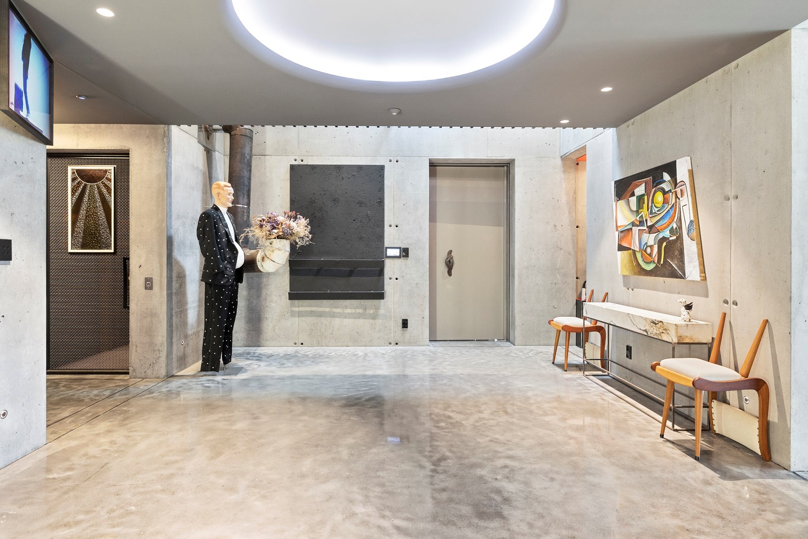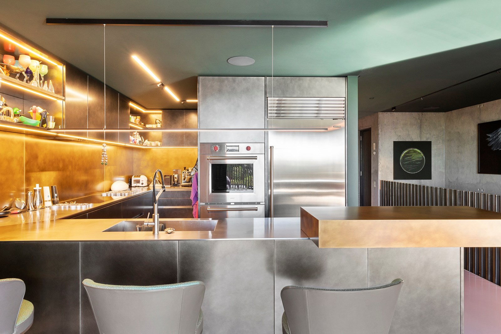 From the city to the ocean, the views are all there for the taking. But there’s more to cast your eyes upon within this seaside delight. This Dunedin home is a piece of art itself. Between the architectural flourishes and pops of colour (including on the ceiling and floors), there’s a lot to admire. On paper, the three-story address has two bedrooms, two bathrooms and two spacious living areas. But add to that the following: a storage room complete with bespoke racking, plus a separate arts and crafts room. There’s an indoor pool as well. The structure of the 415sqm home is concrete, poured in situ. The exterior, including the soffits, is clad in standing seam Eurotray with a flush mounted entry door and garage door. Steel beams support the home’s many cantilevered sections. Concrete and bespoke steelwork also feature in the internal finishing: leading off the entry lobby there’s a lift, finished with handmade mesh metal doors, and a curved metal staircase that was craned in before the hot roof was completed. This climate-controlled smart home is also decked out with tech, with entertainment and lighting activated by the touch of a smartphone.