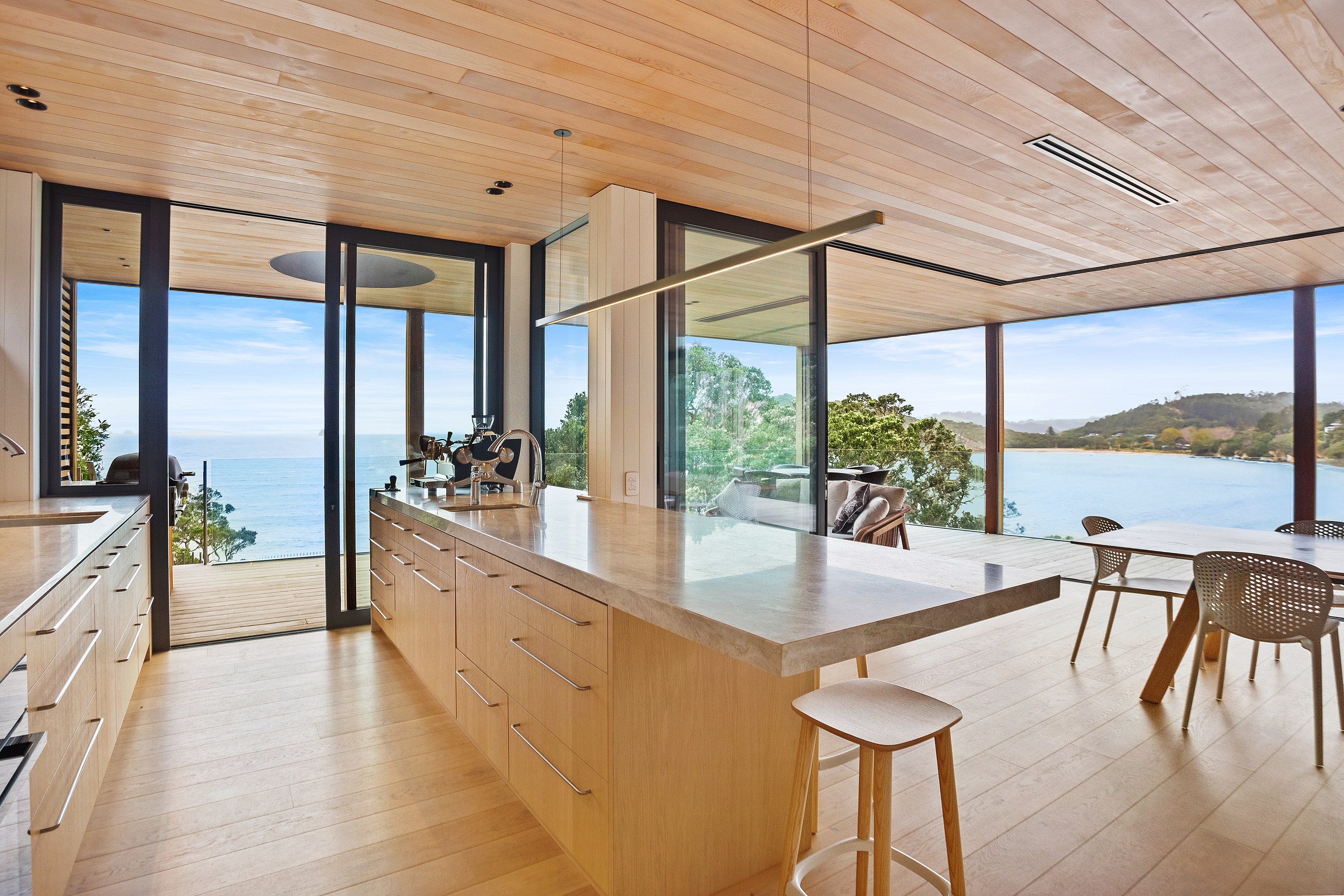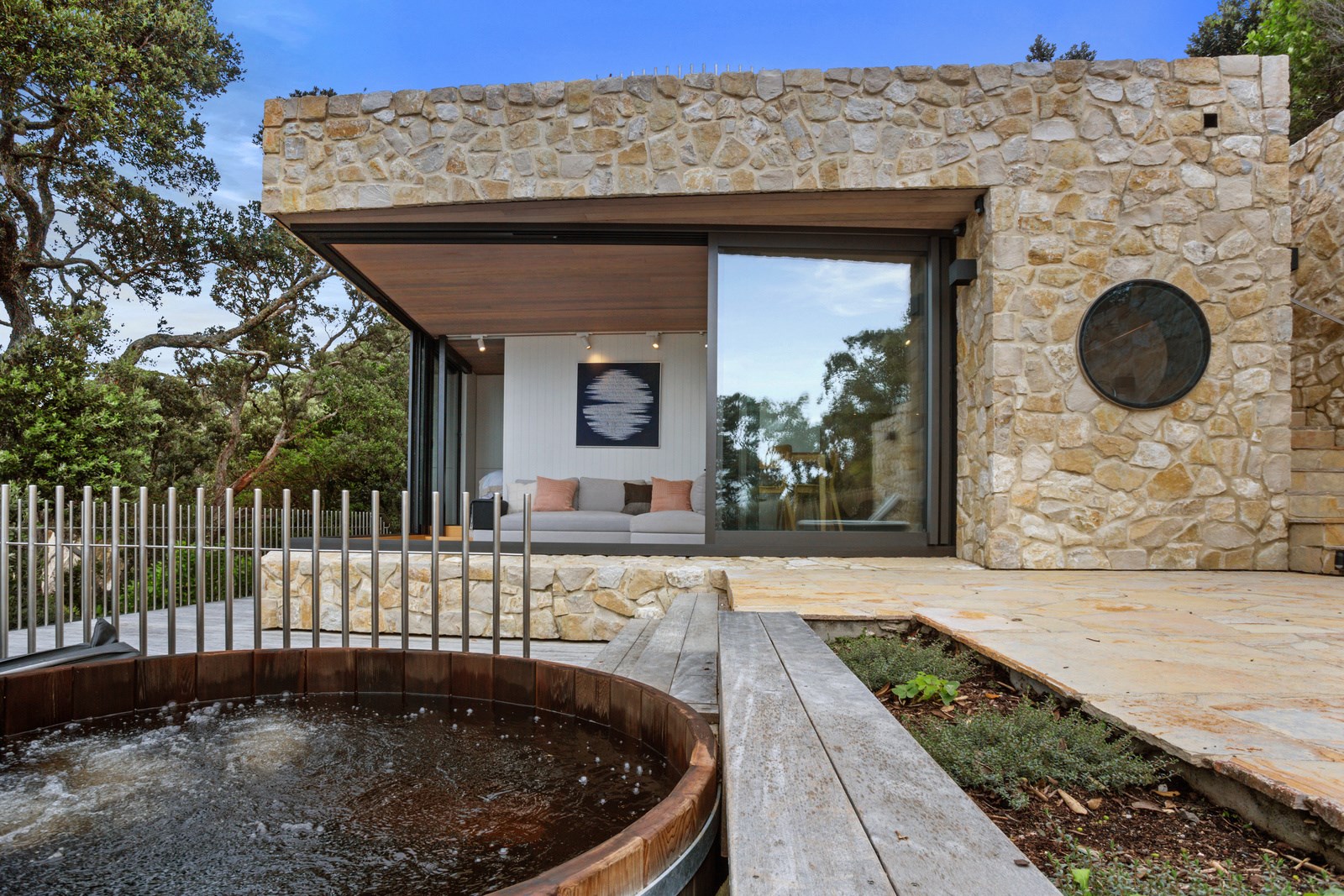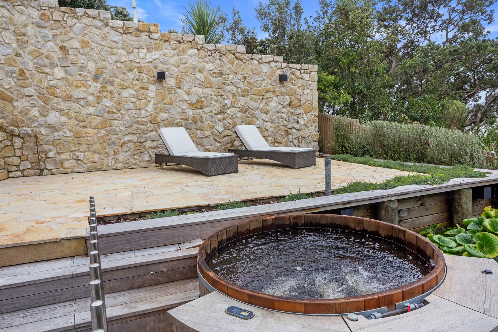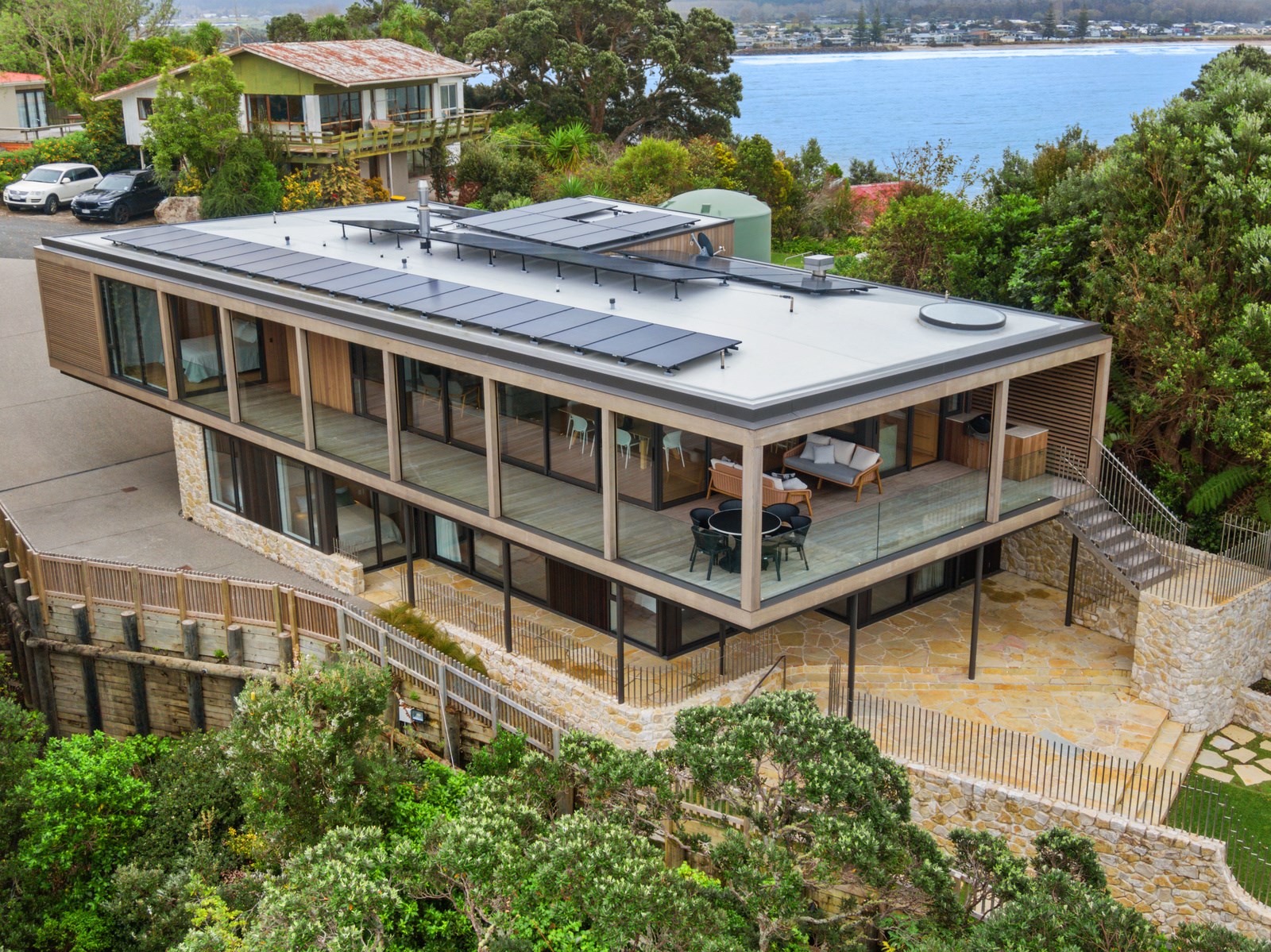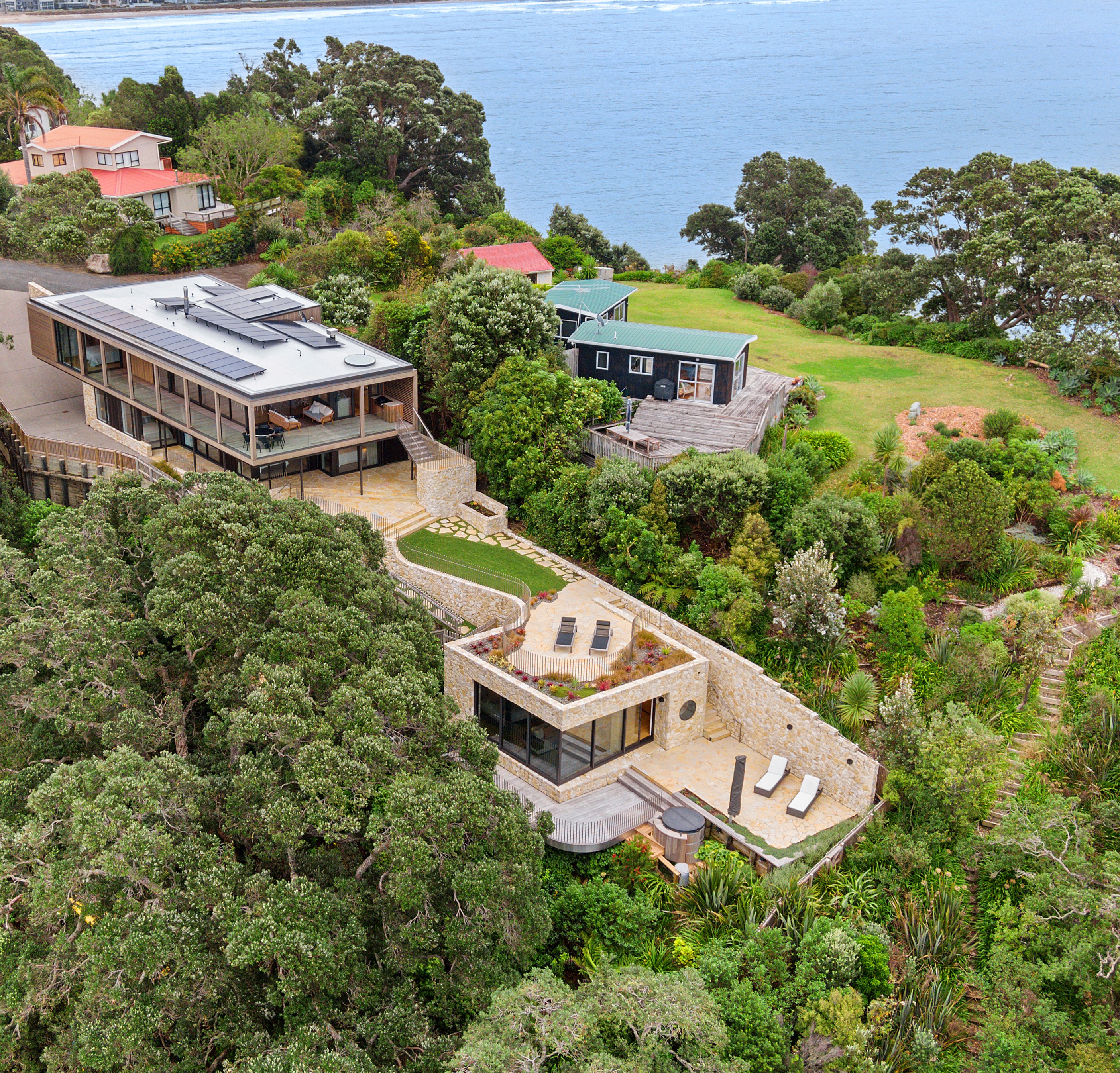 Coastal living tends to encourage a slower pace — views to get lost in, a focus on sunlight, soft textures and soothing palettes. If that’s the case, the owners of this masterpiece overlooking Cooks Beach must be positively blissed out. Natural timbers and locally sourced stone blend seamlessly with the environment, creating a harmonious connection with nature. The cleverly designed multi-level house places garaging, bedrooms, bathrooms and living areas on the ground floor, with the main living areas and guest suite upstairs. Expansive decks offer many outdoor living and entertainment options. The goal was clear from the beginning: to craft a beach house that caters to the needs of a multi-generational family, with everyone enjoying time together while still having their own space. Enduring materials, including stone sourced from Te Kūiti, are designed to age beautifully and add a sense of solidity and permanence. The home has five-plus bedrooms, four bathrooms and three living rooms, and incorporates sustainable features to minimise its environmental impact. A Tesla Solar Powerwall allows it to operate off the grid, storing energy during the day.
