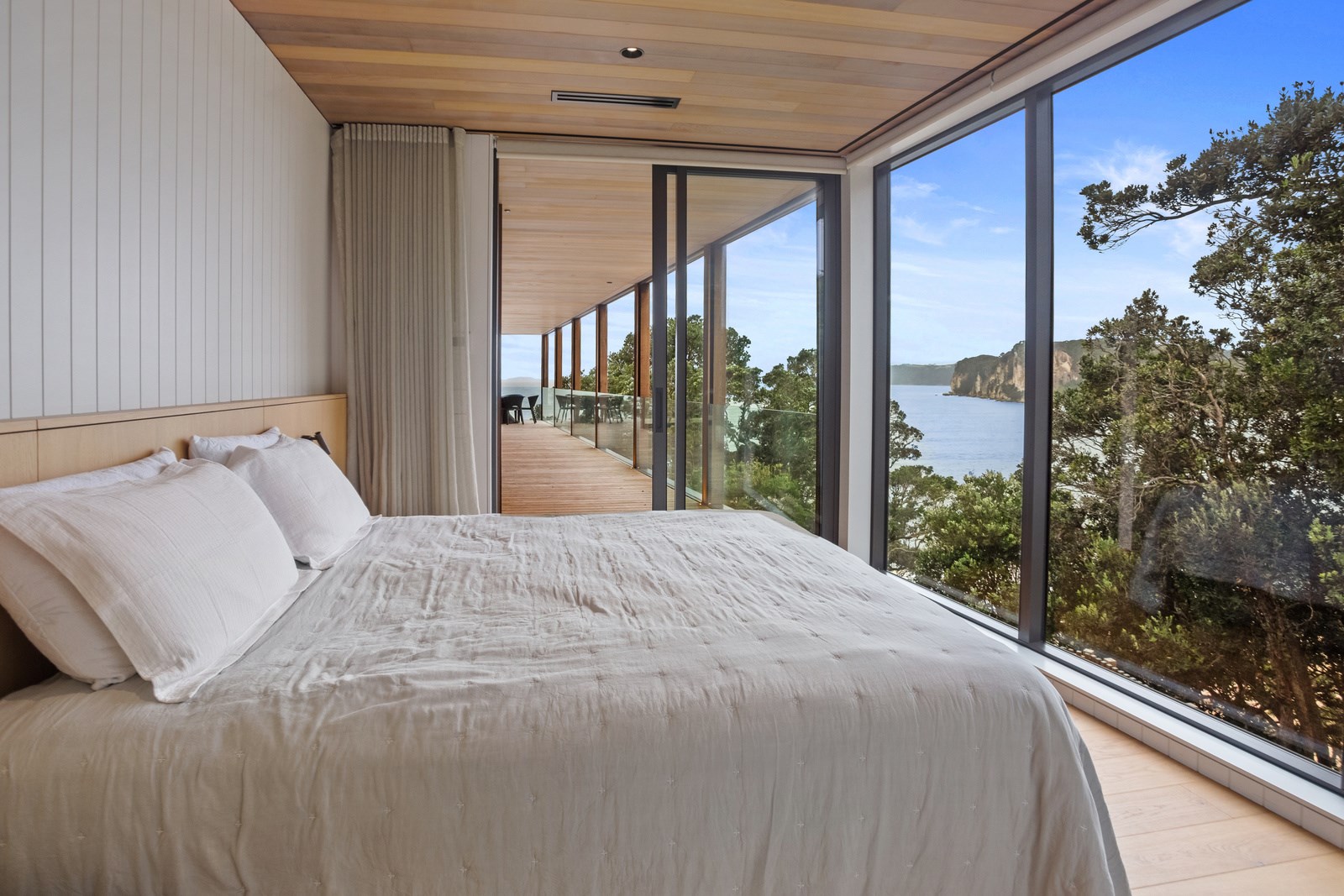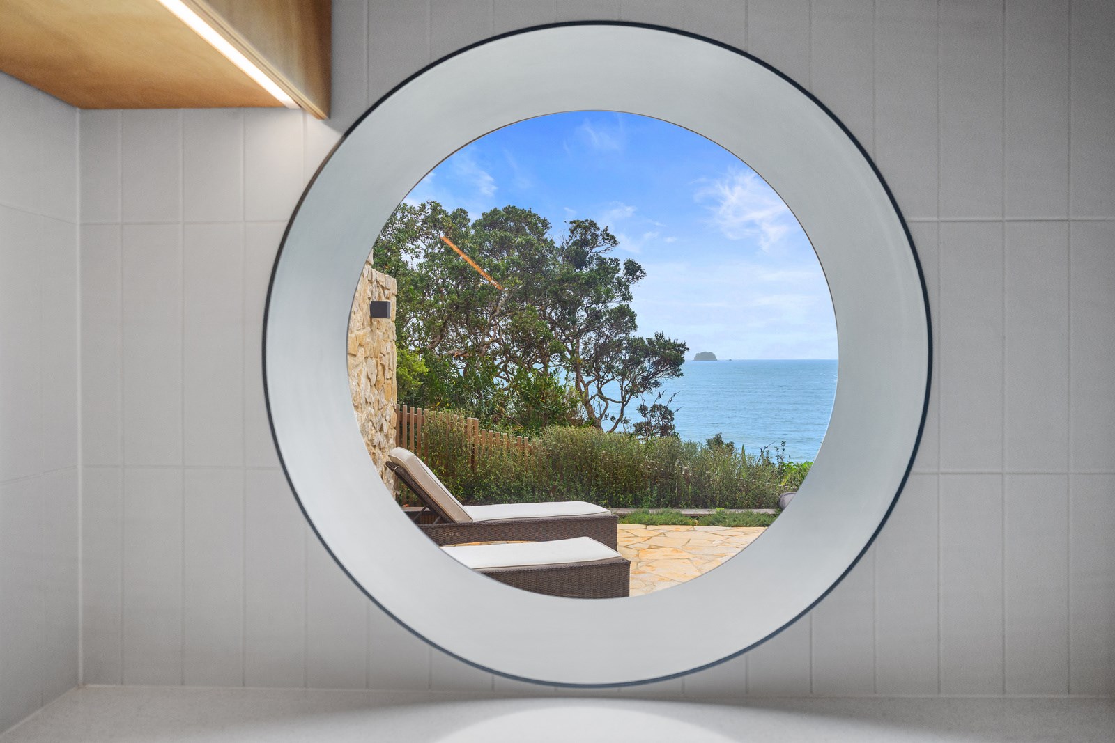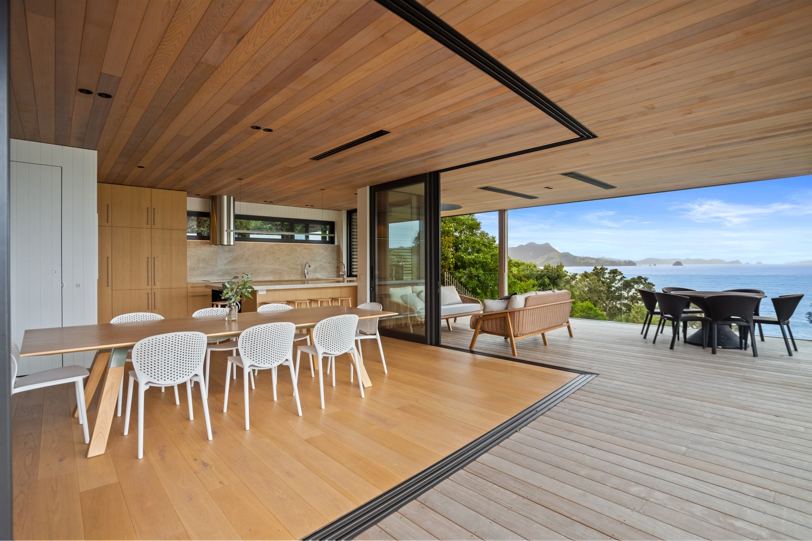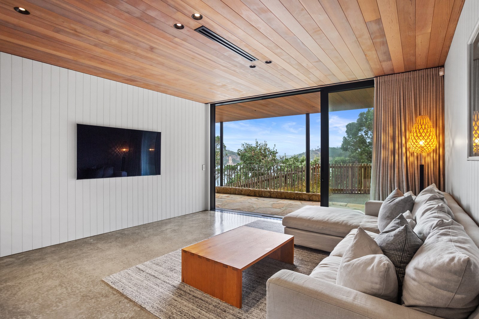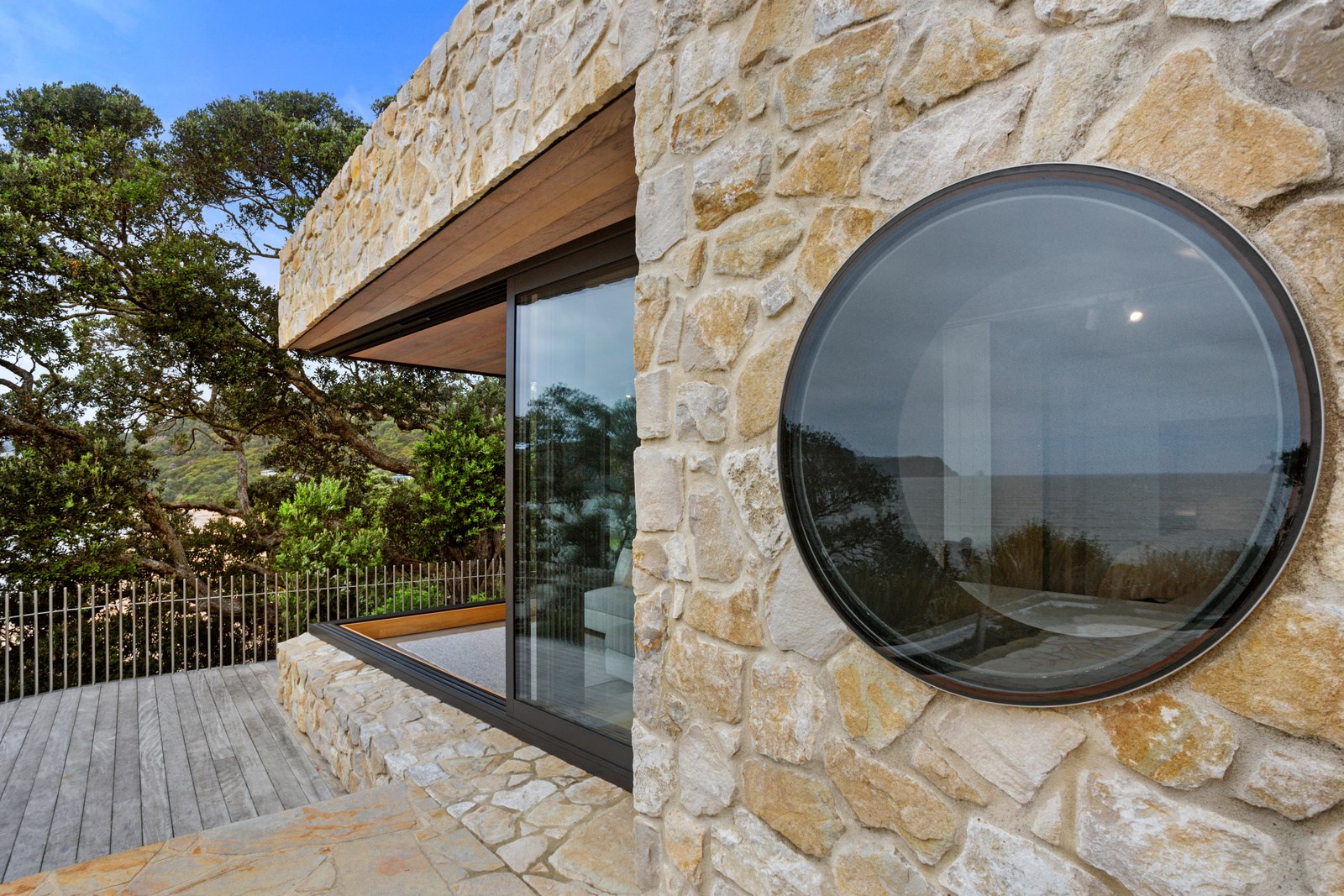 Coastal living tends to encourage a slower pace — views to get lost in, a focus on sunlight, soft textures and soothing palettes. If that’s the case, the owners of this masterpiece overlooking Cooks Beach must be positively blissed out. Natural timbers and locally sourced stone blend seamlessly with the environment, creating a harmonious connection with nature. The cleverly designed multi-level house places garaging, bedrooms, bathrooms and living areas on the ground floor, with the main living areas and guest suite upstairs. Expansive decks offer many outdoor living and entertainment options. The goal was clear from the beginning: to craft a beach house that caters to the needs of a multi-generational family, with everyone enjoying time together while still having their own space. Enduring materials, including stone sourced from Te Kūiti, are designed to age beautifully and add a sense of solidity and permanence. The home has five-plus bedrooms, four bathrooms and three living rooms, and incorporates sustainable features to minimise its environmental impact. A Tesla Solar Powerwall allows it to operate off the grid, storing energy during the day.