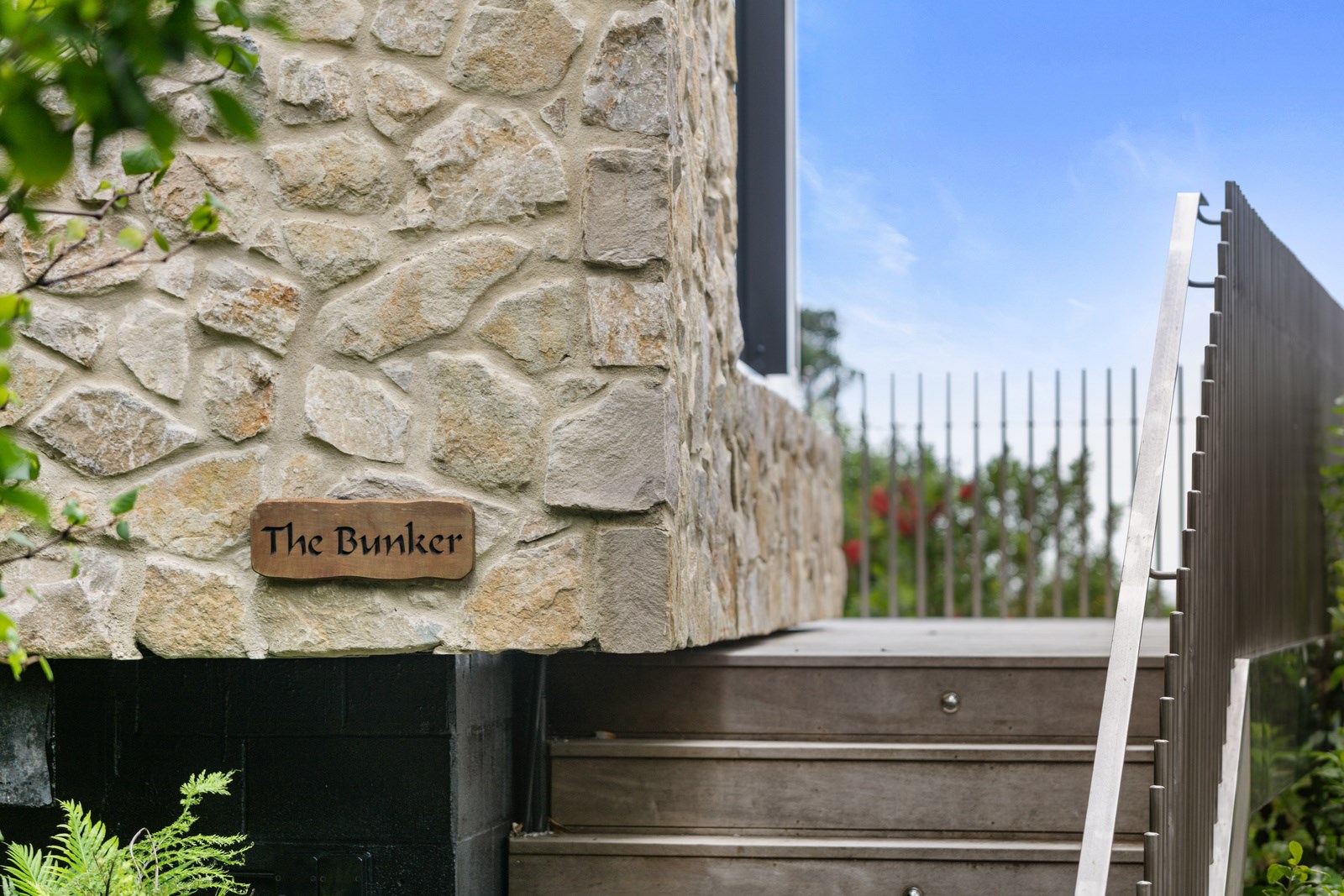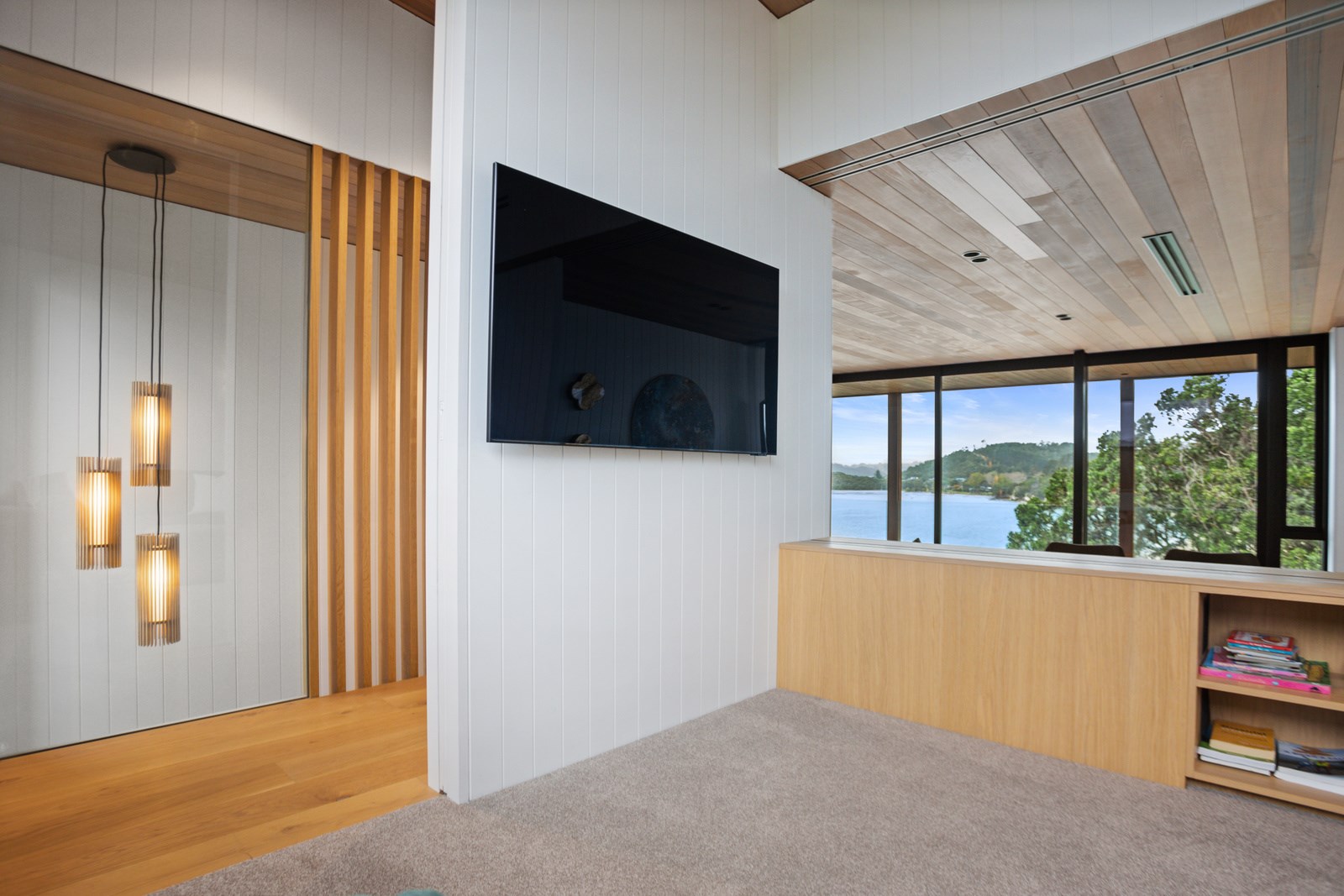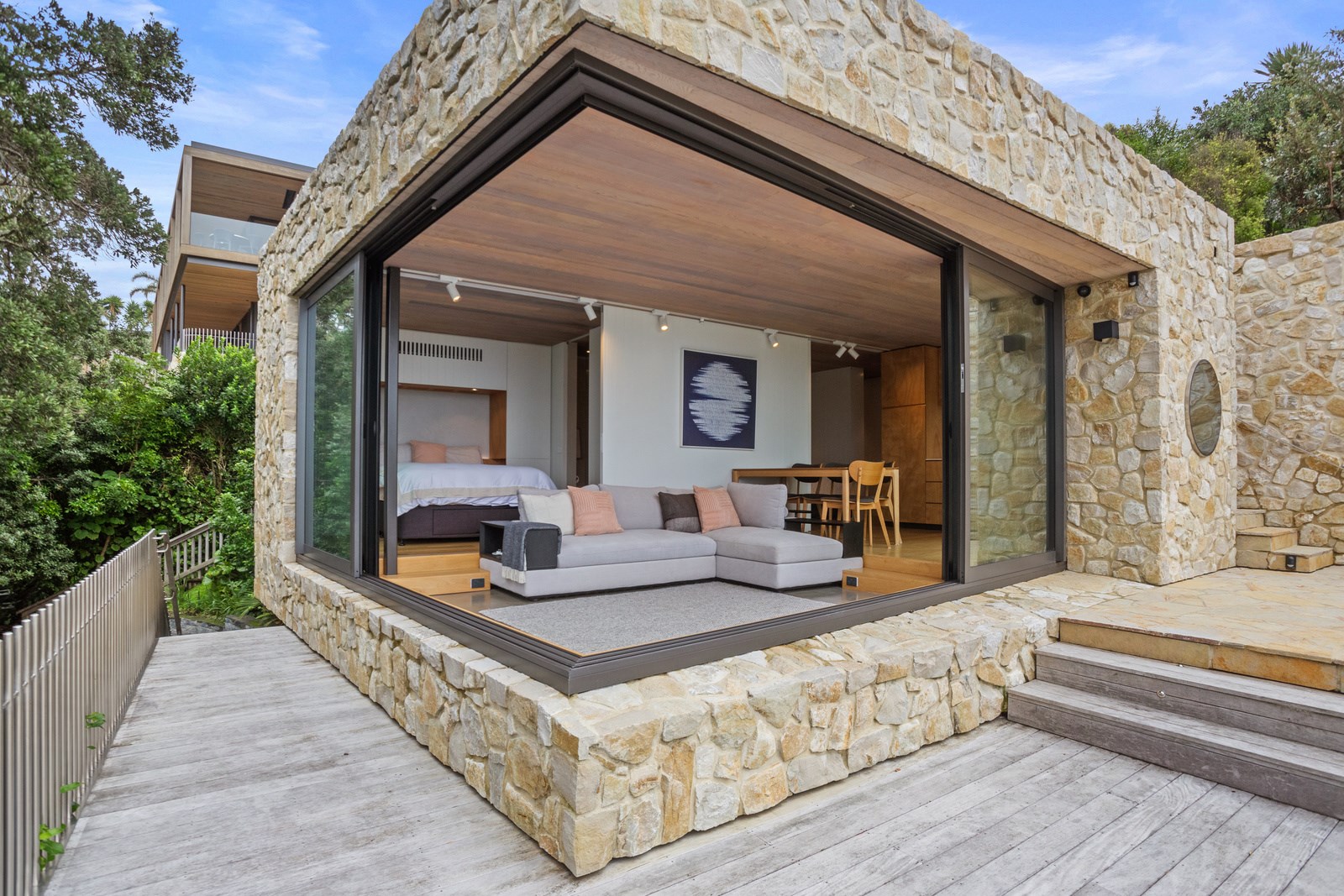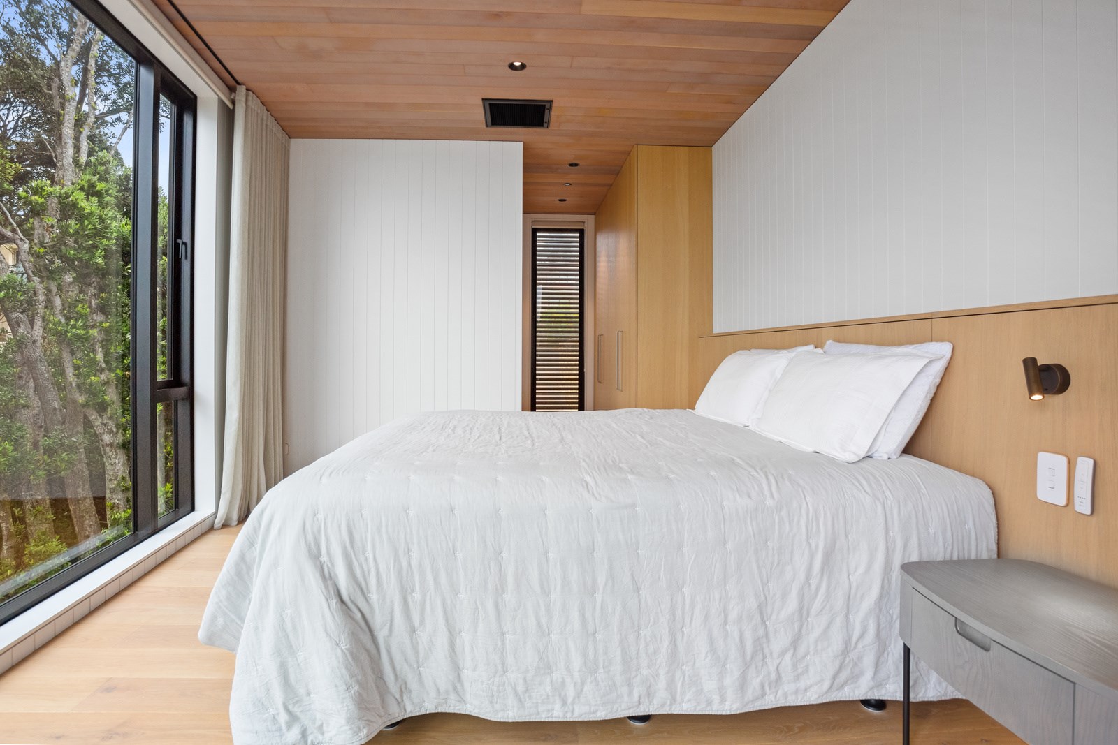 Coastal living tends to encourage a slower pace — views to get lost in, a focus on sunlight, soft textures and soothing palettes. If that’s the case, the owners of this masterpiece overlooking Cooks Beach must be positively blissed out. Natural timbers and locally sourced stone blend seamlessly with the environment, creating a harmonious connection with nature. The cleverly designed multi-level house places garaging, bedrooms, bathrooms and living areas on the ground floor, with the main living areas and guest suite upstairs. Expansive decks offer many outdoor living and entertainment options. The goal was clear from the beginning: to craft a beach house that caters to the needs of a multi-generational family, with everyone enjoying time together while still having their own space. Enduring materials, including stone sourced from Te Kūiti, are designed to age beautifully and add a sense of solidity and permanence. The home has five-plus bedrooms, four bathrooms and three living rooms, and incorporates sustainable features to minimise its environmental impact. A Tesla Solar Powerwall allows it to operate off the grid, storing energy during the day.