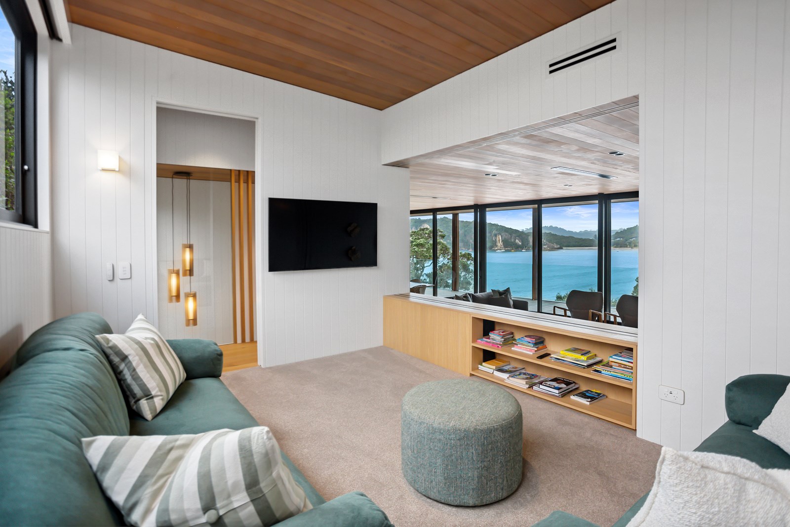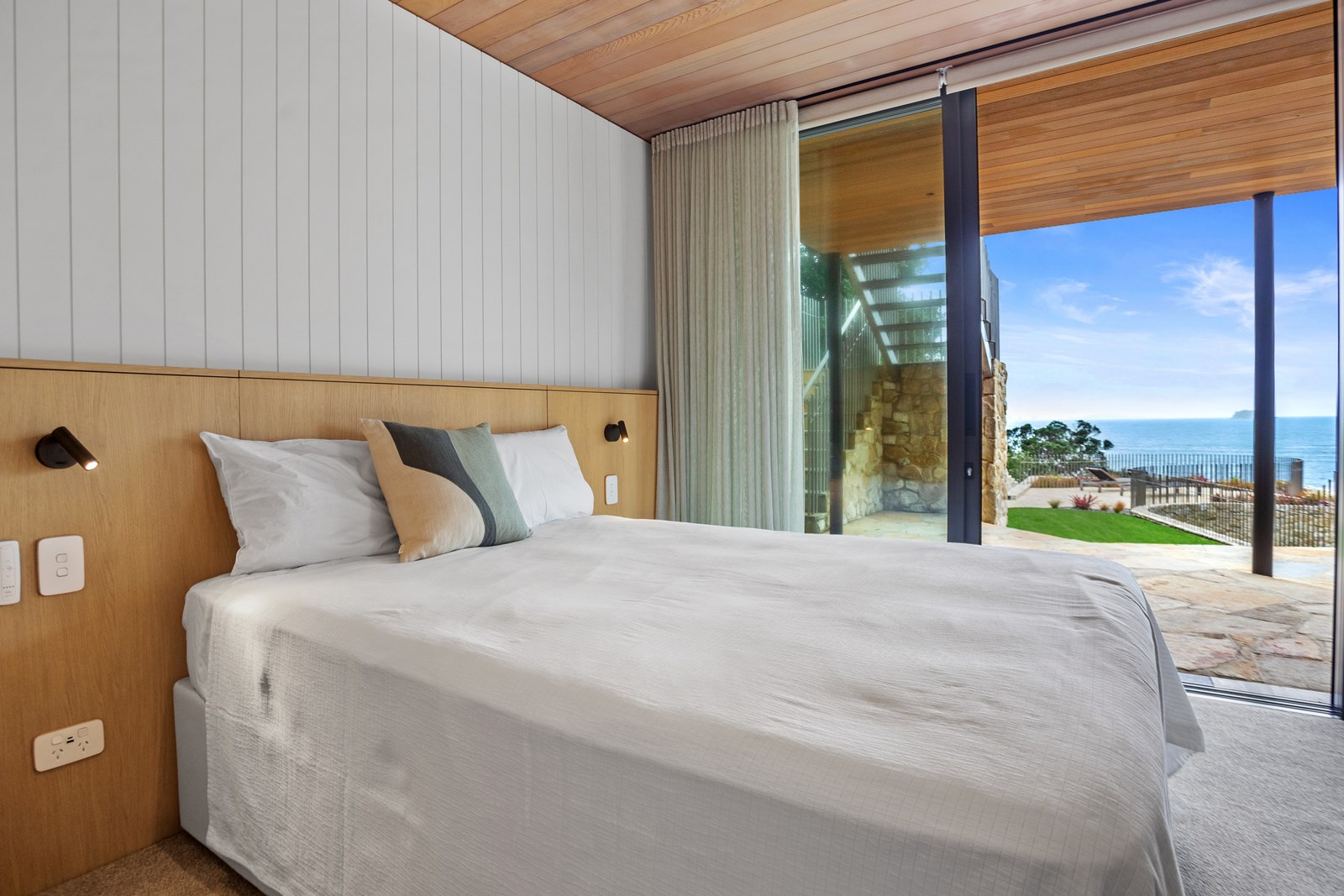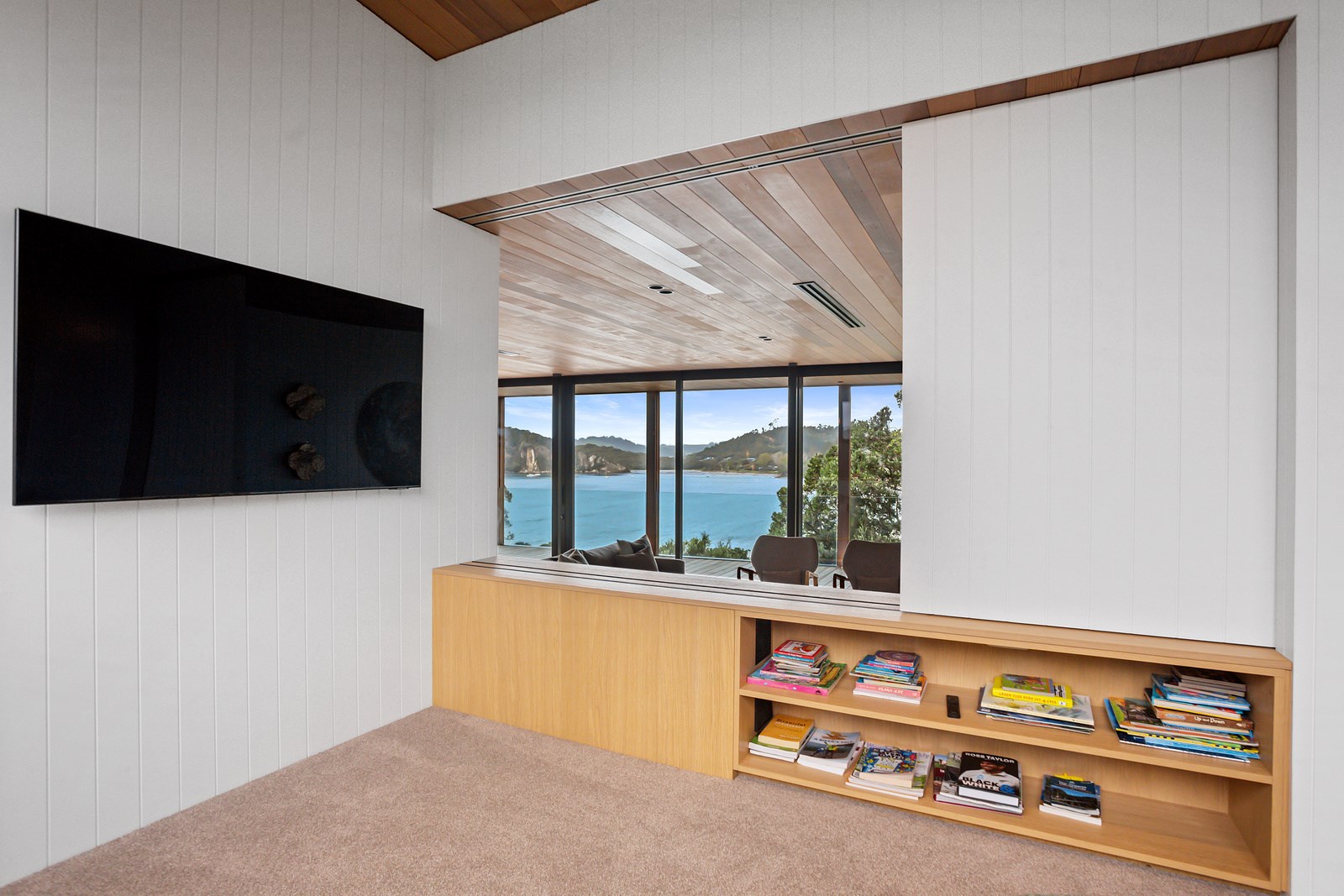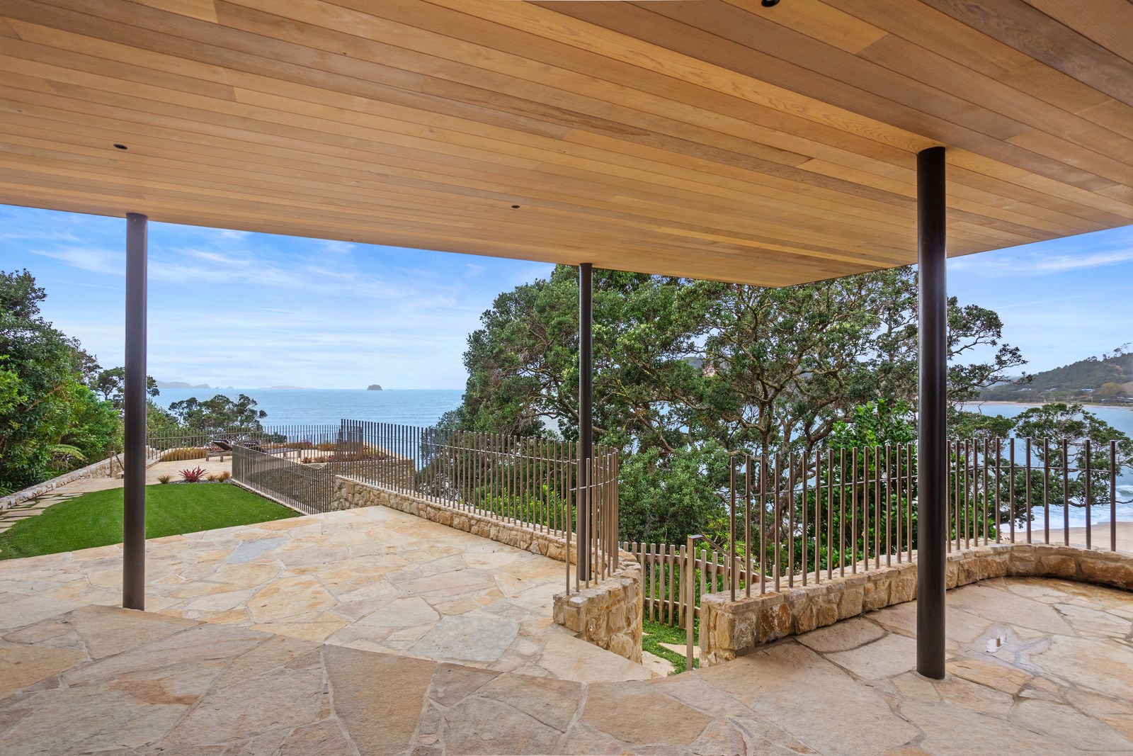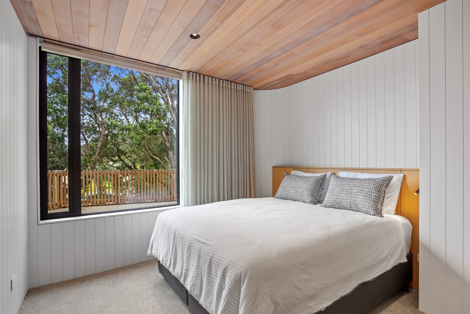 Coastal living tends to encourage a slower pace — views to get lost in, a focus on sunlight, soft textures and soothing palettes. If that’s the case, the owners of this masterpiece overlooking Cooks Beach must be positively blissed out. Natural timbers and locally sourced stone blend seamlessly with the environment, creating a harmonious connection with nature. The cleverly designed multi-level house places garaging, bedrooms, bathrooms and living areas on the ground floor, with the main living areas and guest suite upstairs. Expansive decks offer many outdoor living and entertainment options. The goal was clear from the beginning: to craft a beach house that caters to the needs of a multi-generational family, with everyone enjoying time together while still having their own space. Enduring materials, including stone sourced from Te Kūiti, are designed to age beautifully and add a sense of solidity and permanence. The home has five-plus bedrooms, four bathrooms and three living rooms, and incorporates sustainable features to minimise its environmental impact. A Tesla Solar Powerwall allows it to operate off the grid, storing energy during the day.