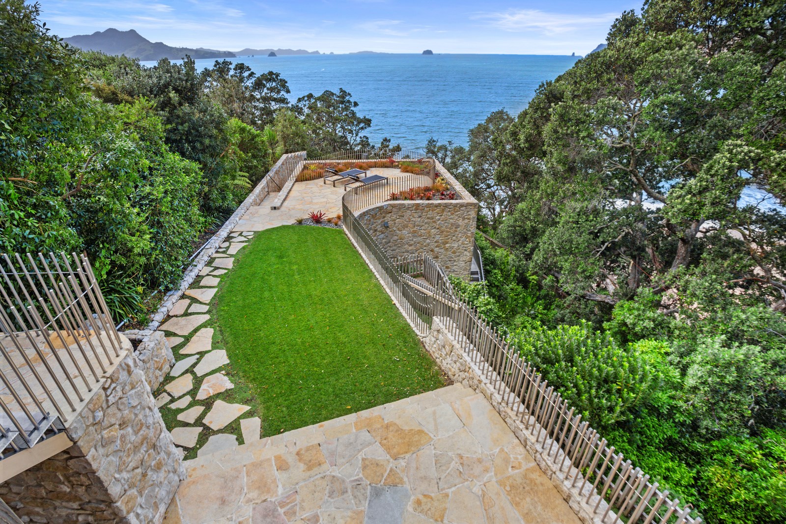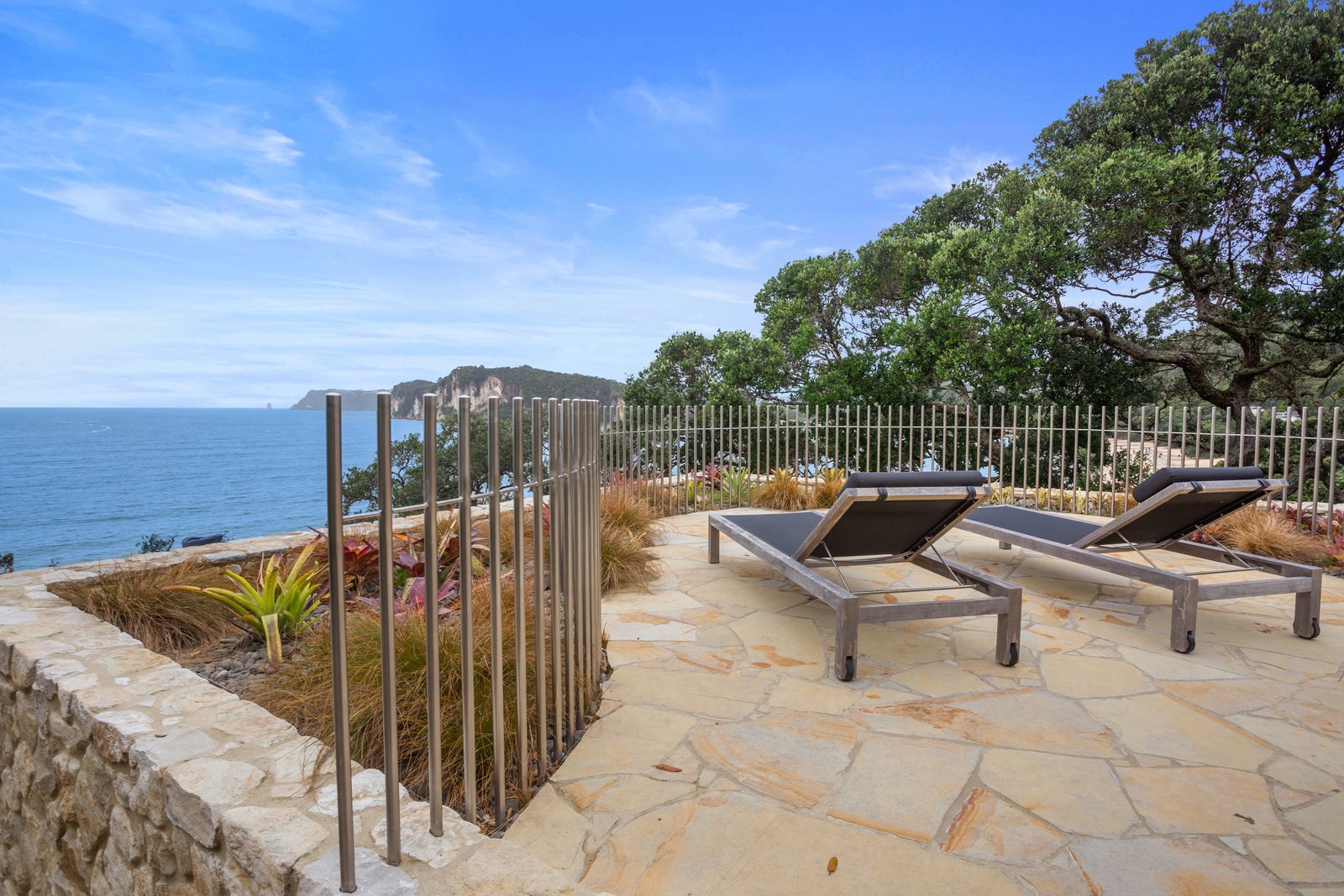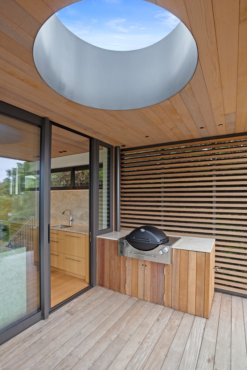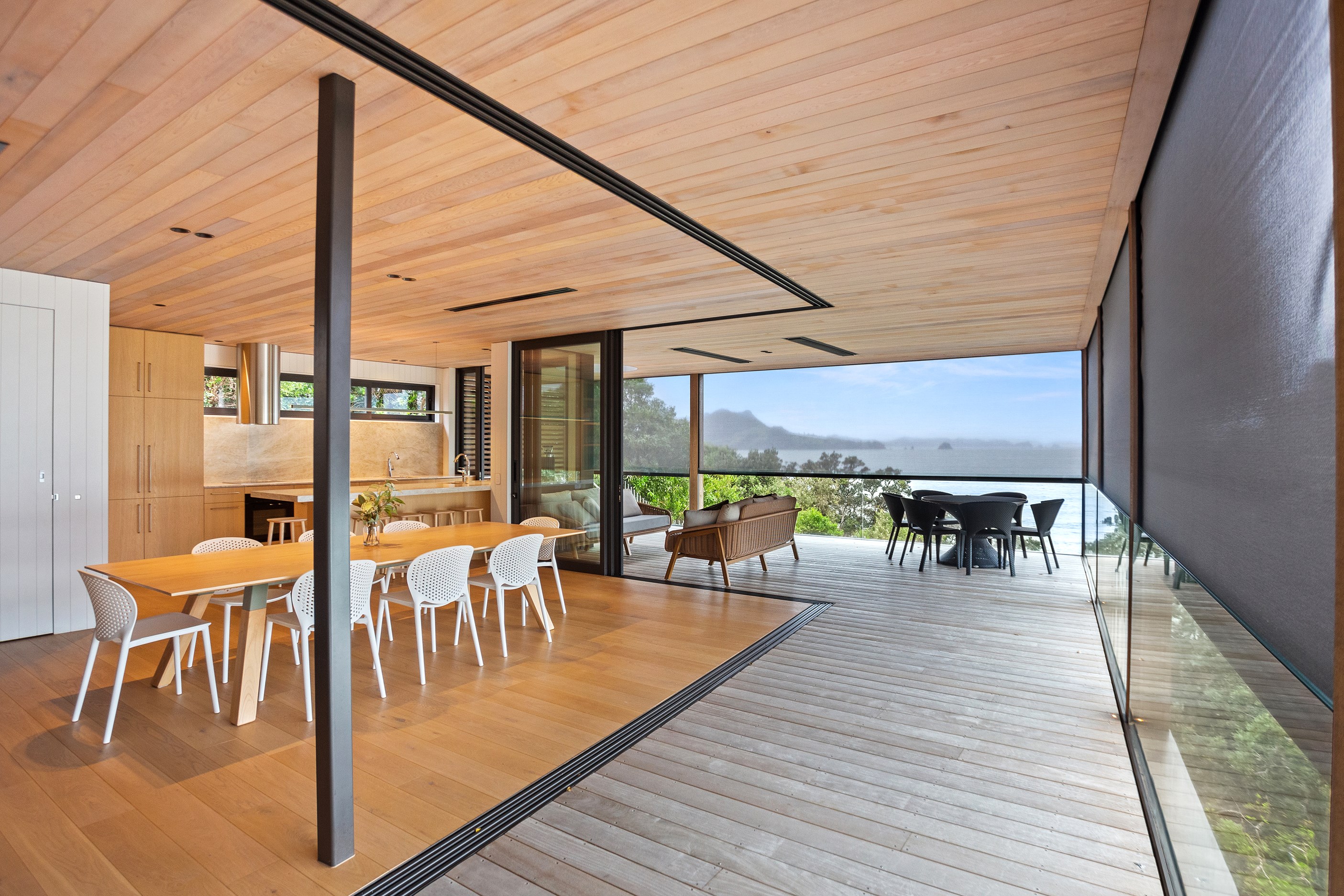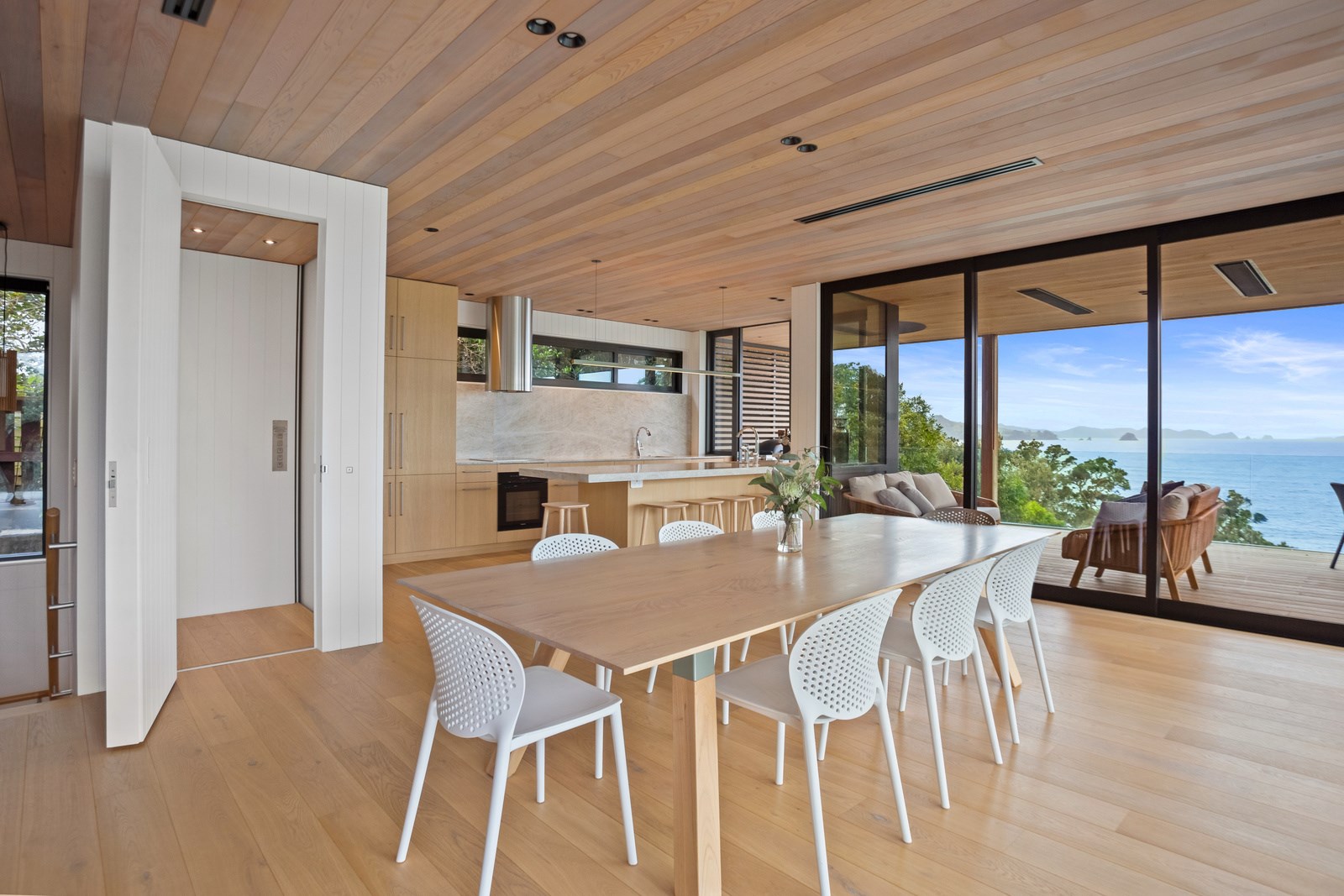 Coastal living tends to encourage a slower pace — views to get lost in, a focus on sunlight, soft textures and soothing palettes. If that’s the case, the owners of this masterpiece overlooking Cooks Beach must be positively blissed out. Natural timbers and locally sourced stone blend seamlessly with the environment, creating a harmonious connection with nature. The cleverly designed multi-level house places garaging, bedrooms, bathrooms and living areas on the ground floor, with the main living areas and guest suite upstairs. Expansive decks offer many outdoor living and entertainment options. The goal was clear from the beginning: to craft a beach house that caters to the needs of a multi-generational family, with everyone enjoying time together while still having their own space. Enduring materials, including stone sourced from Te Kūiti, are designed to age beautifully and add a sense of solidity and permanence. The home has five-plus bedrooms, four bathrooms and three living rooms, and incorporates sustainable features to minimise its environmental impact. A Tesla Solar Powerwall allows it to operate off the grid, storing energy during the day.
