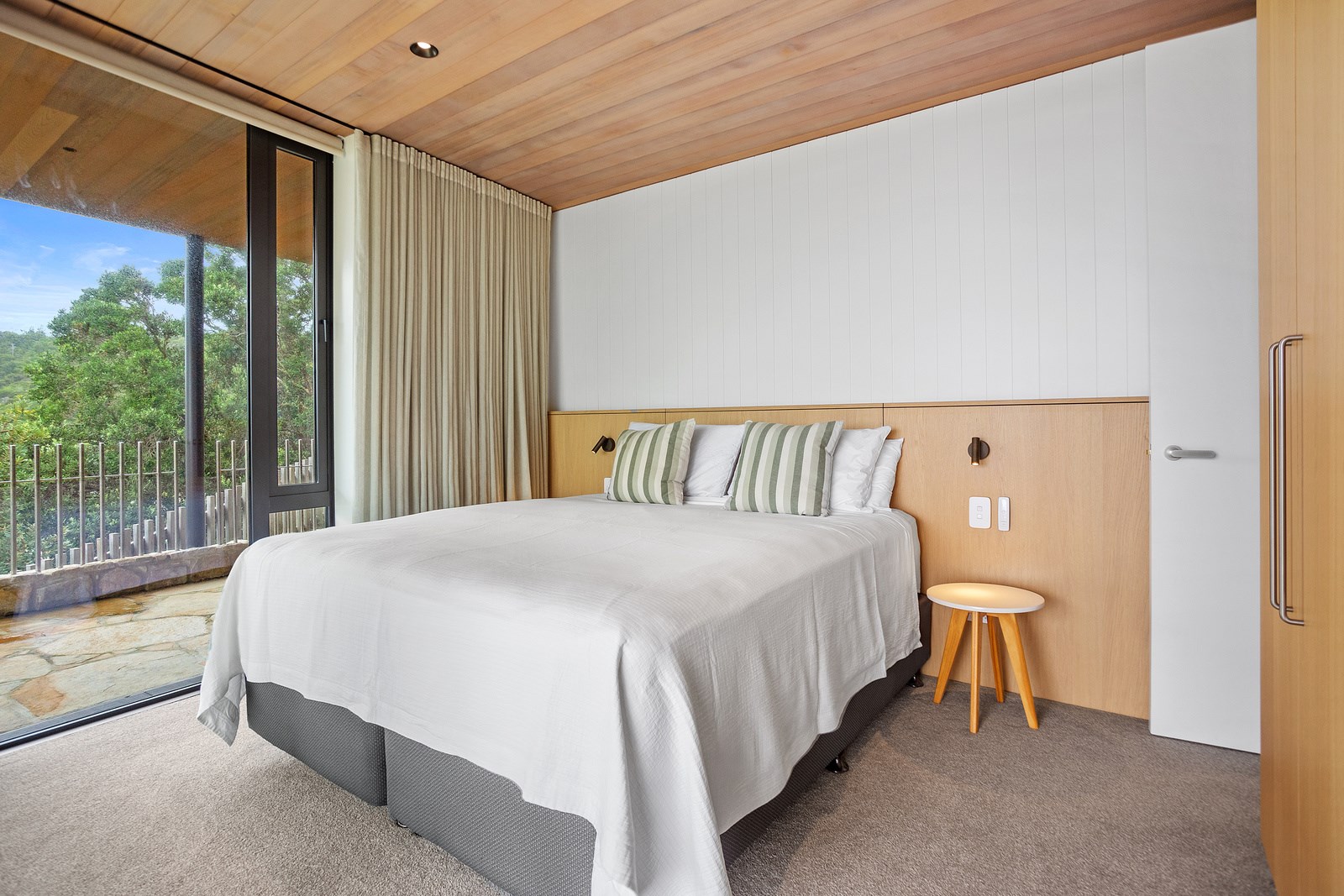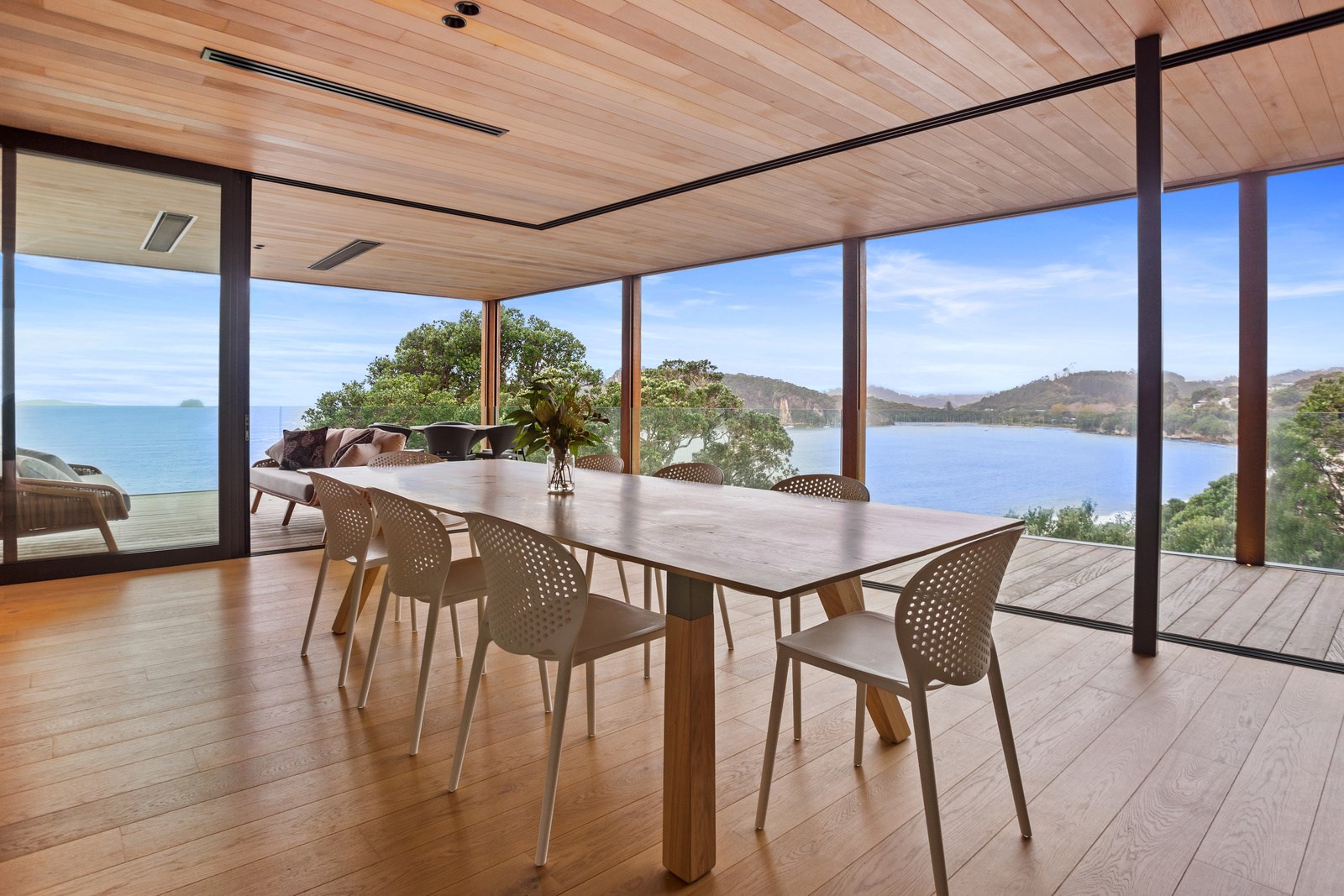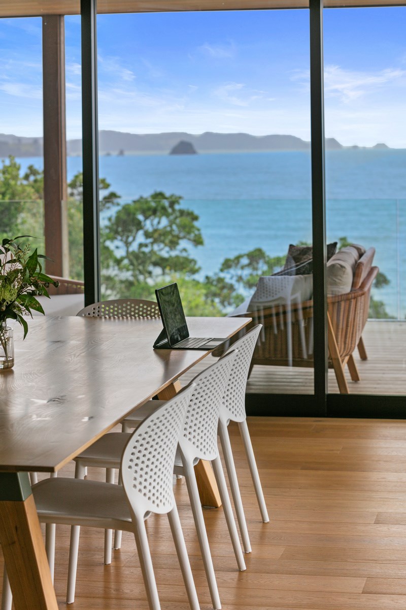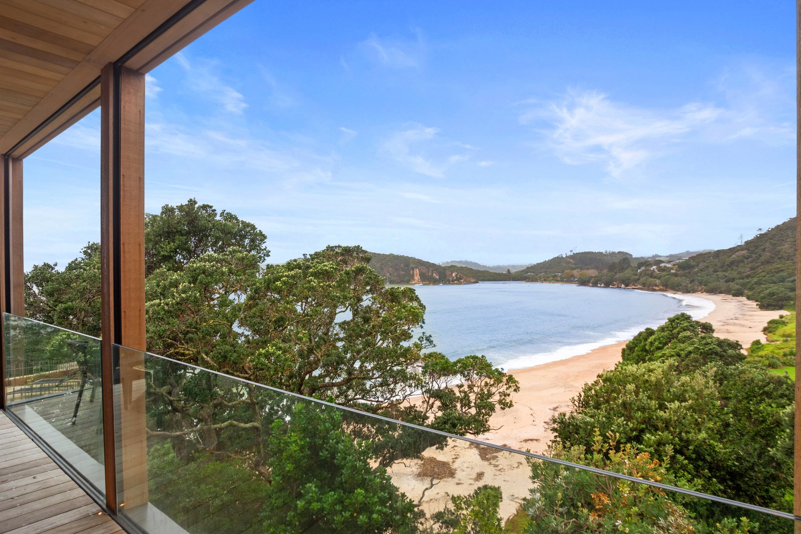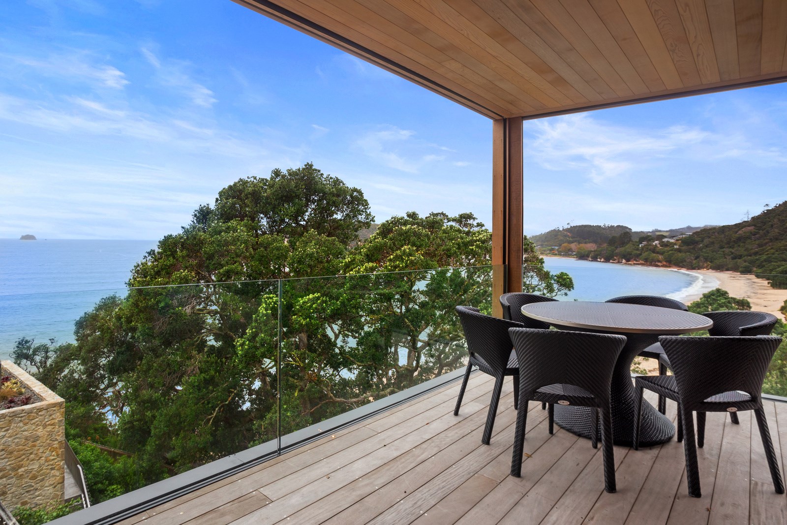 Coastal living tends to encourage a slower pace — views to get lost in, a focus on sunlight, soft textures and soothing palettes. If that’s the case, the owners of this masterpiece overlooking Cooks Beach must be positively blissed out. Natural timbers and locally sourced stone blend seamlessly with the environment, creating a harmonious connection with nature. The cleverly designed multi-level house places garaging, bedrooms, bathrooms and living areas on the ground floor, with the main living areas and guest suite upstairs. Expansive decks offer many outdoor living and entertainment options. The goal was clear from the beginning: to craft a beach house that caters to the needs of a multi-generational family, with everyone enjoying time together while still having their own space. Enduring materials, including stone sourced from Te Kūiti, are designed to age beautifully and add a sense of solidity and permanence. The home has five-plus bedrooms, four bathrooms and three living rooms, and incorporates sustainable features to minimise its environmental impact. A Tesla Solar Powerwall allows it to operate off the grid, storing energy during the day.
