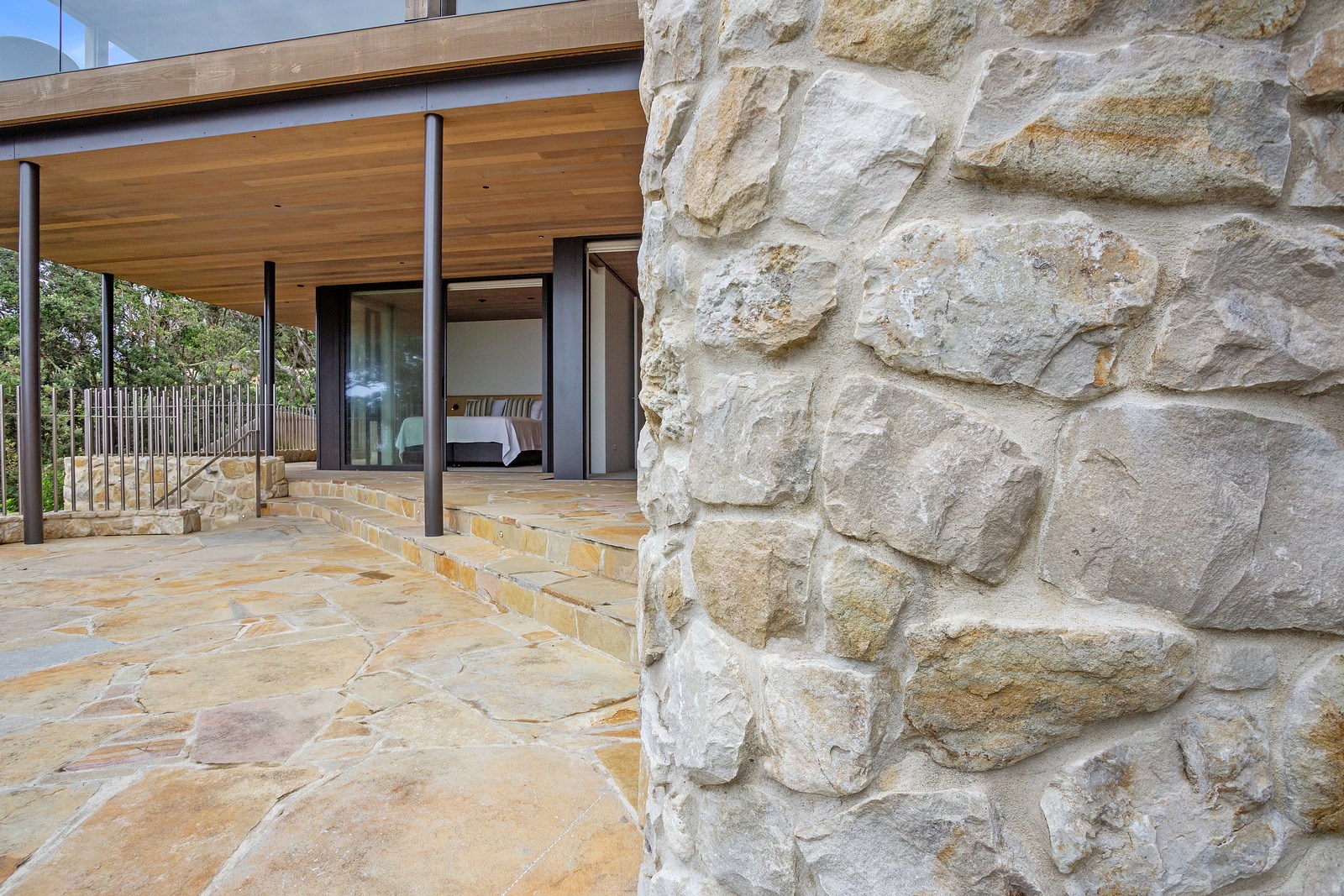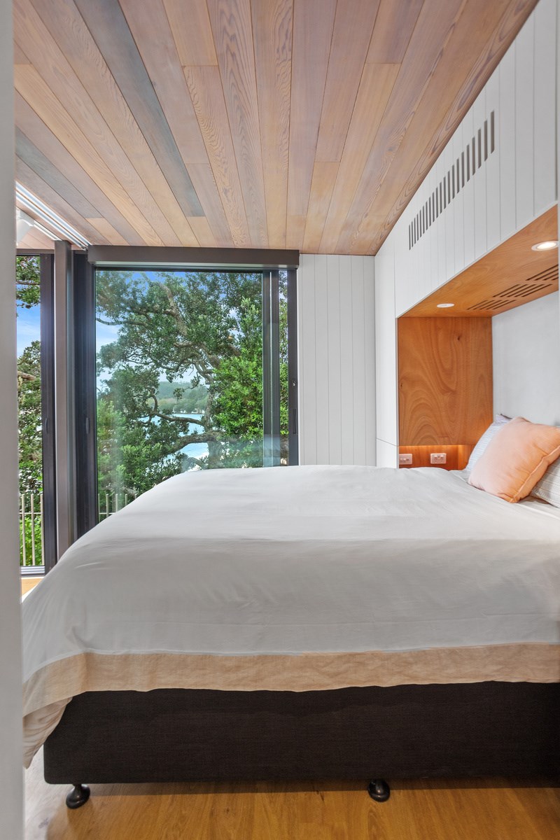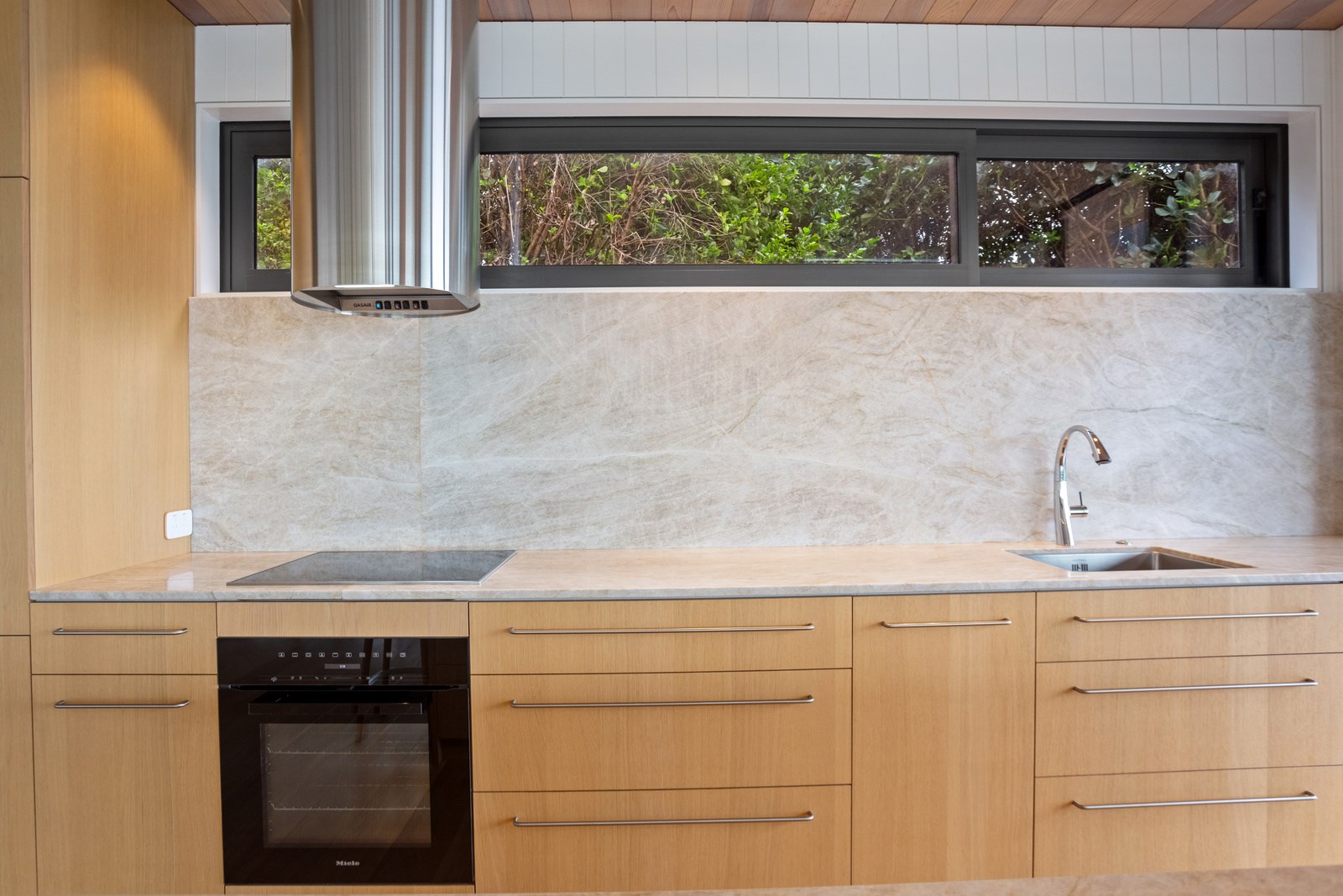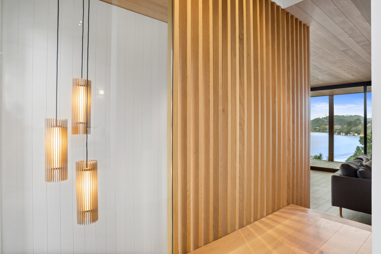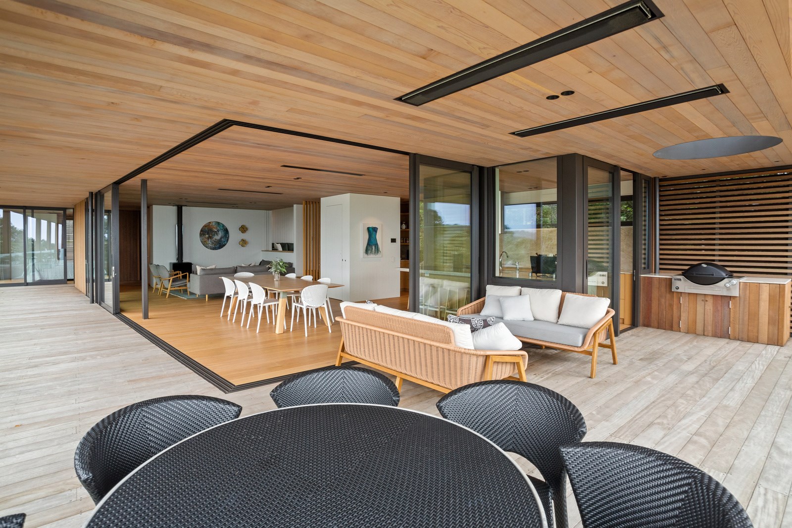 Coastal living tends to encourage a slower pace — views to get lost in, a focus on sunlight, soft textures and soothing palettes. If that’s the case, the owners of this masterpiece overlooking Cooks Beach must be positively blissed out. Natural timbers and locally sourced stone blend seamlessly with the environment, creating a harmonious connection with nature. The cleverly designed multi-level house places garaging, bedrooms, bathrooms and living areas on the ground floor, with the main living areas and guest suite upstairs. Expansive decks offer many outdoor living and entertainment options. The goal was clear from the beginning: to craft a beach house that caters to the needs of a multi-generational family, with everyone enjoying time together while still having their own space. Enduring materials, including stone sourced from Te Kūiti, are designed to age beautifully and add a sense of solidity and permanence. The home has five-plus bedrooms, four bathrooms and three living rooms, and incorporates sustainable features to minimise its environmental impact. A Tesla Solar Powerwall allows it to operate off the grid, storing energy during the day.