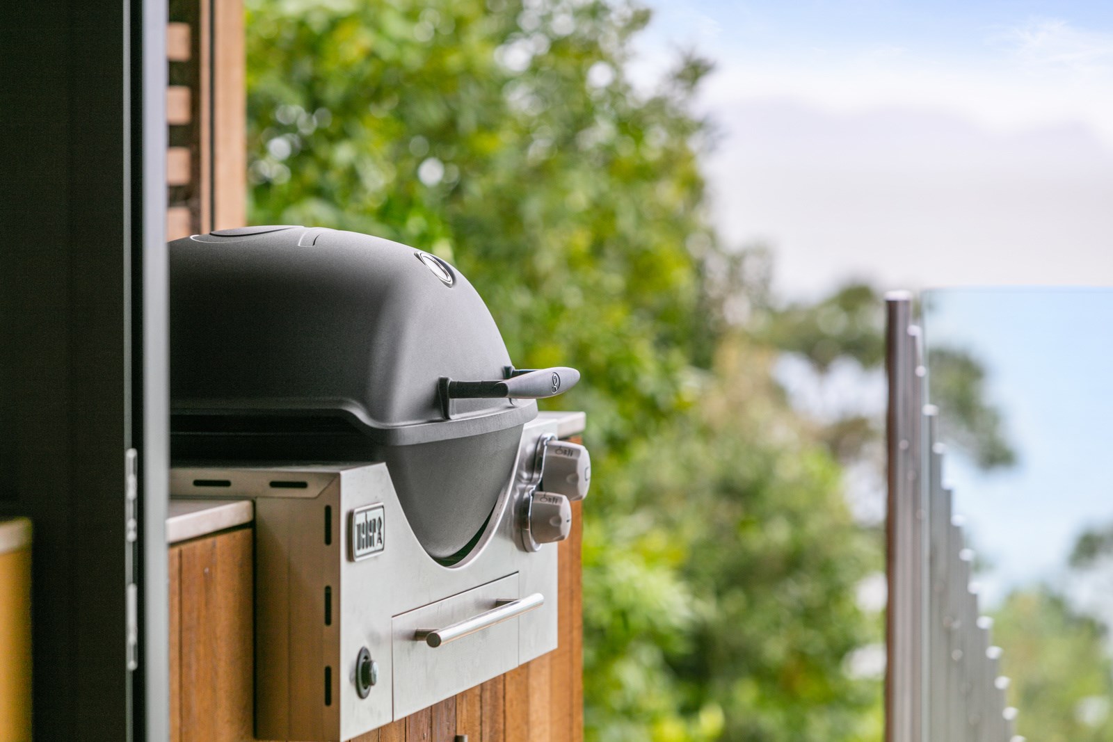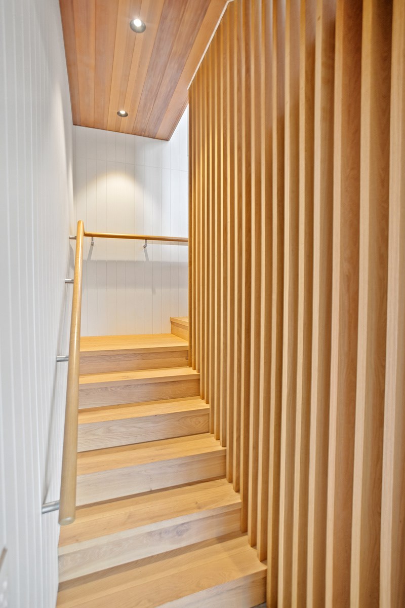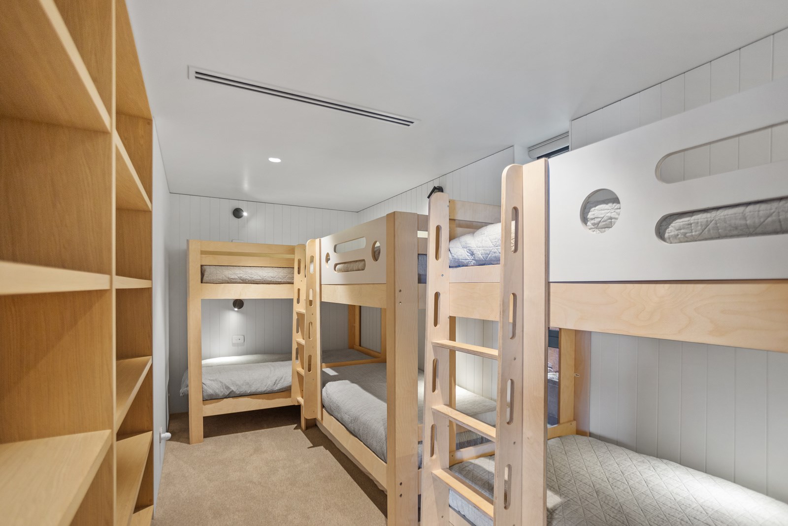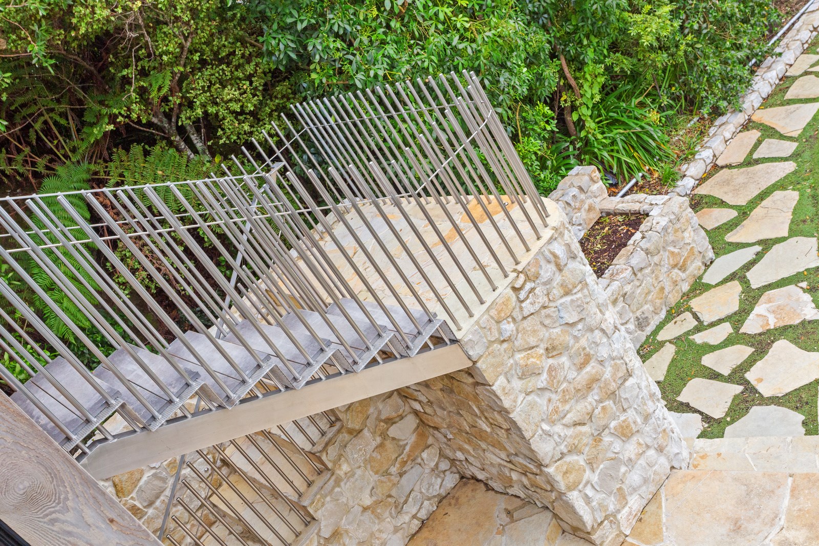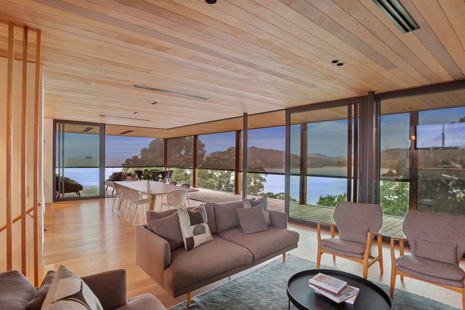 Coastal living tends to encourage a slower pace — views to get lost in, a focus on sunlight, soft textures and soothing palettes. If that’s the case, the owners of this masterpiece overlooking Cooks Beach must be positively blissed out. Natural timbers and locally sourced stone blend seamlessly with the environment, creating a harmonious connection with nature. The cleverly designed multi-level house places garaging, bedrooms, bathrooms and living areas on the ground floor, with the main living areas and guest suite upstairs. Expansive decks offer many outdoor living and entertainment options. The goal was clear from the beginning: to craft a beach house that caters to the needs of a multi-generational family, with everyone enjoying time together while still having their own space. Enduring materials, including stone sourced from Te Kūiti, are designed to age beautifully and add a sense of solidity and permanence. The home has five-plus bedrooms, four bathrooms and three living rooms, and incorporates sustainable features to minimise its environmental impact. A Tesla Solar Powerwall allows it to operate off the grid, storing energy during the day.