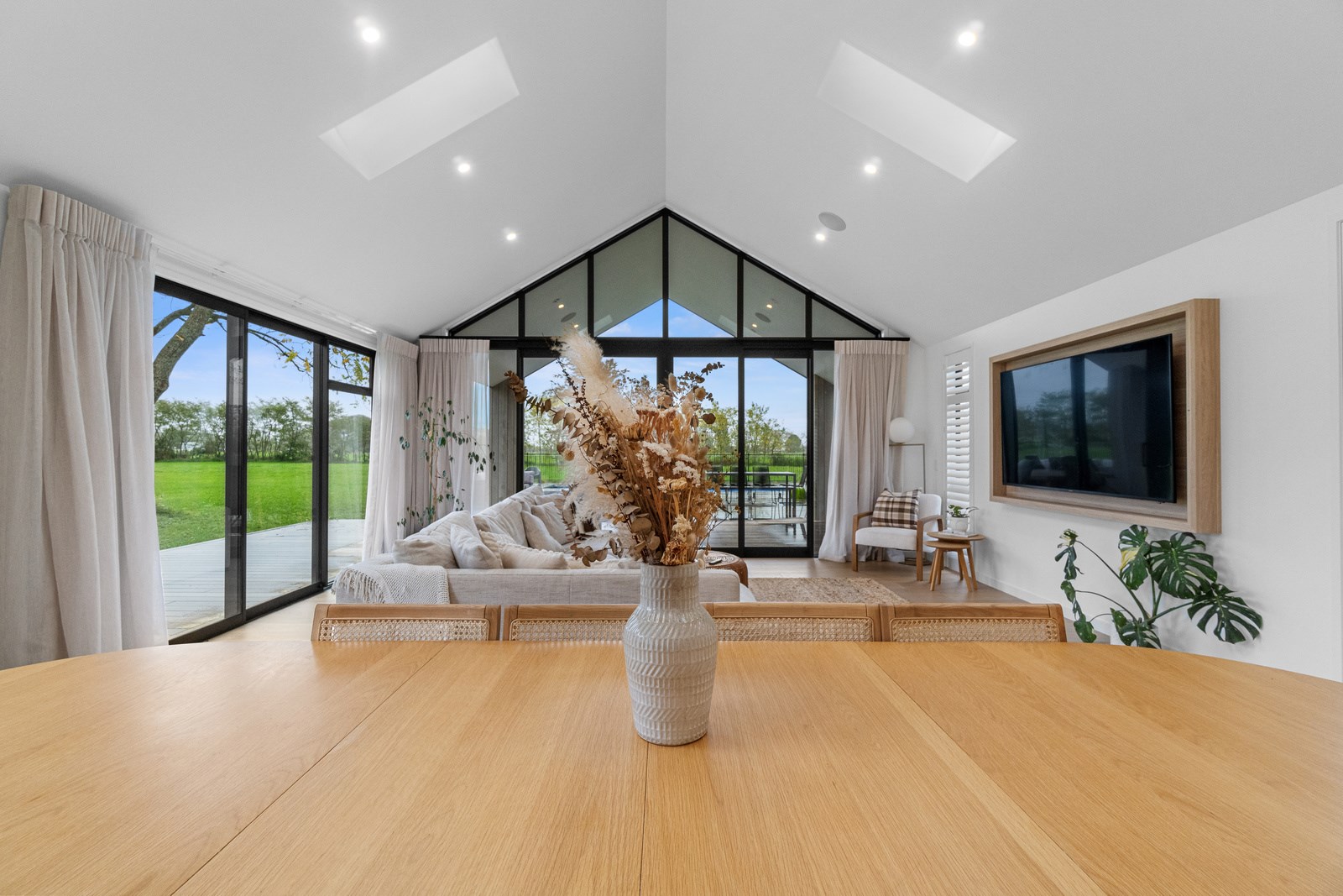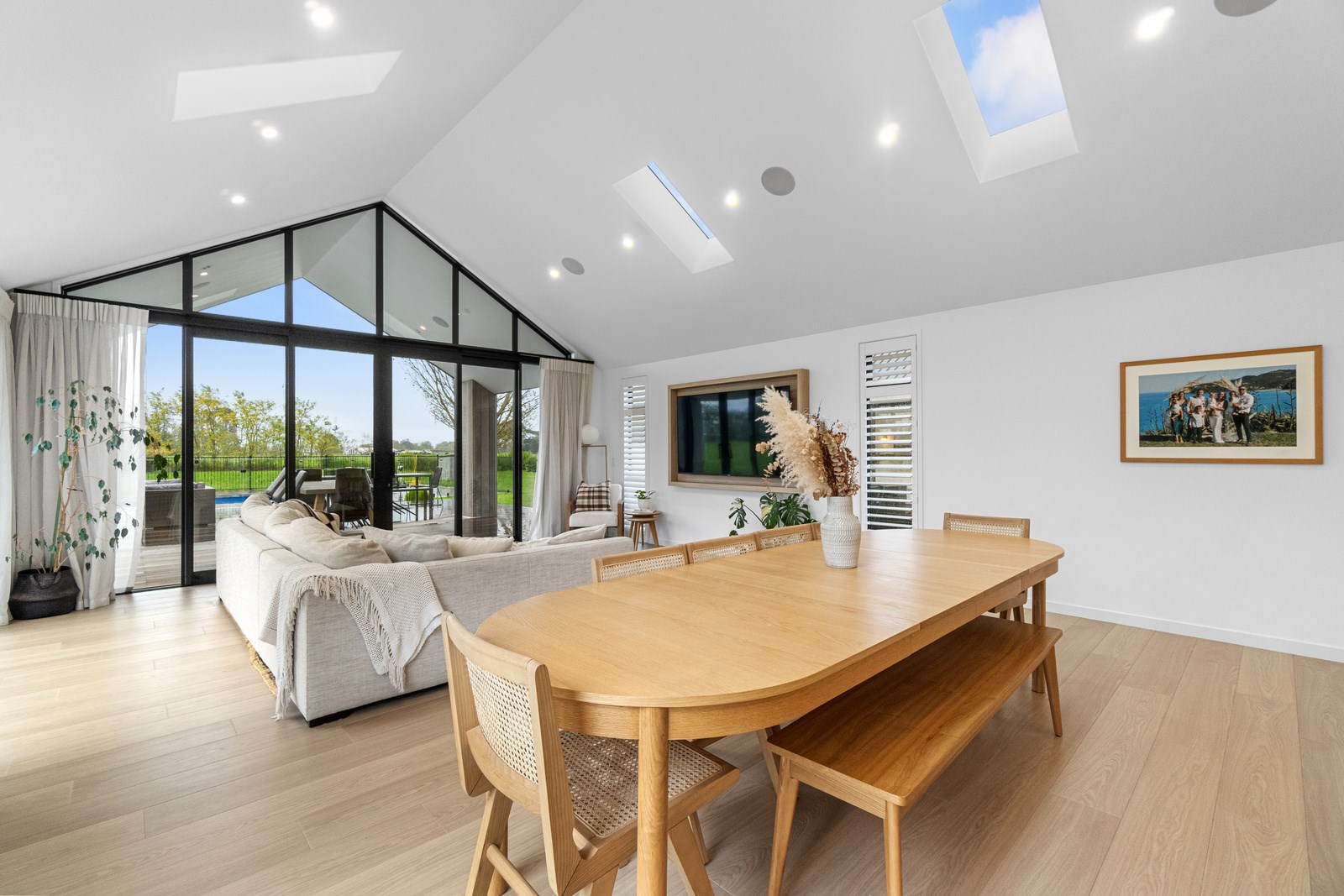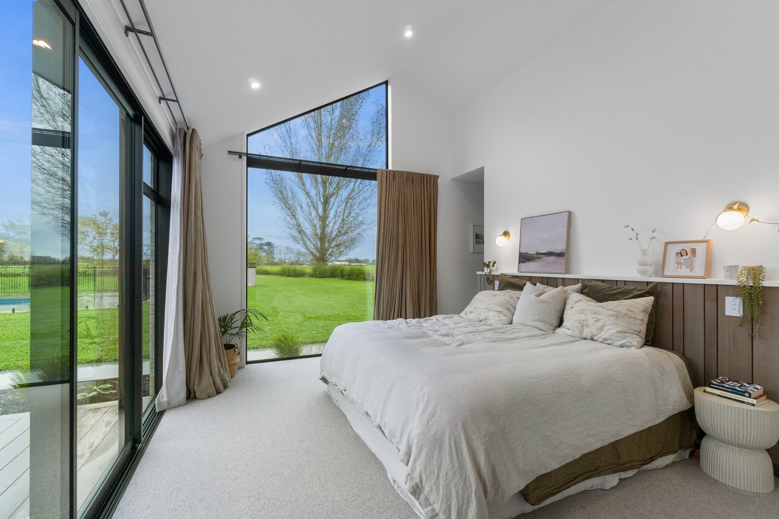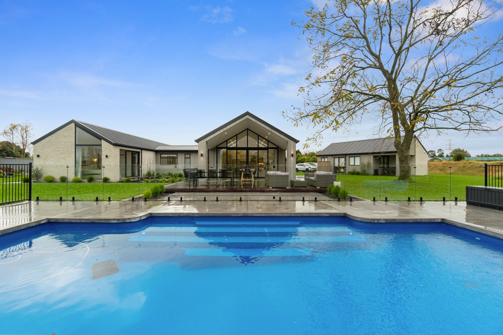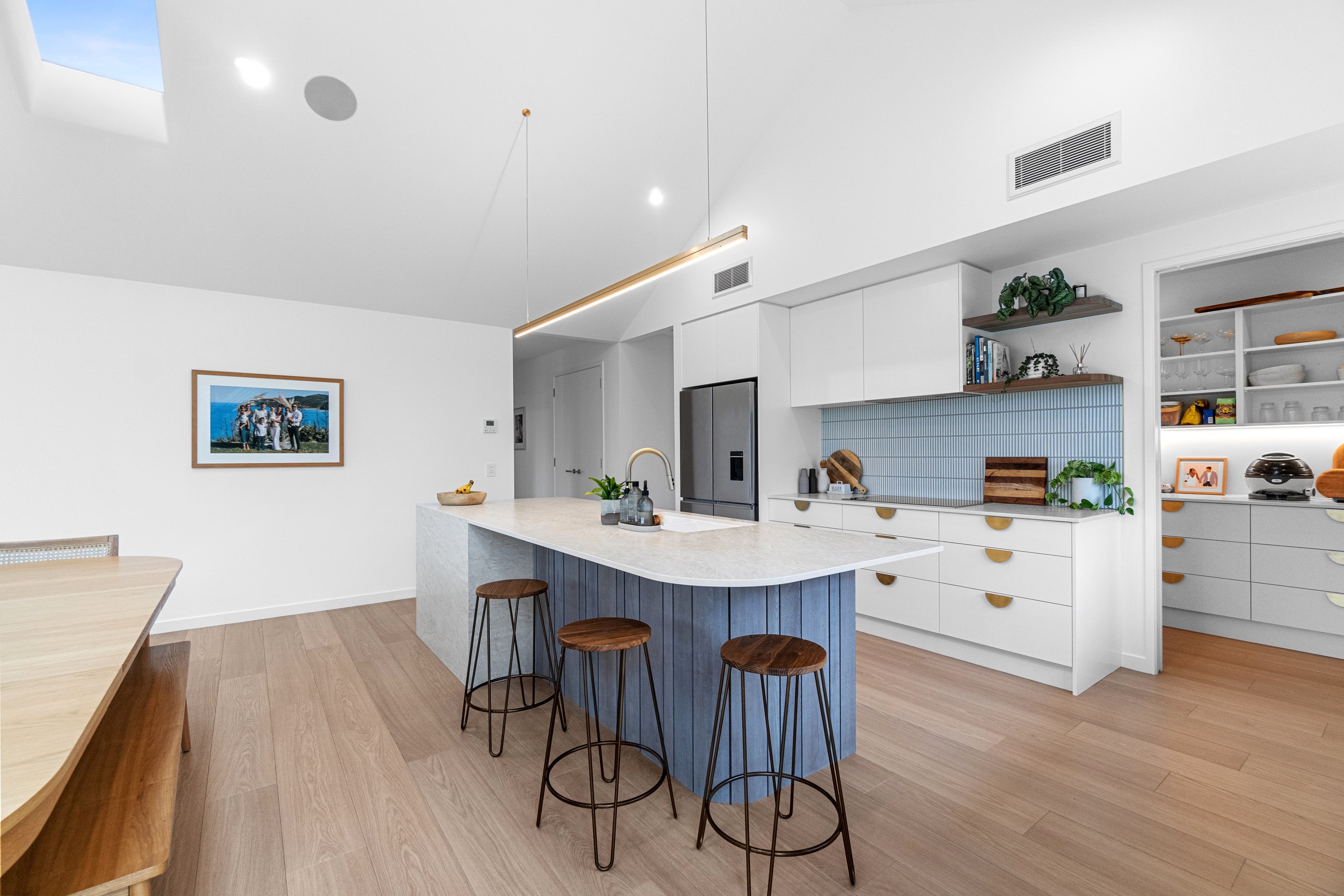 No stone has been left unturned in the pursuit of the best in this builder’s own home in Hamilton. Let’s start with the sleek and stylish exterior: a beautiful blend of cedar and recycled Italian brick. Inside there are five-plus bedrooms, three bathrooms and two living rooms — all of substantial style and proportions. In the main bedroom, his and hers walk-in wardrobes and a luxe ensuite mean that busy parents can relax and enjoy their own space. Did we mention the state-of-the art media room to kick back and relax? The considerations continue outdoors, where there’s a sparkling pool and delightful alfresco space. The light-filled interior lends a cathedral-like aspect to the look of this 284sqm modern rural home, located conveniently within cooee of the city. Of course, with all these features at hand, you may not want to venture too far from home. Neutral tones with splashes of blue and blonde timber help this home blend with its peaceful rural surroundings. An oasis for entertainers and families alike, this epitome of modern elegance offers a perfect balance of style and function whether you want to relax by the pool or make plans for the next party.