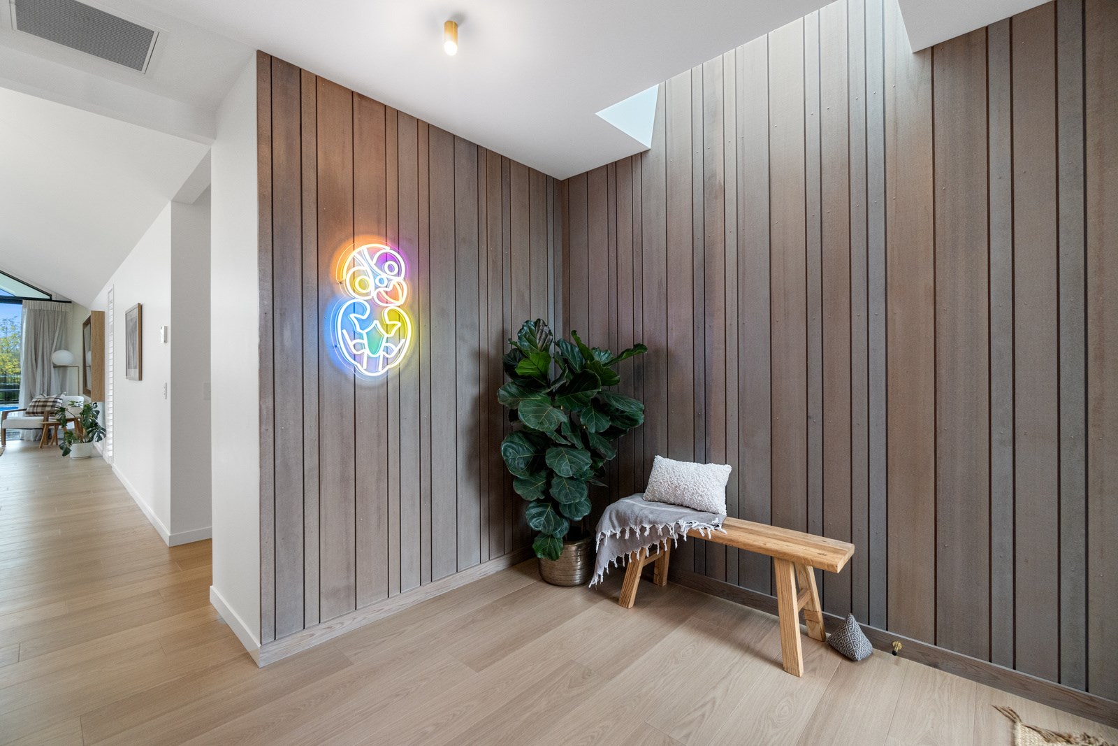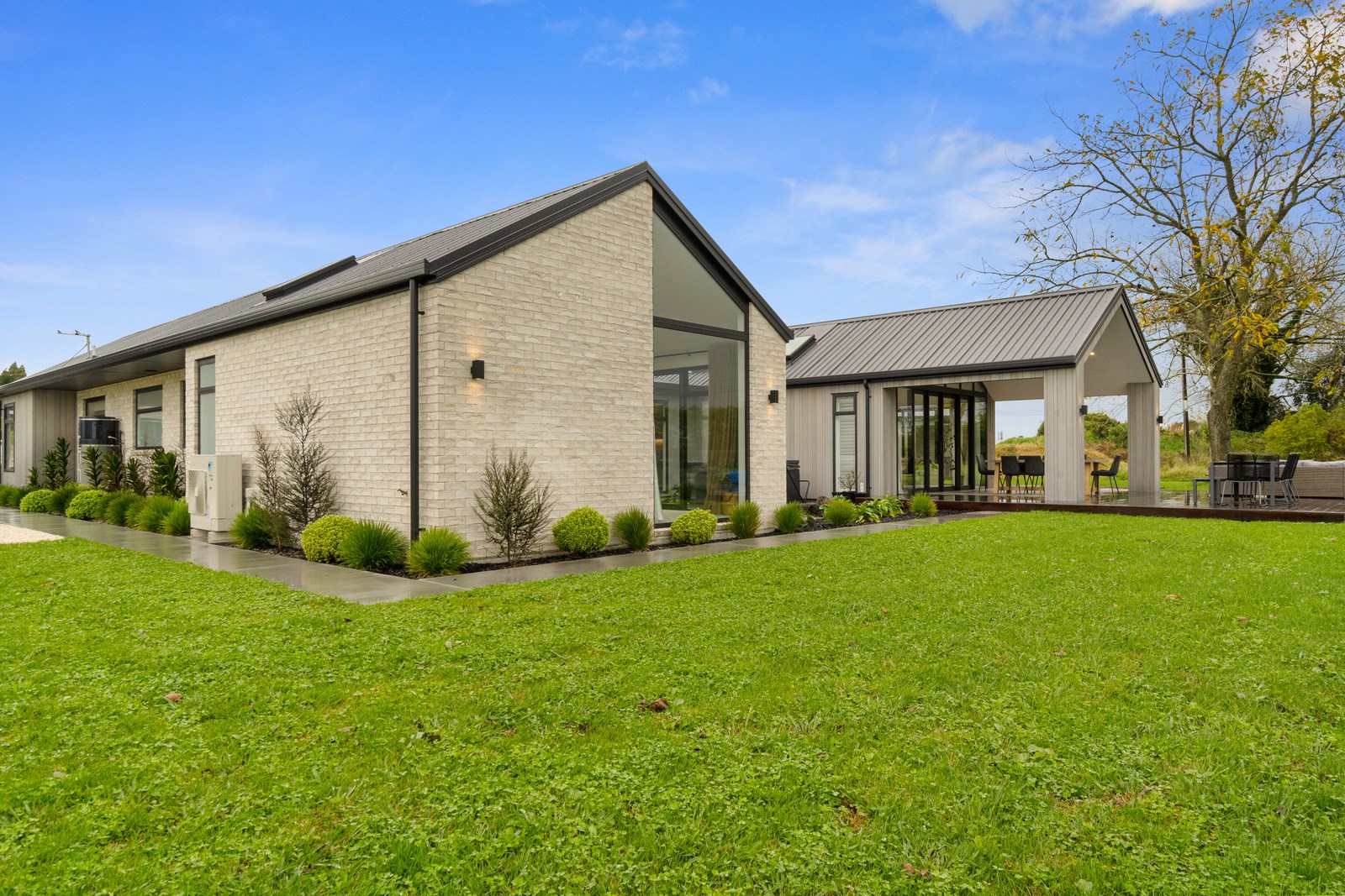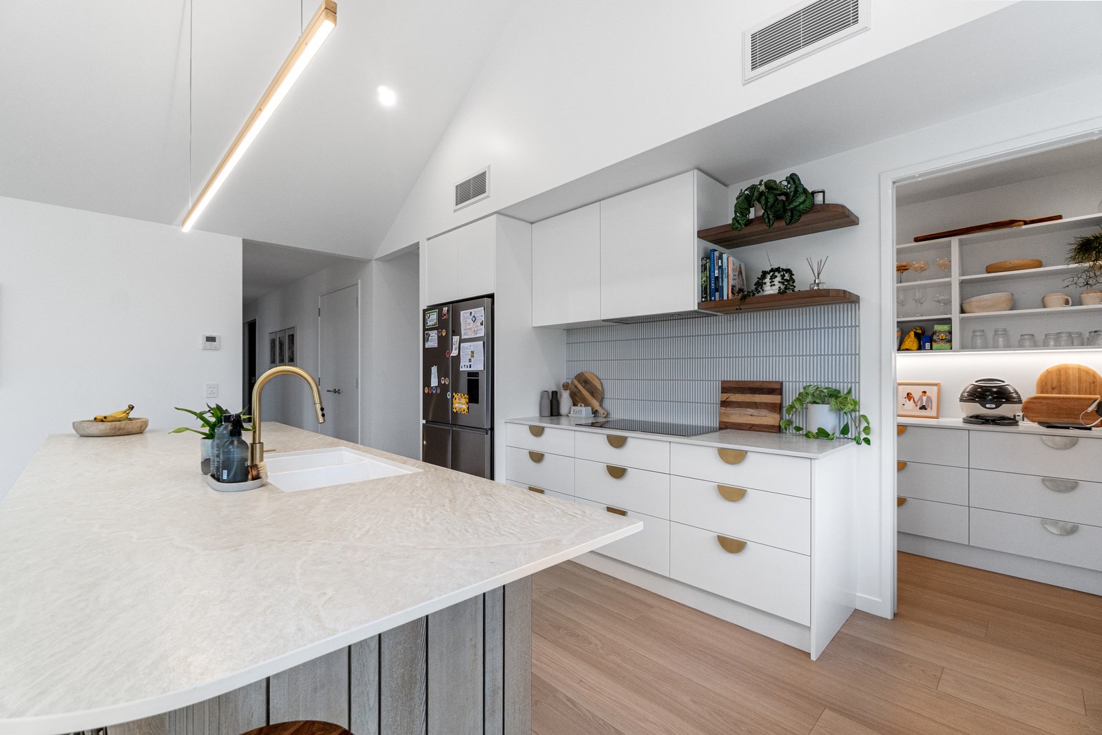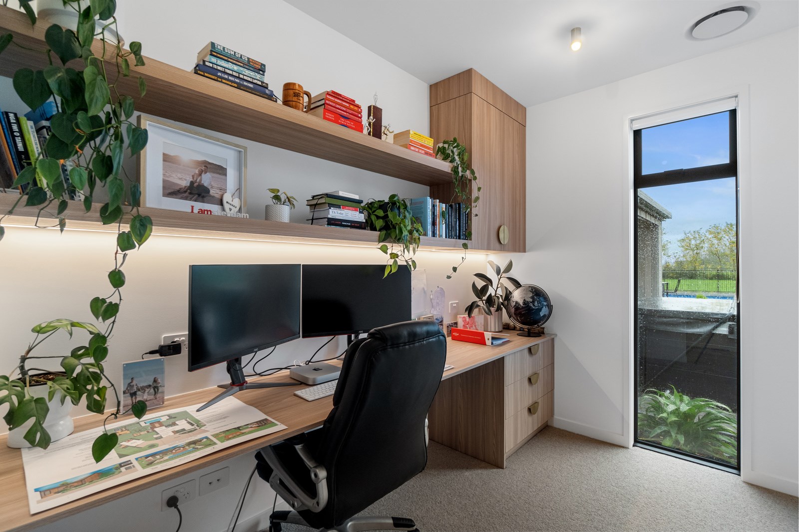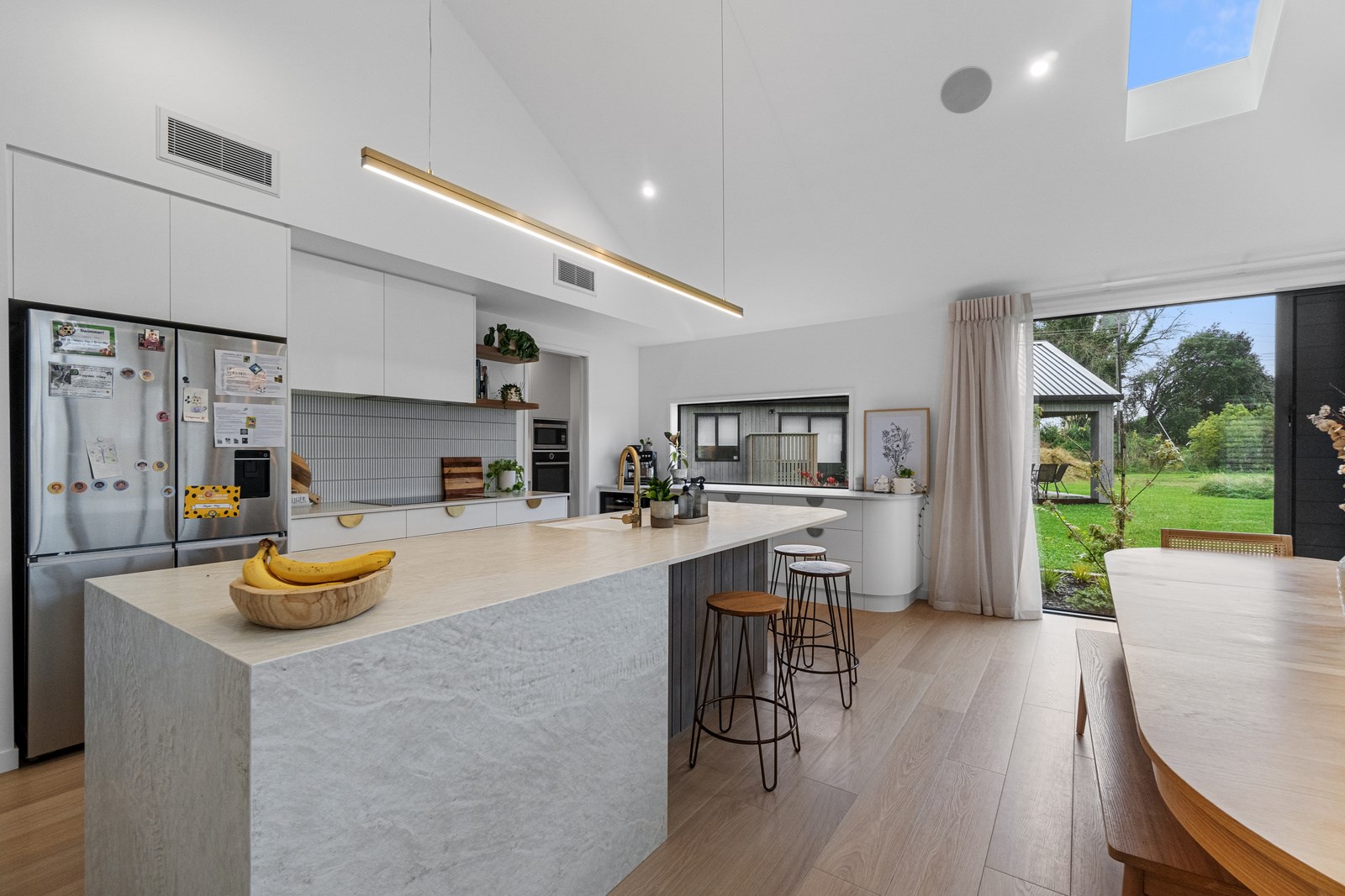 No stone has been left unturned in the pursuit of the best in this builder’s own home in Hamilton. Let’s start with the sleek and stylish exterior: a beautiful blend of cedar and recycled Italian brick. Inside there are five-plus bedrooms, three bathrooms and two living rooms — all of substantial style and proportions. In the main bedroom, his and hers walk-in wardrobes and a luxe ensuite mean that busy parents can relax and enjoy their own space. Did we mention the state-of-the art media room to kick back and relax? The considerations continue outdoors, where there’s a sparkling pool and delightful alfresco space. The light-filled interior lends a cathedral-like aspect to the look of this 284sqm modern rural home, located conveniently within cooee of the city. Of course, with all these features at hand, you may not want to venture too far from home. Neutral tones with splashes of blue and blonde timber help this home blend with its peaceful rural surroundings. An oasis for entertainers and families alike, this epitome of modern elegance offers a perfect balance of style and function whether you want to relax by the pool or make plans for the next party.