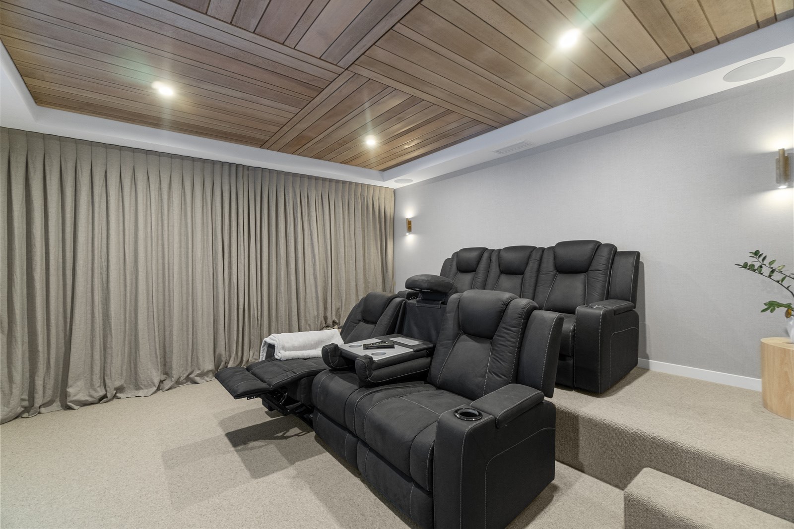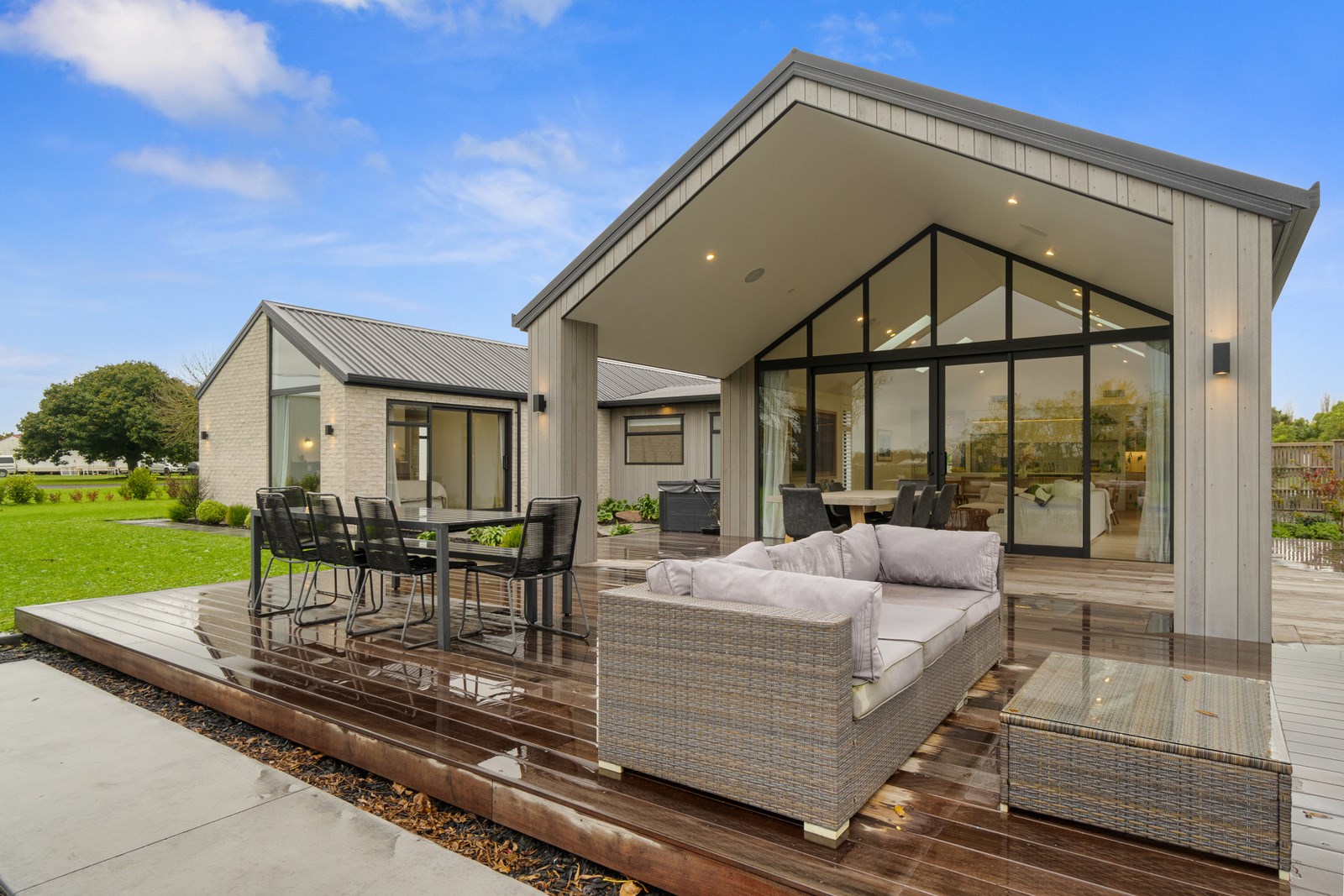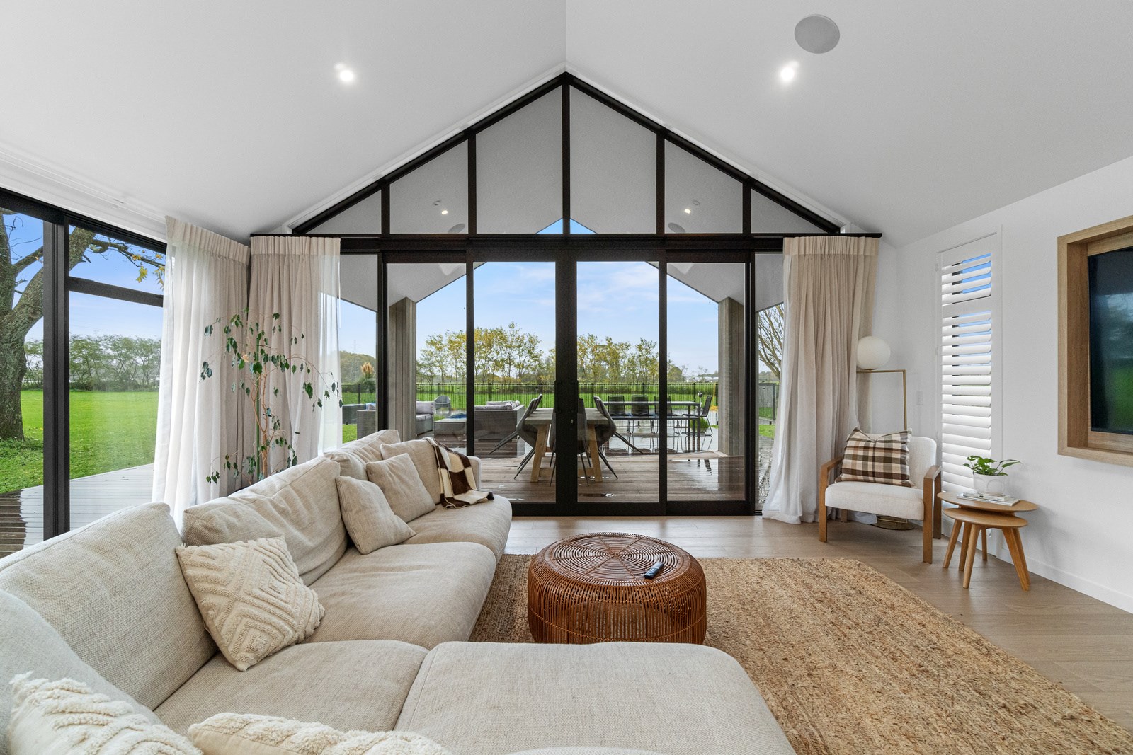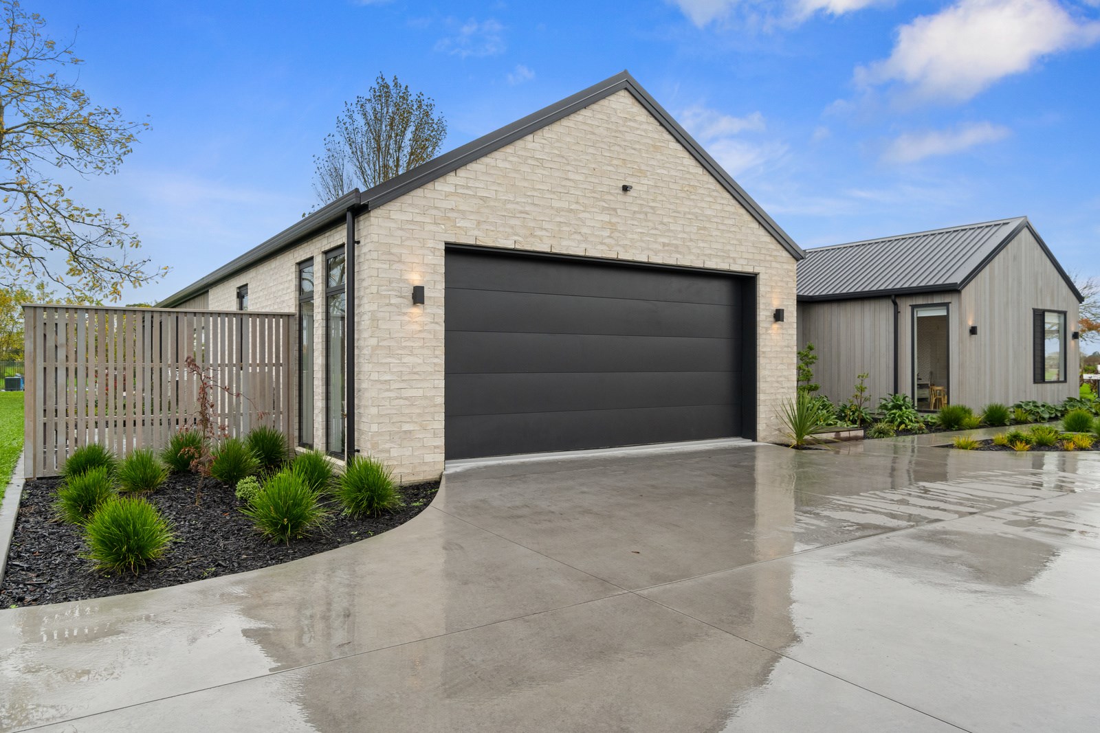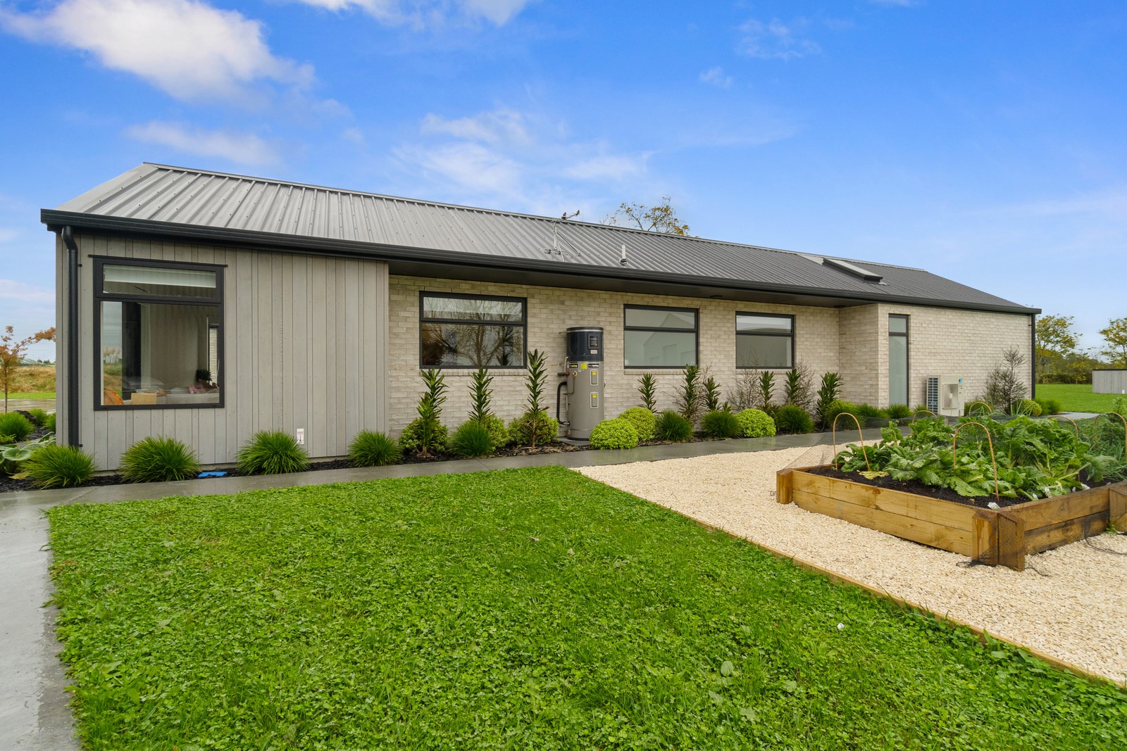 No stone has been left unturned in the pursuit of the best in this builder’s own home in Hamilton. Let’s start with the sleek and stylish exterior: a beautiful blend of cedar and recycled Italian brick. Inside there are five-plus bedrooms, three bathrooms and two living rooms — all of substantial style and proportions. In the main bedroom, his and hers walk-in wardrobes and a luxe ensuite mean that busy parents can relax and enjoy their own space. Did we mention the state-of-the art media room to kick back and relax? The considerations continue outdoors, where there’s a sparkling pool and delightful alfresco space. The light-filled interior lends a cathedral-like aspect to the look of this 284sqm modern rural home, located conveniently within cooee of the city. Of course, with all these features at hand, you may not want to venture too far from home. Neutral tones with splashes of blue and blonde timber help this home blend with its peaceful rural surroundings. An oasis for entertainers and families alike, this epitome of modern elegance offers a perfect balance of style and function whether you want to relax by the pool or make plans for the next party.
