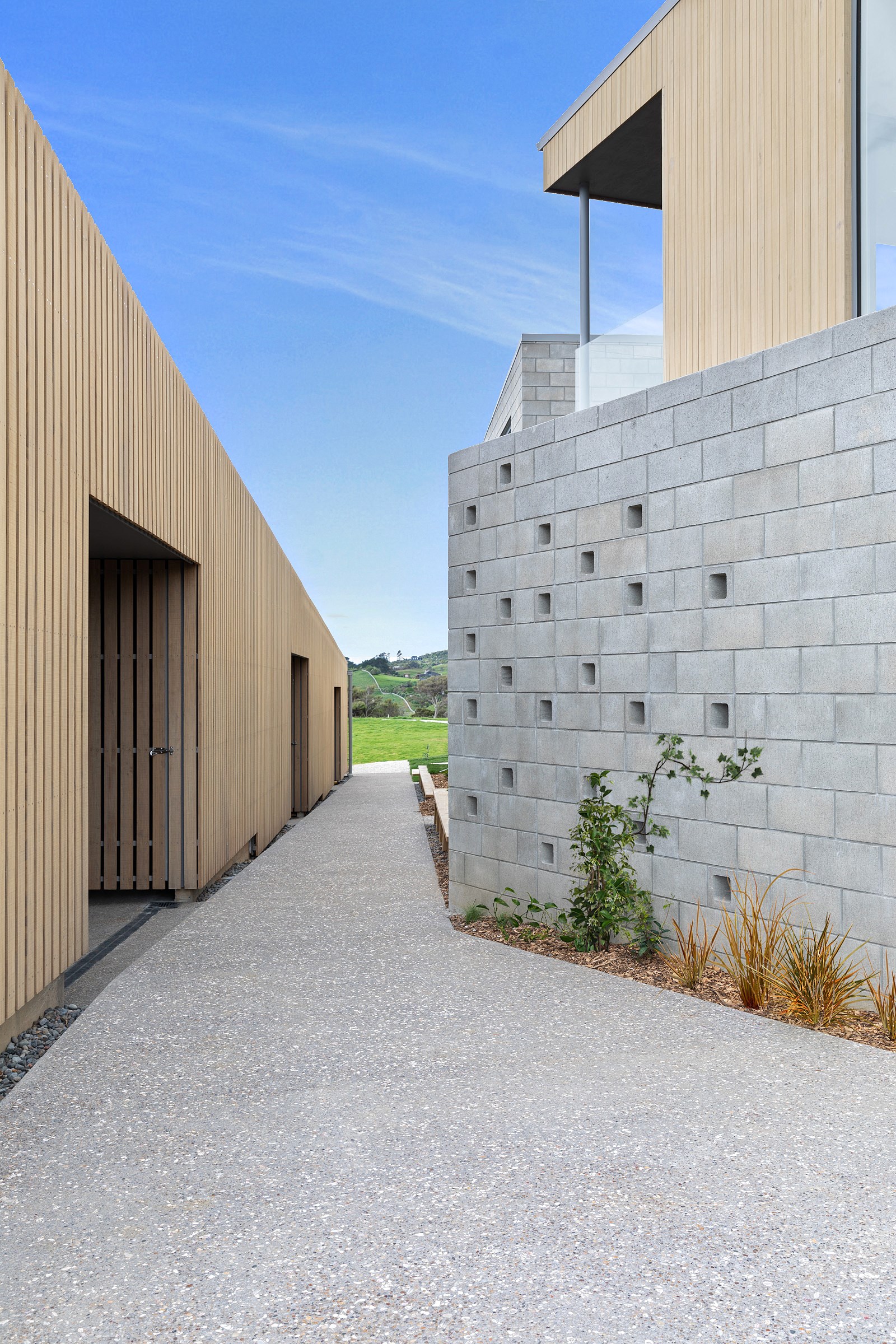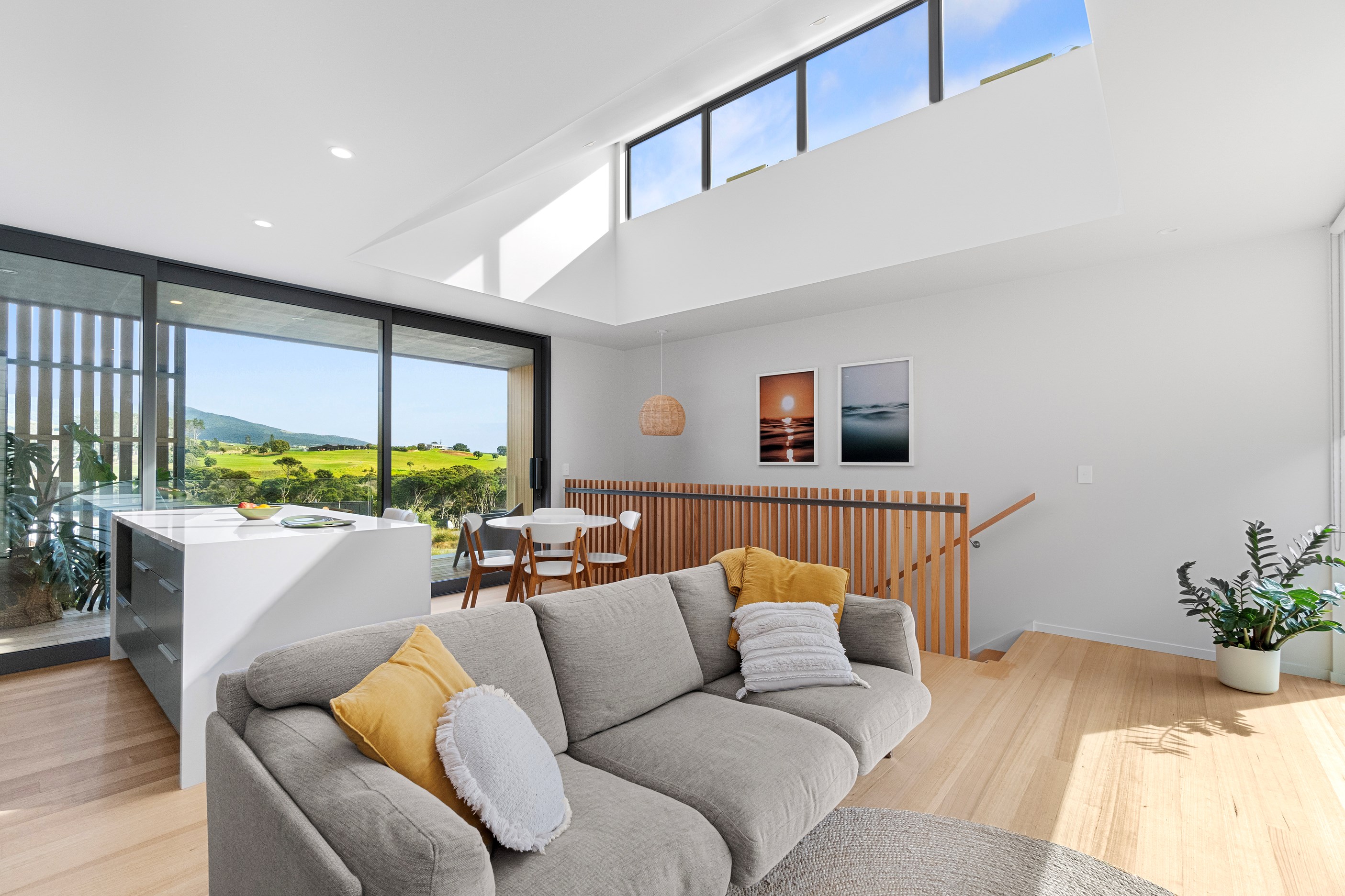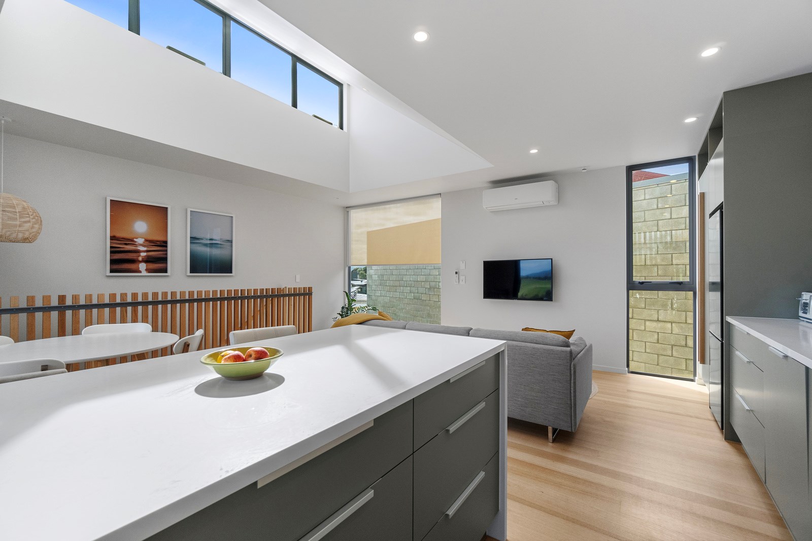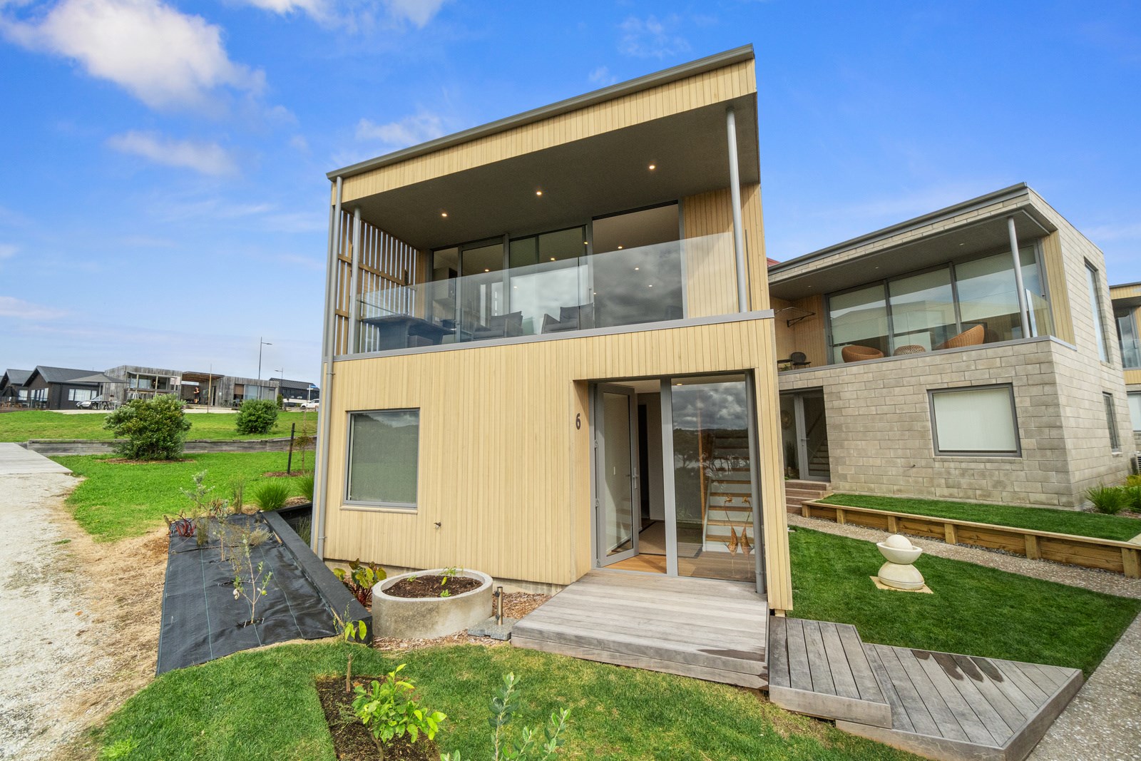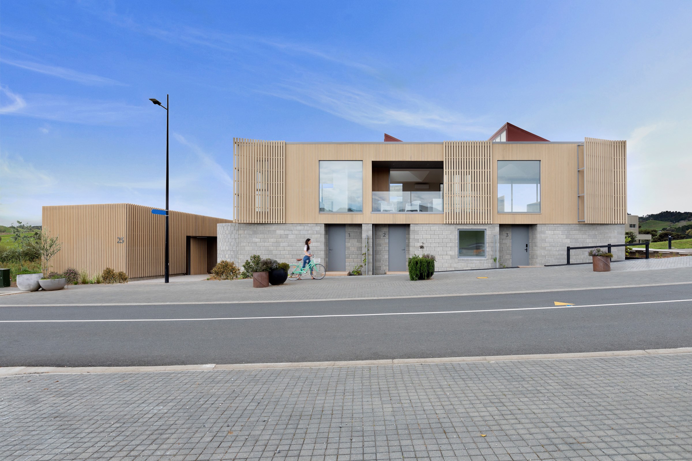 Perched close to the famous black-sand surf beaches and maximising both the views and the small footprint, the six townhouses in the North Point Residences development feel like a resort. It’s designed for efficient communal living, to blend with its natural surrounds and to make the best use possible of natural light. Situated across two levels, each townhouse is clad in straw-coloured Abodo eco-timber, with solid-fill masonry blocks on the base that are durable enough to offer protection from the elements. The buildings all feature landscaped courtyards and paths between each of the units to create a feeling of space. The dual-storey townhouses are 85sqm, with their own double carport and private courtyard. Situated on the ground floor are two bedrooms, a laundry and a tiled bathroom with a large shower; there’s even enough towel rail space for you to hang your wetsuit. When it’s time for dinner, make your way up the Tasmanian oak hardwood staircase and you’ll find an open-plan living area with full-sized kitchen and a covered deck. The off-street parking for two vehicles and a lockable storage unit for sports equipment means you don’t have to worry about where to put your board.