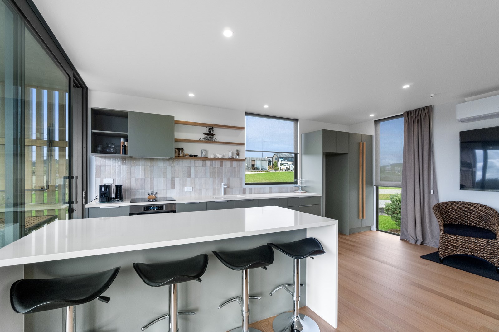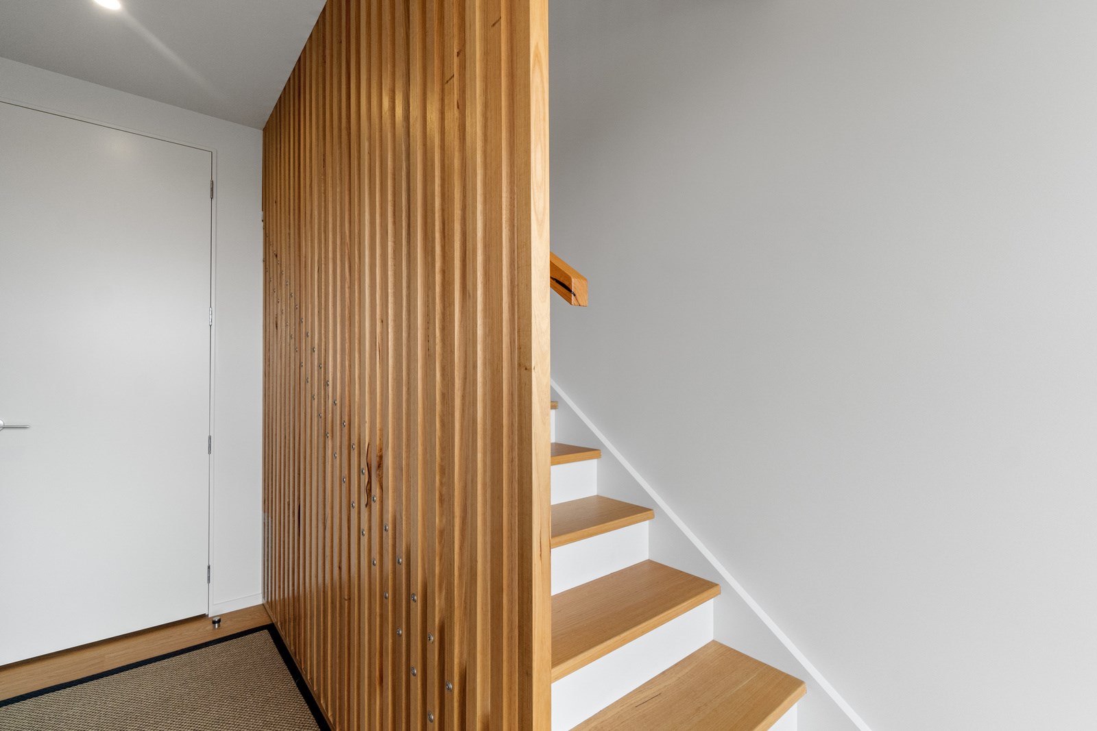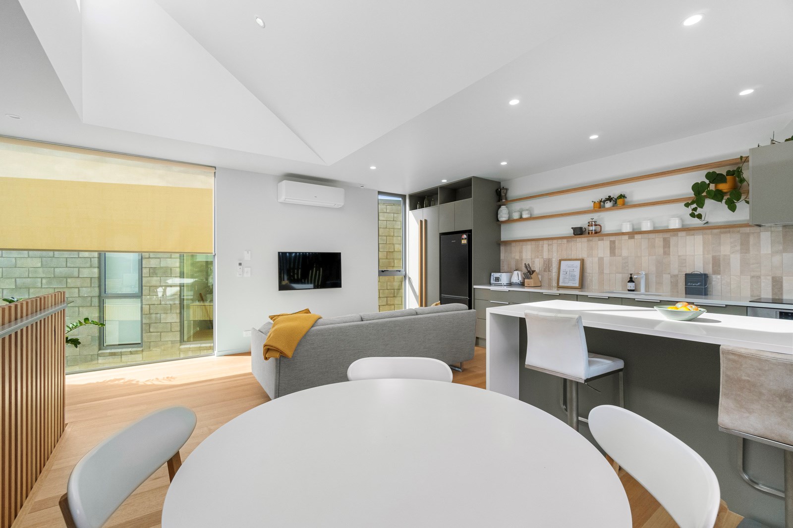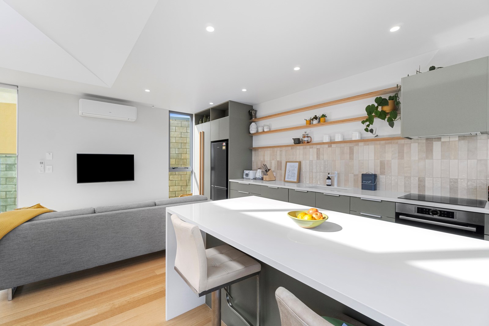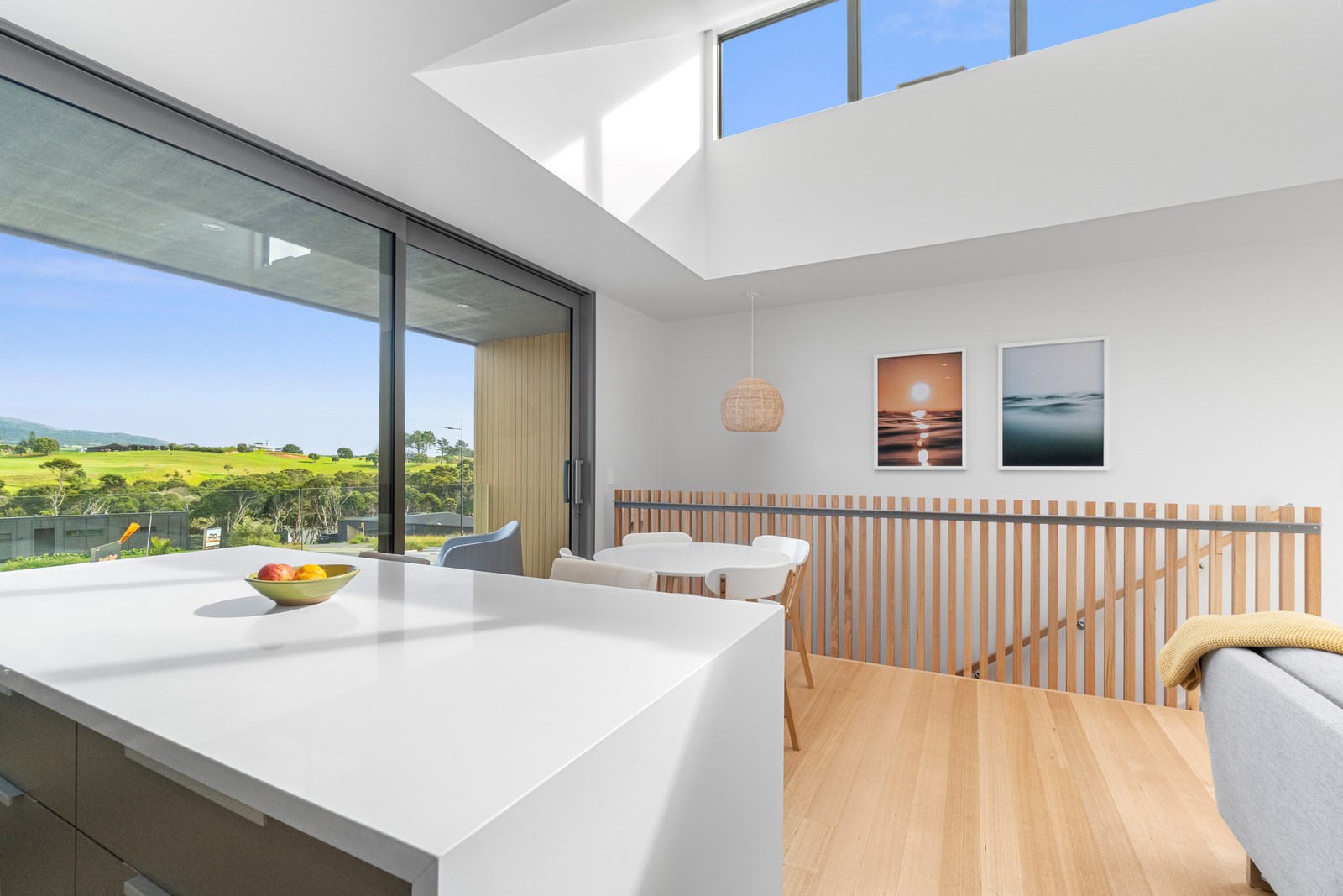 Perched close to the famous black-sand surf beaches and maximising both the views and the small footprint, the six townhouses in the North Point Residences development feel like a resort. It’s designed for efficient communal living, to blend with its natural surrounds and to make the best use possible of natural light. Situated across two levels, each townhouse is clad in straw-coloured Abodo eco-timber, with solid-fill masonry blocks on the base that are durable enough to offer protection from the elements. The buildings all feature landscaped courtyards and paths between each of the units to create a feeling of space. The dual-storey townhouses are 85sqm, with their own double carport and private courtyard. Situated on the ground floor are two bedrooms, a laundry and a tiled bathroom with a large shower; there’s even enough towel rail space for you to hang your wetsuit. When it’s time for dinner, make your way up the Tasmanian oak hardwood staircase and you’ll find an open-plan living area with full-sized kitchen and a covered deck. The off-street parking for two vehicles and a lockable storage unit for sports equipment means you don’t have to worry about where to put your board.