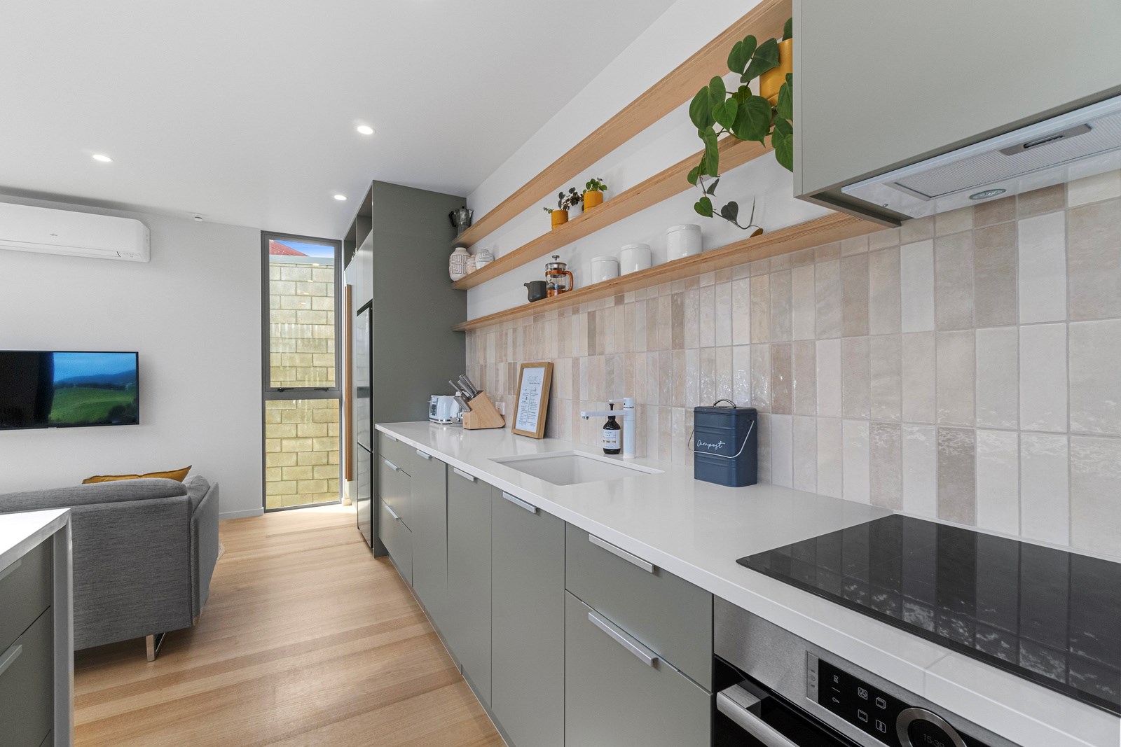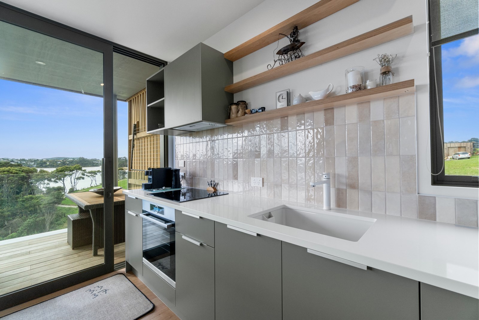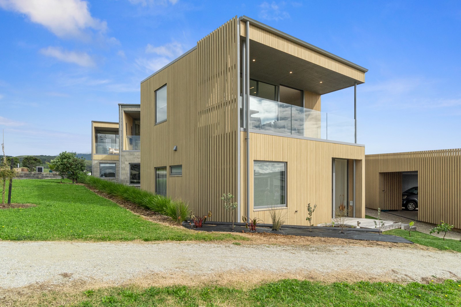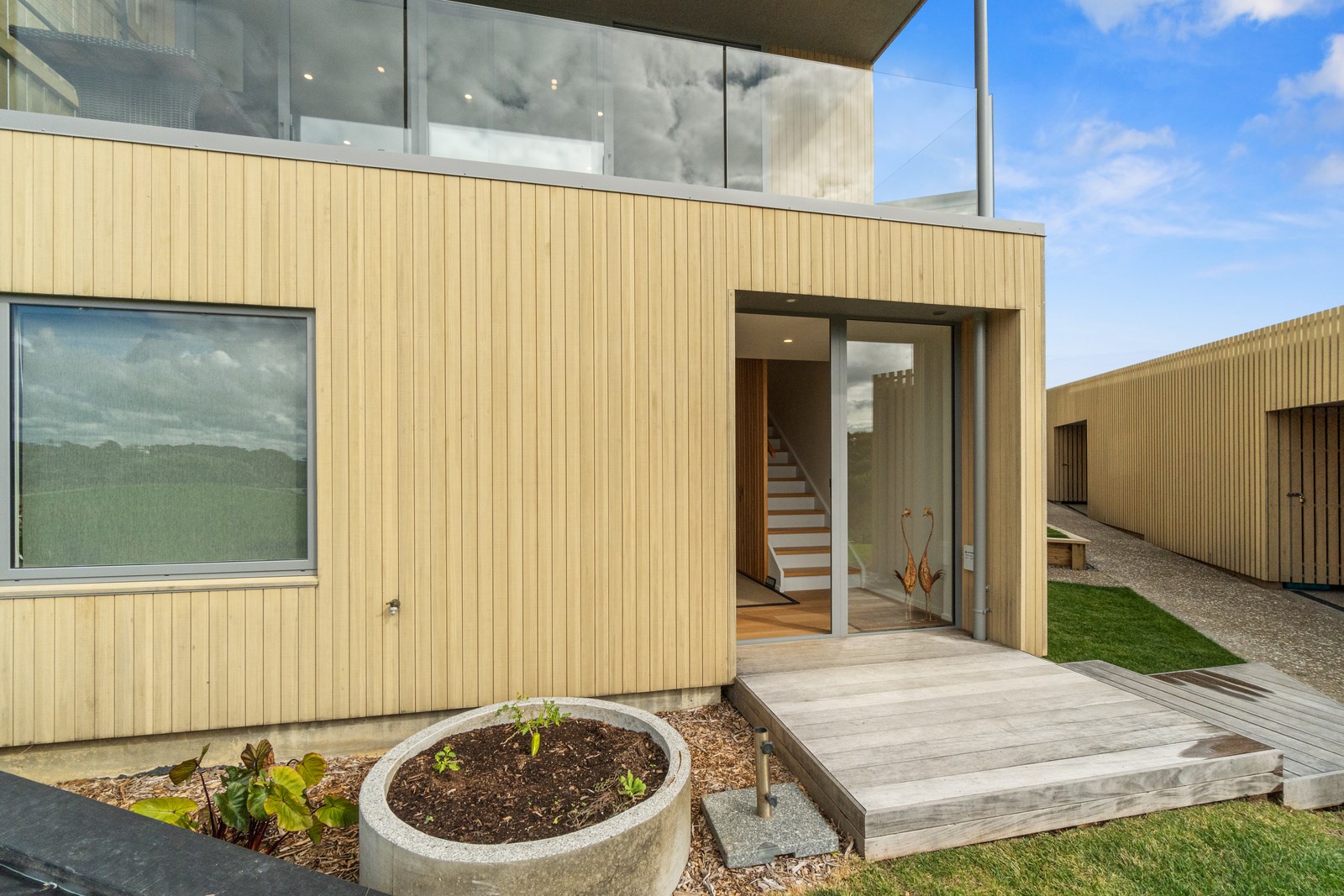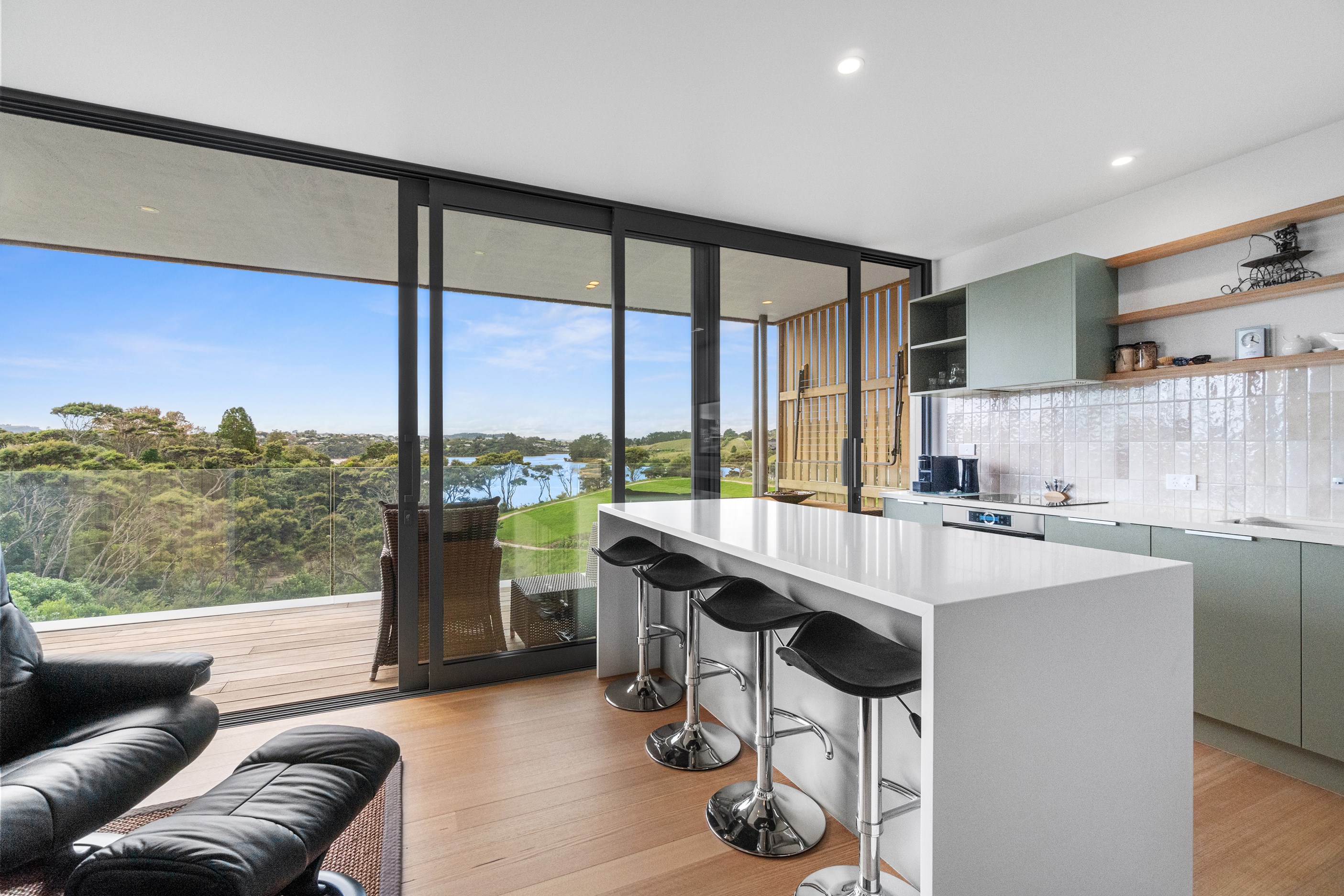 Perched close to the famous black-sand surf beaches and maximising both the views and the small footprint, the six townhouses in the North Point Residences development feel like a resort. It’s designed for efficient communal living, to blend with its natural surrounds and to make the best use possible of natural light. Situated across two levels, each townhouse is clad in straw-coloured Abodo eco-timber, with solid-fill masonry blocks on the base that are durable enough to offer protection from the elements. The buildings all feature landscaped courtyards and paths between each of the units to create a feeling of space. The dual-storey townhouses are 85sqm, with their own double carport and private courtyard. Situated on the ground floor are two bedrooms, a laundry and a tiled bathroom with a large shower; there’s even enough towel rail space for you to hang your wetsuit. When it’s time for dinner, make your way up the Tasmanian oak hardwood staircase and you’ll find an open-plan living area with full-sized kitchen and a covered deck. The off-street parking for two vehicles and a lockable storage unit for sports equipment means you don’t have to worry about where to put your board.