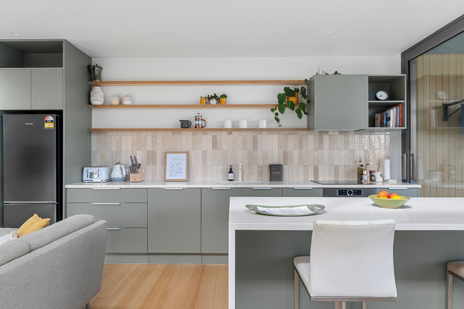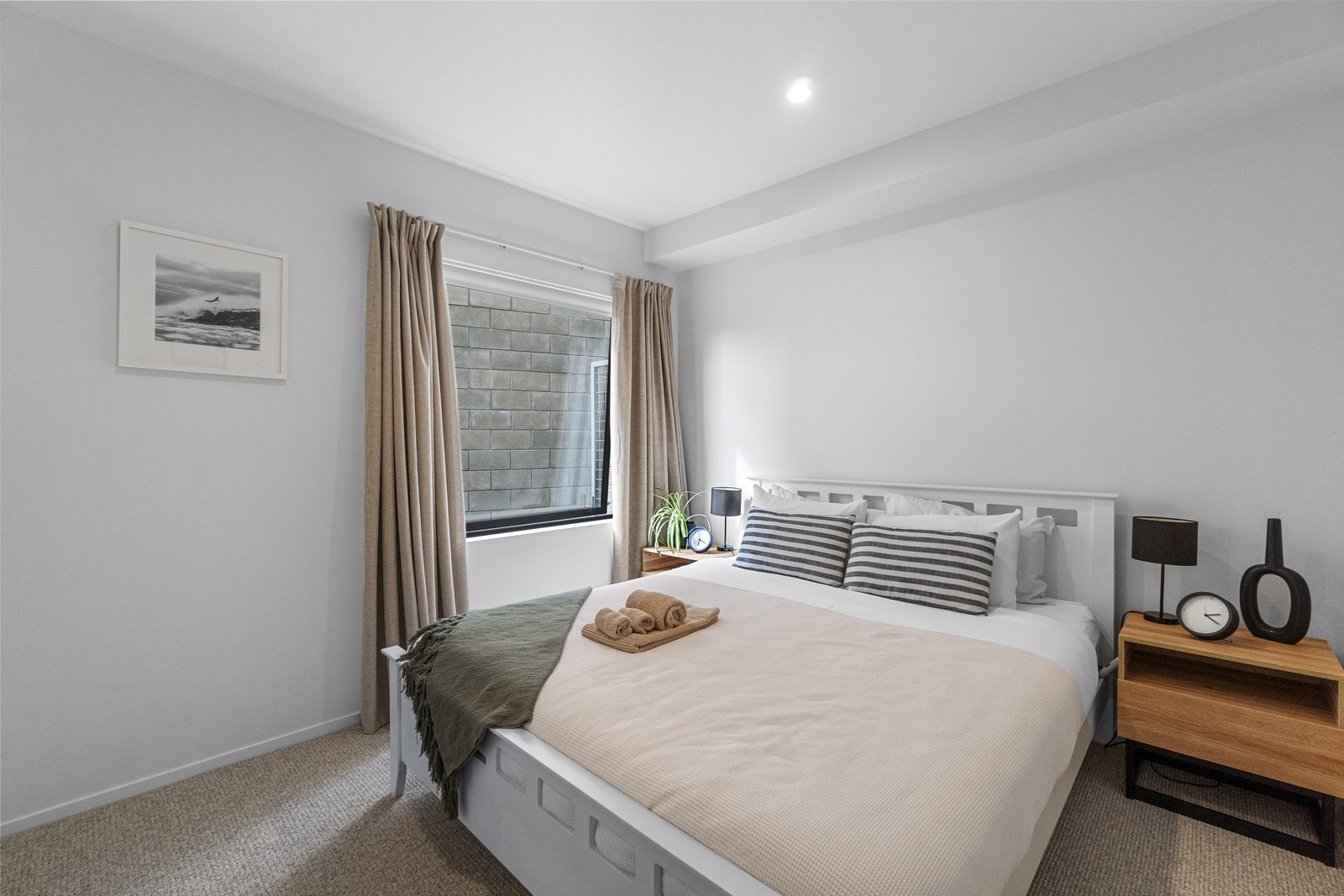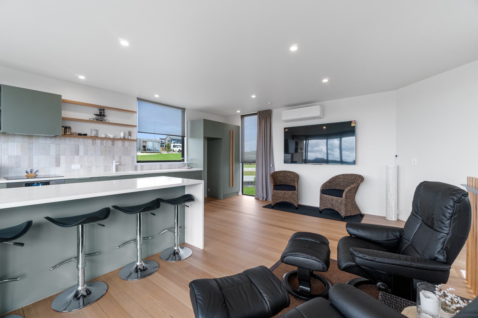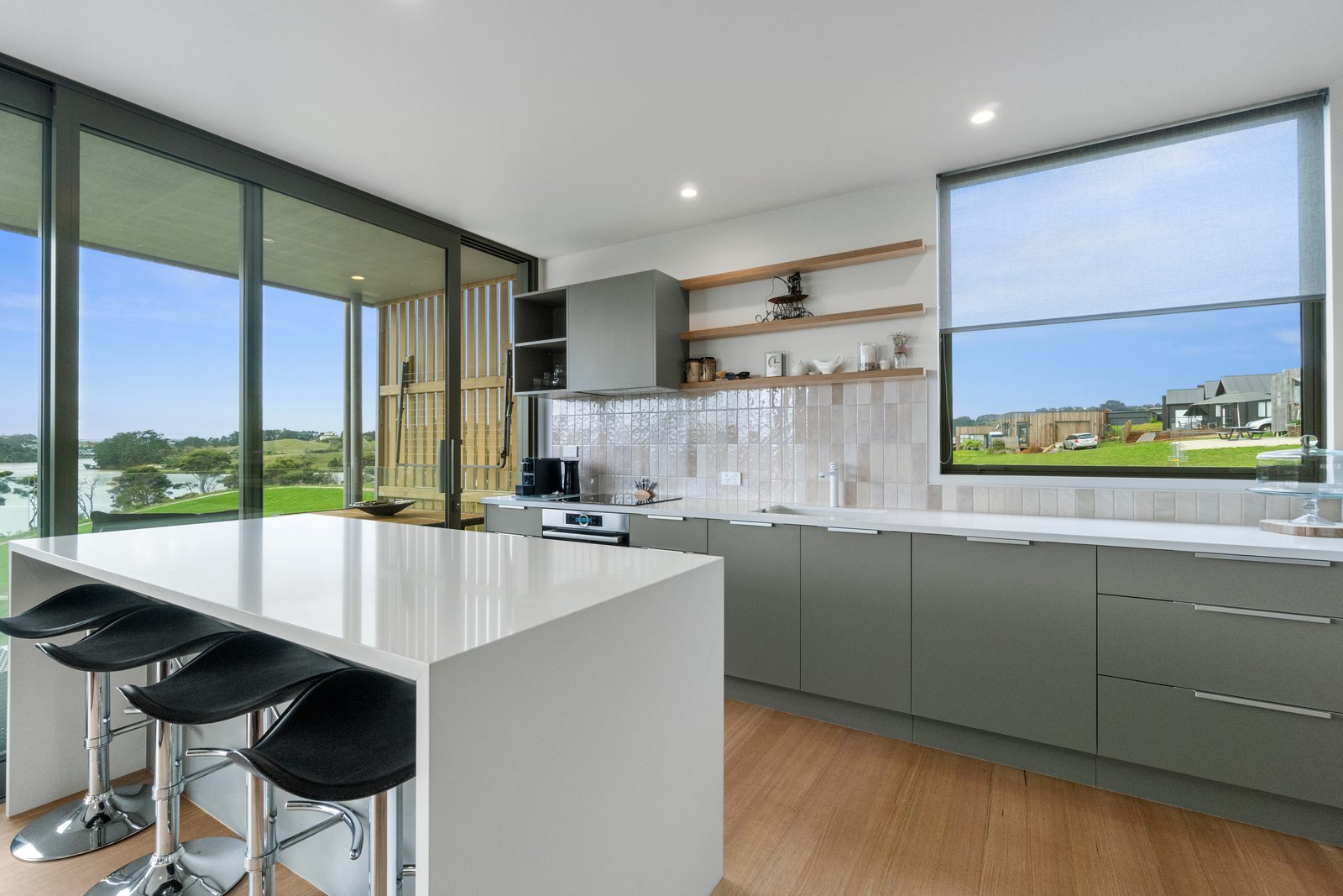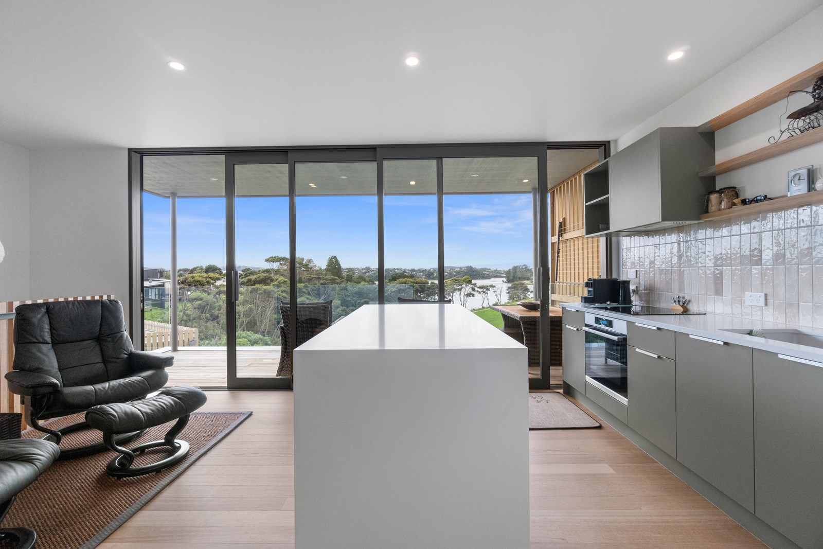 Perched close to the famous black-sand surf beaches and maximising both the views and the small footprint, the six townhouses in the North Point Residences development feel like a resort. It’s designed for efficient communal living, to blend with its natural surrounds and to make the best use possible of natural light. Situated across two levels, each townhouse is clad in straw-coloured Abodo eco-timber, with solid-fill masonry blocks on the base that are durable enough to offer protection from the elements. The buildings all feature landscaped courtyards and paths between each of the units to create a feeling of space. The dual-storey townhouses are 85sqm, with their own double carport and private courtyard. Situated on the ground floor are two bedrooms, a laundry and a tiled bathroom with a large shower; there’s even enough towel rail space for you to hang your wetsuit. When it’s time for dinner, make your way up the Tasmanian oak hardwood staircase and you’ll find an open-plan living area with full-sized kitchen and a covered deck. The off-street parking for two vehicles and a lockable storage unit for sports equipment means you don’t have to worry about where to put your board.