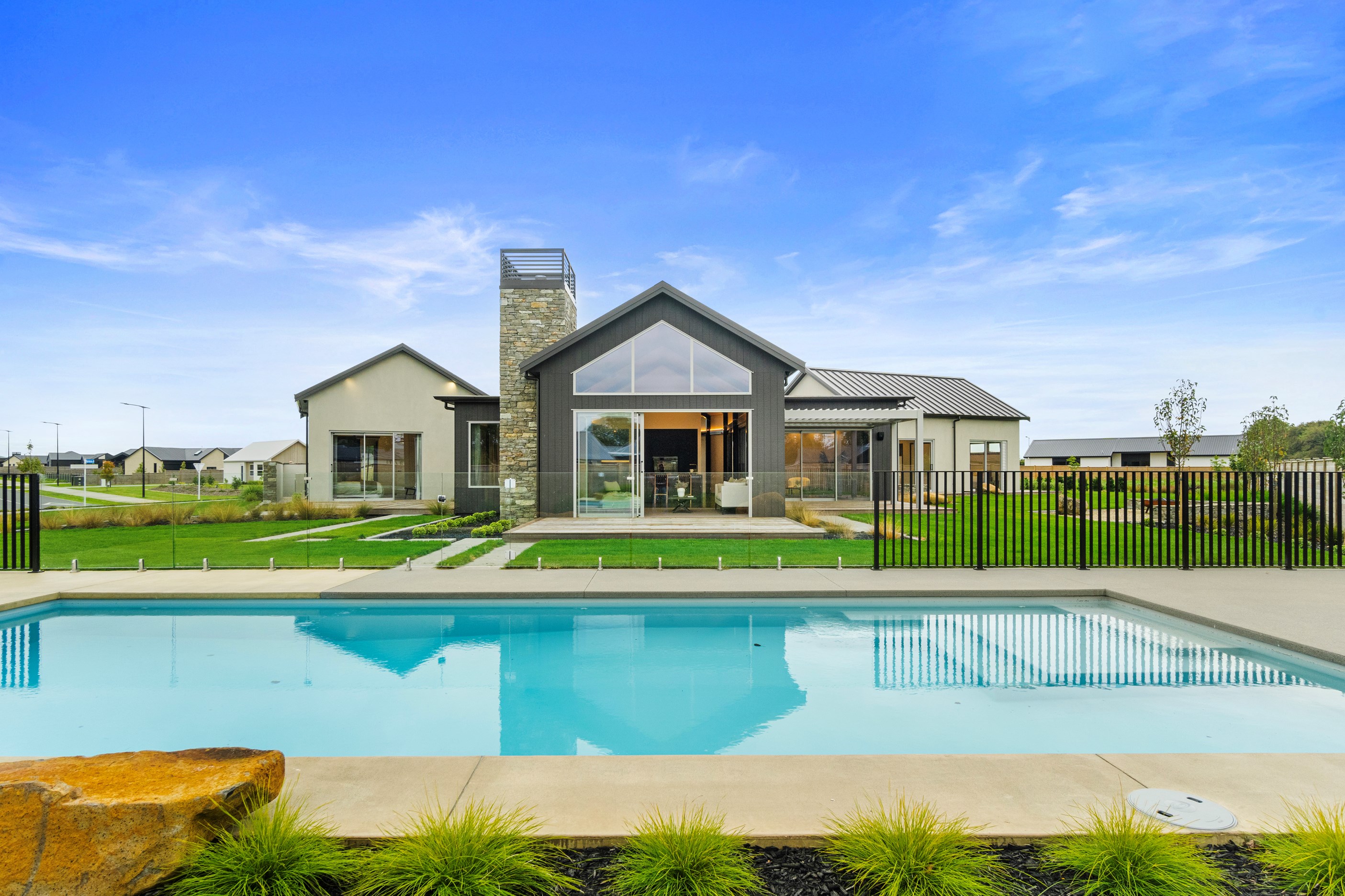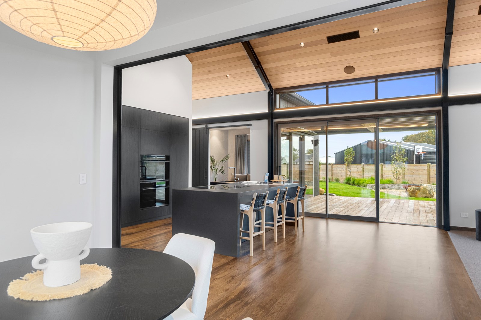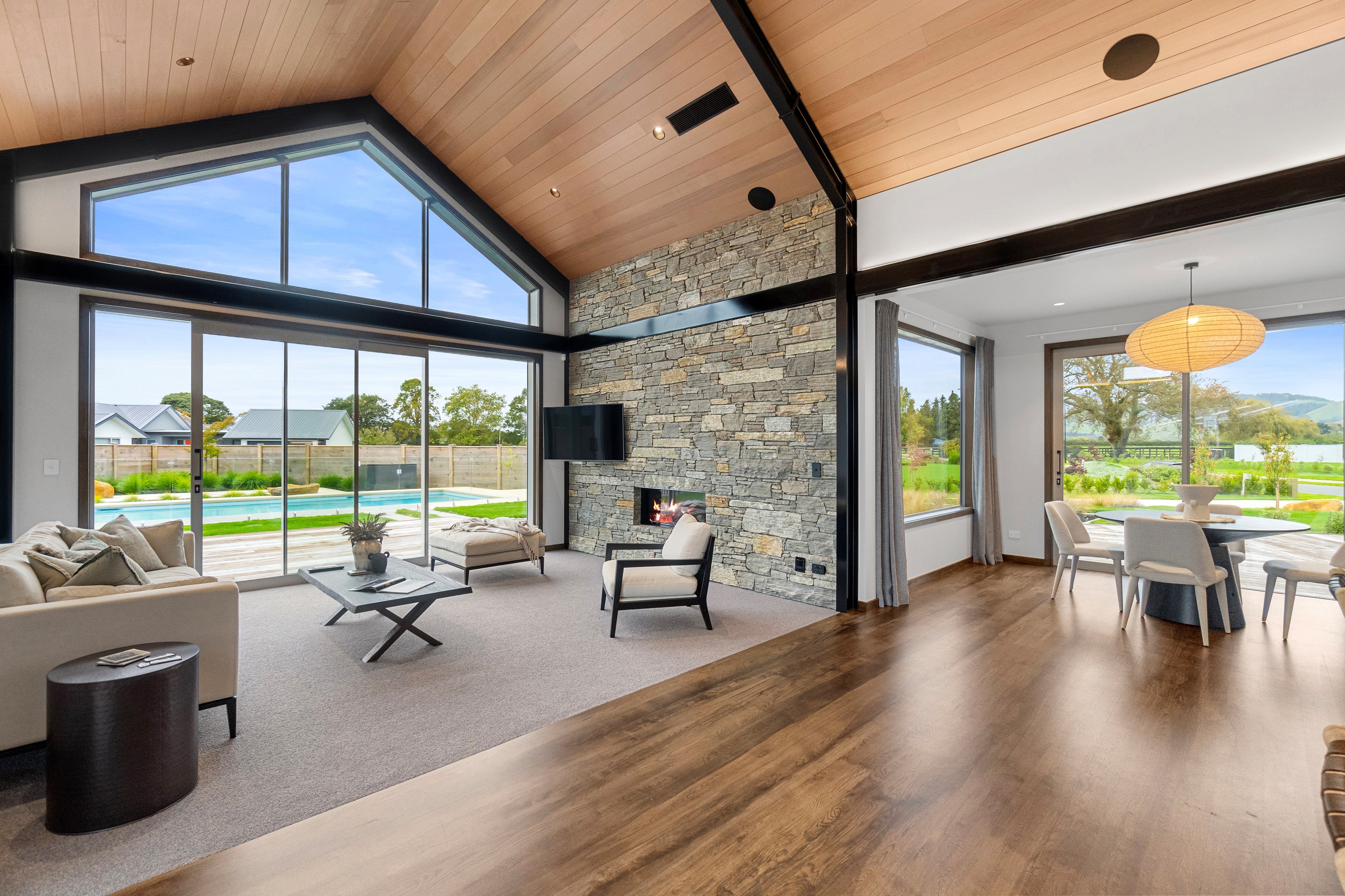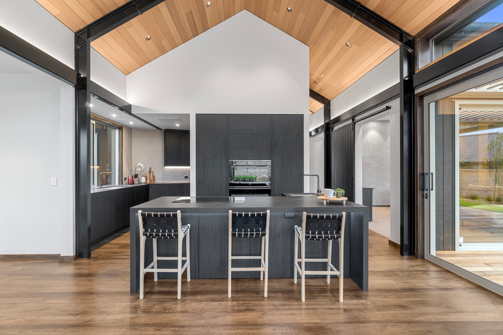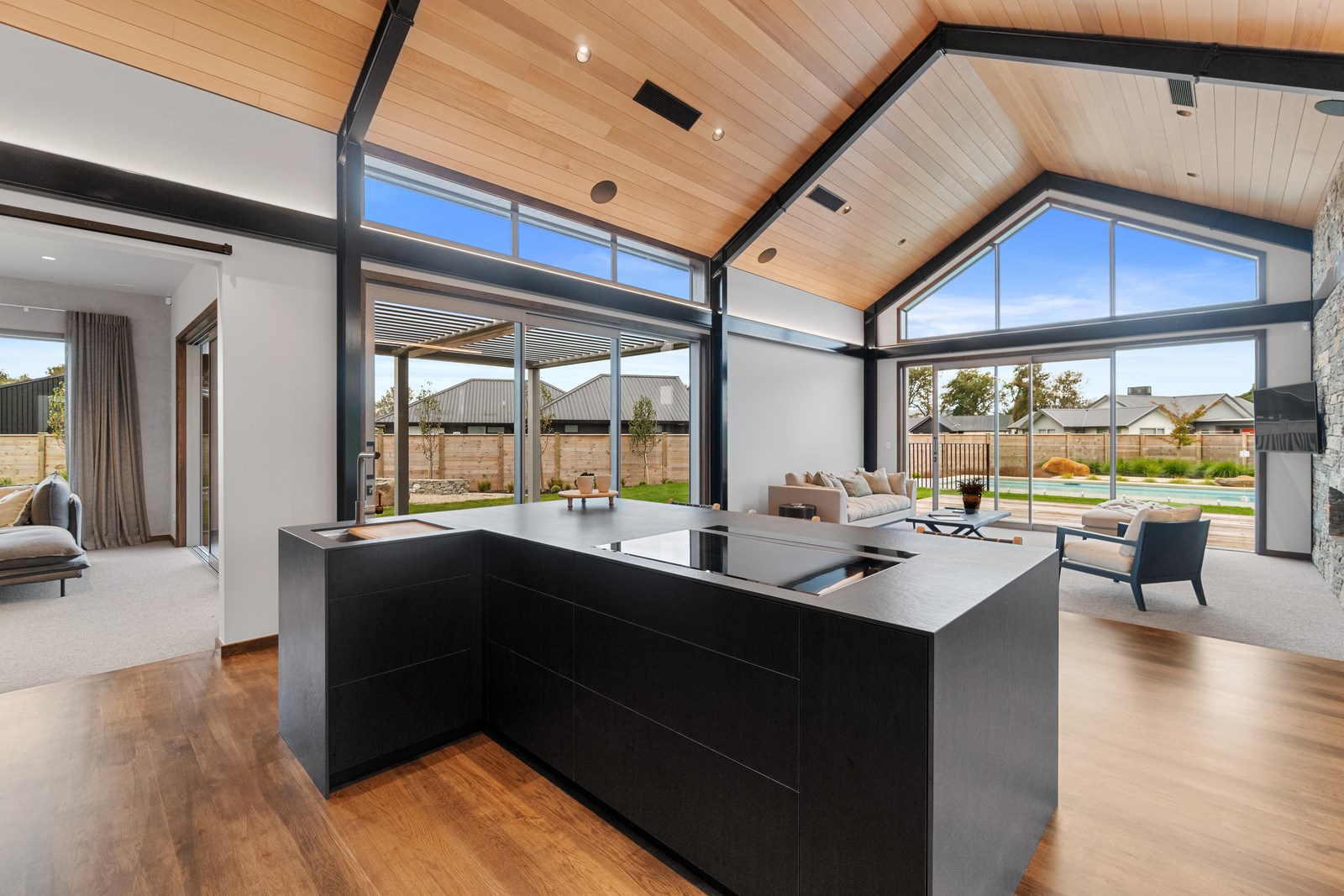 This four-bedroom, three-bathroom Cambridge show home is quite the star, built to impress from all sides. Clad in Celcrete autoclaved concrete and Weathertex architectural panelling, with schist wall features and exposed structural steel, this 369sqm house has four wings, linked by an impressive entryway. Feature cedar ceilings over multiple stud heights and American white oak timber flooring, coupled with feature walls and dark beams, star in the central living-diningkitchen hub. The kitchen is designed for easy entertaining, with prominent charcoal panelling and a back scullery, and has an L-shaped island which overlooks the carpeted living area and out the sliding doors to the outdoors. Outside you’ll find multiple decks, a swimming pool, firepit and a sheltered louvred pergola. The clever layout of this home takes the shape of a star. One wing provides garaging, storage and a gym, while the others house separate private areas, with multiple stacking doors for indoor/outdoor access from each one. Another wing is devoted to the main bedroom with ensuite and walk-in wardrobe; three bedrooms, a bathroom and guest ensuite take up another. Nothing has been overlooked.