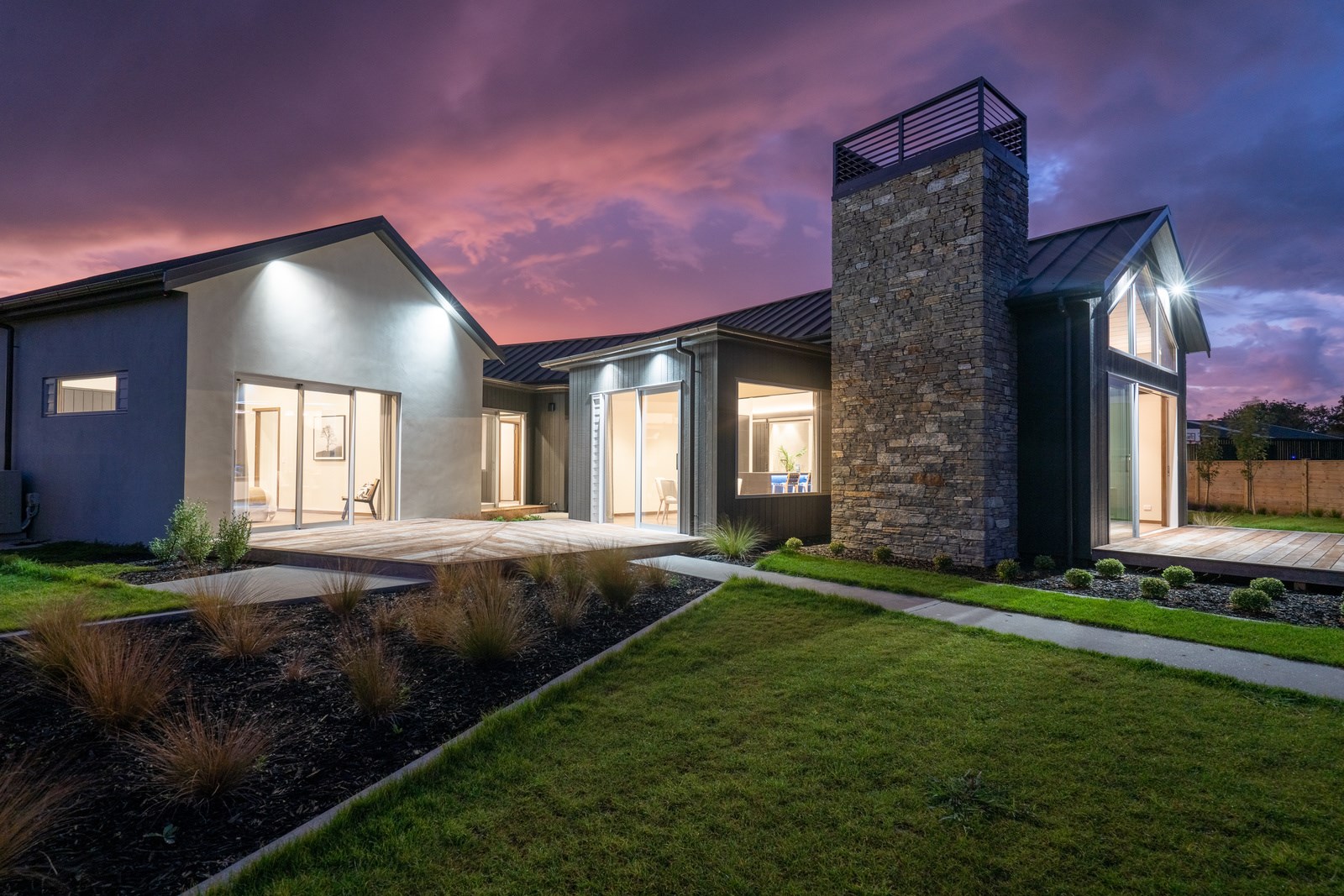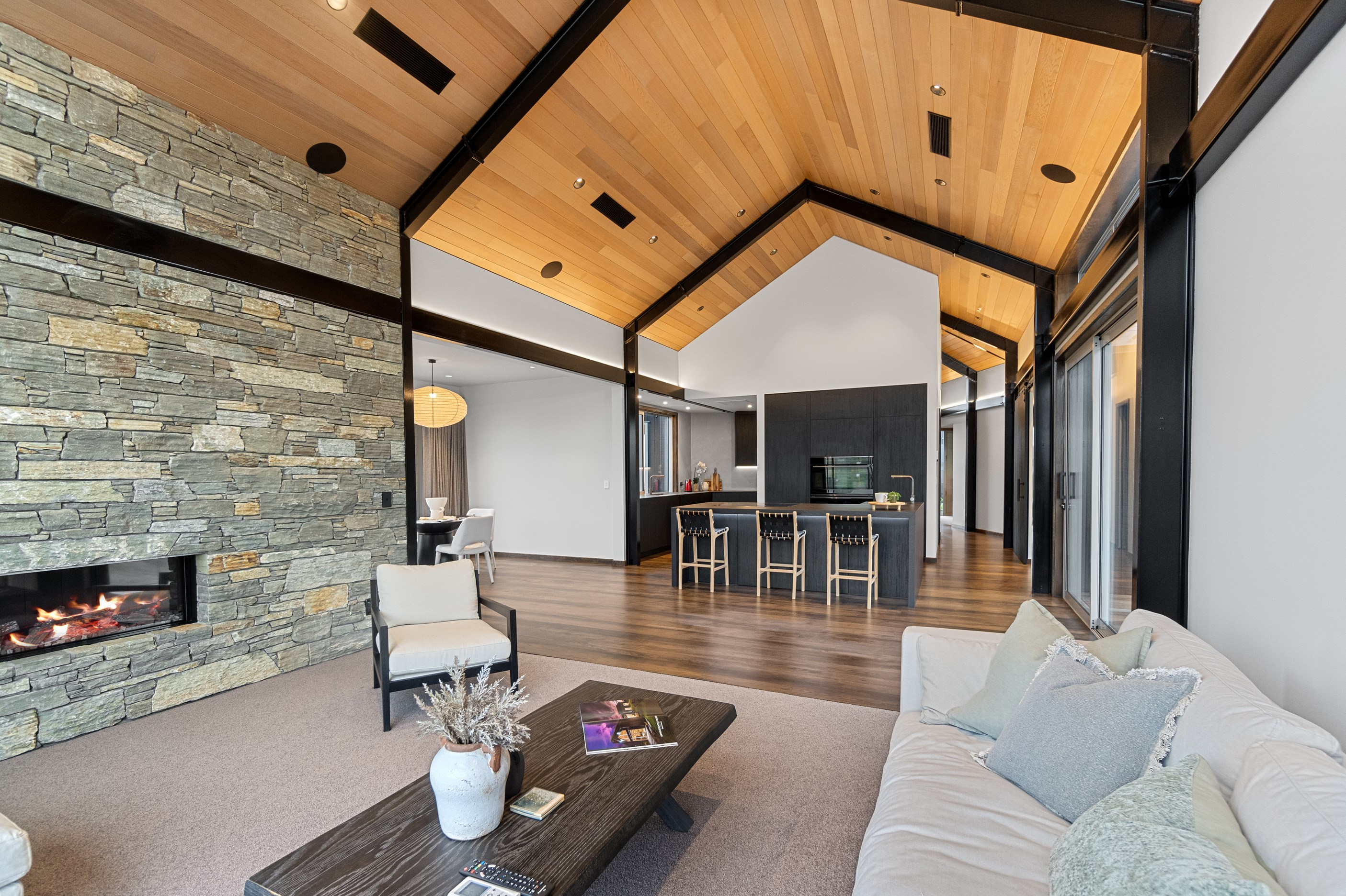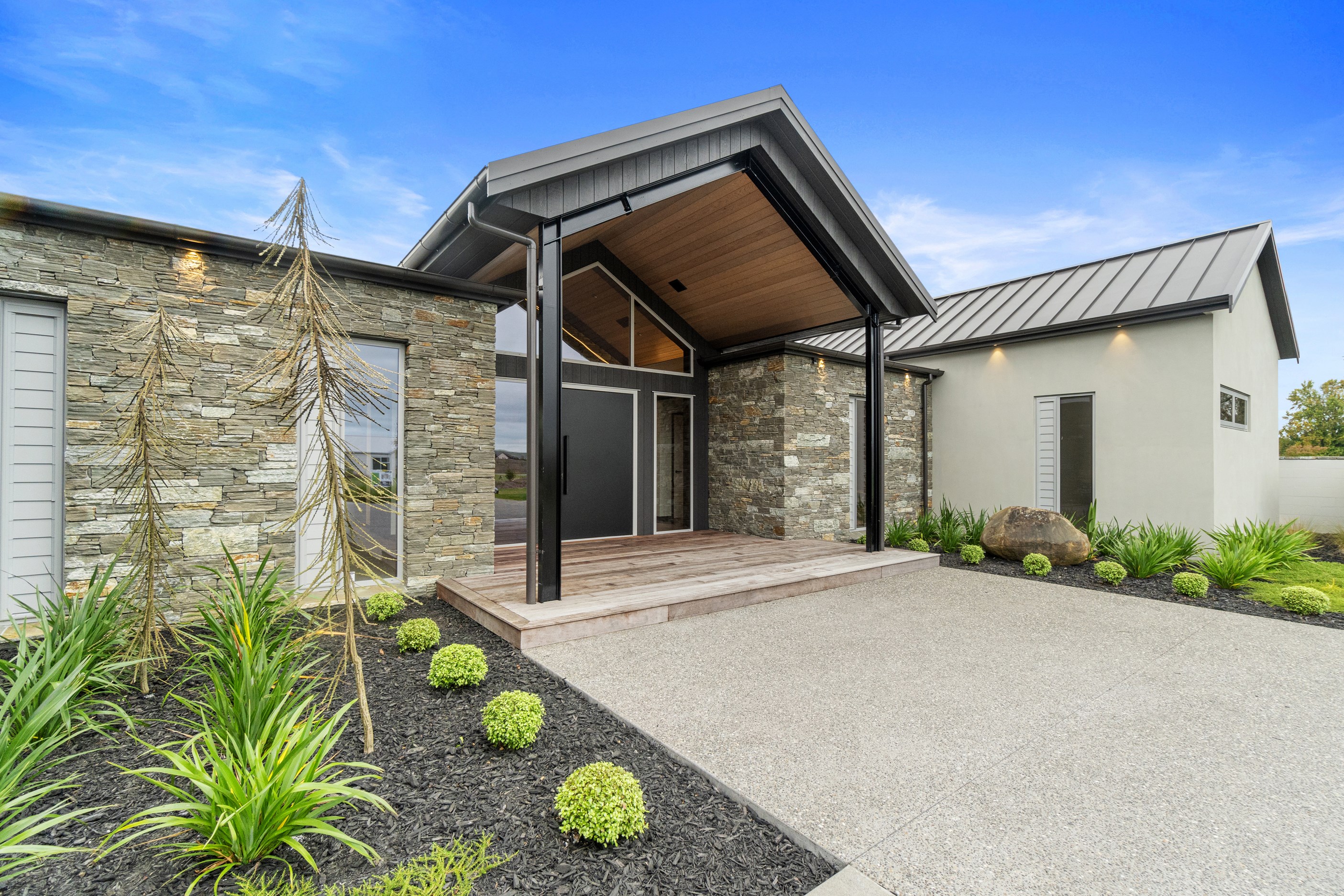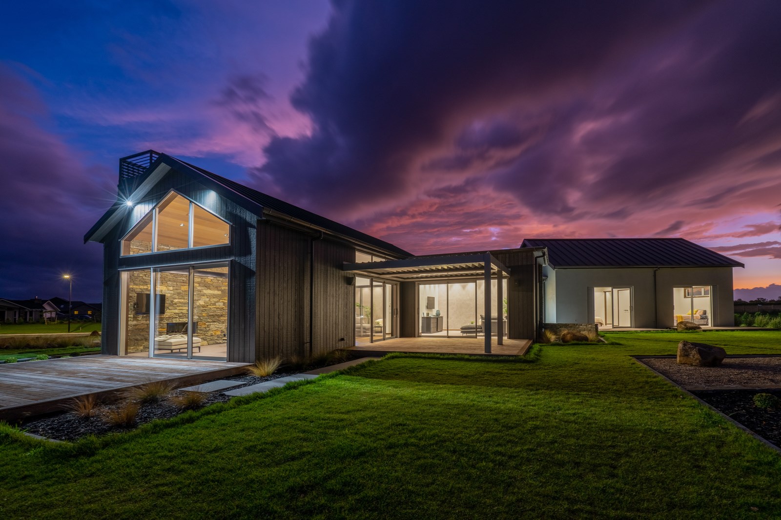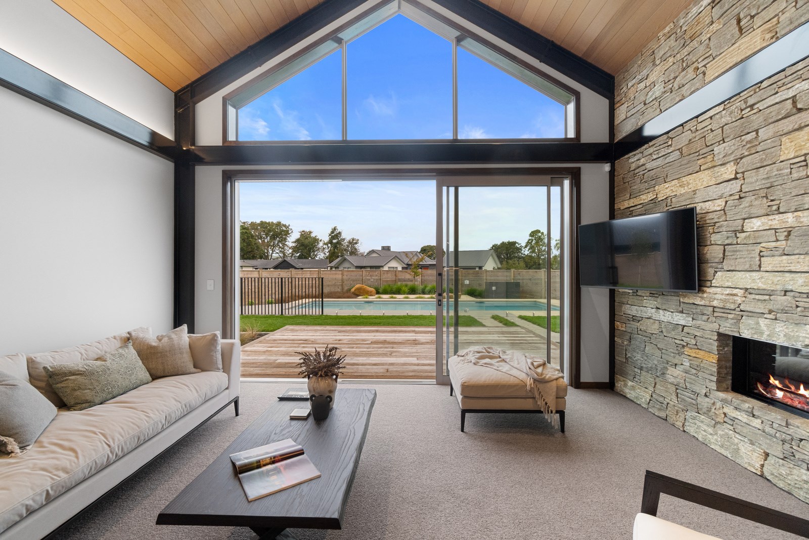 This four-bedroom, three-bathroom Cambridge show home is quite the star, built to impress from all sides. Clad in Celcrete autoclaved concrete and Weathertex architectural panelling, with schist wall features and exposed structural steel, this 369sqm house has four wings, linked by an impressive entryway. Feature cedar ceilings over multiple stud heights and American white oak timber flooring, coupled with feature walls and dark beams, star in the central living-diningkitchen hub. The kitchen is designed for easy entertaining, with prominent charcoal panelling and a back scullery, and has an L-shaped island which overlooks the carpeted living area and out the sliding doors to the outdoors. Outside you’ll find multiple decks, a swimming pool, firepit and a sheltered louvred pergola. The clever layout of this home takes the shape of a star. One wing provides garaging, storage and a gym, while the others house separate private areas, with multiple stacking doors for indoor/outdoor access from each one. Another wing is devoted to the main bedroom with ensuite and walk-in wardrobe; three bedrooms, a bathroom and guest ensuite take up another. Nothing has been overlooked.