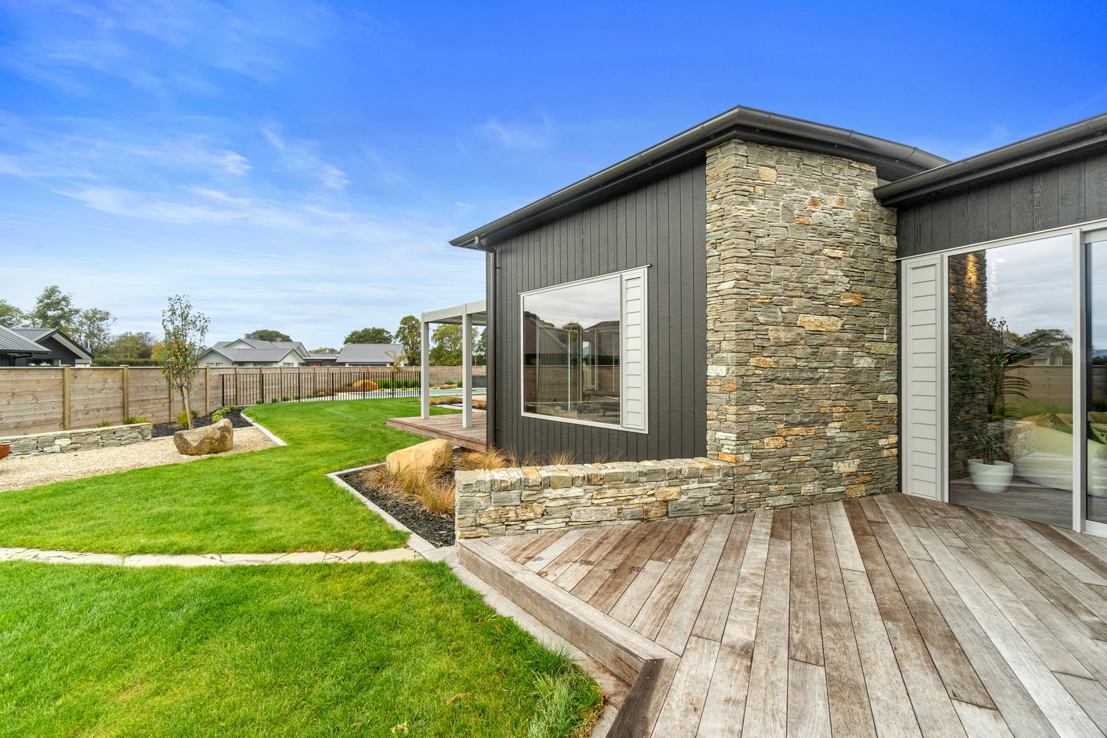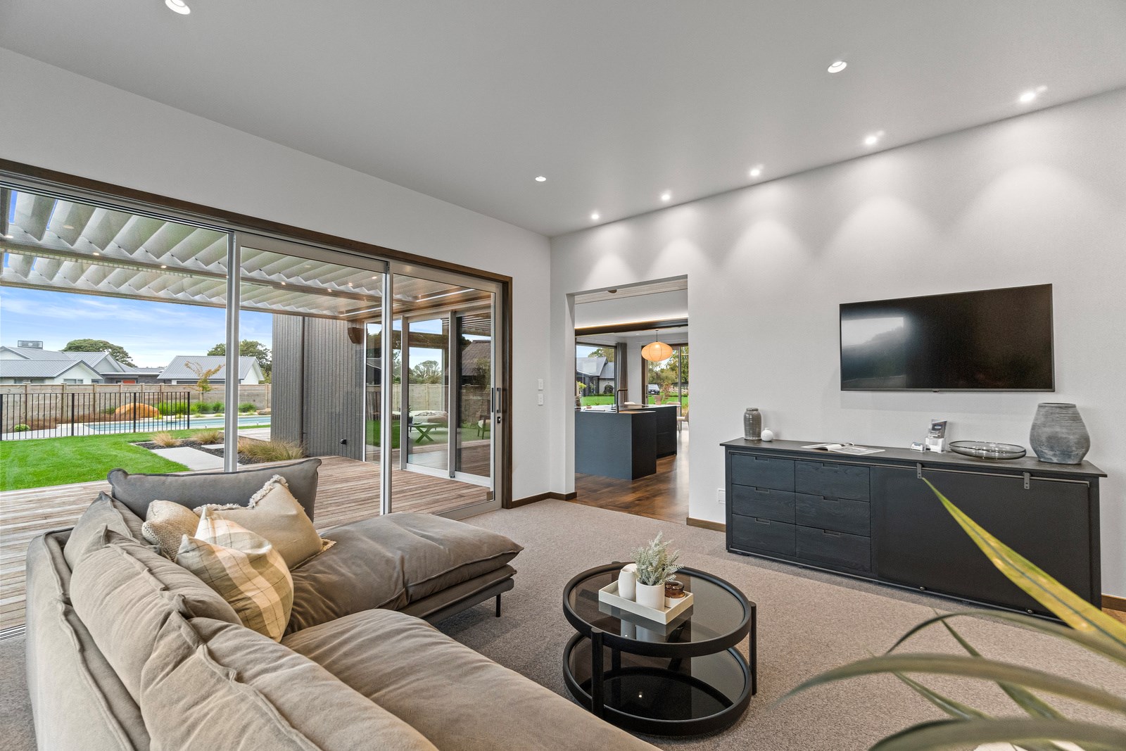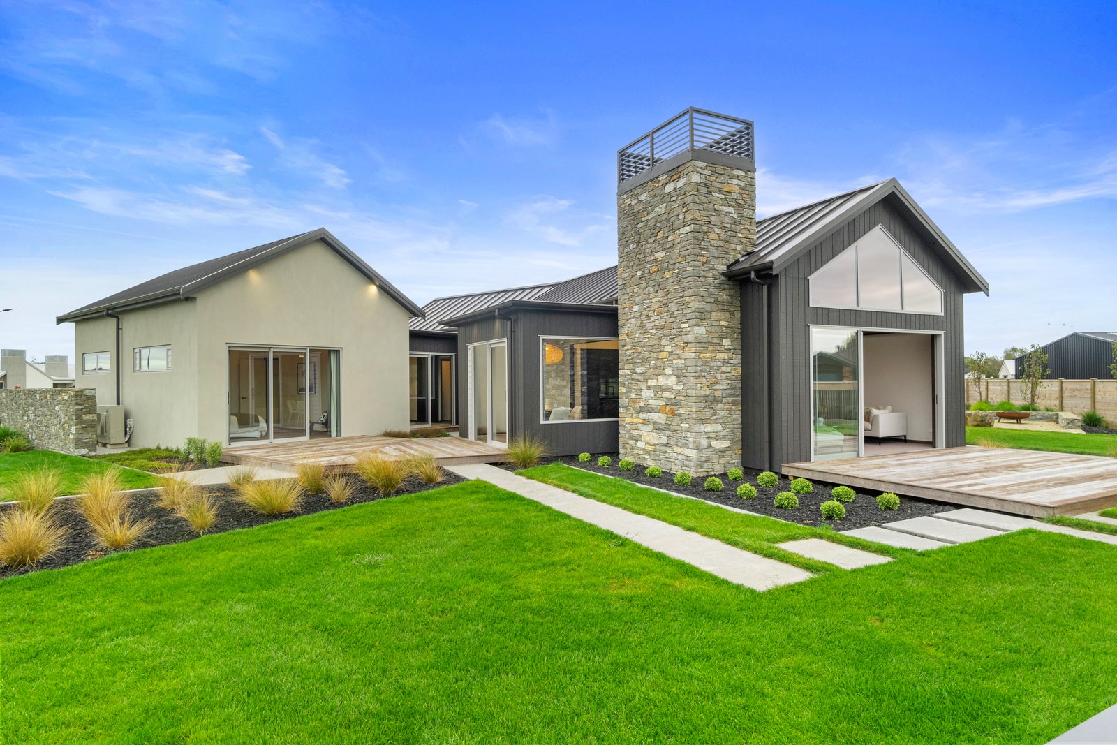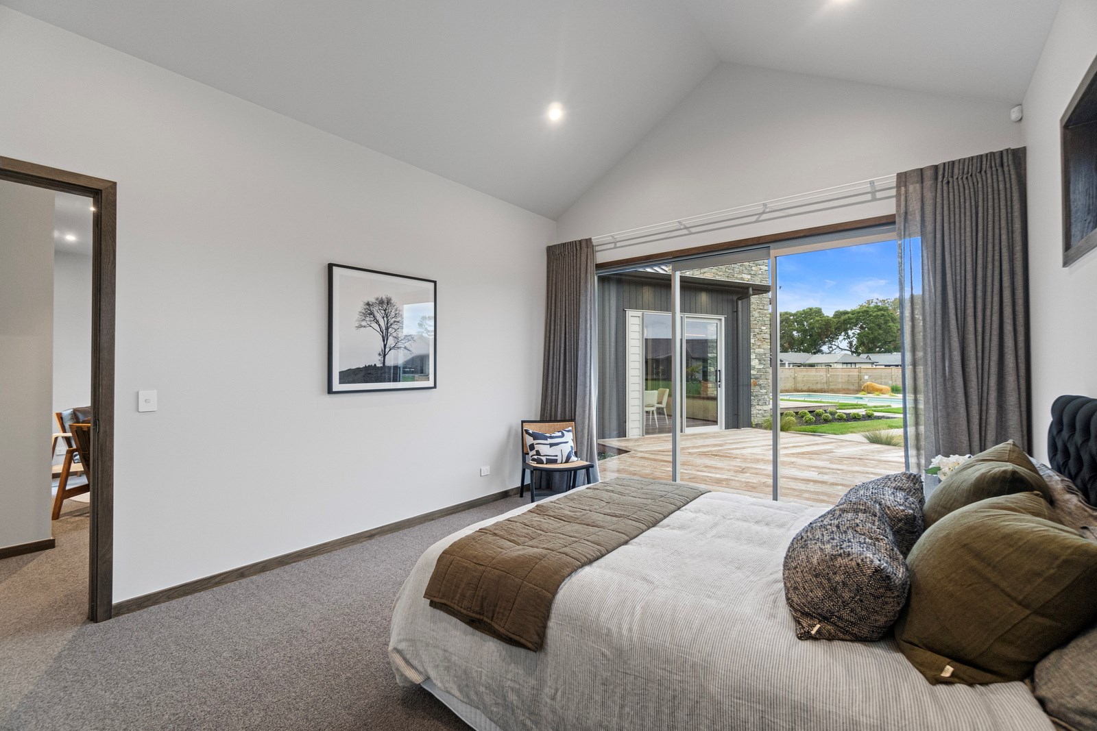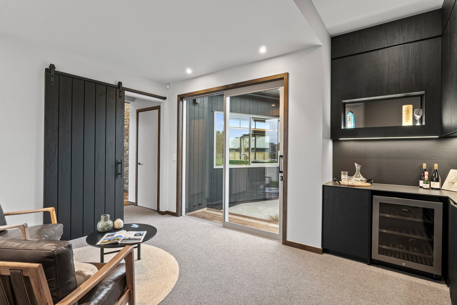 This four-bedroom, three-bathroom Cambridge show home is quite the star, built to impress from all sides. Clad in Celcrete autoclaved concrete and Weathertex architectural panelling, with schist wall features and exposed structural steel, this 369sqm house has four wings, linked by an impressive entryway. Feature cedar ceilings over multiple stud heights and American white oak timber flooring, coupled with feature walls and dark beams, star in the central living-diningkitchen hub. The kitchen is designed for easy entertaining, with prominent charcoal panelling and a back scullery, and has an L-shaped island which overlooks the carpeted living area and out the sliding doors to the outdoors. Outside you’ll find multiple decks, a swimming pool, firepit and a sheltered louvred pergola. The clever layout of this home takes the shape of a star. One wing provides garaging, storage and a gym, while the others house separate private areas, with multiple stacking doors for indoor/outdoor access from each one. Another wing is devoted to the main bedroom with ensuite and walk-in wardrobe; three bedrooms, a bathroom and guest ensuite take up another. Nothing has been overlooked.
