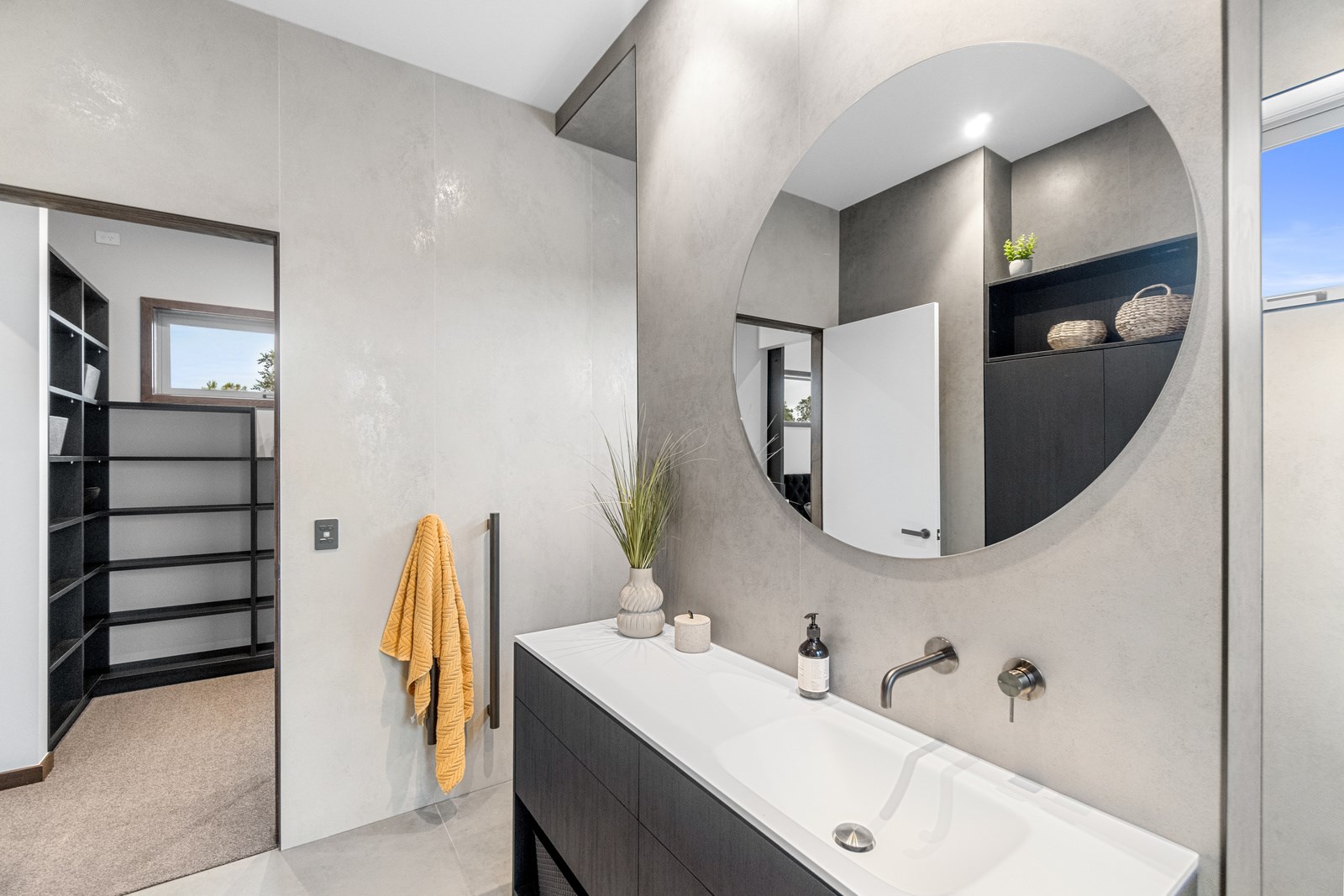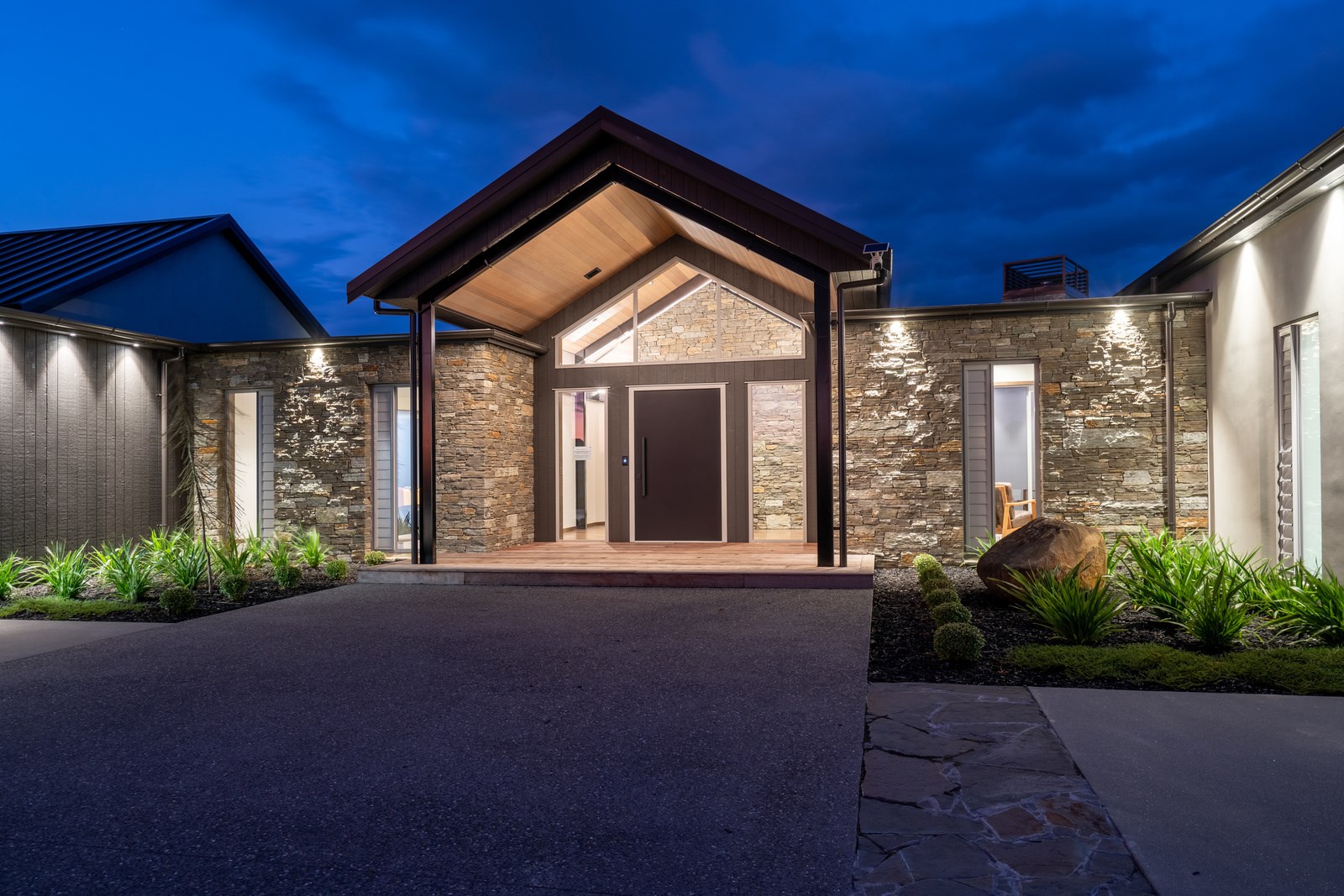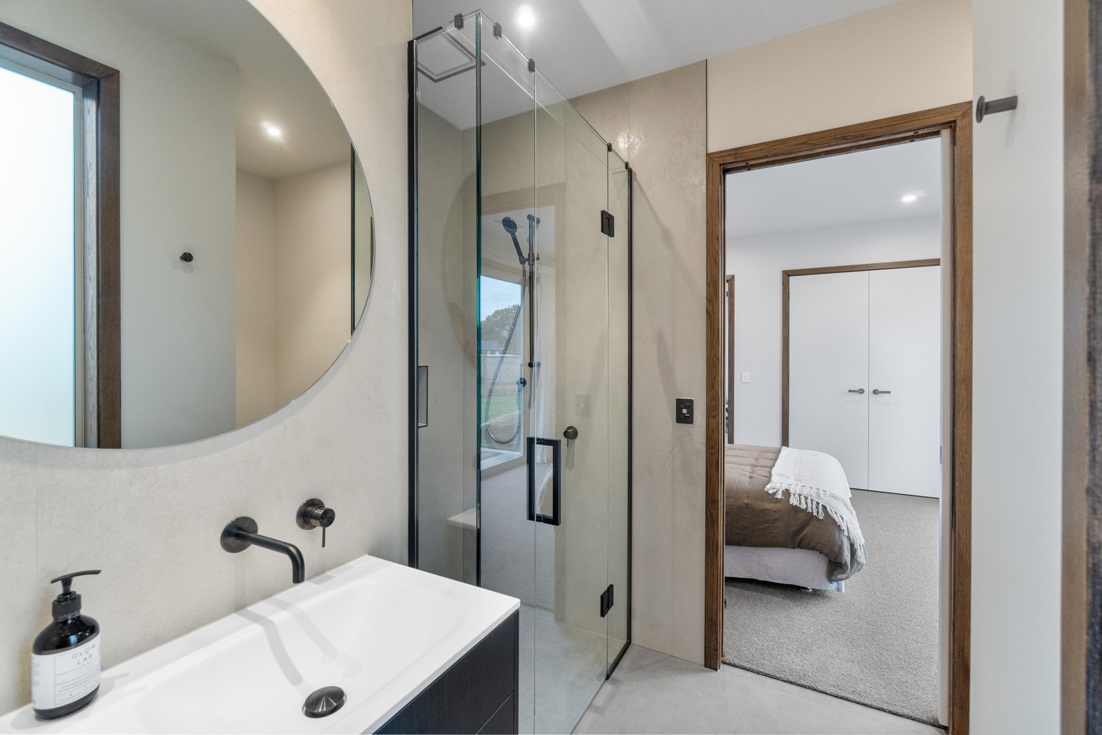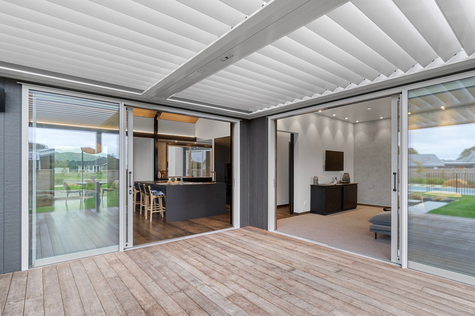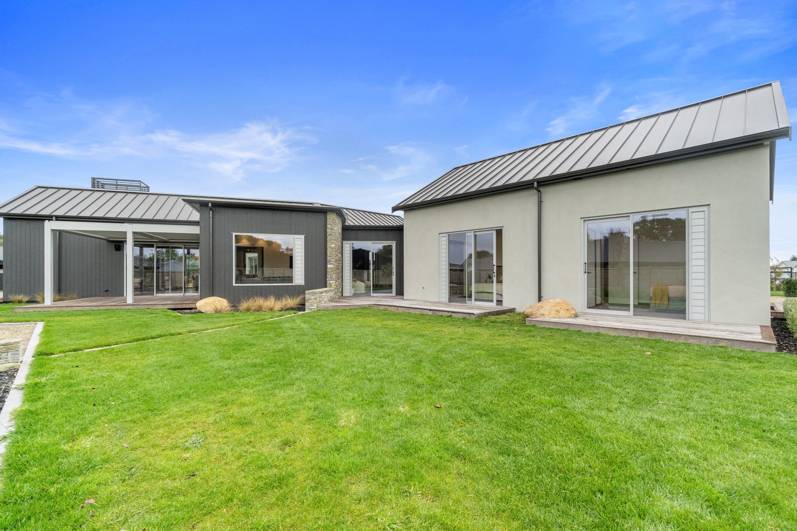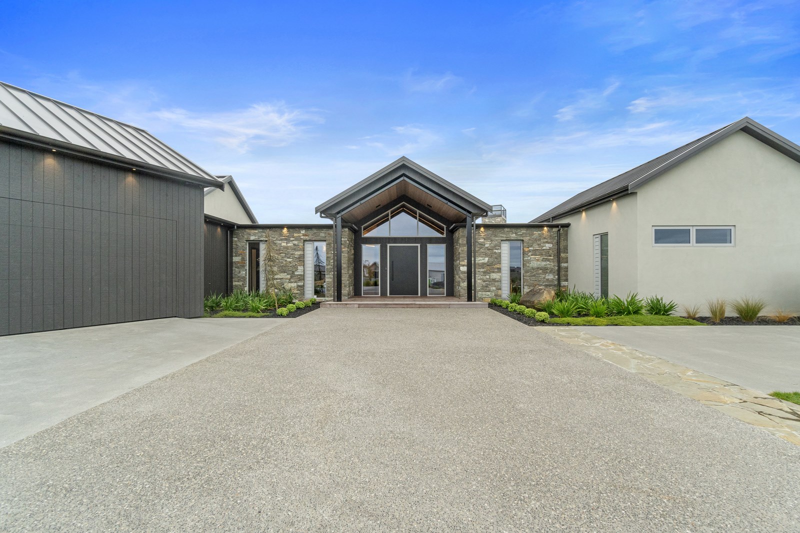 This four-bedroom, three-bathroom Cambridge show home is quite the star, built to impress from all sides. Clad in Celcrete autoclaved concrete and Weathertex architectural panelling, with schist wall features and exposed structural steel, this 369sqm house has four wings, linked by an impressive entryway. Feature cedar ceilings over multiple stud heights and American white oak timber flooring, coupled with feature walls and dark beams, star in the central living-diningkitchen hub. The kitchen is designed for easy entertaining, with prominent charcoal panelling and a back scullery, and has an L-shaped island which overlooks the carpeted living area and out the sliding doors to the outdoors. Outside you’ll find multiple decks, a swimming pool, firepit and a sheltered louvred pergola. The clever layout of this home takes the shape of a star. One wing provides garaging, storage and a gym, while the others house separate private areas, with multiple stacking doors for indoor/outdoor access from each one. Another wing is devoted to the main bedroom with ensuite and walk-in wardrobe; three bedrooms, a bathroom and guest ensuite take up another. Nothing has been overlooked.