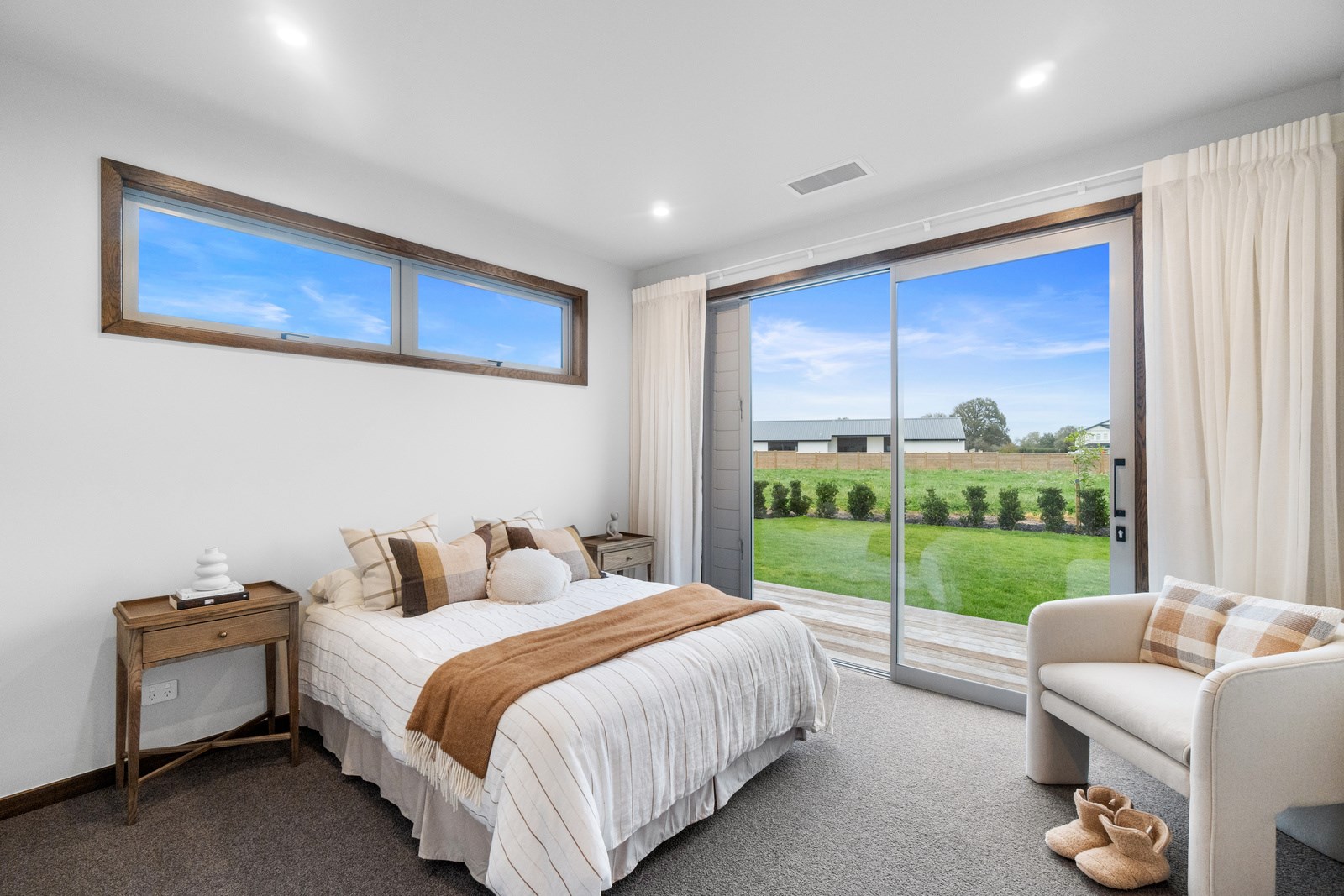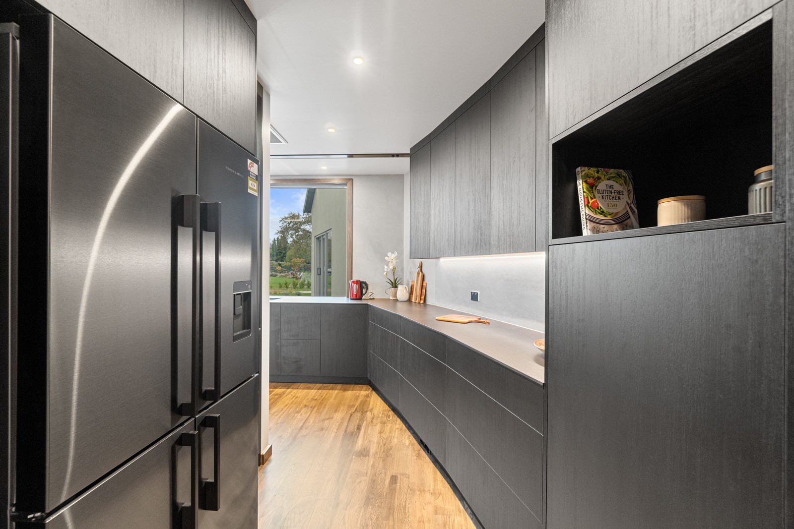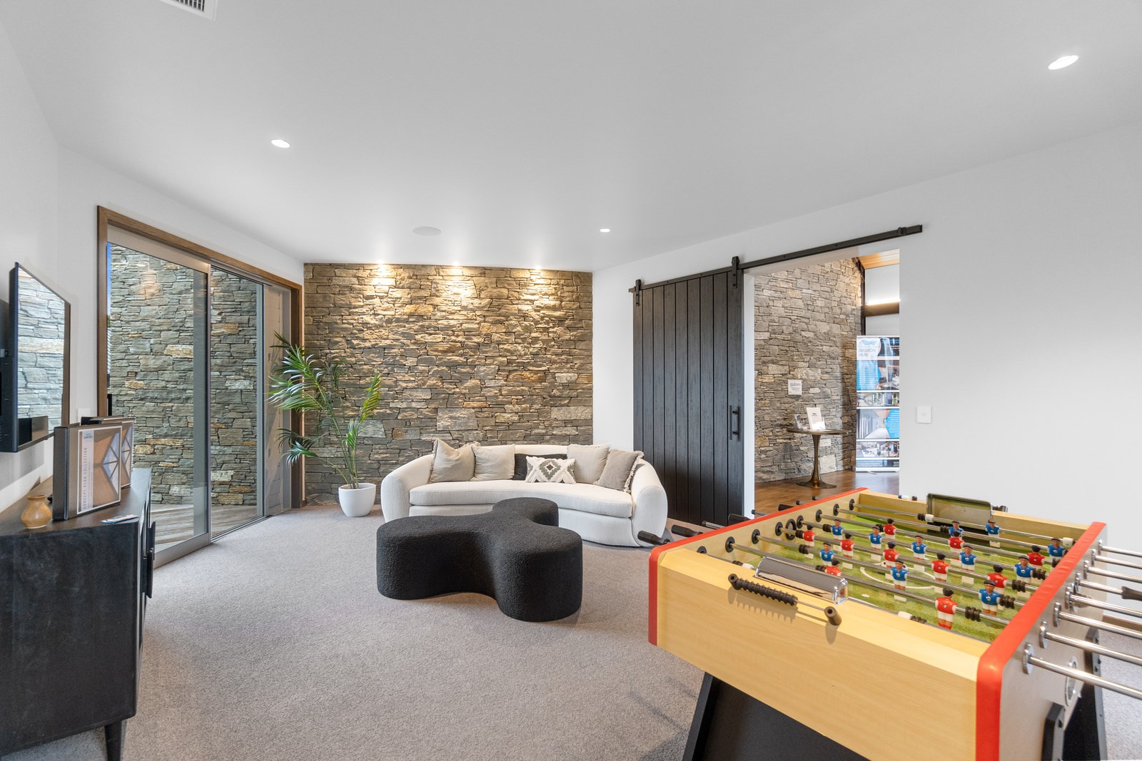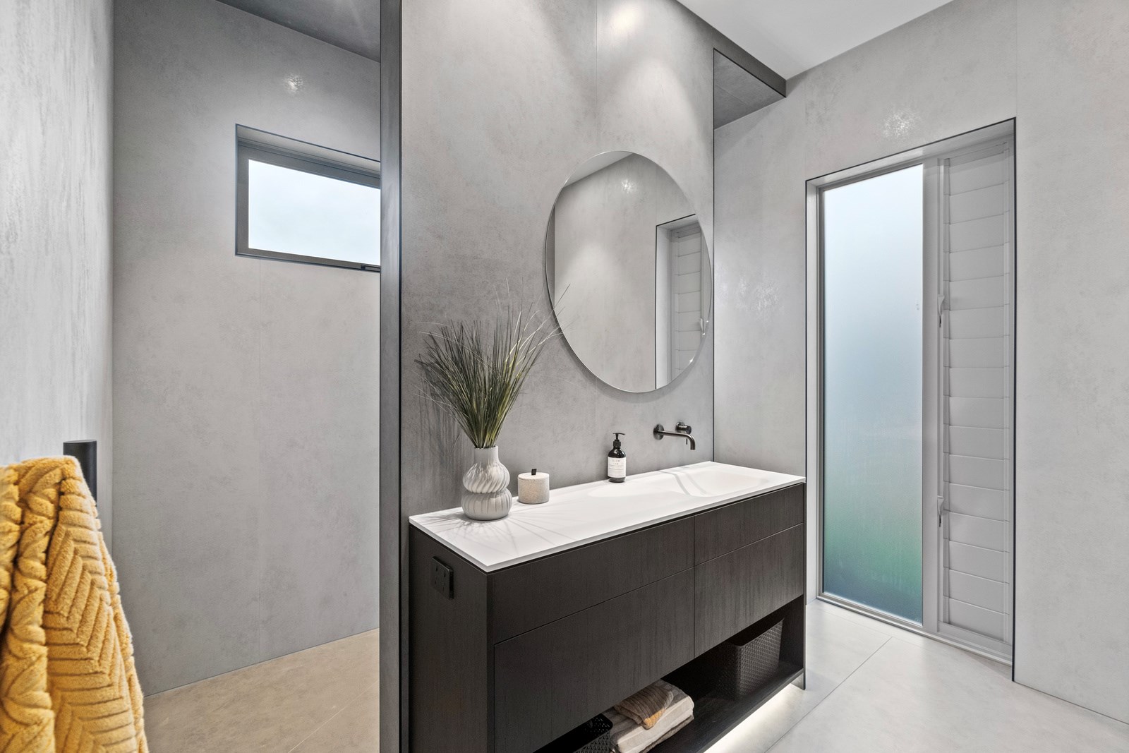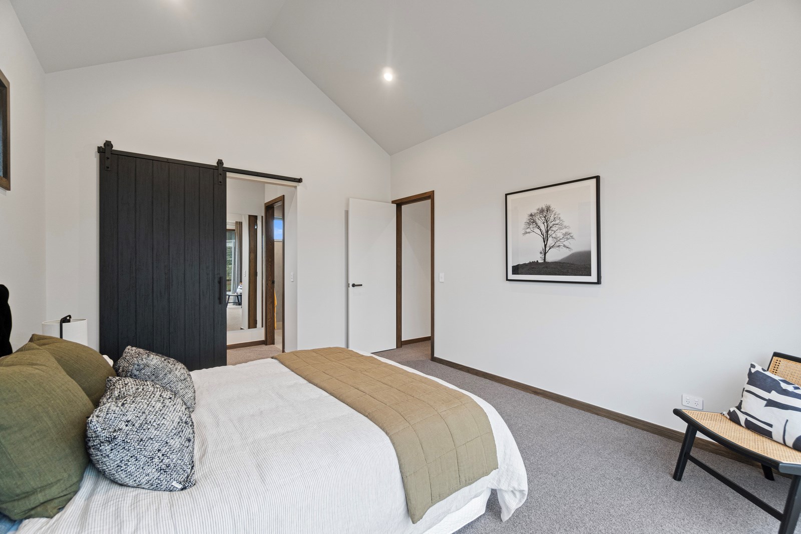 This four-bedroom, three-bathroom Cambridge show home is quite the star, built to impress from all sides. Clad in Celcrete autoclaved concrete and Weathertex architectural panelling, with schist wall features and exposed structural steel, this 369sqm house has four wings, linked by an impressive entryway. Feature cedar ceilings over multiple stud heights and American white oak timber flooring, coupled with feature walls and dark beams, star in the central living-diningkitchen hub. The kitchen is designed for easy entertaining, with prominent charcoal panelling and a back scullery, and has an L-shaped island which overlooks the carpeted living area and out the sliding doors to the outdoors. Outside you’ll find multiple decks, a swimming pool, firepit and a sheltered louvred pergola. The clever layout of this home takes the shape of a star. One wing provides garaging, storage and a gym, while the others house separate private areas, with multiple stacking doors for indoor/outdoor access from each one. Another wing is devoted to the main bedroom with ensuite and walk-in wardrobe; three bedrooms, a bathroom and guest ensuite take up another. Nothing has been overlooked.