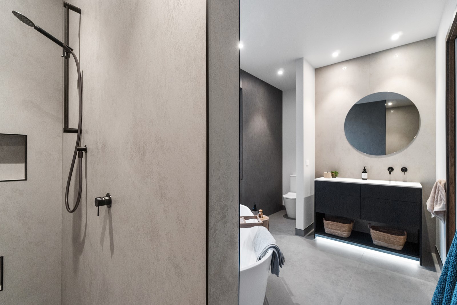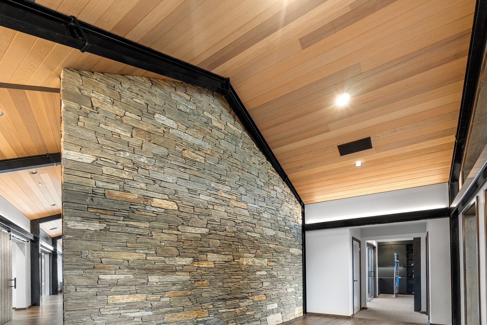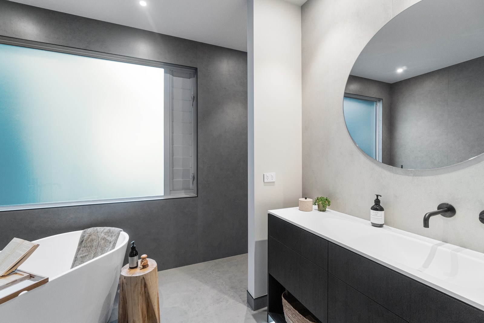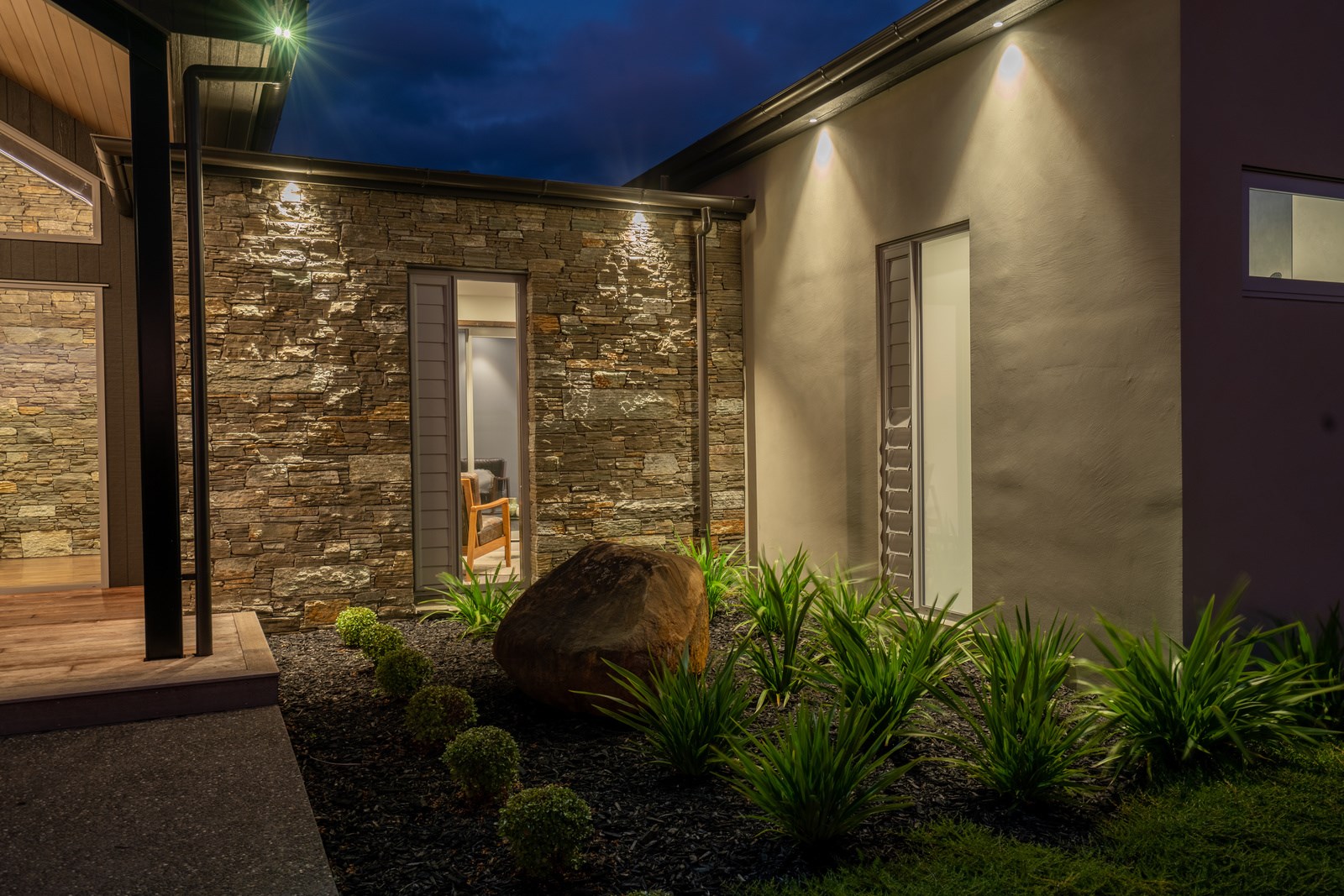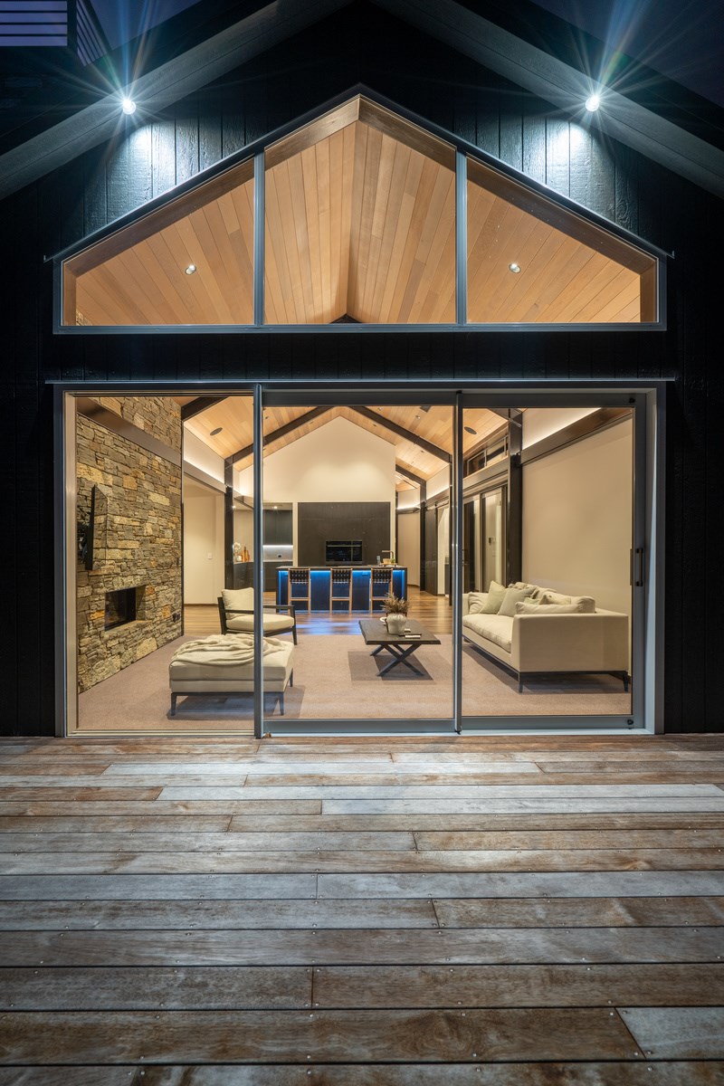 This four-bedroom, three-bathroom Cambridge show home is quite the star, built to impress from all sides. Clad in Celcrete autoclaved concrete and Weathertex architectural panelling, with schist wall features and exposed structural steel, this 369sqm house has four wings, linked by an impressive entryway. Feature cedar ceilings over multiple stud heights and American white oak timber flooring, coupled with feature walls and dark beams, star in the central living-diningkitchen hub. The kitchen is designed for easy entertaining, with prominent charcoal panelling and a back scullery, and has an L-shaped island which overlooks the carpeted living area and out the sliding doors to the outdoors. Outside you’ll find multiple decks, a swimming pool, firepit and a sheltered louvred pergola. The clever layout of this home takes the shape of a star. One wing provides garaging, storage and a gym, while the others house separate private areas, with multiple stacking doors for indoor/outdoor access from each one. Another wing is devoted to the main bedroom with ensuite and walk-in wardrobe; three bedrooms, a bathroom and guest ensuite take up another. Nothing has been overlooked.