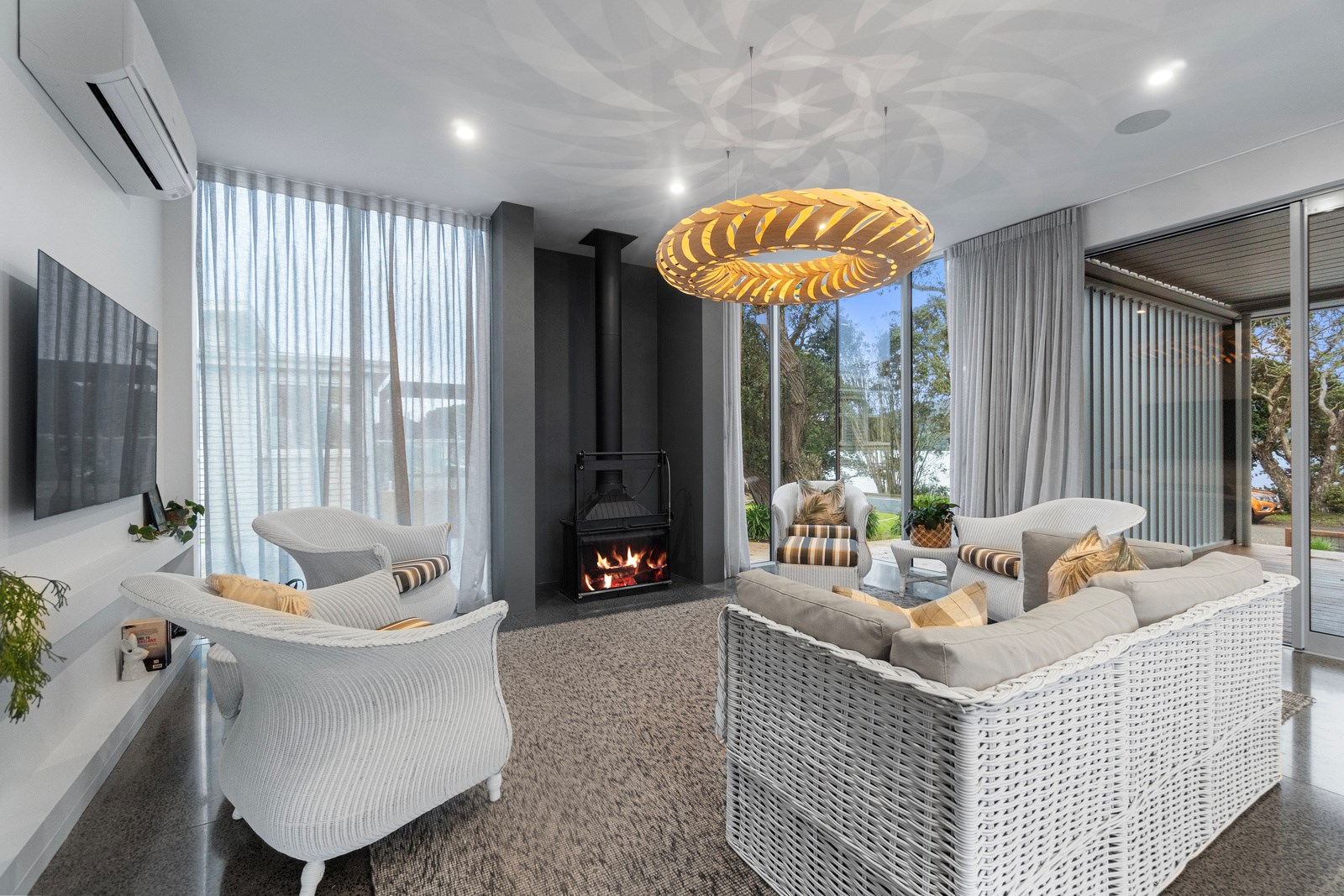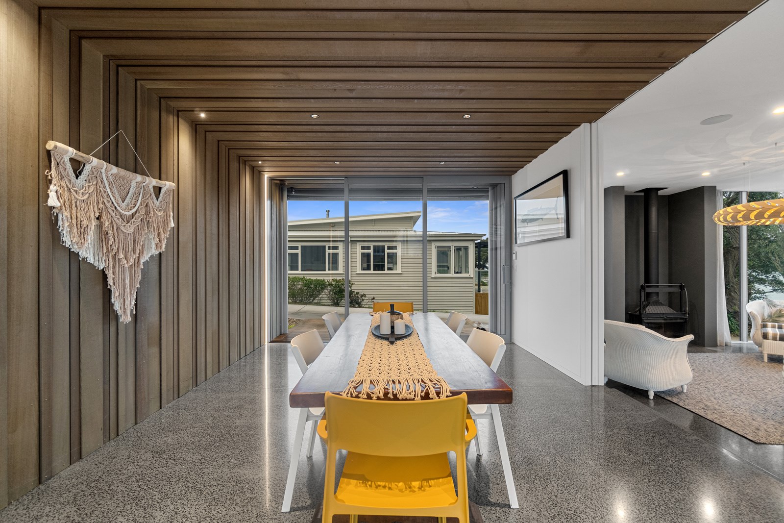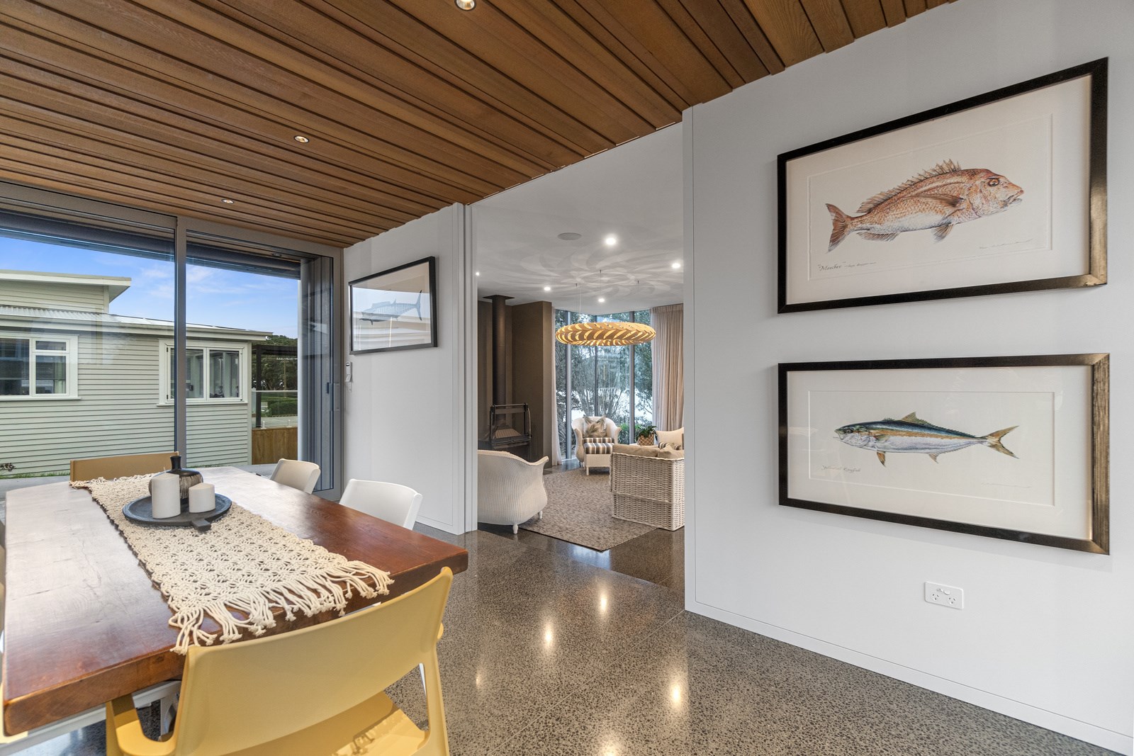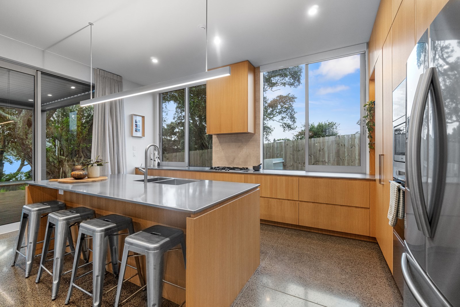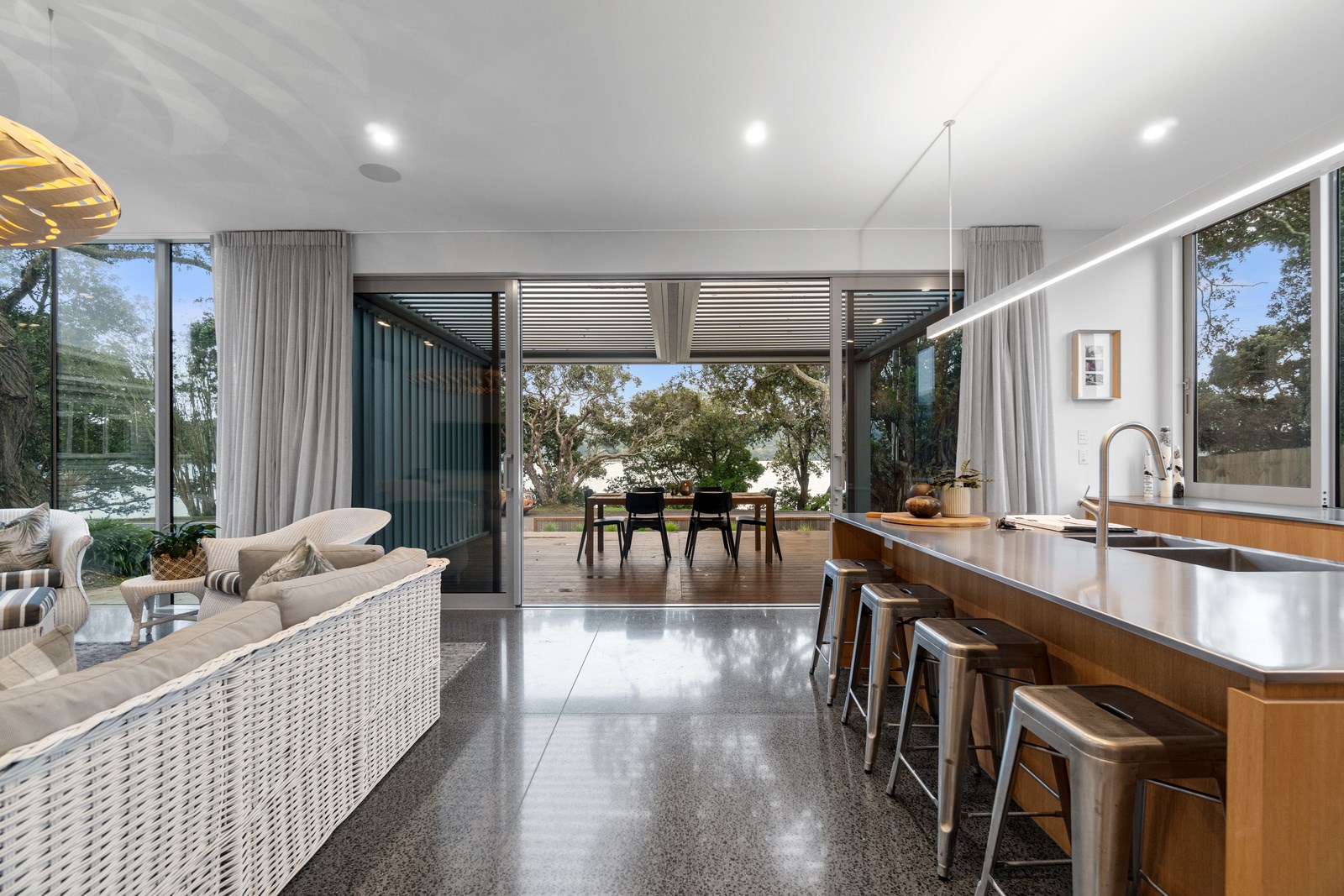 Home is where the heart is, and this one — sitting prettily under two old pŌhutukawa trees overlooking Raglan Harbour — is a perfect picture of just that. Built to replace the original and faded family bach, the compact three-bedroom, two-bathroom, two-living room newcomer makes astute use of the space available in its 173sqm footprint. Constructed over three levels, with engineered block foundations, it’s an all-weather address lending a gallery-like appeal. Connecting decks protect from both wind and sun, while a covered outdoor area with louvre roof and walls leads to the kitchen and living area. Inside or out, it’s a delight to behold. Heated, polished coloured-concrete floors with plywood and cedar walls predominate indoors and frame additional touches. These include a feature halo light fitting that throws a dreamy, star-studded reflection on the ceiling. A solid plaster fireplace over aerated stone makes it all the better for lighting up some timber logs to keep this home cosy on cold winter nights. And when the world-famous Raglan surf’s up, there’s a place to clean up afterwards right at the back door. An exterior shower washes away any wayward black sand.