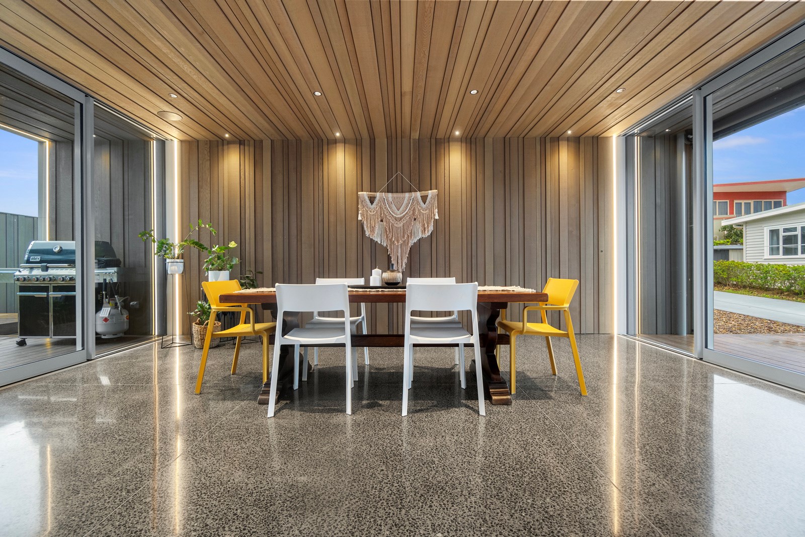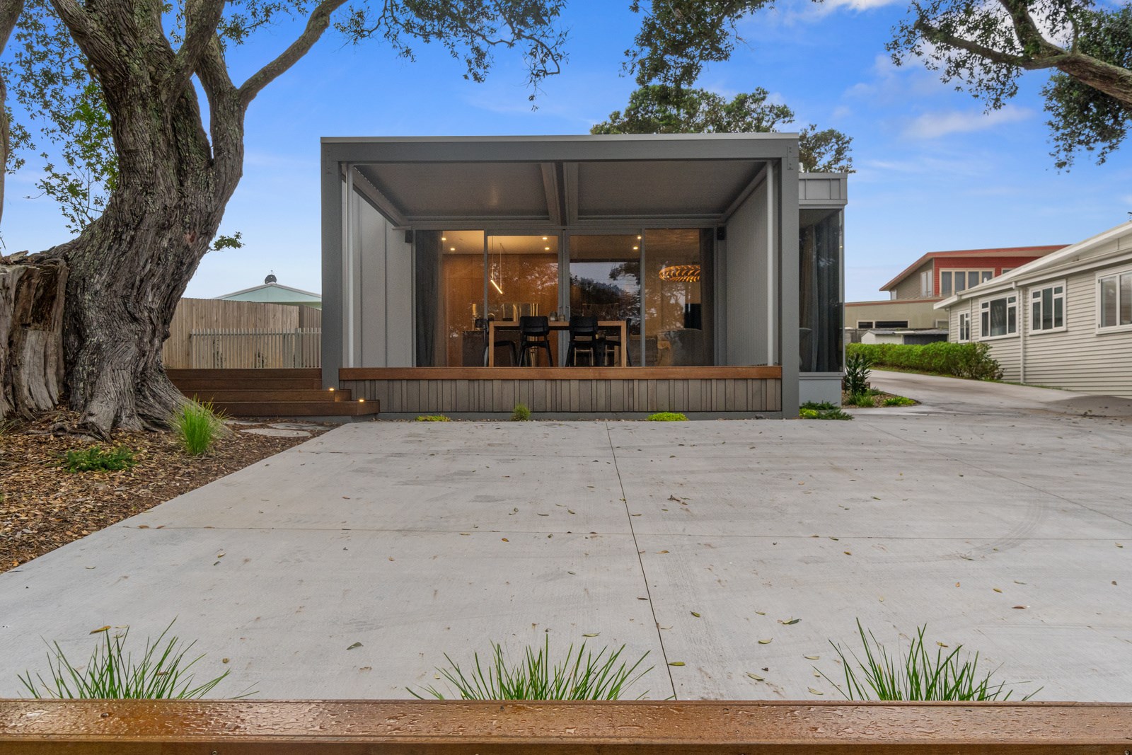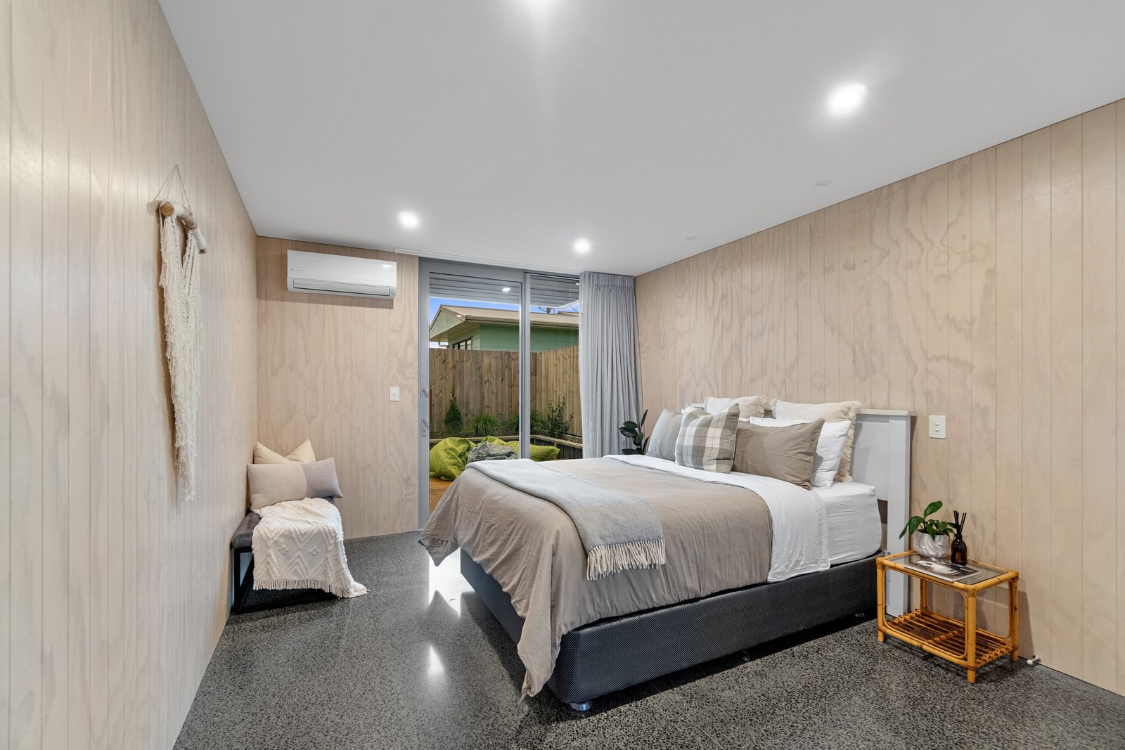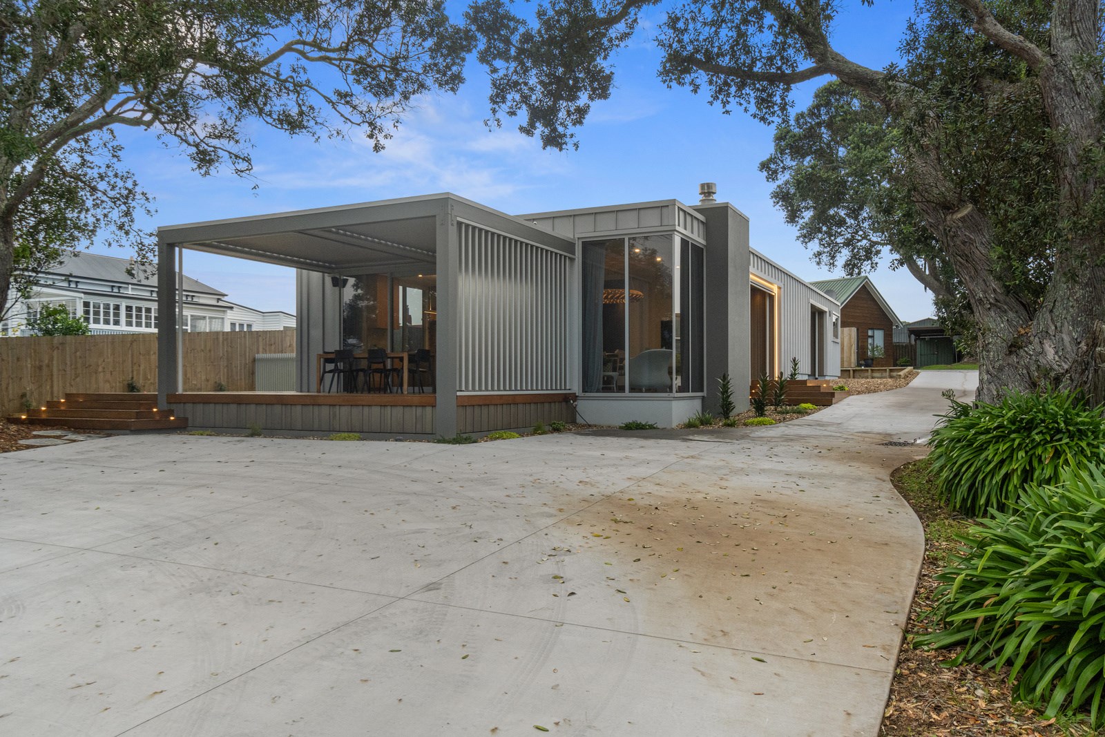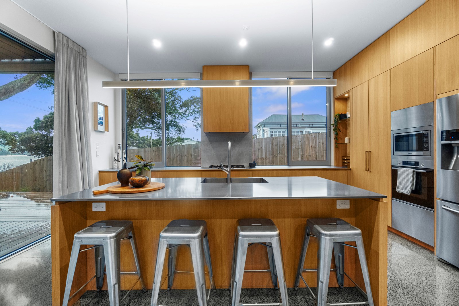 Home is where the heart is, and this one — sitting prettily under two old pŌhutukawa trees overlooking Raglan Harbour — is a perfect picture of just that. Built to replace the original and faded family bach, the compact three-bedroom, two-bathroom, two-living room newcomer makes astute use of the space available in its 173sqm footprint. Constructed over three levels, with engineered block foundations, it’s an all-weather address lending a gallery-like appeal. Connecting decks protect from both wind and sun, while a covered outdoor area with louvre roof and walls leads to the kitchen and living area. Inside or out, it’s a delight to behold. Heated, polished coloured-concrete floors with plywood and cedar walls predominate indoors and frame additional touches. These include a feature halo light fitting that throws a dreamy, star-studded reflection on the ceiling. A solid plaster fireplace over aerated stone makes it all the better for lighting up some timber logs to keep this home cosy on cold winter nights. And when the world-famous Raglan surf’s up, there’s a place to clean up afterwards right at the back door. An exterior shower washes away any wayward black sand.