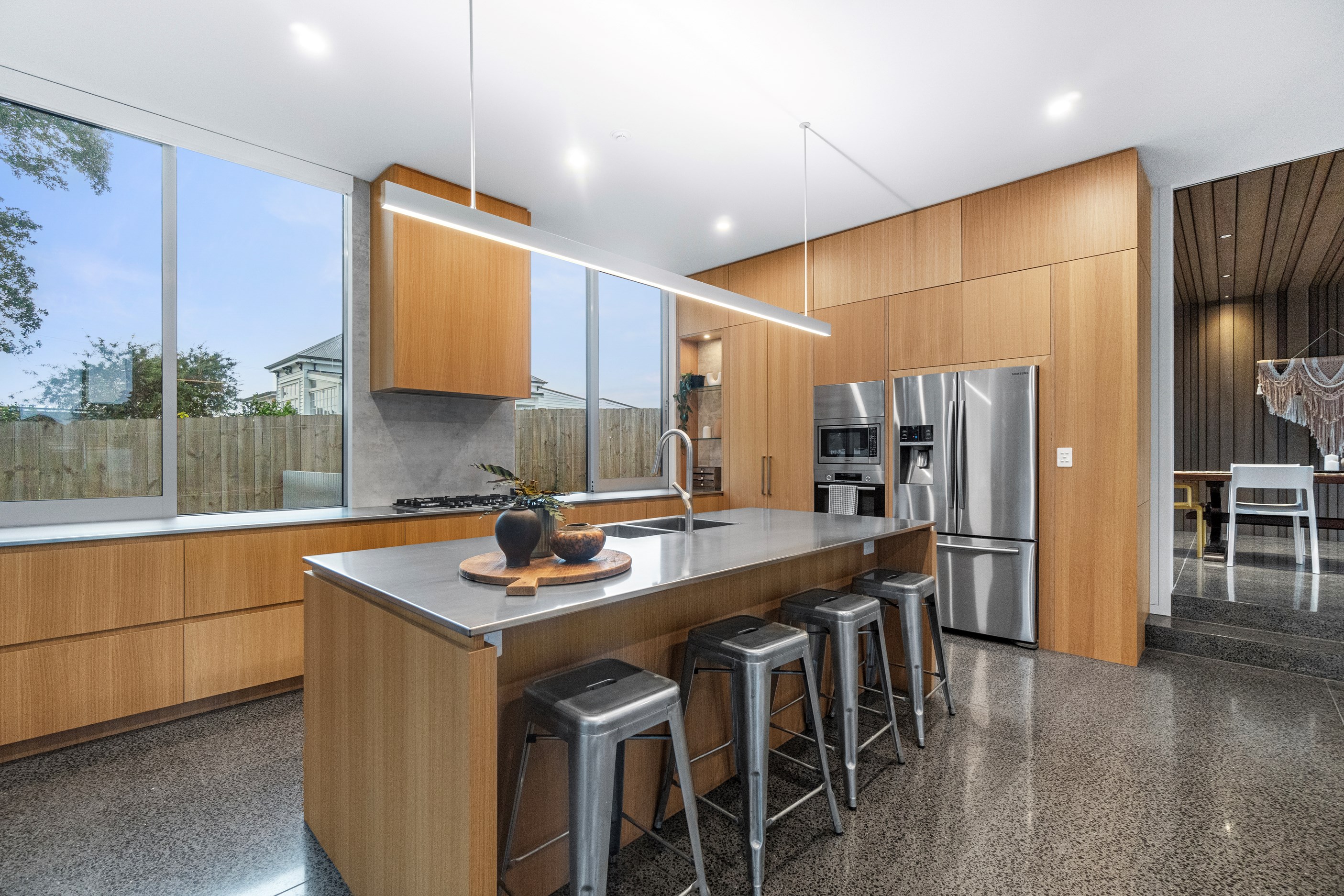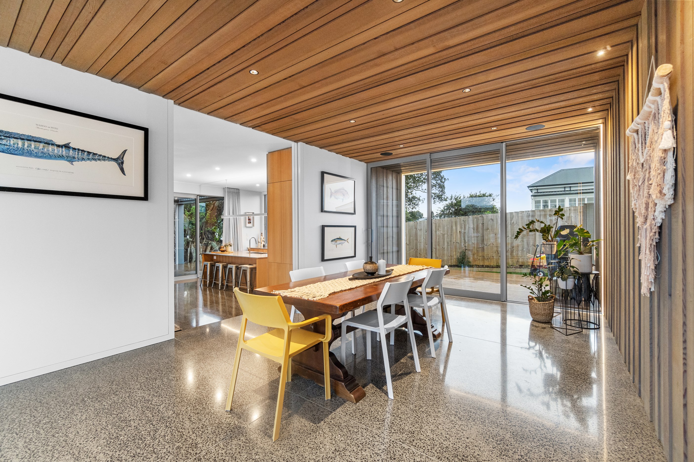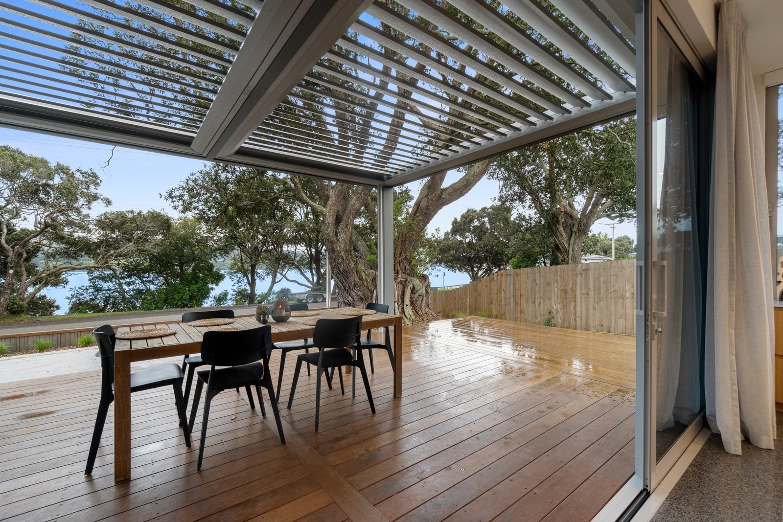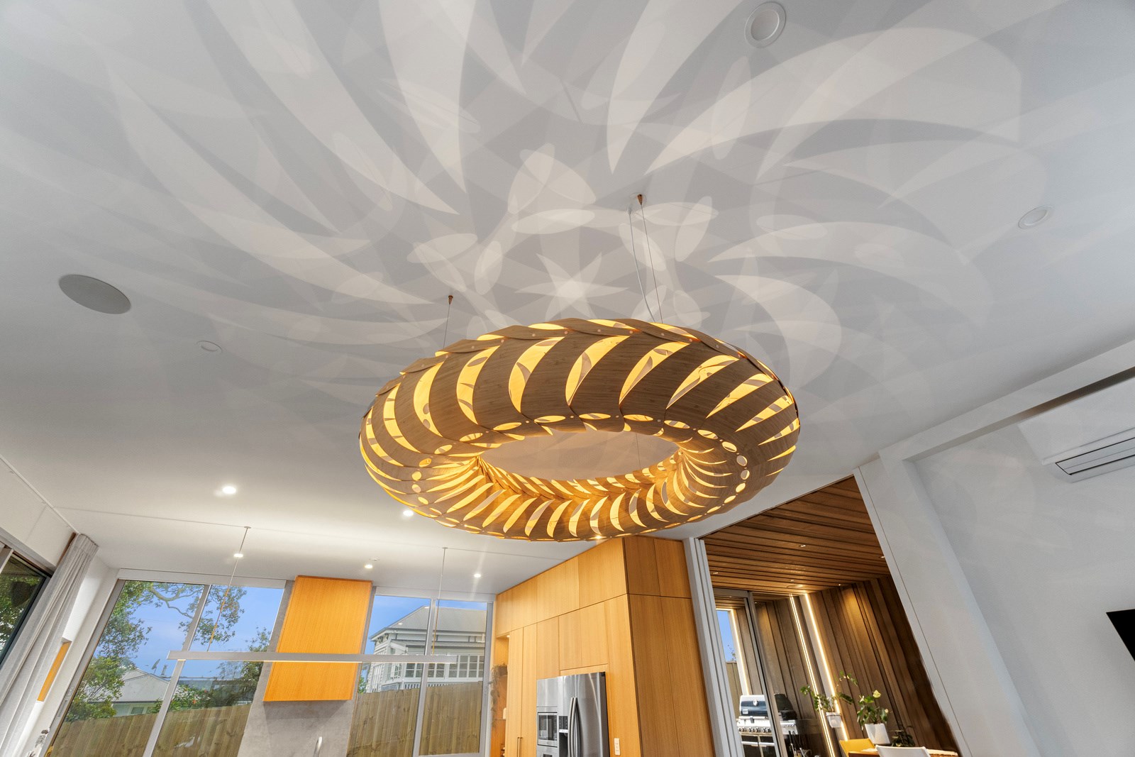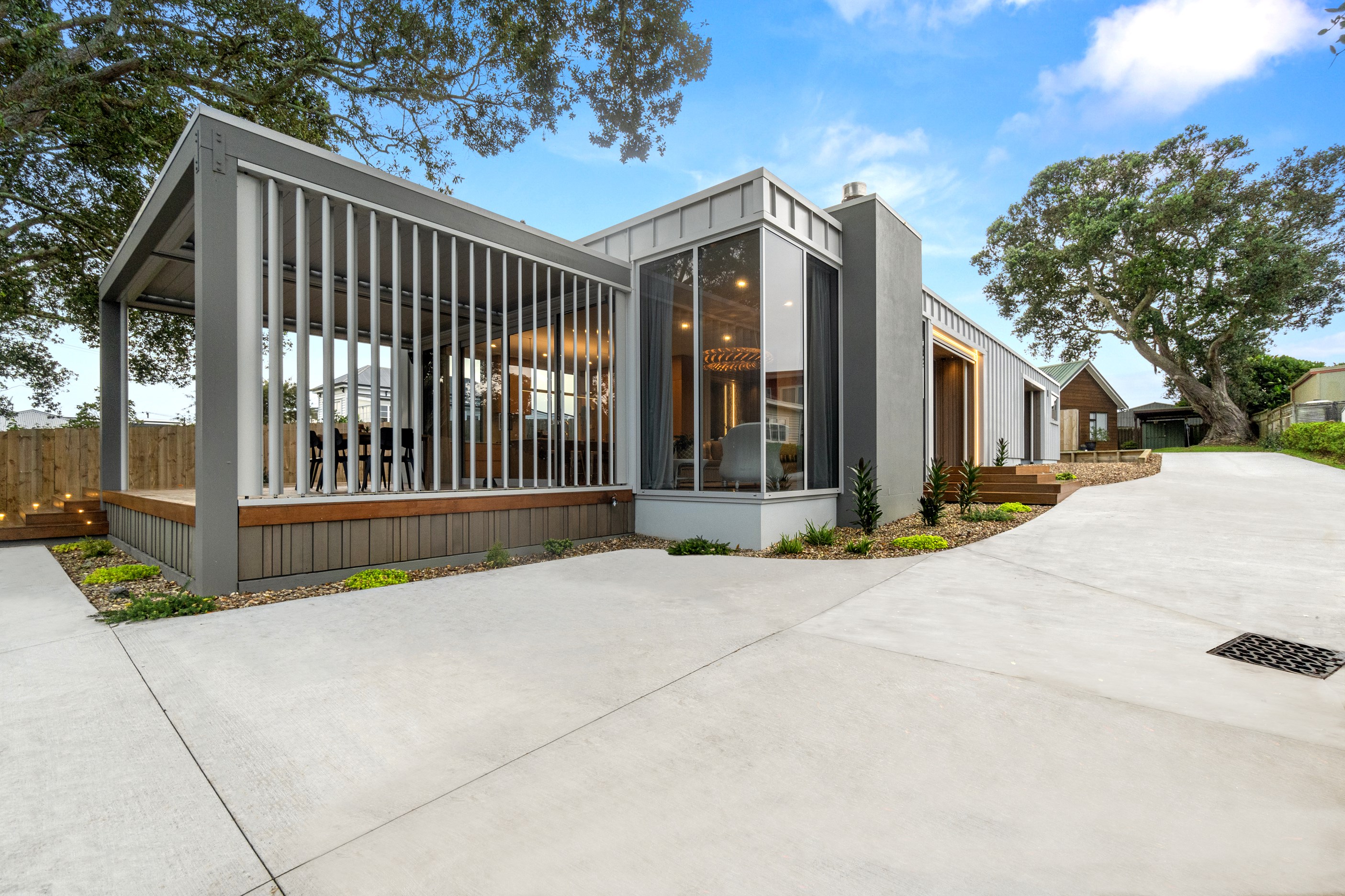 Home is where the heart is, and this one — sitting prettily under two old pŌhutukawa trees overlooking Raglan Harbour — is a perfect picture of just that. Built to replace the original and faded family bach, the compact three-bedroom, two-bathroom, two-living room newcomer makes astute use of the space available in its 173sqm footprint. Constructed over three levels, with engineered block foundations, it’s an all-weather address lending a gallery-like appeal. Connecting decks protect from both wind and sun, while a covered outdoor area with louvre roof and walls leads to the kitchen and living area. Inside or out, it’s a delight to behold. Heated, polished coloured-concrete floors with plywood and cedar walls predominate indoors and frame additional touches. These include a feature halo light fitting that throws a dreamy, star-studded reflection on the ceiling. A solid plaster fireplace over aerated stone makes it all the better for lighting up some timber logs to keep this home cosy on cold winter nights. And when the world-famous Raglan surf’s up, there’s a place to clean up afterwards right at the back door. An exterior shower washes away any wayward black sand.