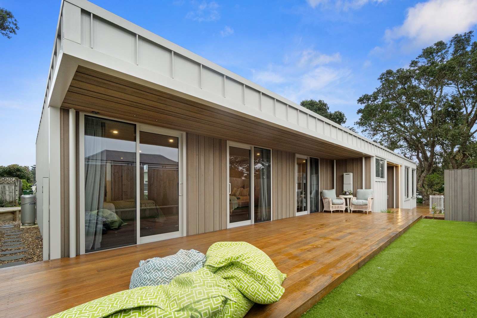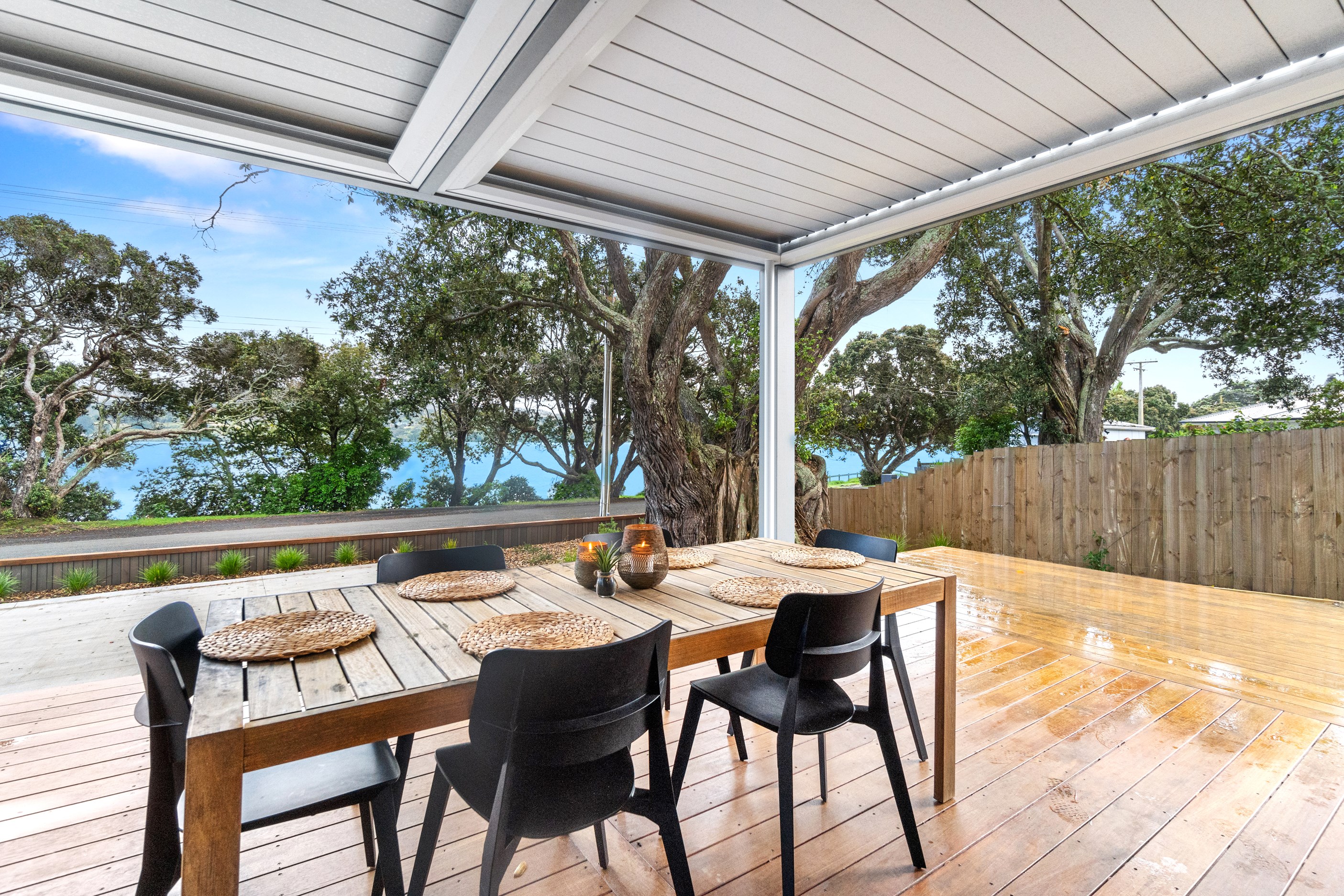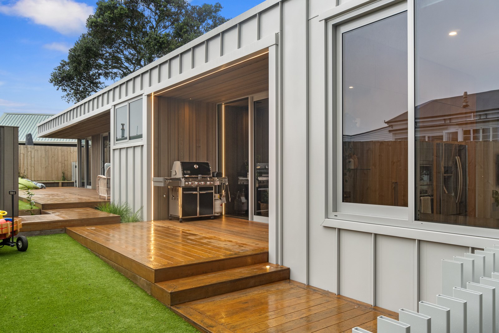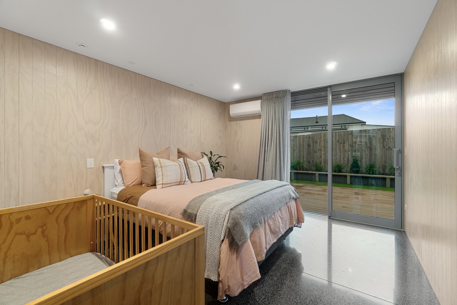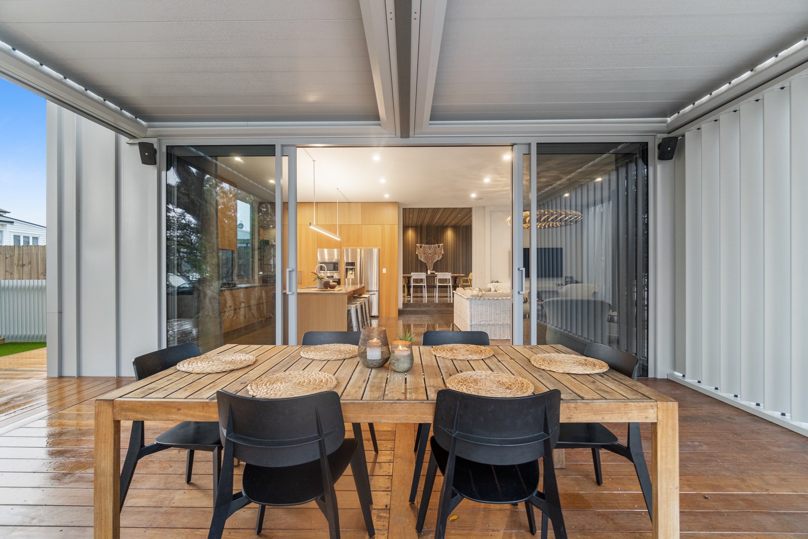 Home is where the heart is, and this one — sitting prettily under two old pŌhutukawa trees overlooking Raglan Harbour — is a perfect picture of just that. Built to replace the original and faded family bach, the compact three-bedroom, two-bathroom, two-living room newcomer makes astute use of the space available in its 173sqm footprint. Constructed over three levels, with engineered block foundations, it’s an all-weather address lending a gallery-like appeal. Connecting decks protect from both wind and sun, while a covered outdoor area with louvre roof and walls leads to the kitchen and living area. Inside or out, it’s a delight to behold. Heated, polished coloured-concrete floors with plywood and cedar walls predominate indoors and frame additional touches. These include a feature halo light fitting that throws a dreamy, star-studded reflection on the ceiling. A solid plaster fireplace over aerated stone makes it all the better for lighting up some timber logs to keep this home cosy on cold winter nights. And when the world-famous Raglan surf’s up, there’s a place to clean up afterwards right at the back door. An exterior shower washes away any wayward black sand.