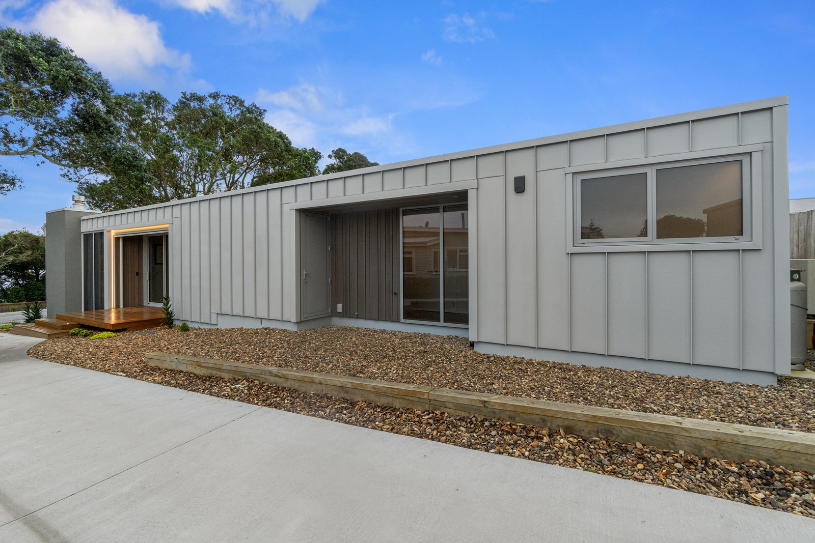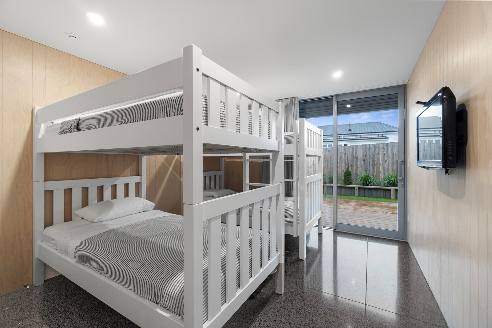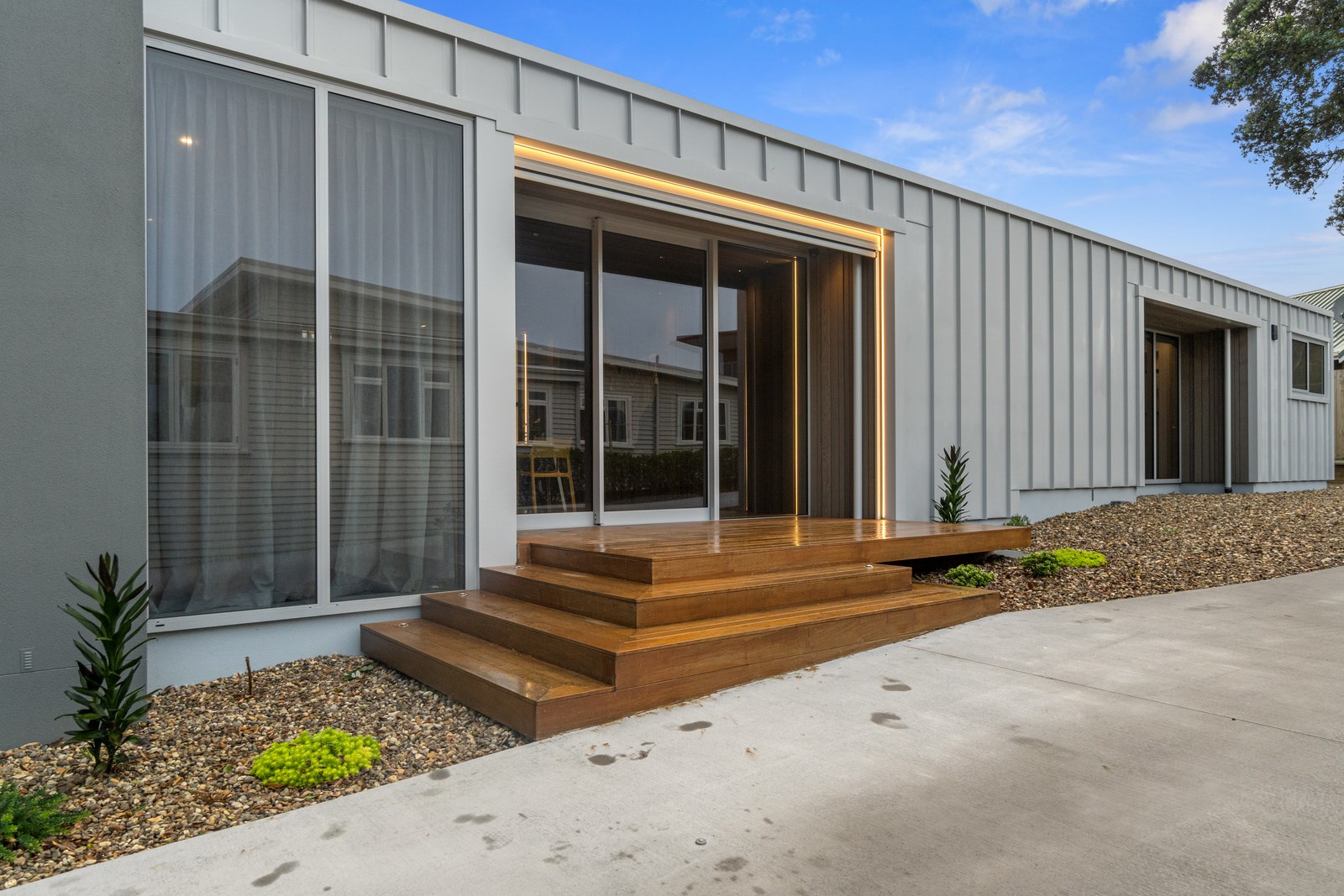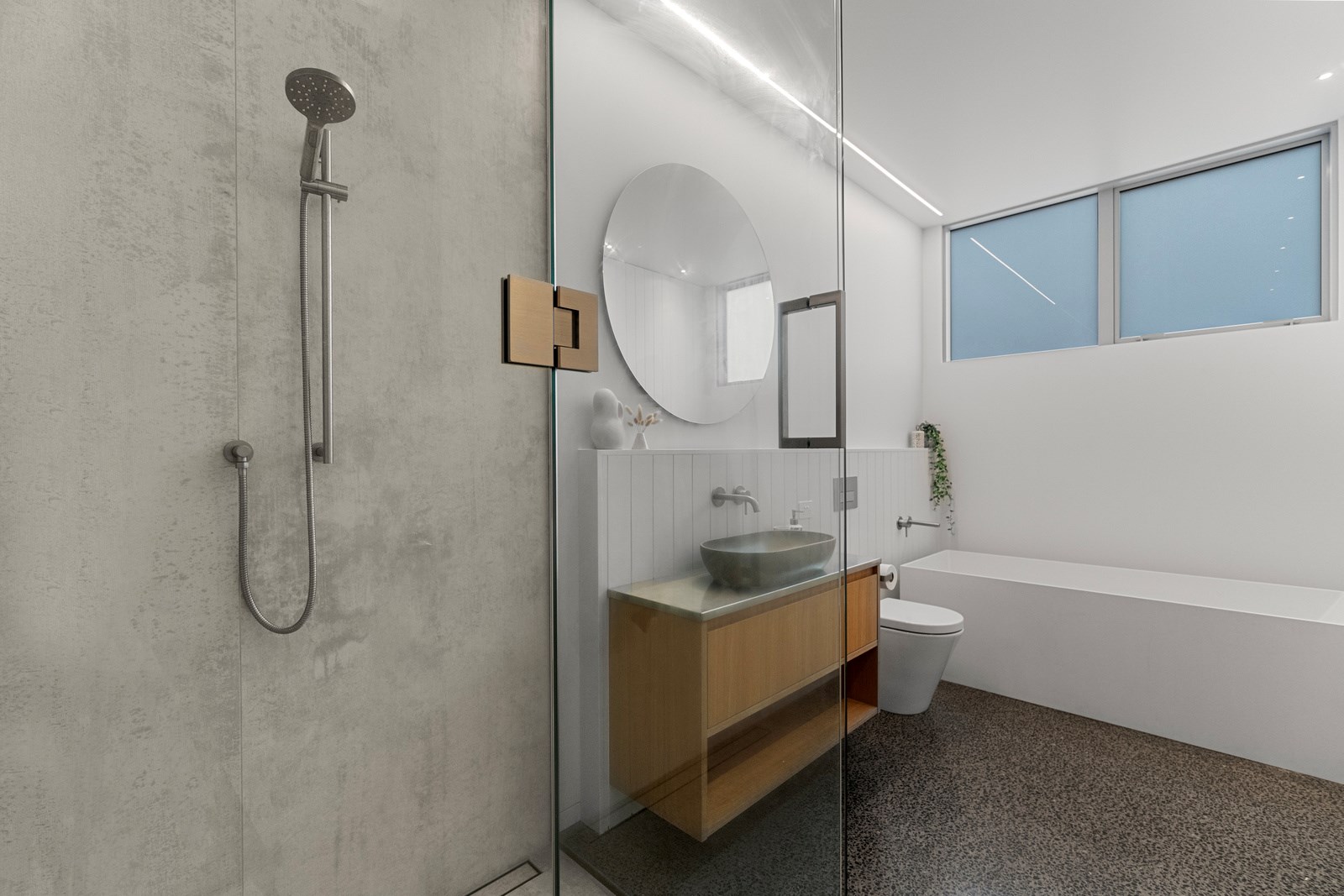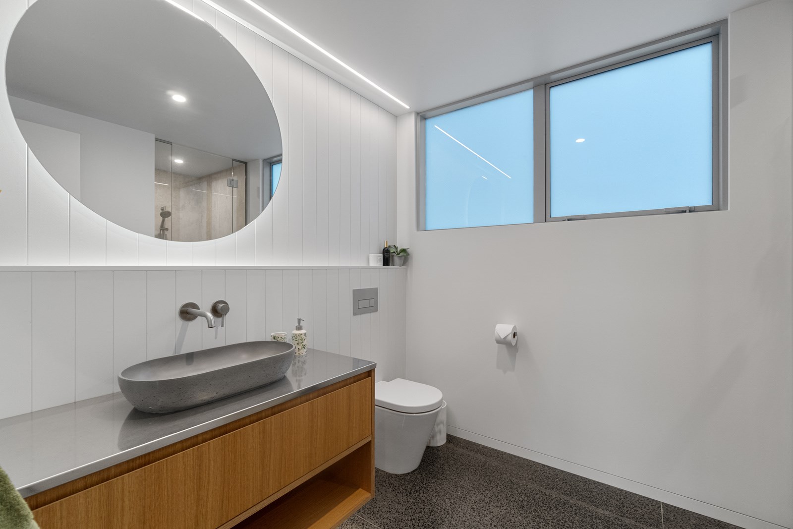 Home is where the heart is, and this one — sitting prettily under two old pŌhutukawa trees overlooking Raglan Harbour — is a perfect picture of just that. Built to replace the original and faded family bach, the compact three-bedroom, two-bathroom, two-living room newcomer makes astute use of the space available in its 173sqm footprint. Constructed over three levels, with engineered block foundations, it’s an all-weather address lending a gallery-like appeal. Connecting decks protect from both wind and sun, while a covered outdoor area with louvre roof and walls leads to the kitchen and living area. Inside or out, it’s a delight to behold. Heated, polished coloured-concrete floors with plywood and cedar walls predominate indoors and frame additional touches. These include a feature halo light fitting that throws a dreamy, star-studded reflection on the ceiling. A solid plaster fireplace over aerated stone makes it all the better for lighting up some timber logs to keep this home cosy on cold winter nights. And when the world-famous Raglan surf’s up, there’s a place to clean up afterwards right at the back door. An exterior shower washes away any wayward black sand.