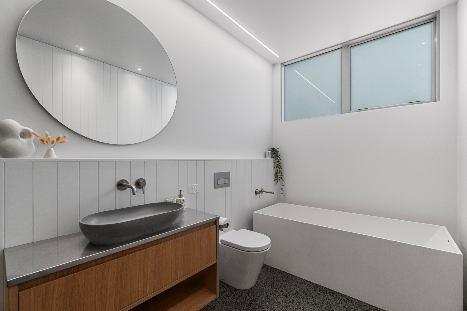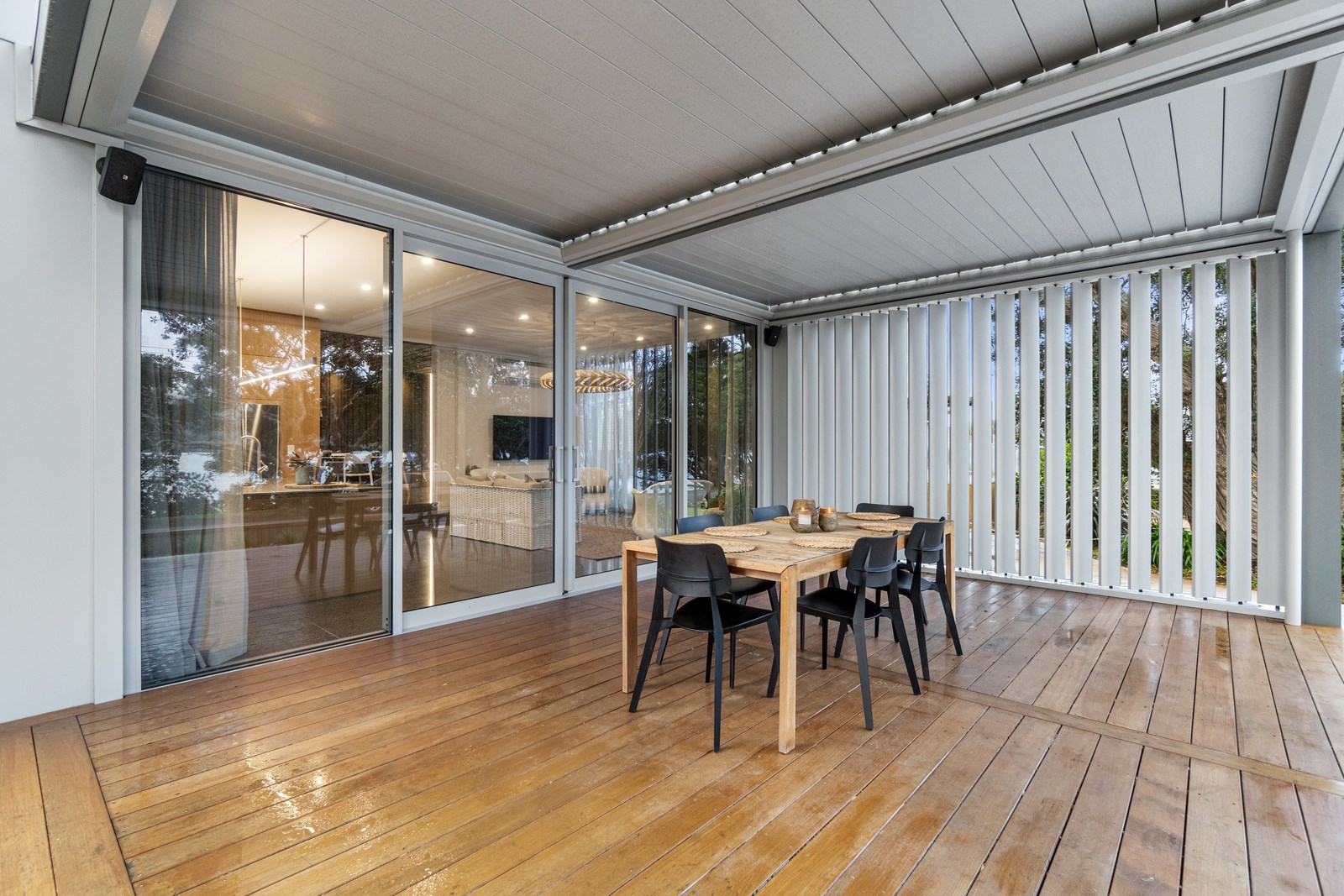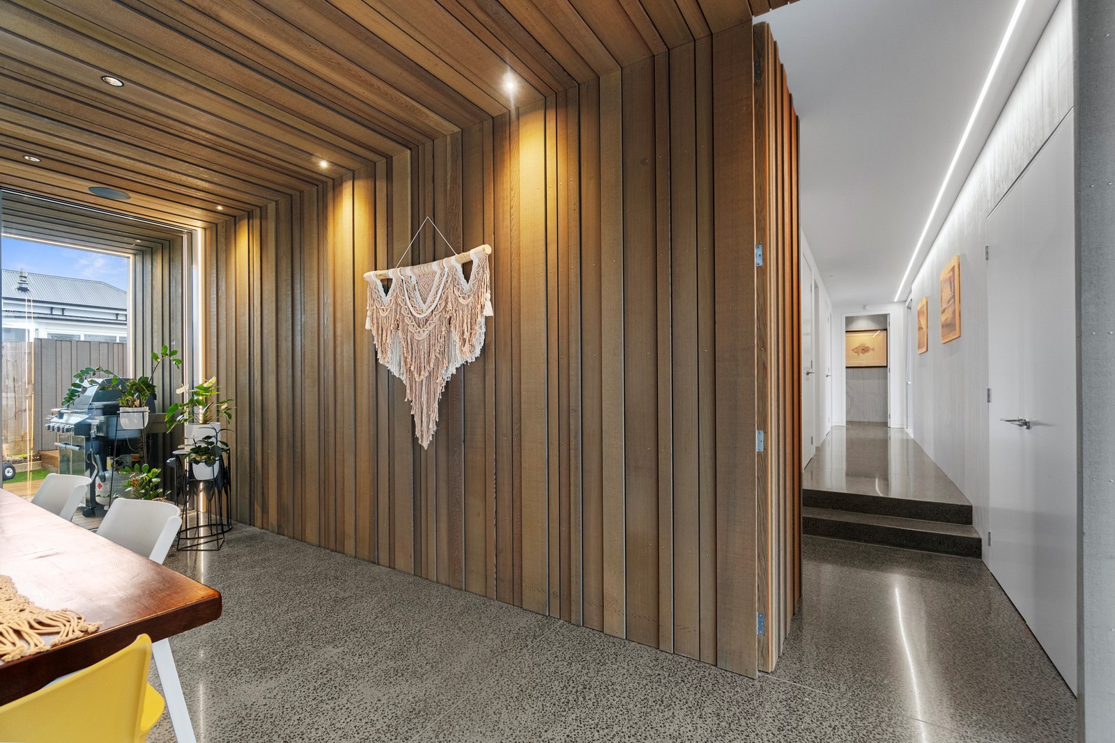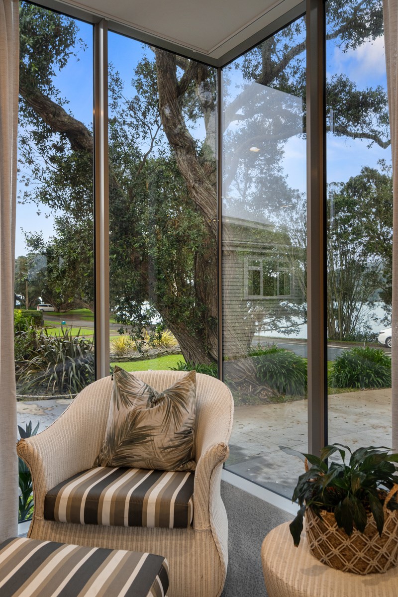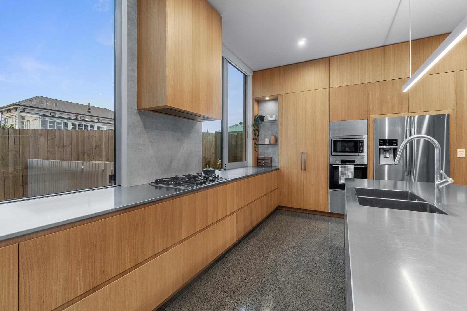 Home is where the heart is, and this one — sitting prettily under two old pŌhutukawa trees overlooking Raglan Harbour — is a perfect picture of just that. Built to replace the original and faded family bach, the compact three-bedroom, two-bathroom, two-living room newcomer makes astute use of the space available in its 173sqm footprint. Constructed over three levels, with engineered block foundations, it’s an all-weather address lending a gallery-like appeal. Connecting decks protect from both wind and sun, while a covered outdoor area with louvre roof and walls leads to the kitchen and living area. Inside or out, it’s a delight to behold. Heated, polished coloured-concrete floors with plywood and cedar walls predominate indoors and frame additional touches. These include a feature halo light fitting that throws a dreamy, star-studded reflection on the ceiling. A solid plaster fireplace over aerated stone makes it all the better for lighting up some timber logs to keep this home cosy on cold winter nights. And when the world-famous Raglan surf’s up, there’s a place to clean up afterwards right at the back door. An exterior shower washes away any wayward black sand.