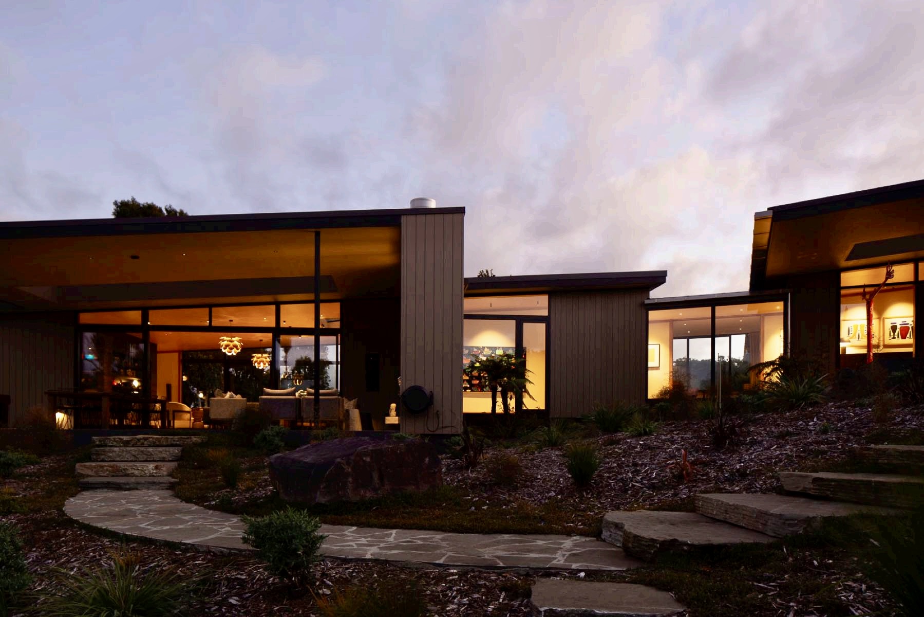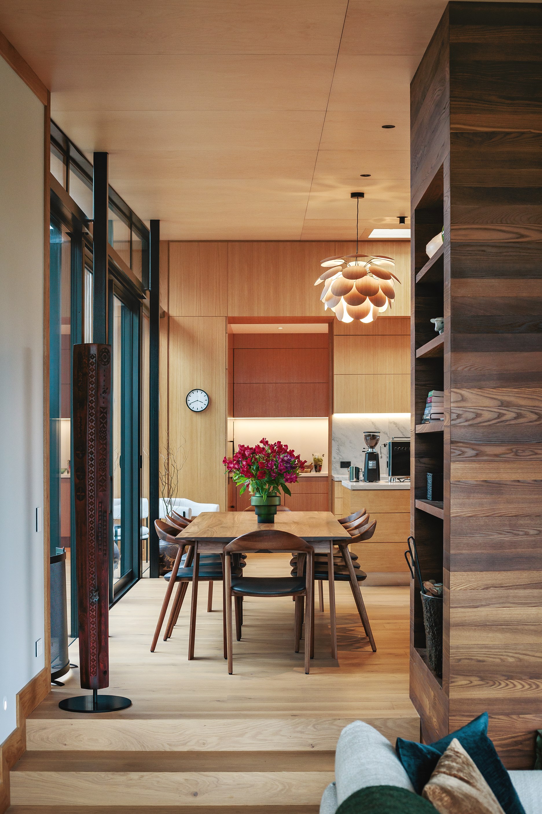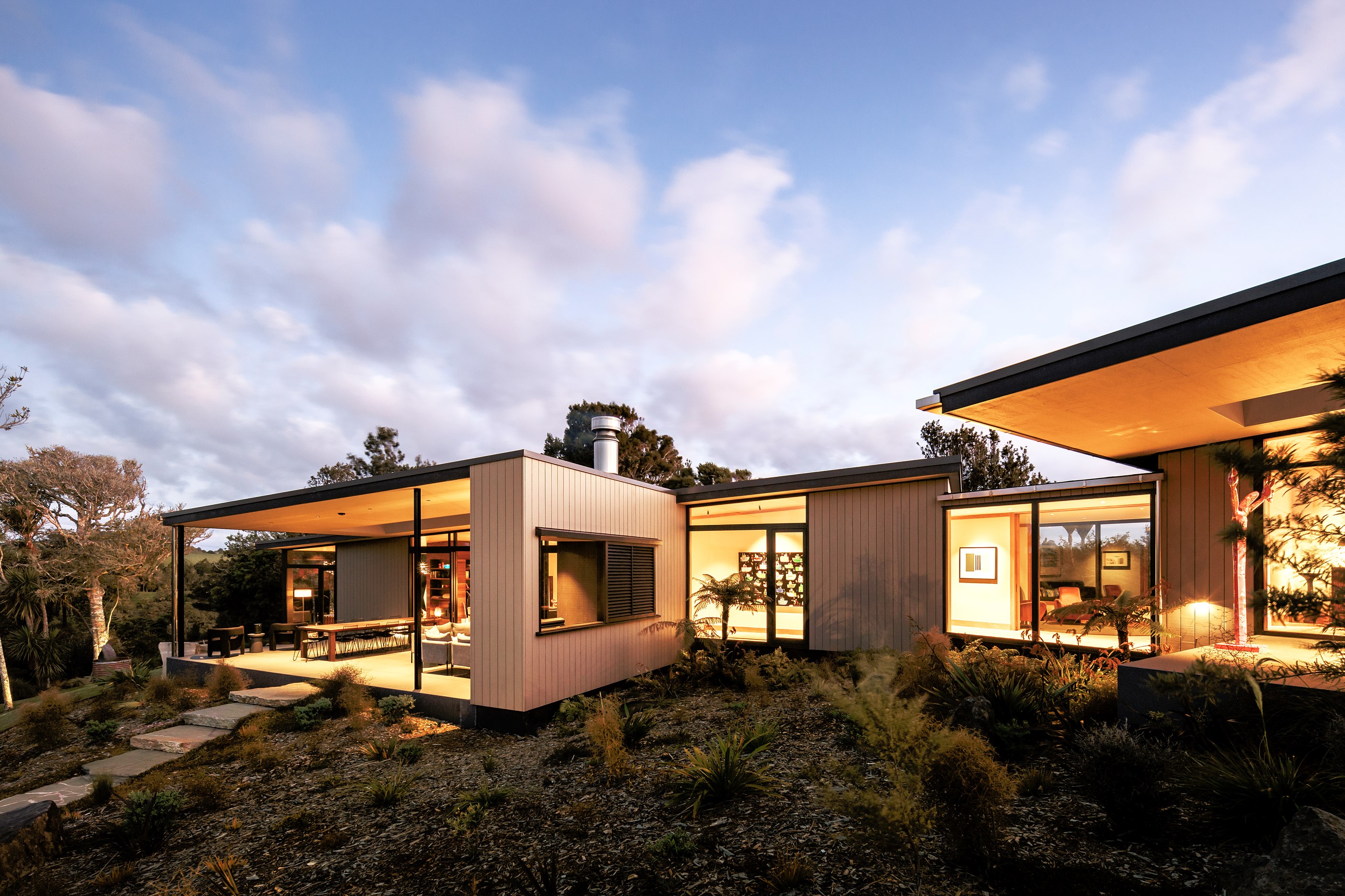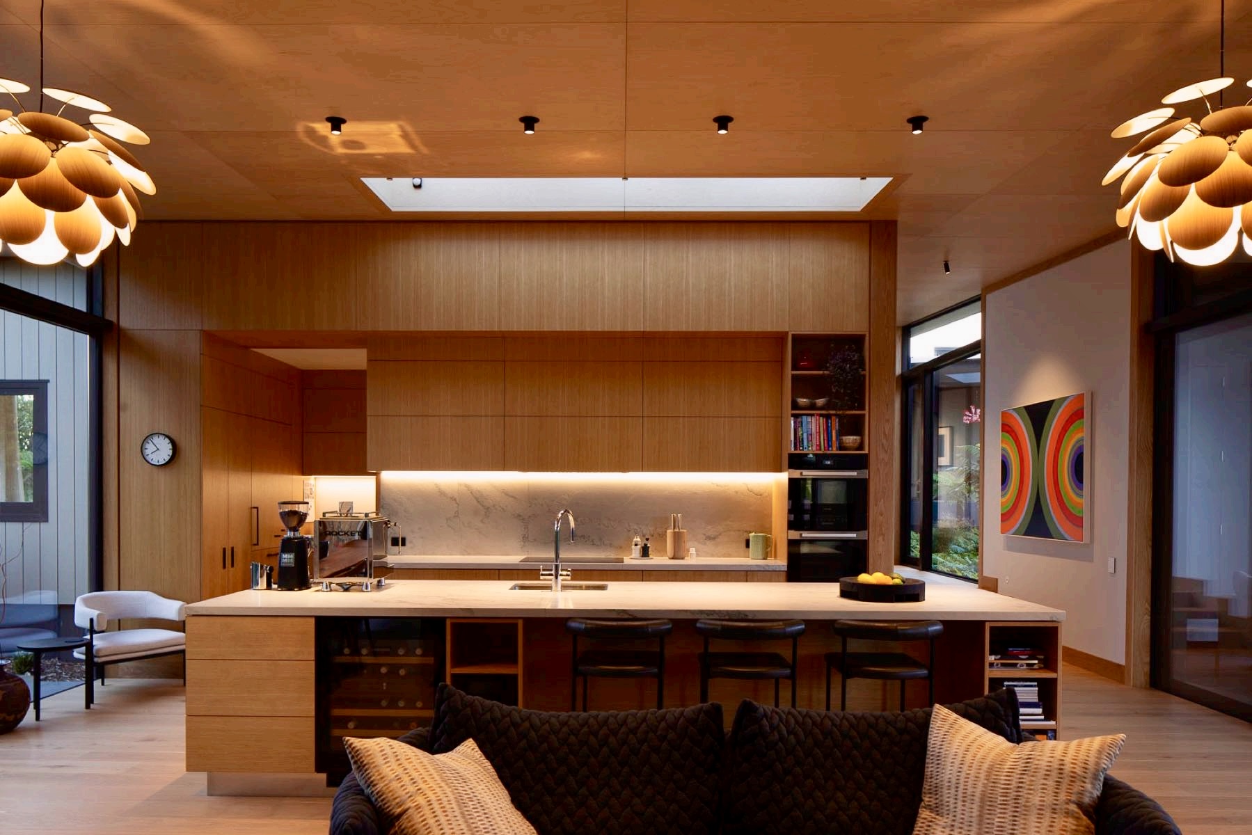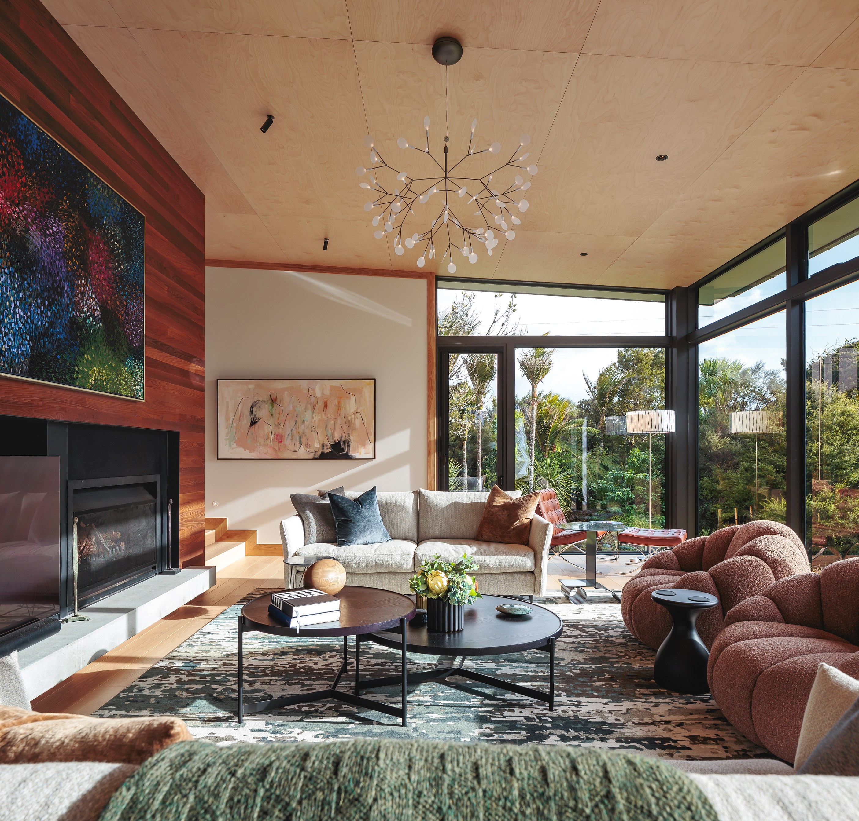 If ever a luxury home showcases the skills of builders at the top of their game, this is it. Hayes Building delivered a large project – 466sqm of floorplan and 700sqm of roofing – and an extremely complex one for its owners. The five-bedroom home, for instance, steps down no fewer than seven levels on its sloping site. Yet, thanks to meticulously installed cedar cladding, it blends into its sensitive environment beside kauri forest on Auckland’s rugged west coast. The five-bedroom home was built as family central for semi-retired owners, who wanted guest bedrooms with ensuites and a bunk room for the grandchildren. A