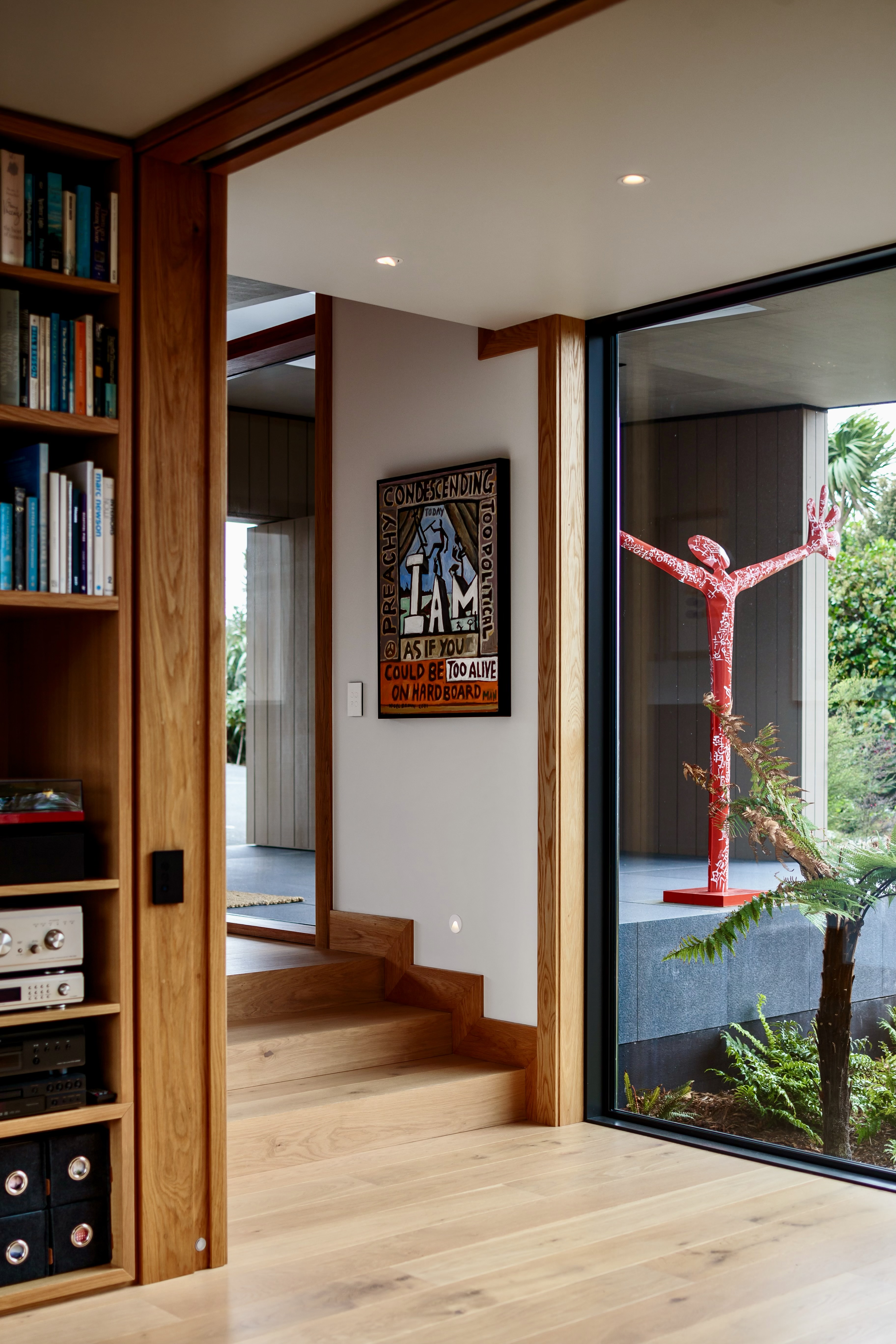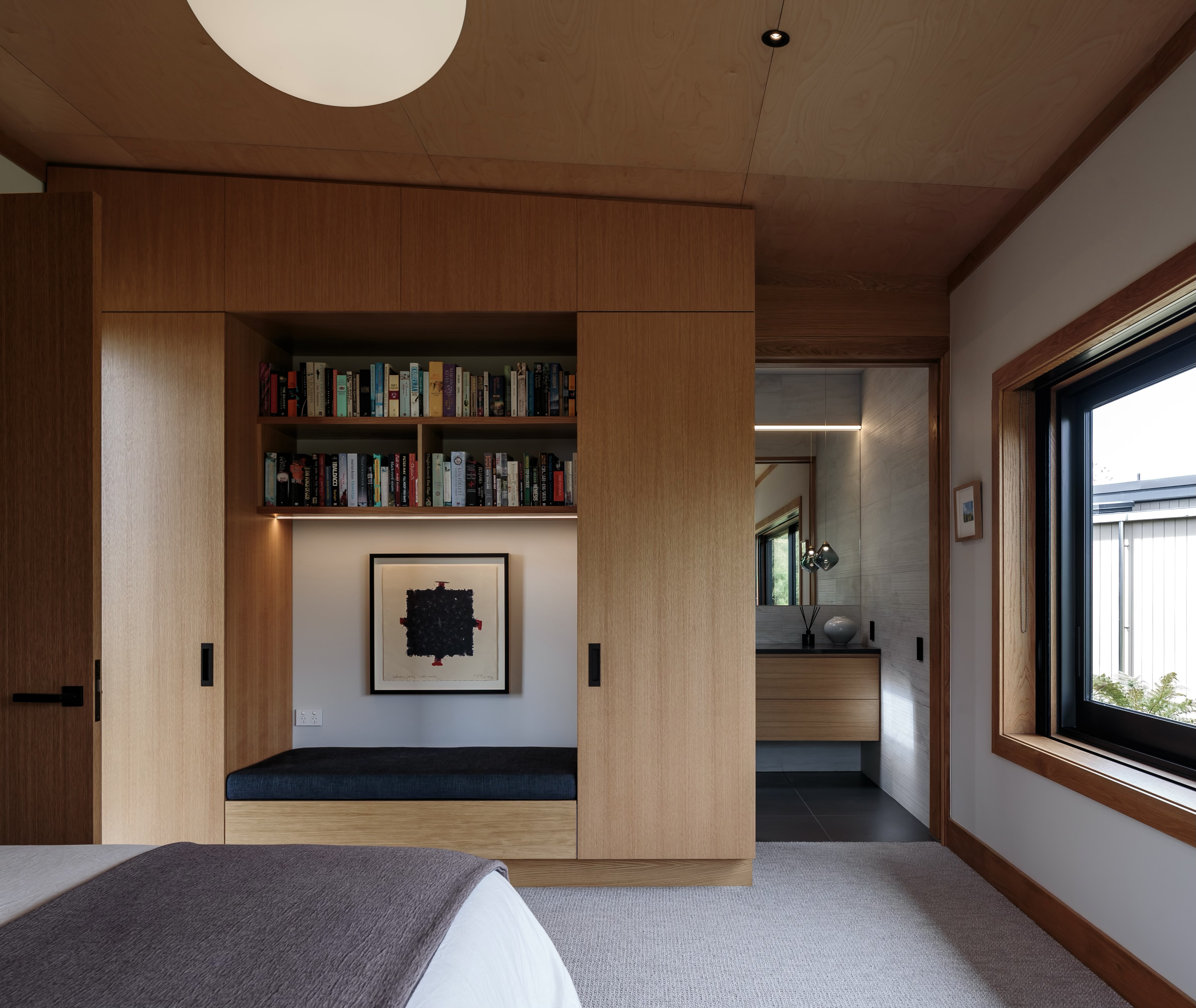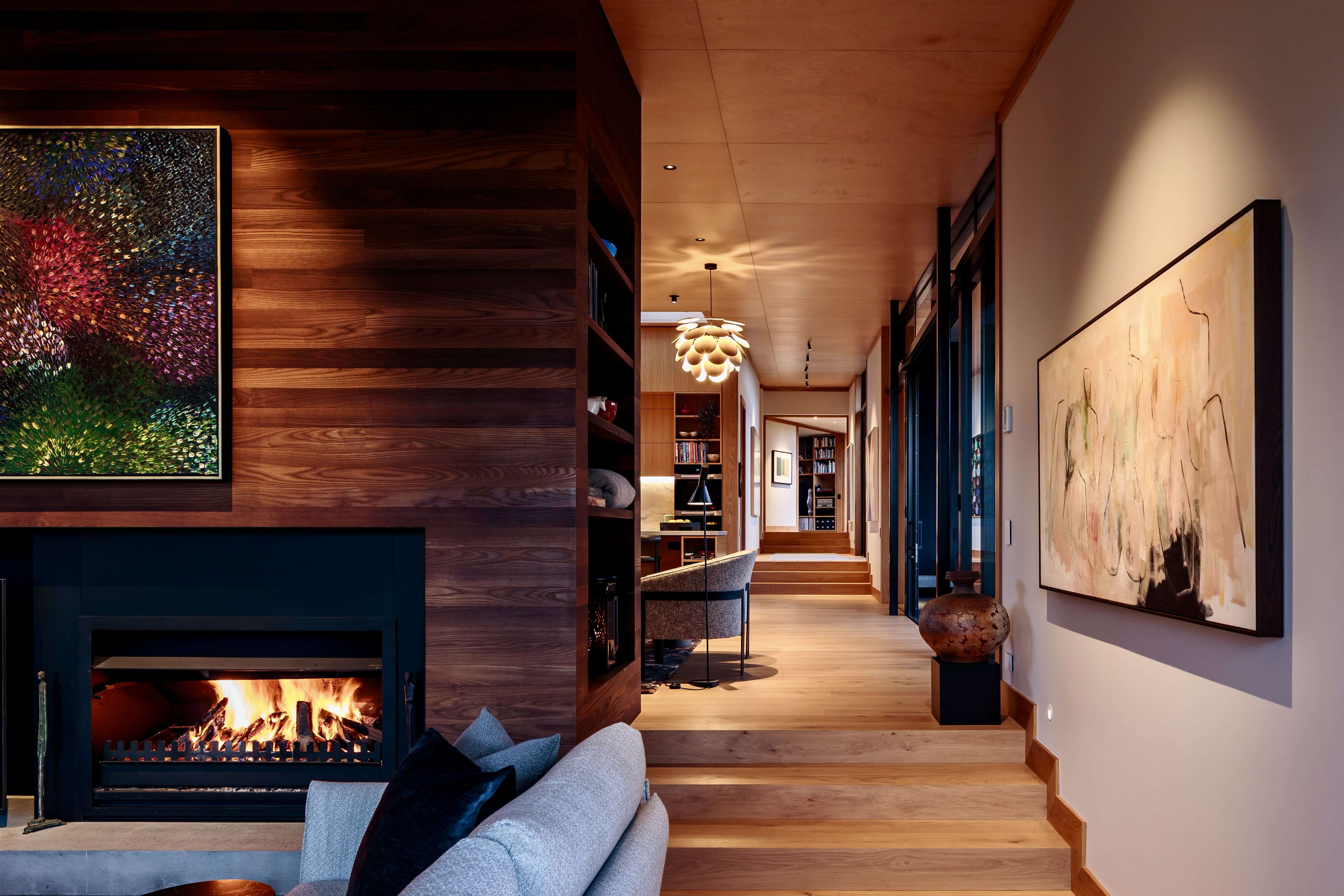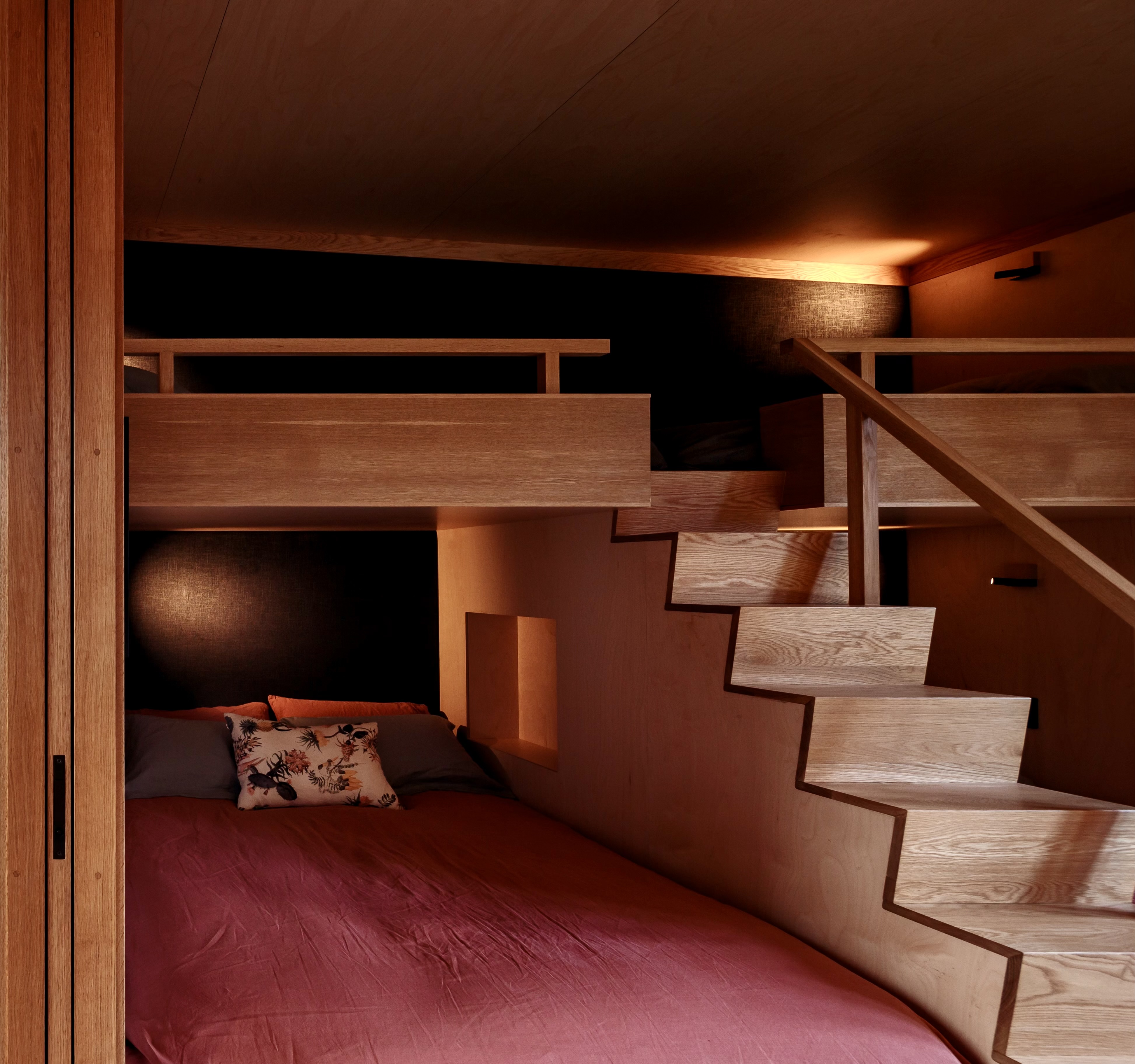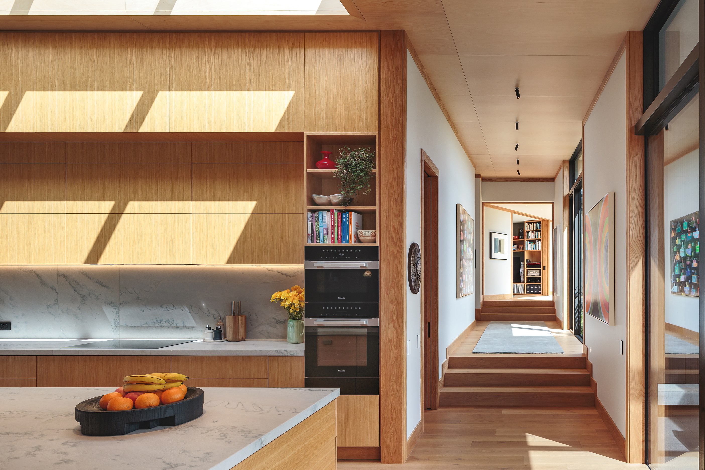 ‘broken’ plan with separate wings on several levels was used to articulate a series of delightful rooms, all with generous gallery spaces. Each room enjoys a different aspect and special views. The configuration also helps with protection from ferocious westerly winds. Sloping ceilings are Birch Elite ply with the scotia, architraves and skirting in American oak. Scrupulous detailing from Mercer and Mercer Architects allowed the builders to focus purely on quality, such as the ash fireplace surround. Craftsmanship from the garage to the sitting room is top notch. The Hayes team has delivered on its promise to produce a finish like no other – humble, honest and full of character arranged in a clean modern way.