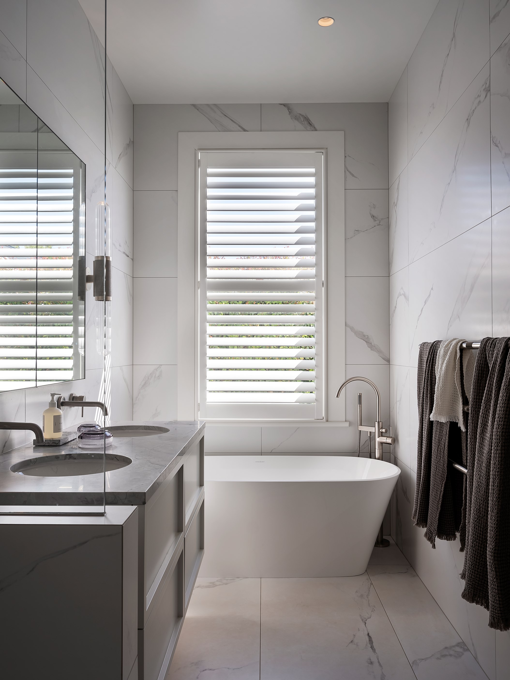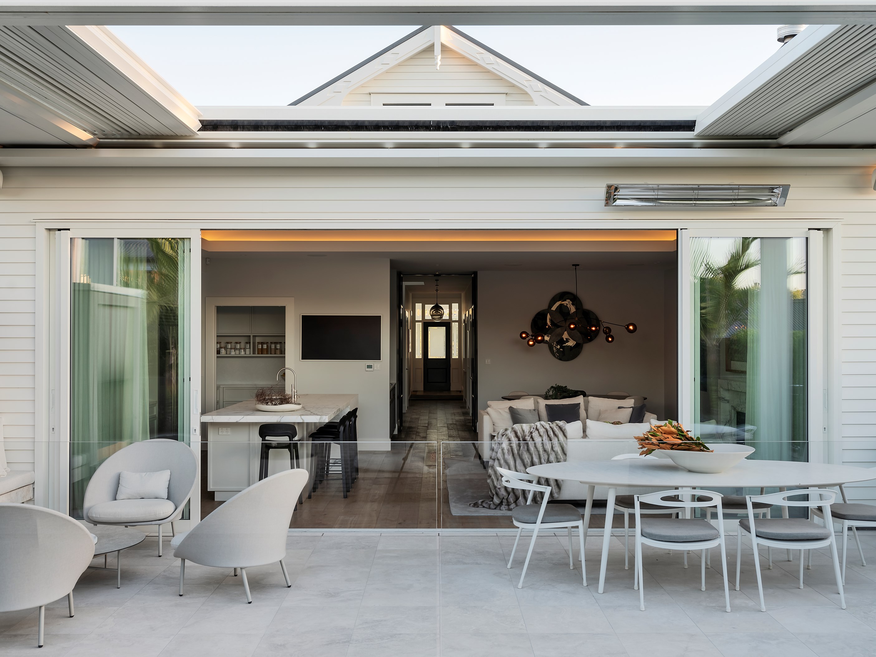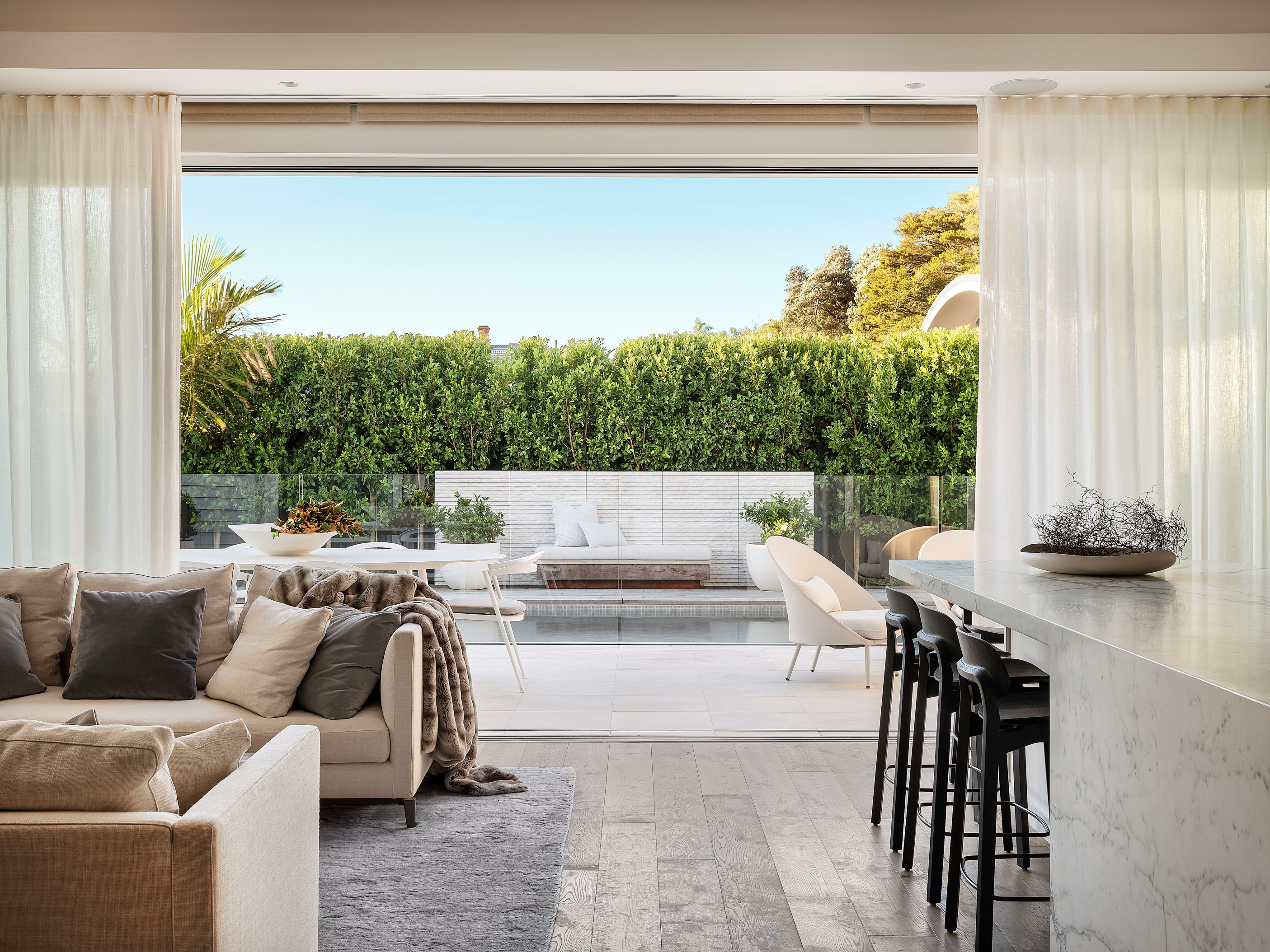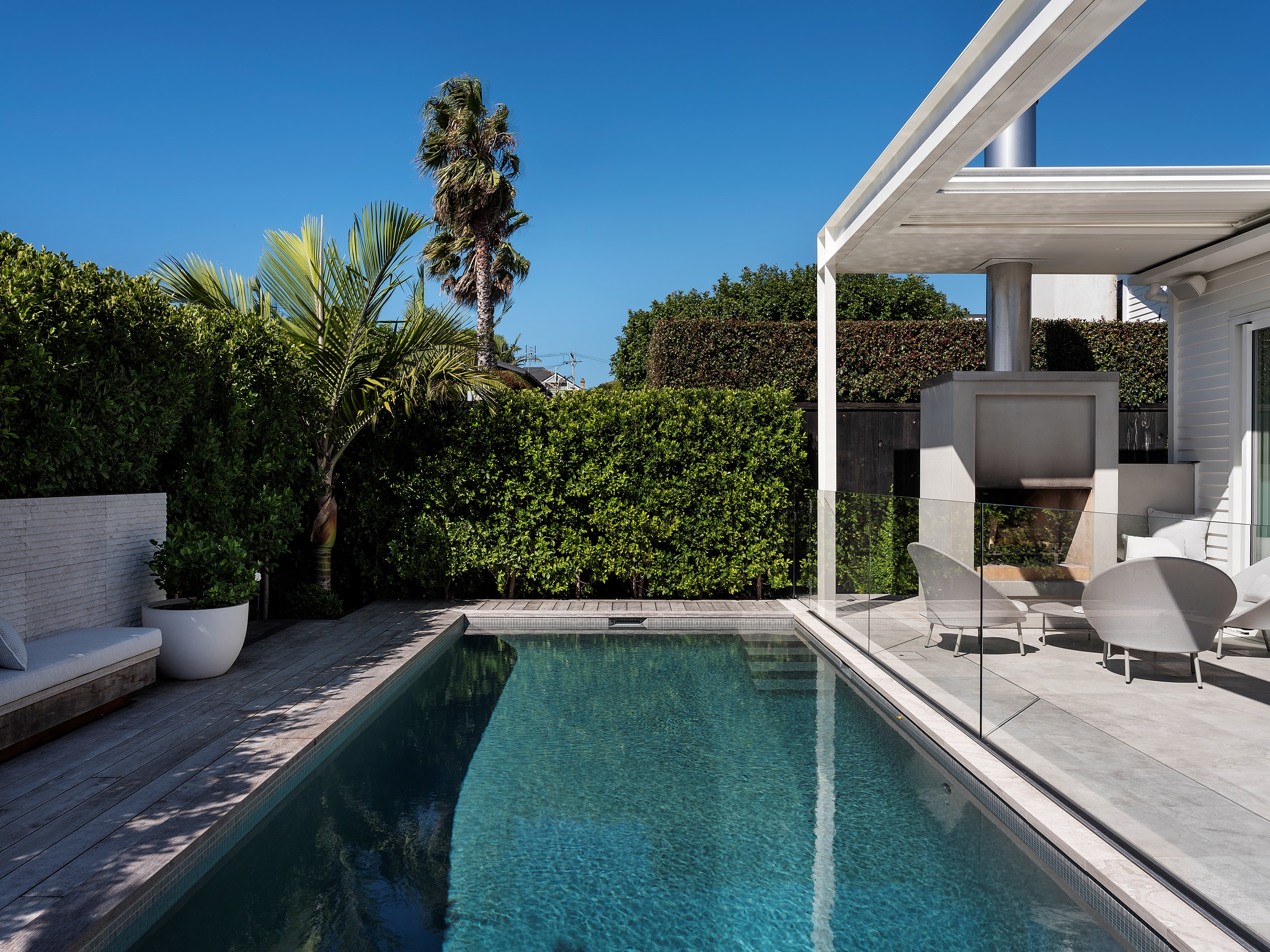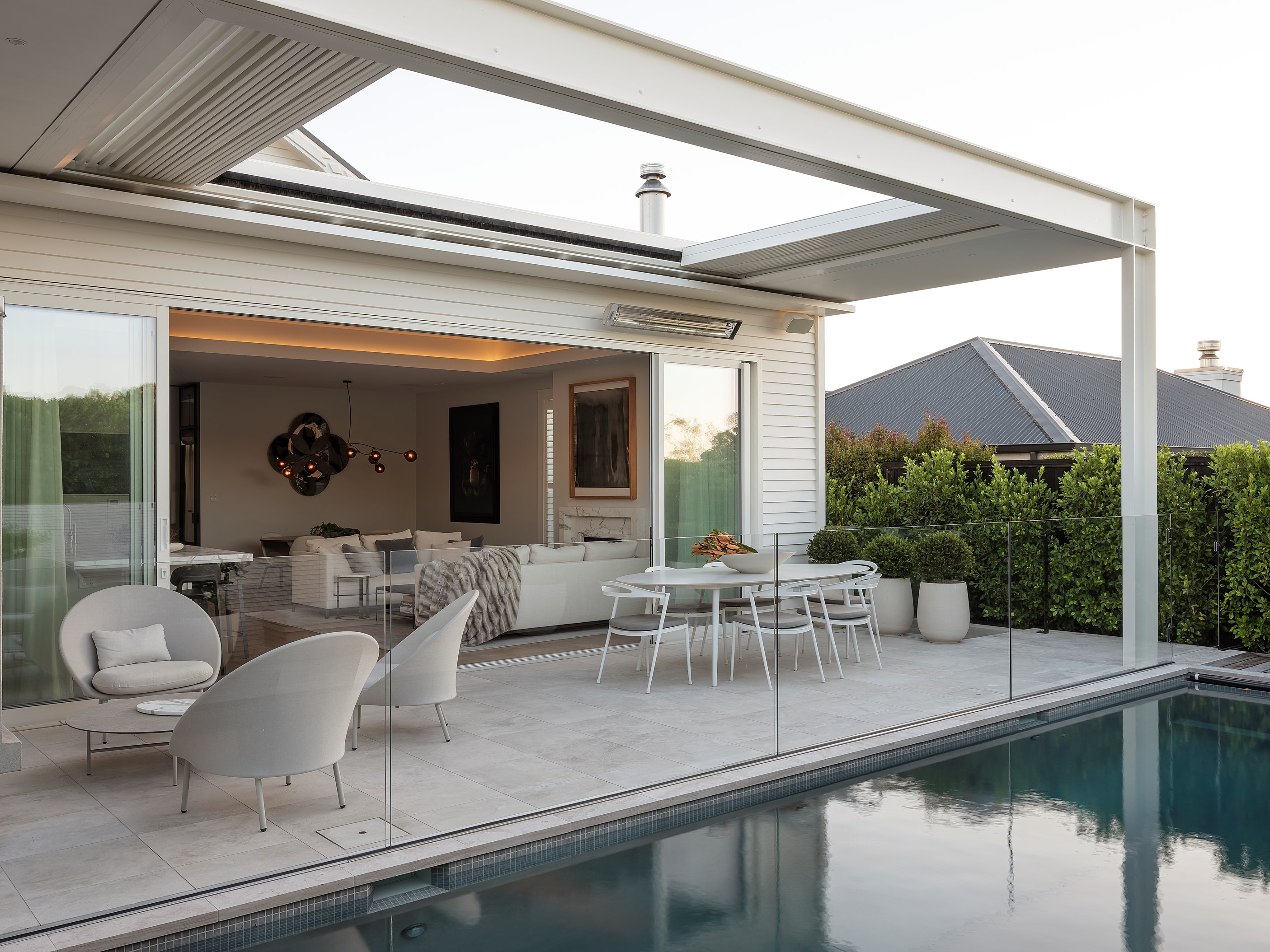 The middle floor, which is at ground level at the back of the section, has three bedrooms, a lounge, family room, laundry, guest powder room and an open-plan living, dining, kitchen zone with scullery. This opens to a covered entertaining area that overlooks the pool. The top floor is within the roof and has been cleverly designed to contain the main bedroom, ensuite and walk-in dressing room. When it came to attention to detail, there was no compromising – and it shows. The slick kitchen and built-in shelving are just a couple of examples. It might look traditional, but the house also has the latest in technology – six separate sound zones and a system which controls lighting, extraction fans, outdoor heaters, the garage door and more.