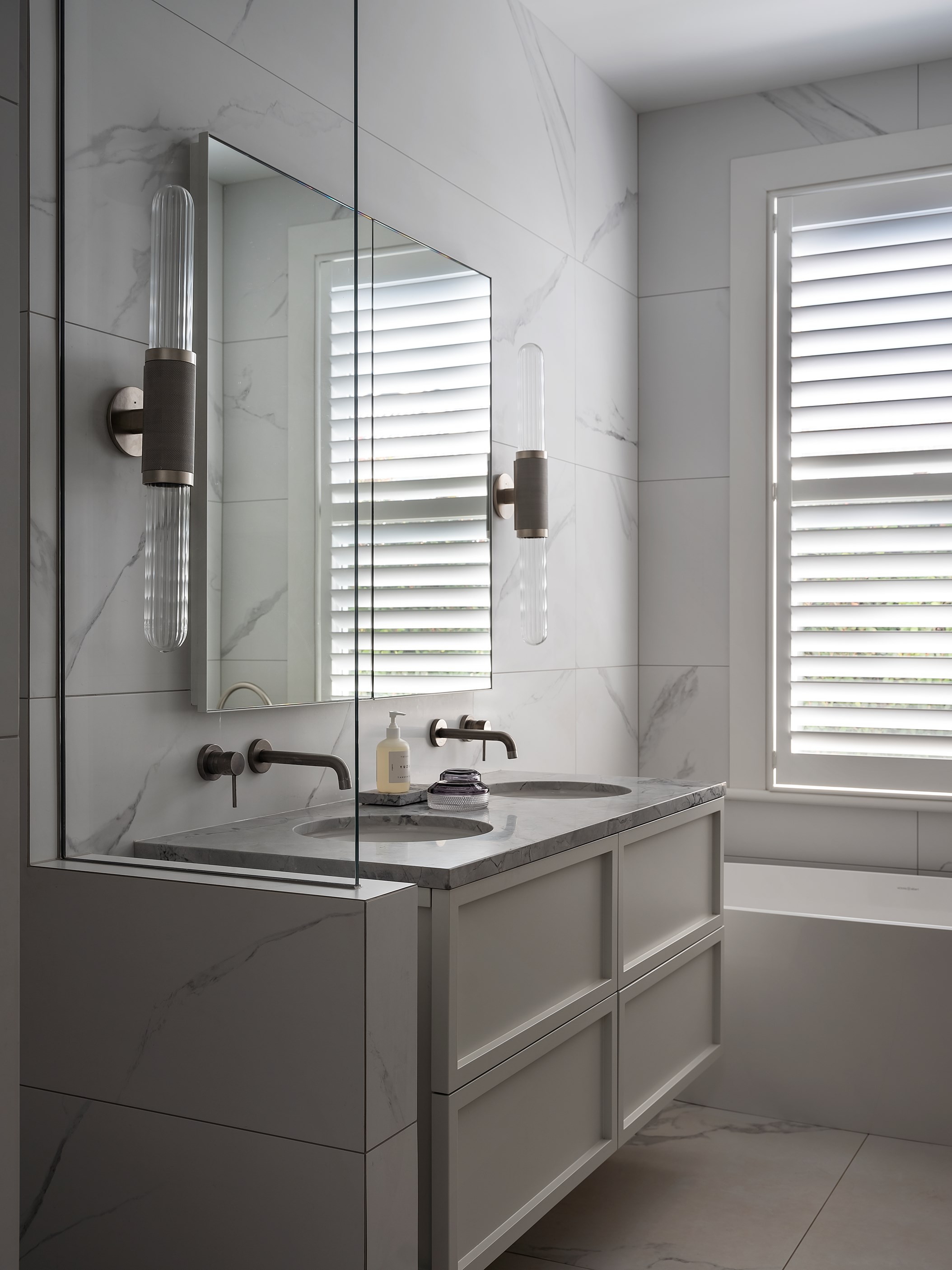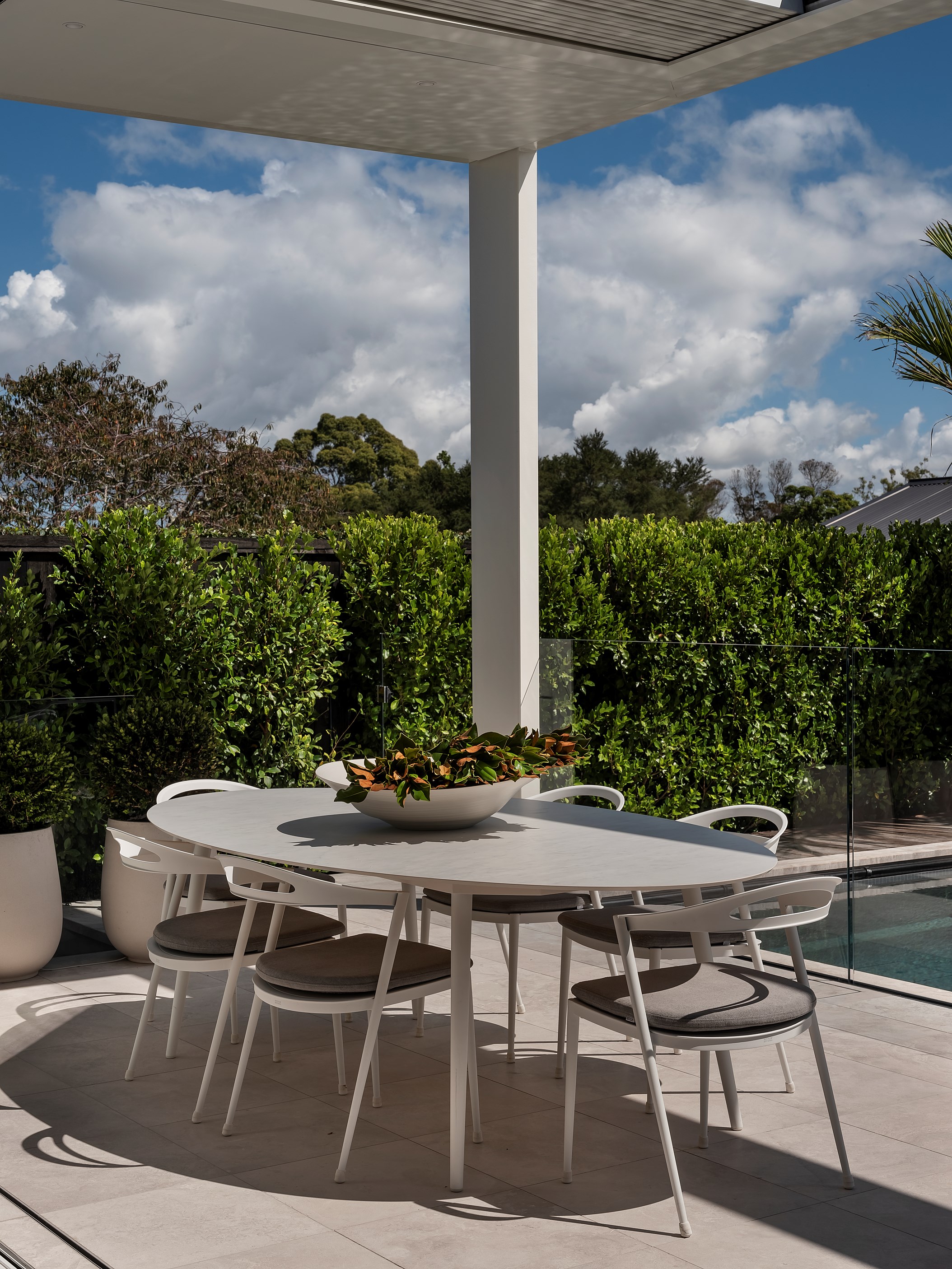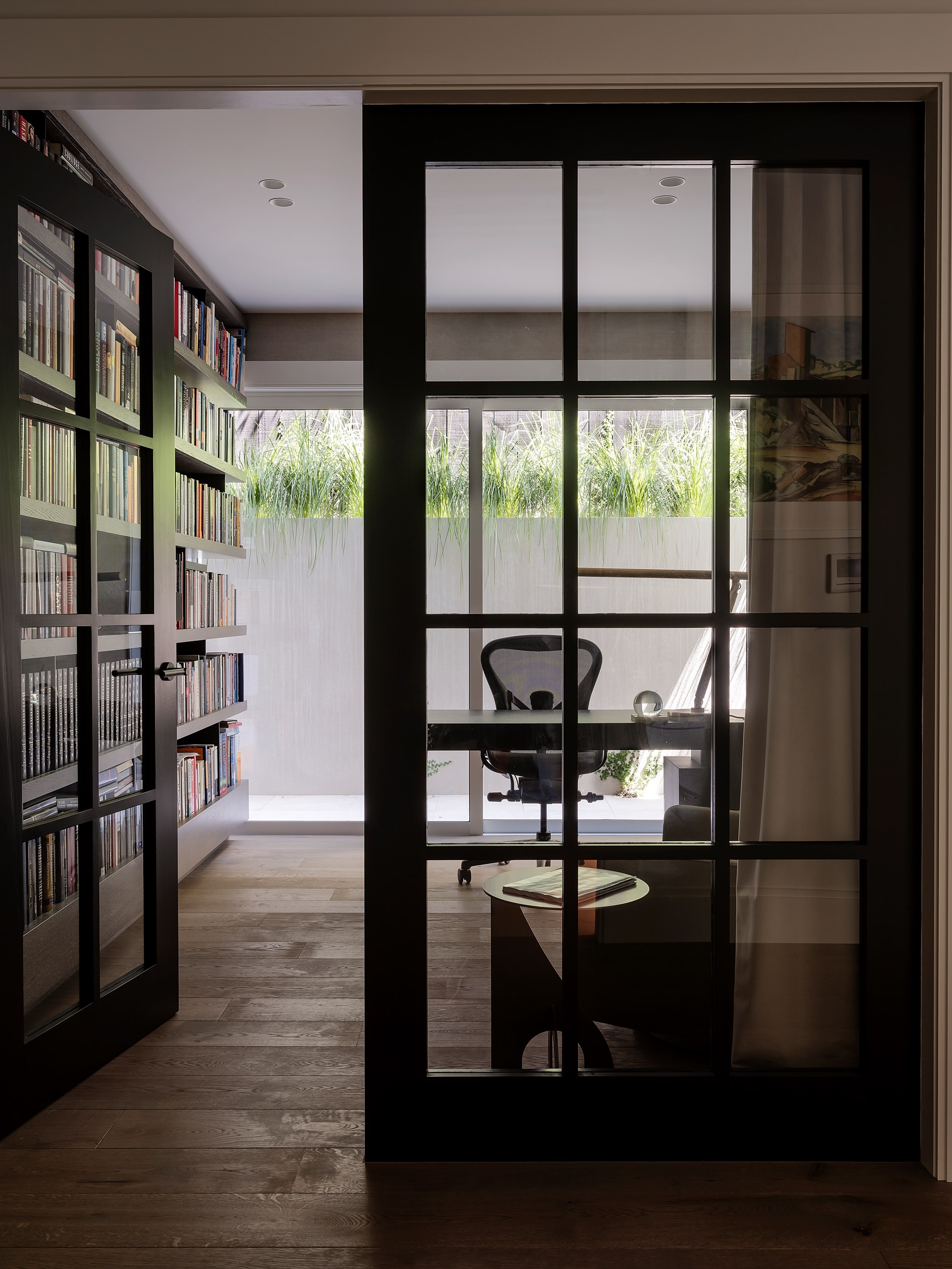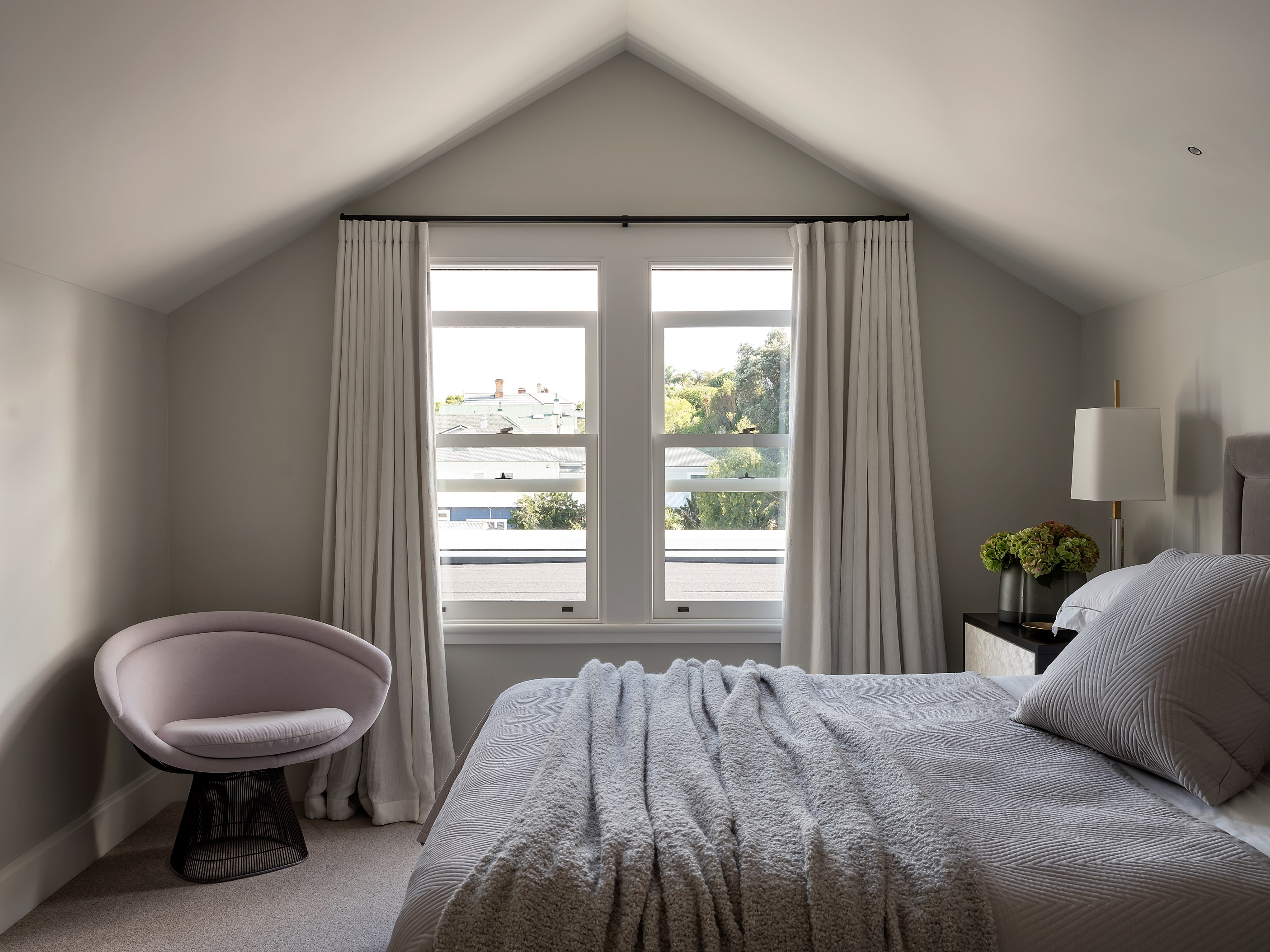 The middle floor, which is at ground level at the back of the section, has three bedrooms, a lounge, family room, laundry, guest powder room and an open-plan living, dining, kitchen zone with scullery. This opens to a covered entertaining area that overlooks the pool. The top floor is within the roof and has been cleverly designed to contain the main bedroom, ensuite and walk-in dressing room. When it came to attention to detail, there was no compromising – and it shows. The slick kitchen and built-in shelving are just a couple of examples. It might look traditional, but the house also has the latest in technology – six separate sound zones and a system which controls lighting, extraction fans, outdoor heaters, the garage door and more.