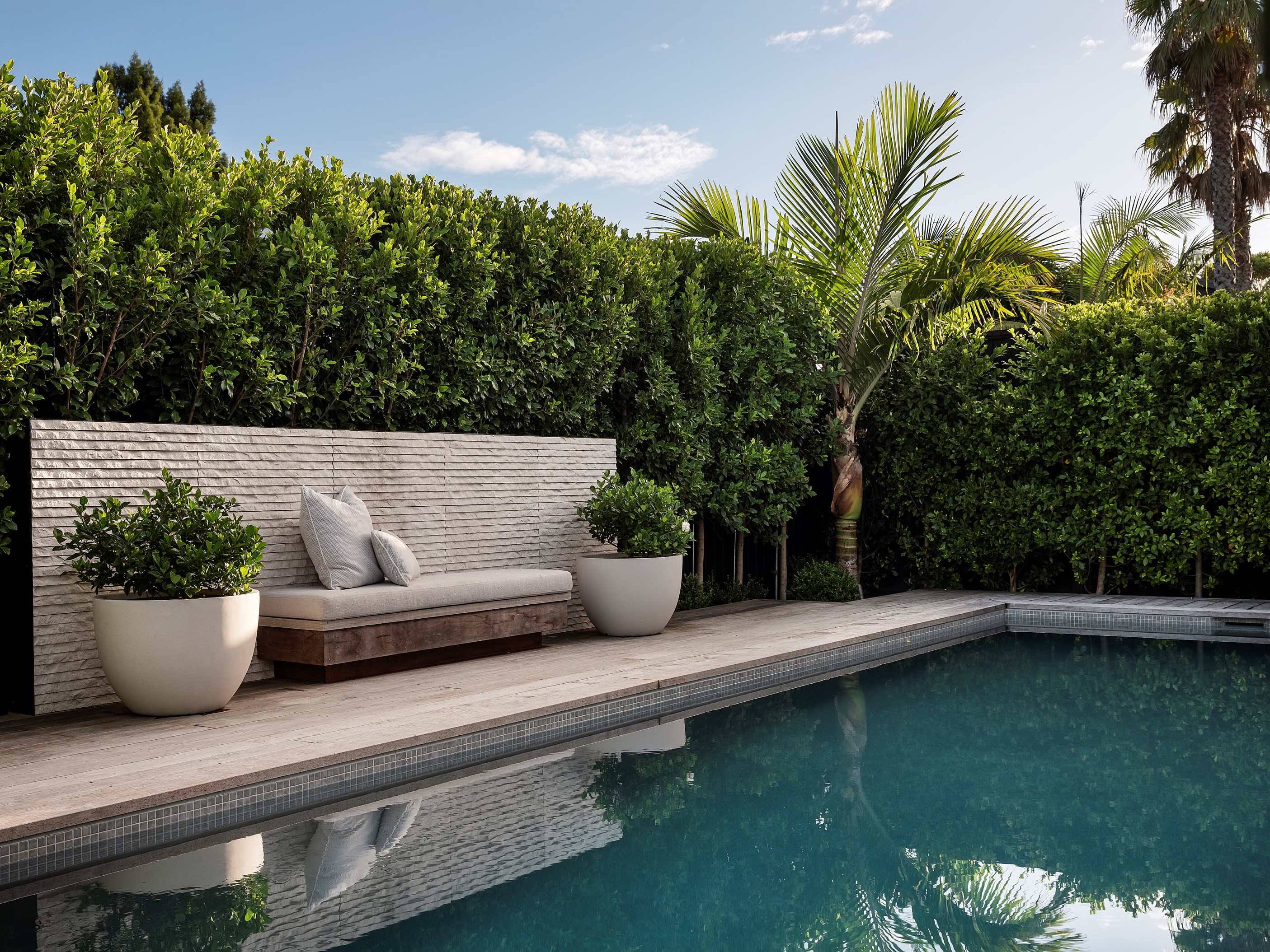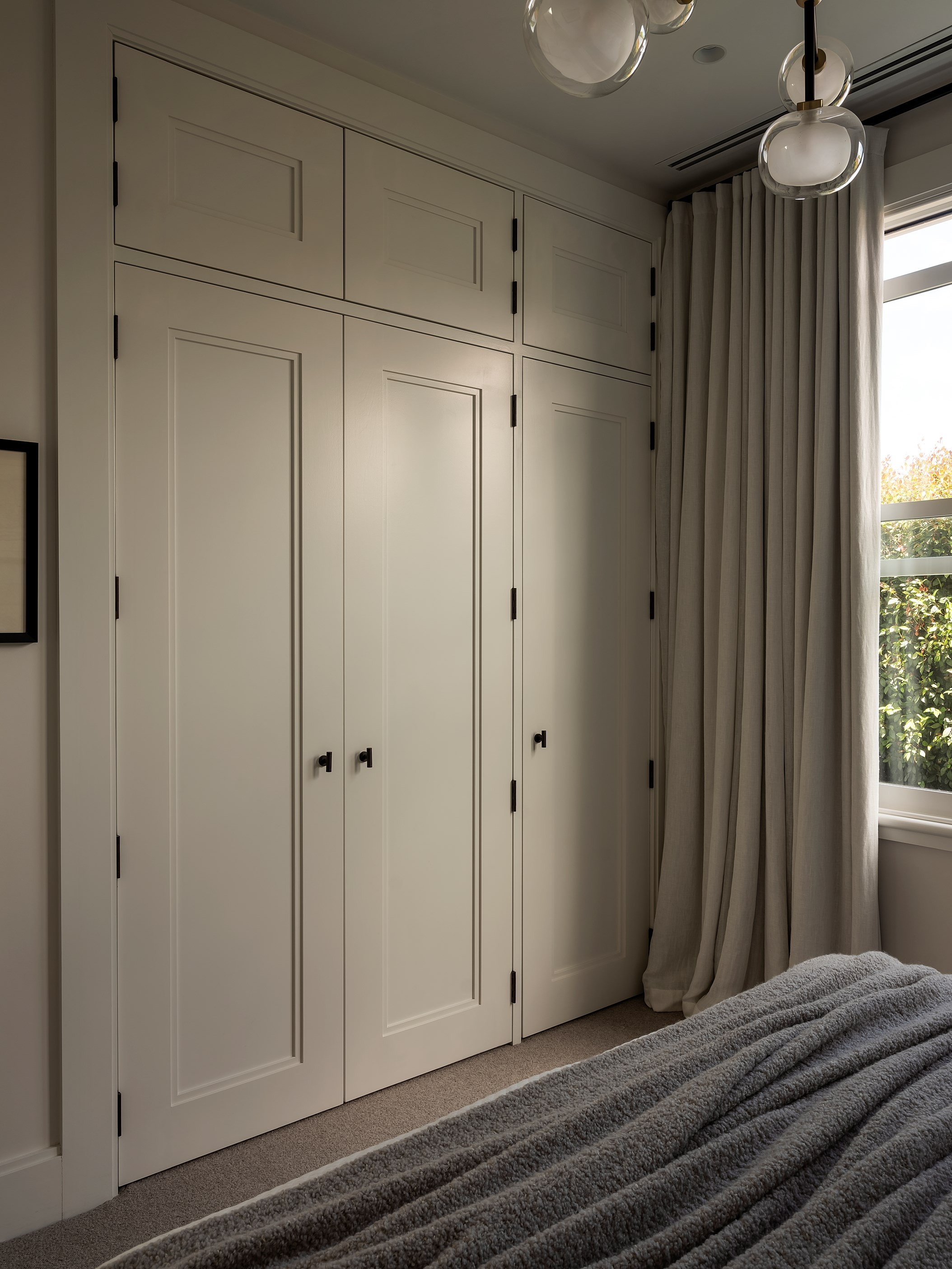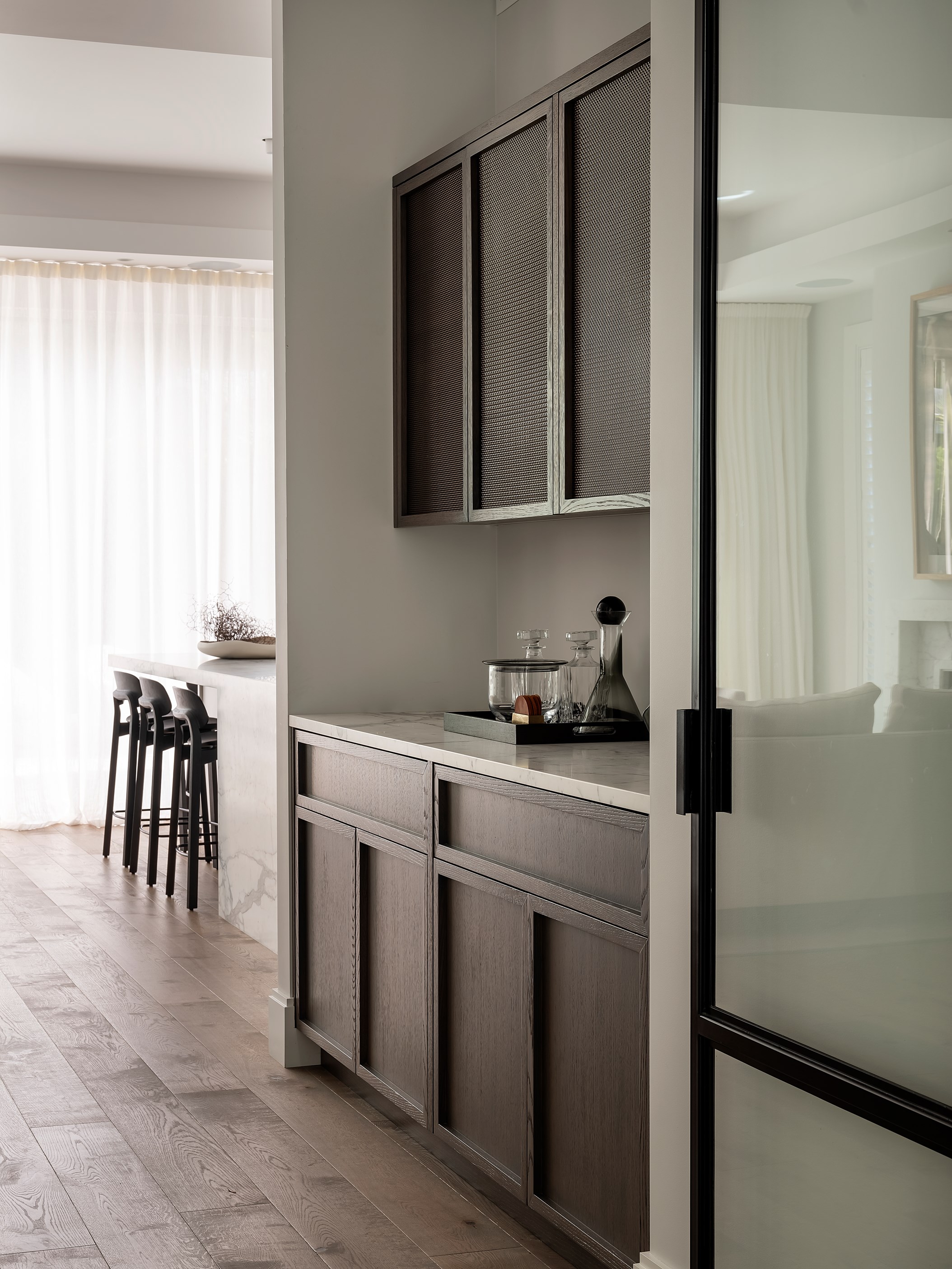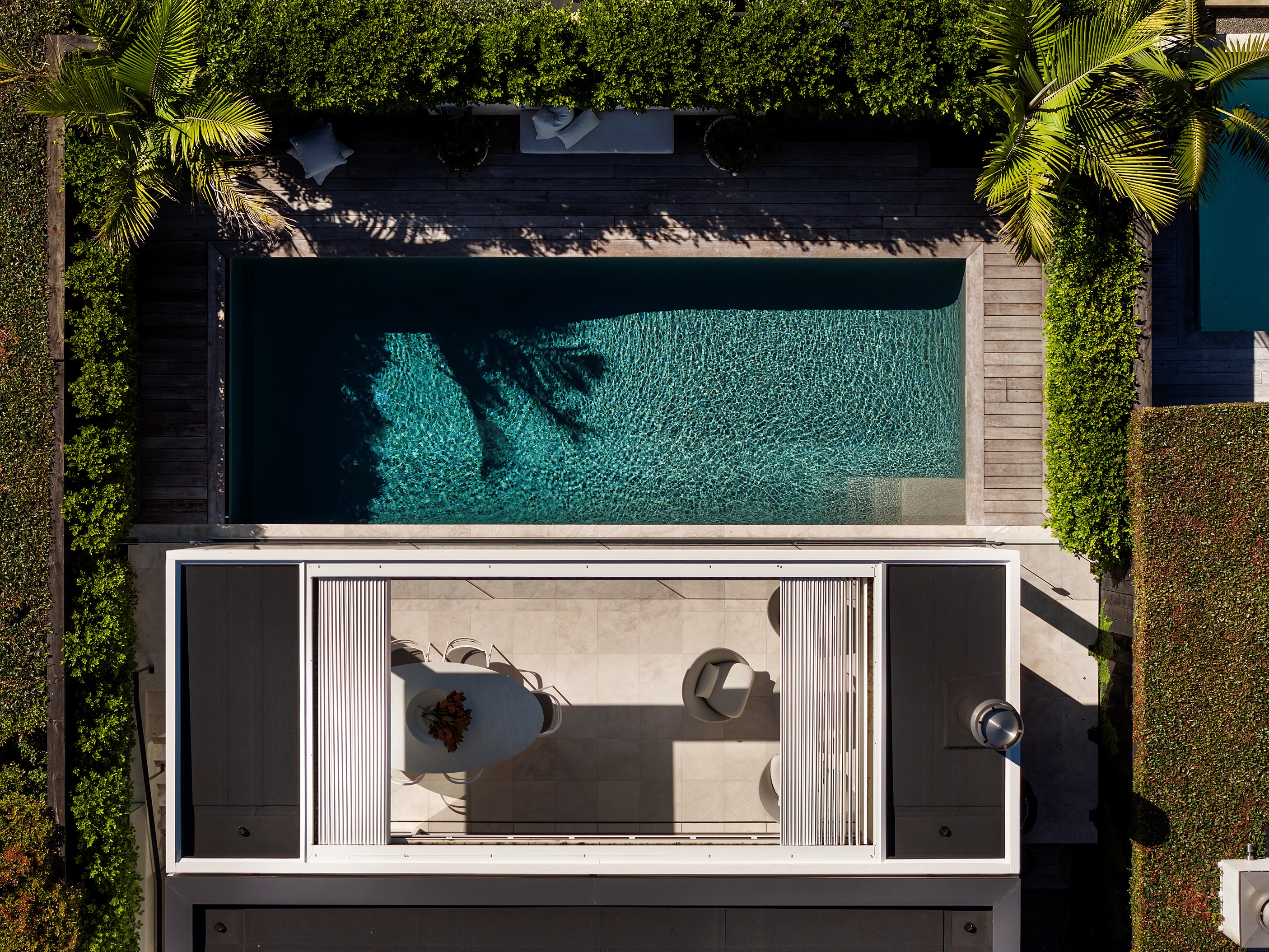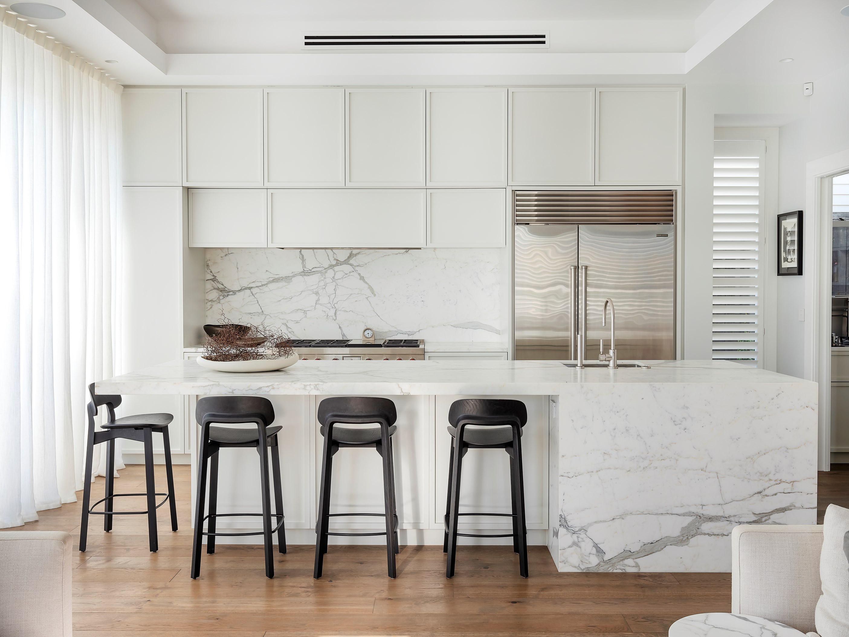 The middle floor, which is at ground level at the back of the section, has three bedrooms, a lounge, family room, laundry, guest powder room and an open-plan living, dining, kitchen zone with scullery. This opens to a covered entertaining area that overlooks the pool. The top floor is within the roof and has been cleverly designed to contain the main bedroom, ensuite and walk-in dressing room. When it came to attention to detail, there was no compromising – and it shows. The slick kitchen and built-in shelving are just a couple of examples. It might look traditional, but the house also has the latest in technology – six separate sound zones and a system which controls lighting, extraction fans, outdoor heaters, the garage door and more.