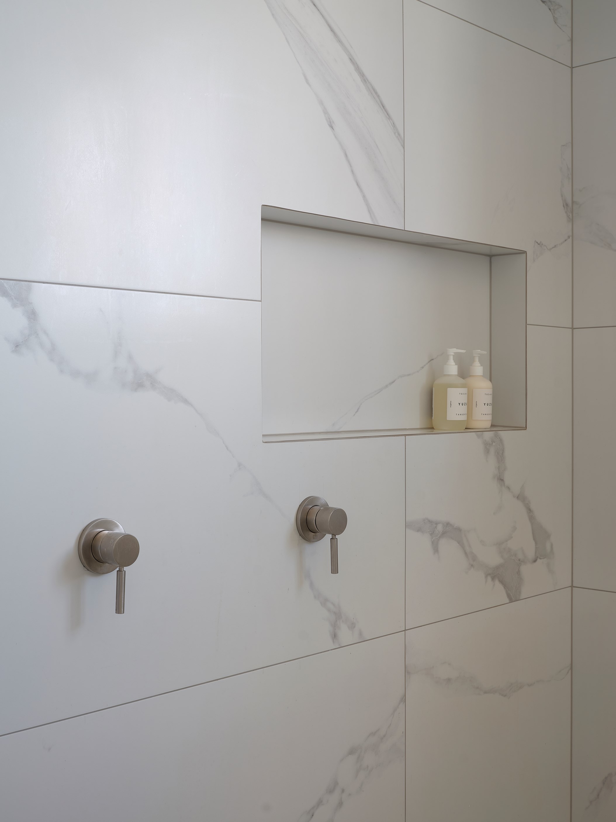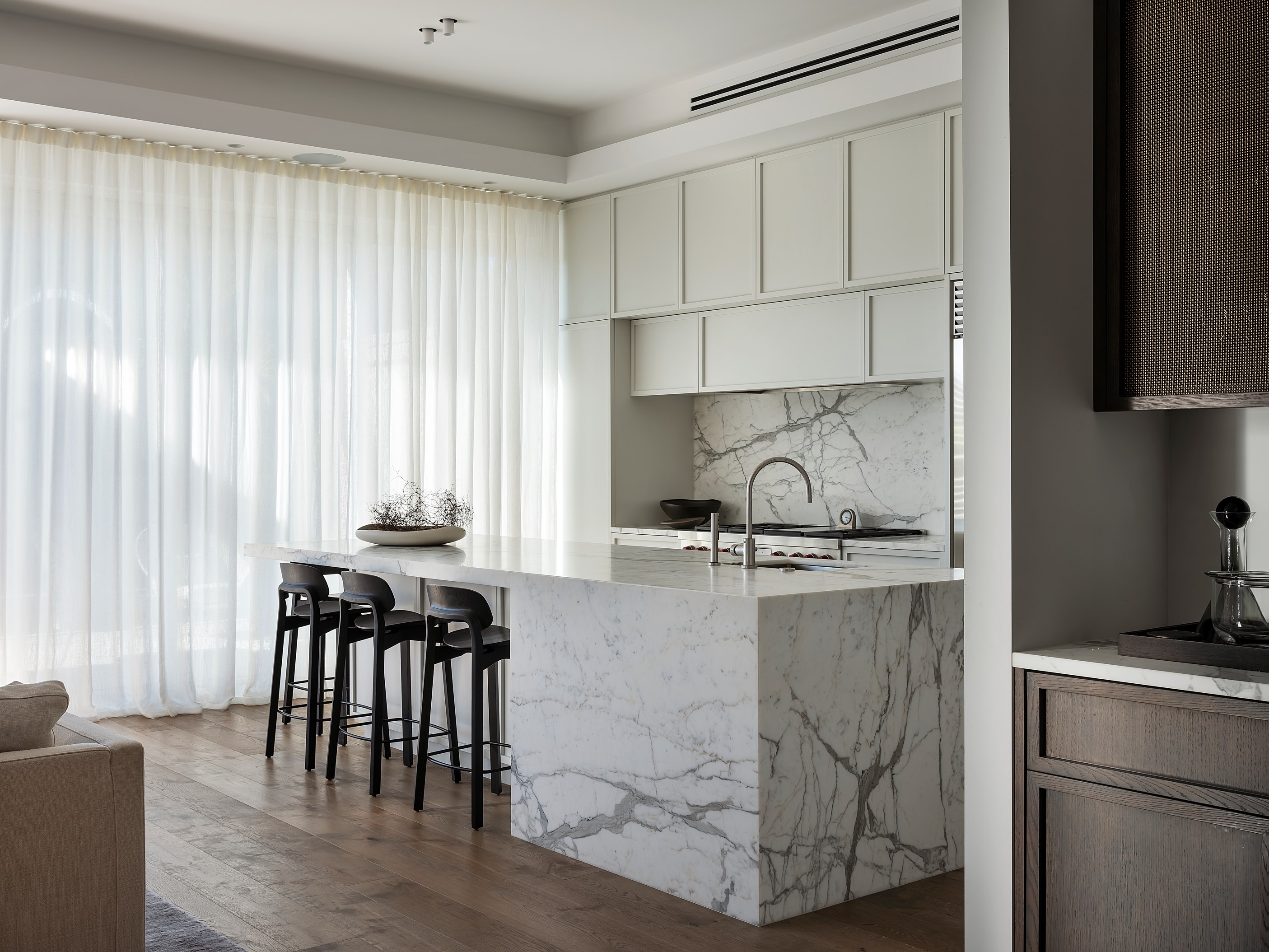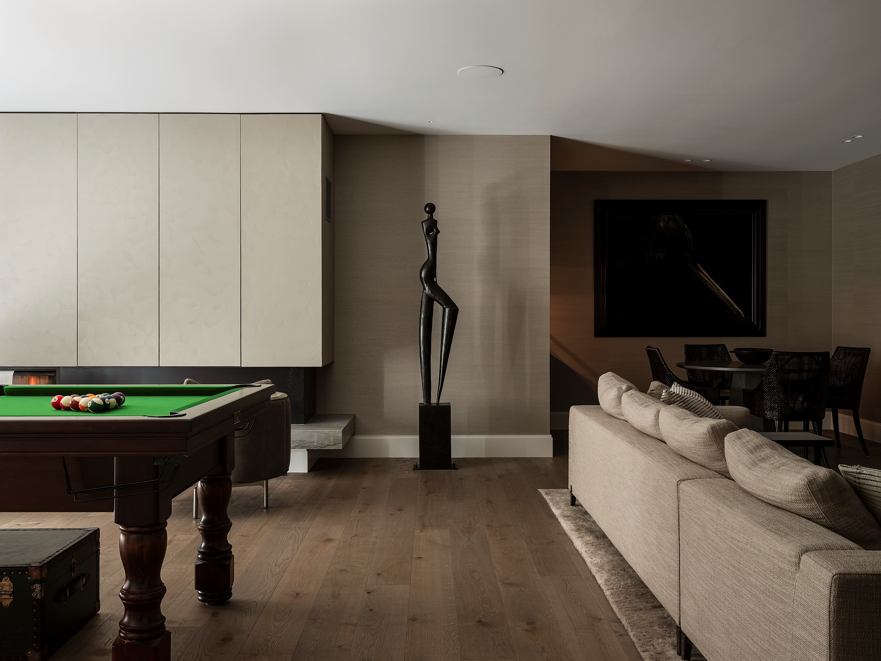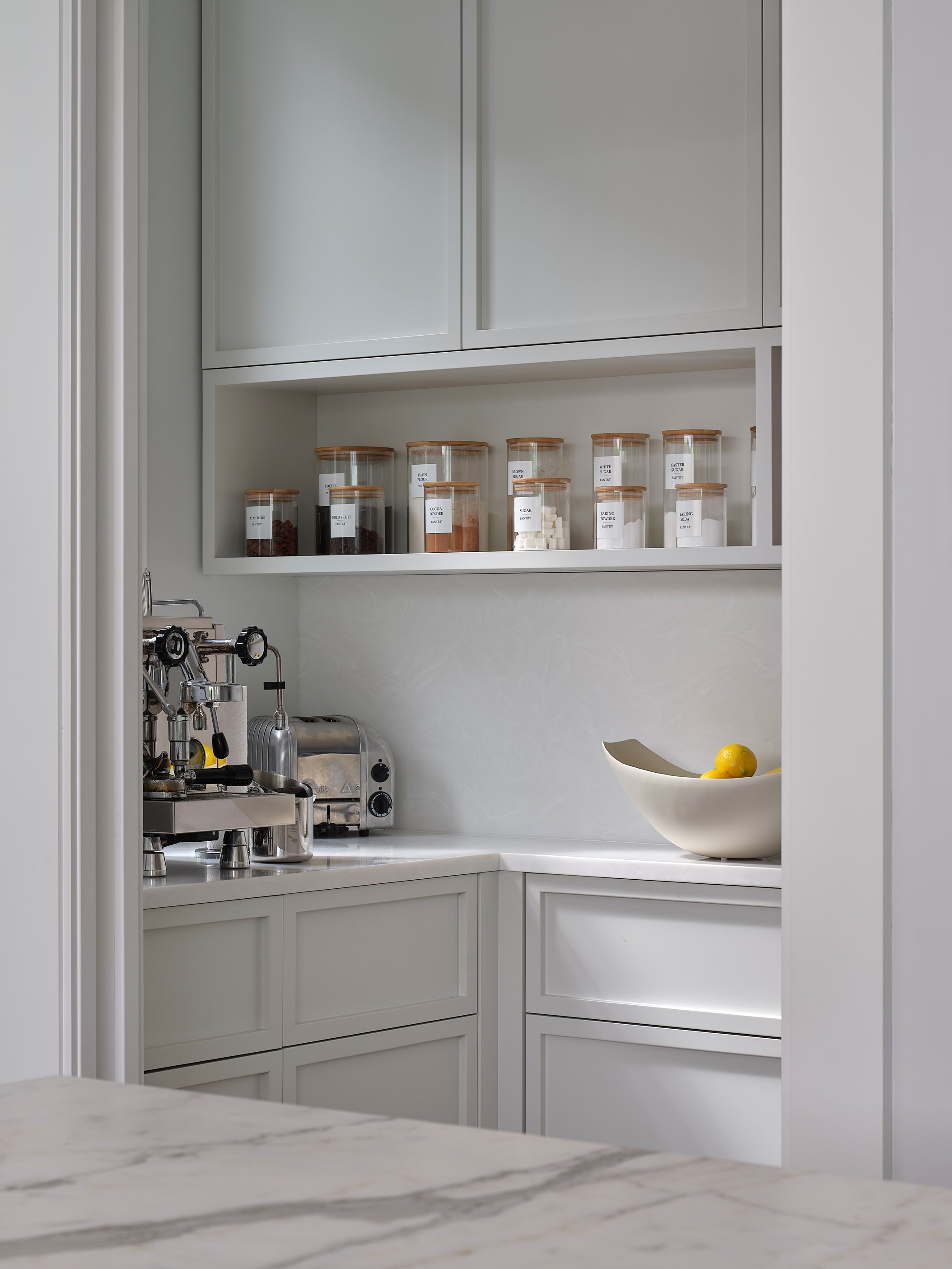 The middle floor, which is at ground level at the back of the section, has three bedrooms, a lounge, family room, laundry, guest powder room and an open-plan living, dining, kitchen zone with scullery. This opens to a covered entertaining area that overlooks the pool. The top floor is within the roof and has been cleverly designed to contain the main bedroom, ensuite and walk-in dressing room. When it came to attention to detail, there was no compromising – and it shows. The slick kitchen and built-in shelving are just a couple of examples. It might look traditional, but the house also has the latest in technology – six separate sound zones and a system which controls lighting, extraction fans, outdoor heaters, the garage door and more.