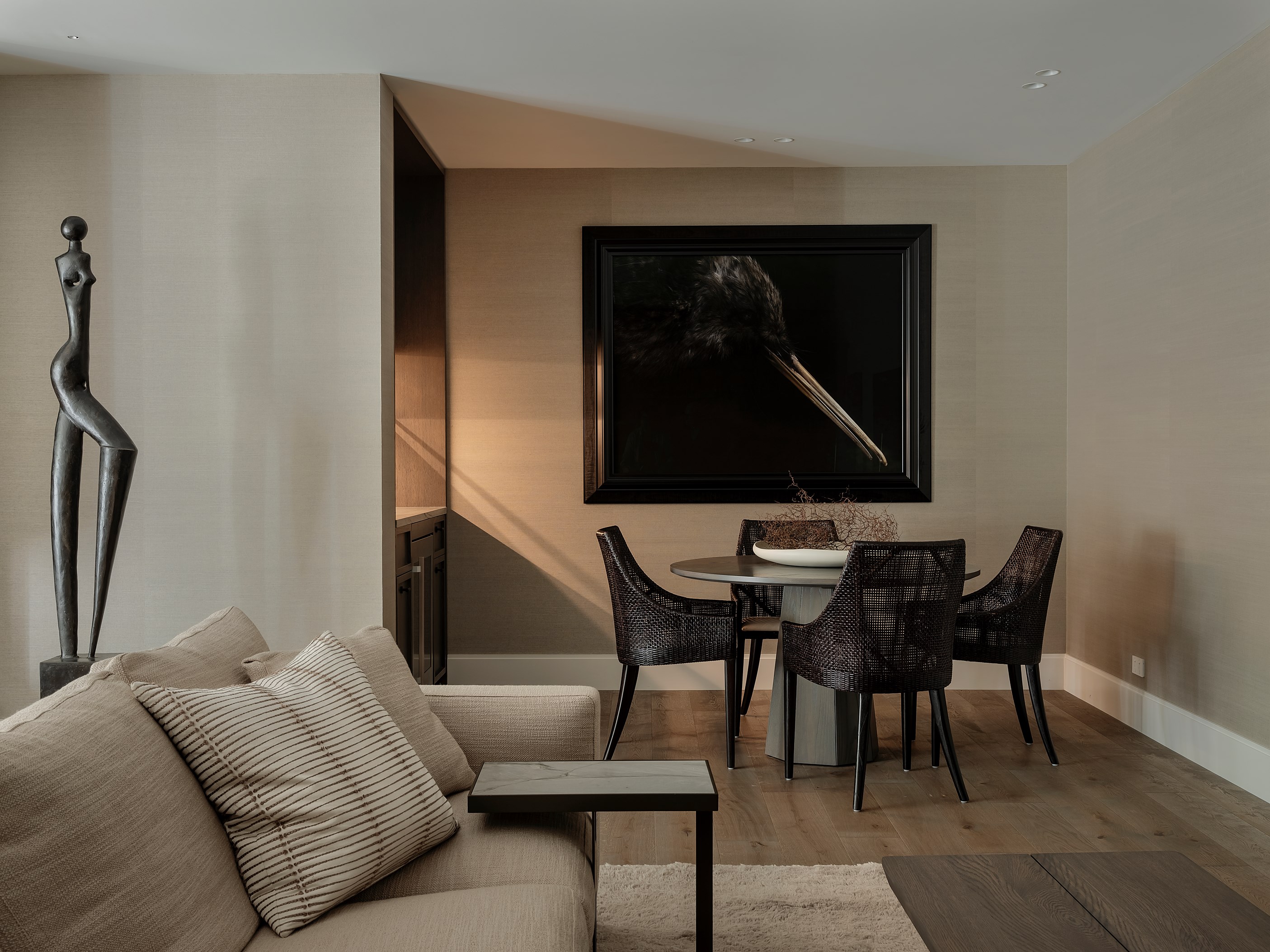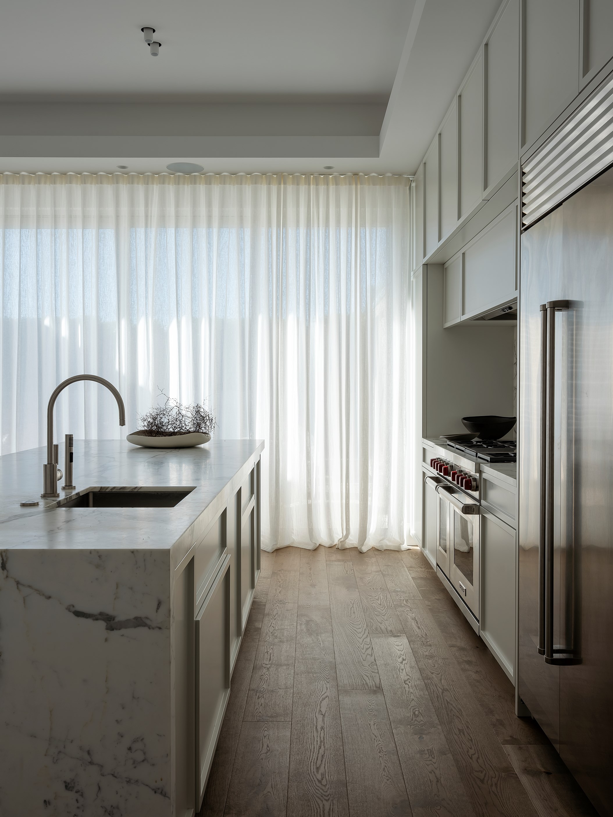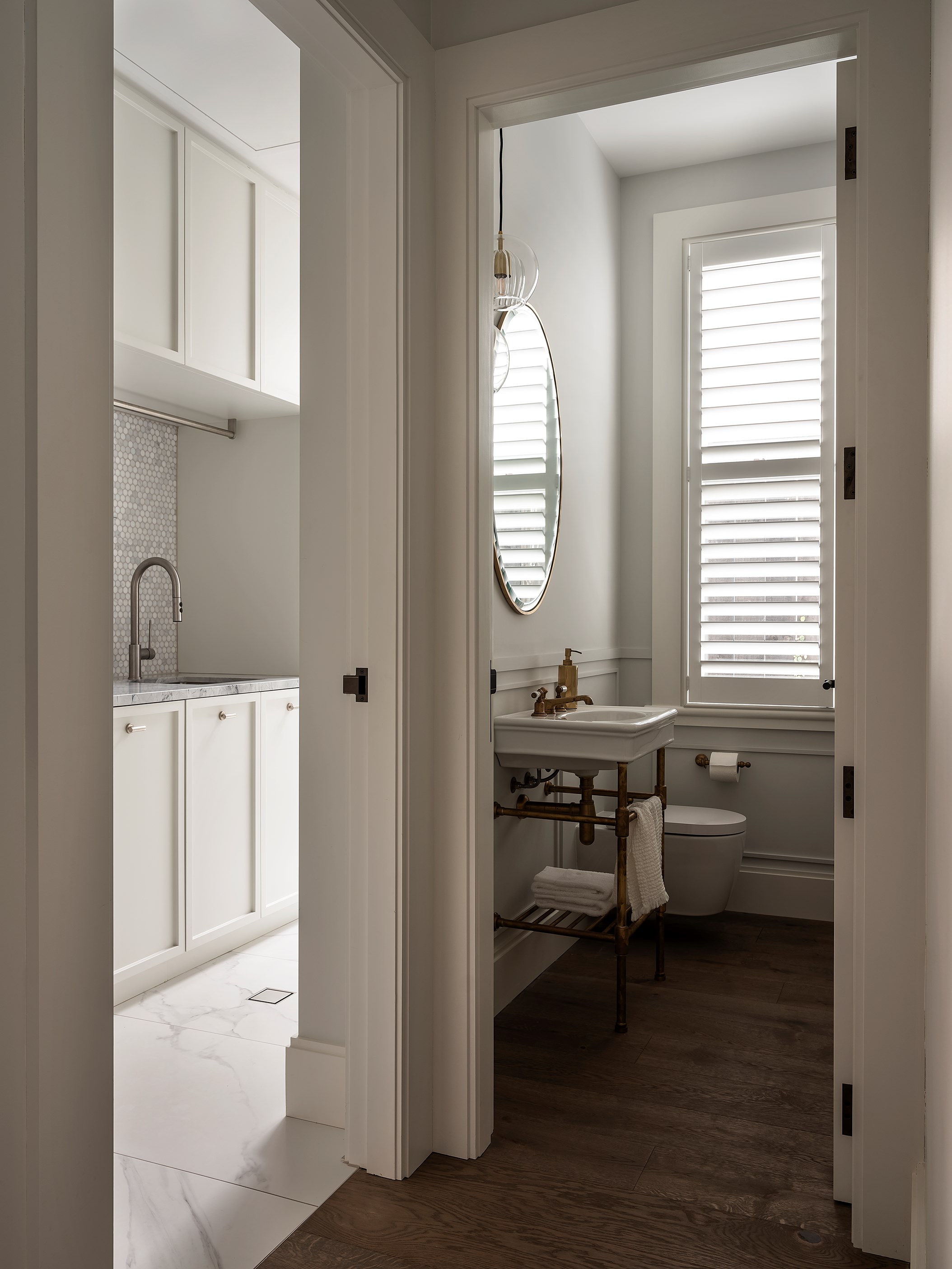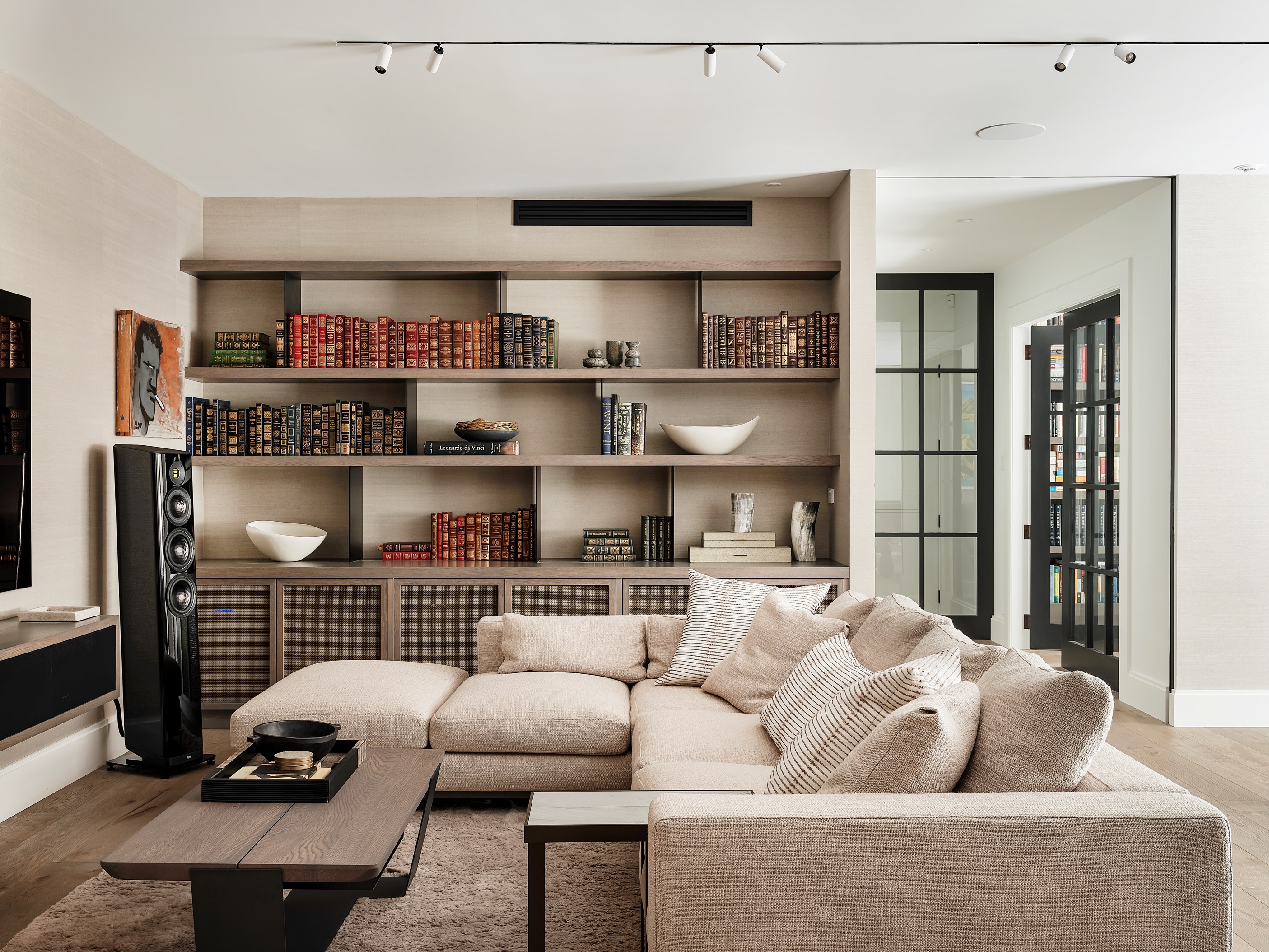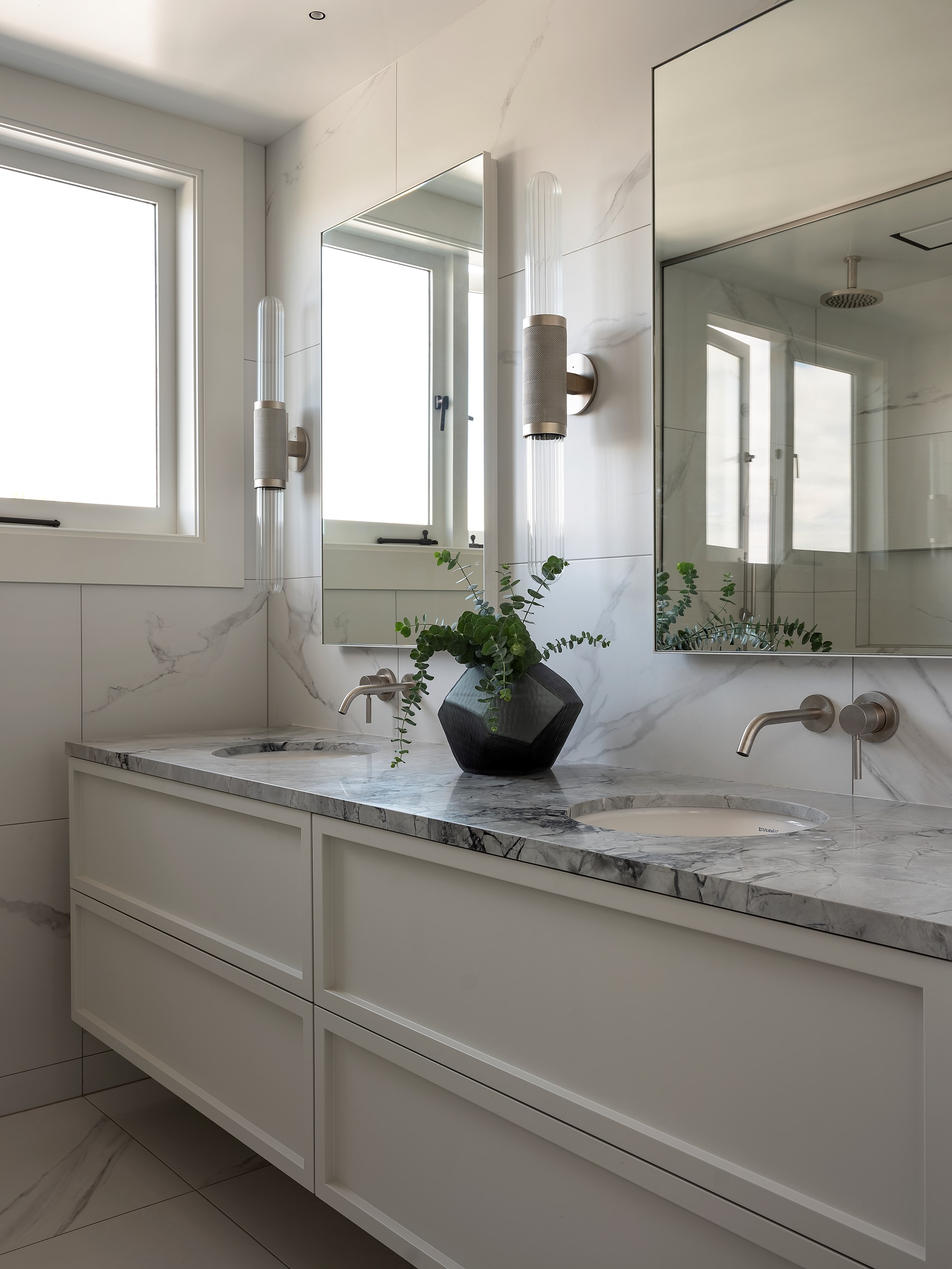 The middle floor, which is at ground level at the back of the section, has three bedrooms, a lounge, family room, laundry, guest powder room and an open-plan living, dining, kitchen zone with scullery. This opens to a covered entertaining area that overlooks the pool. The top floor is within the roof and has been cleverly designed to contain the main bedroom, ensuite and walk-in dressing room. When it came to attention to detail, there was no compromising – and it shows. The slick kitchen and built-in shelving are just a couple of examples. It might look traditional, but the house also has the latest in technology – six separate sound zones and a system which controls lighting, extraction fans, outdoor heaters, the garage door and more.
