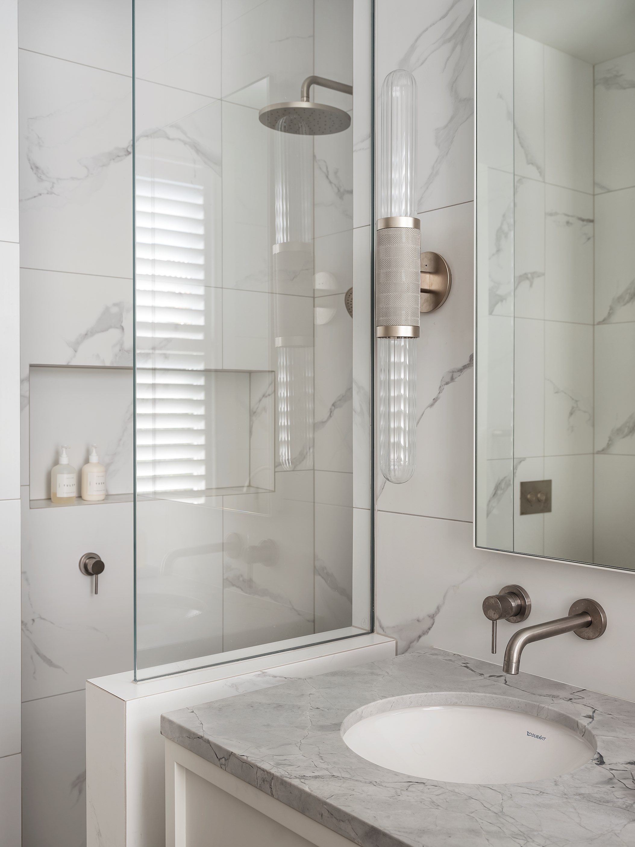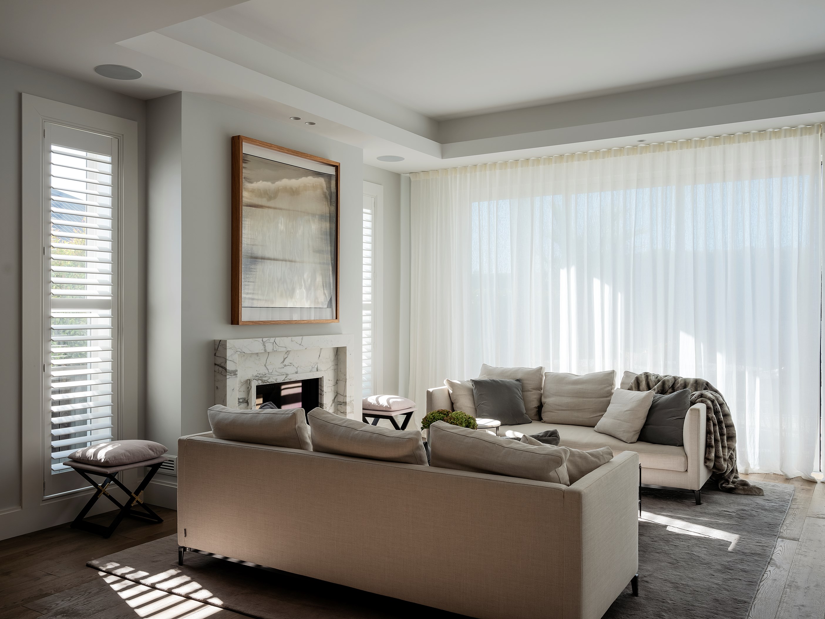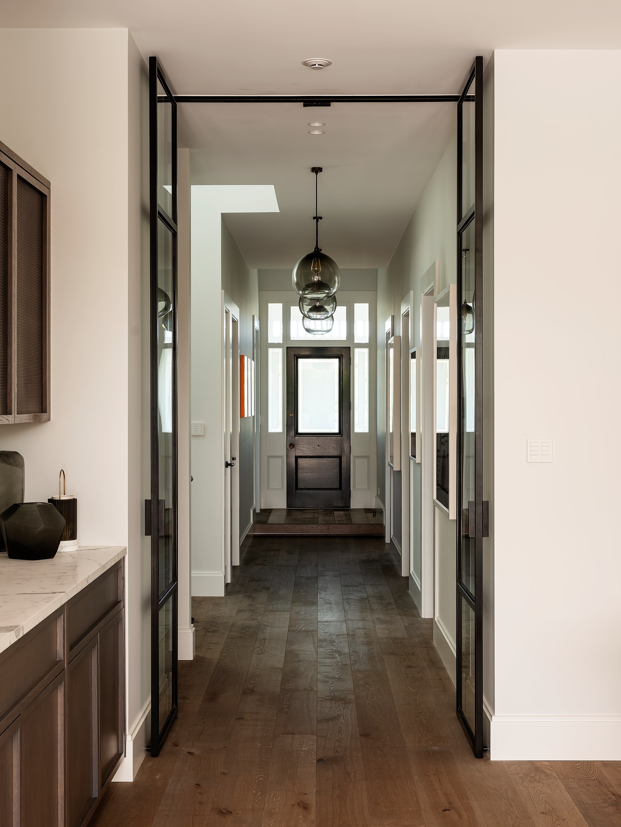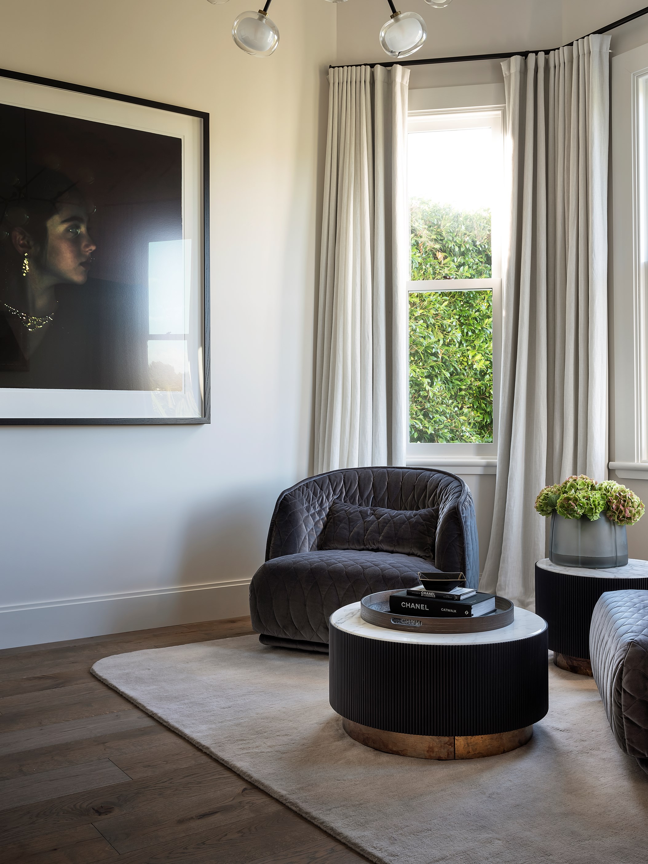 The middle floor, which is at ground level at the back of the section, has three bedrooms, a lounge, family room, laundry, guest powder room and an open-plan living, dining, kitchen zone with scullery. This opens to a covered entertaining area that overlooks the pool. The top floor is within the roof and has been cleverly designed to contain the main bedroom, ensuite and walk-in dressing room. When it came to attention to detail, there was no compromising – and it shows. The slick kitchen and built-in shelving are just a couple of examples. It might look traditional, but the house also has the latest in technology – six separate sound zones and a system which controls lighting, extraction fans, outdoor heaters, the garage door and more.