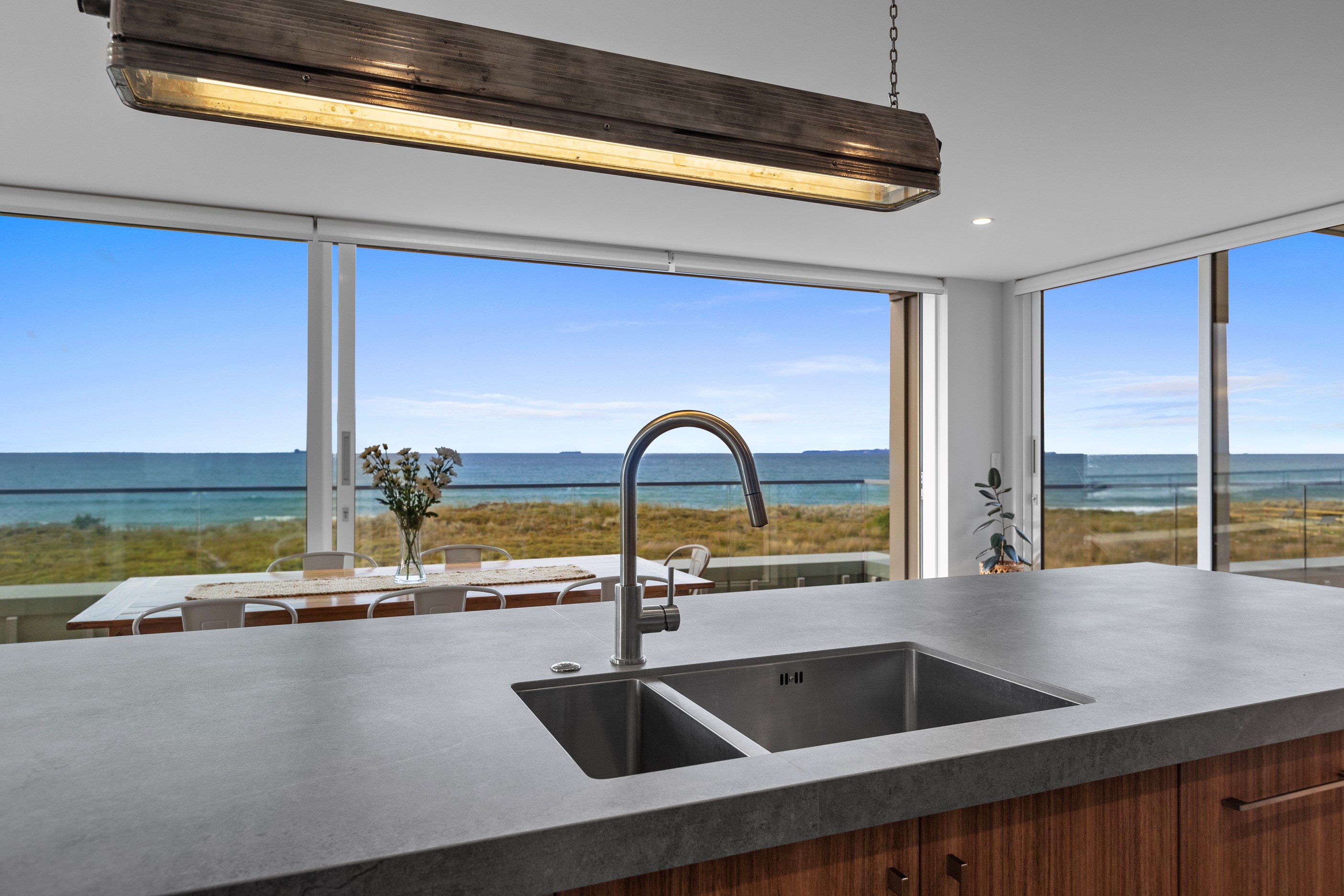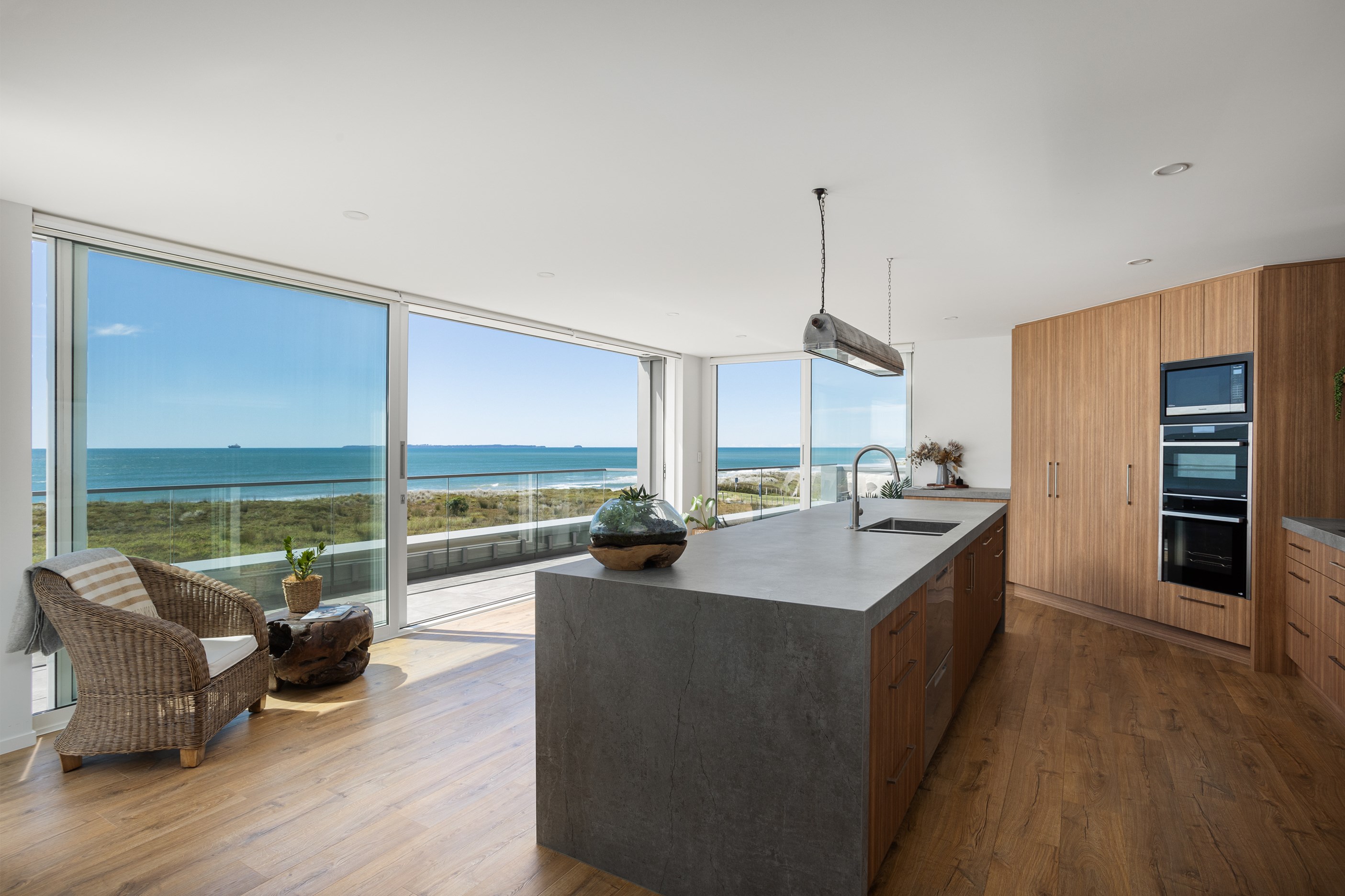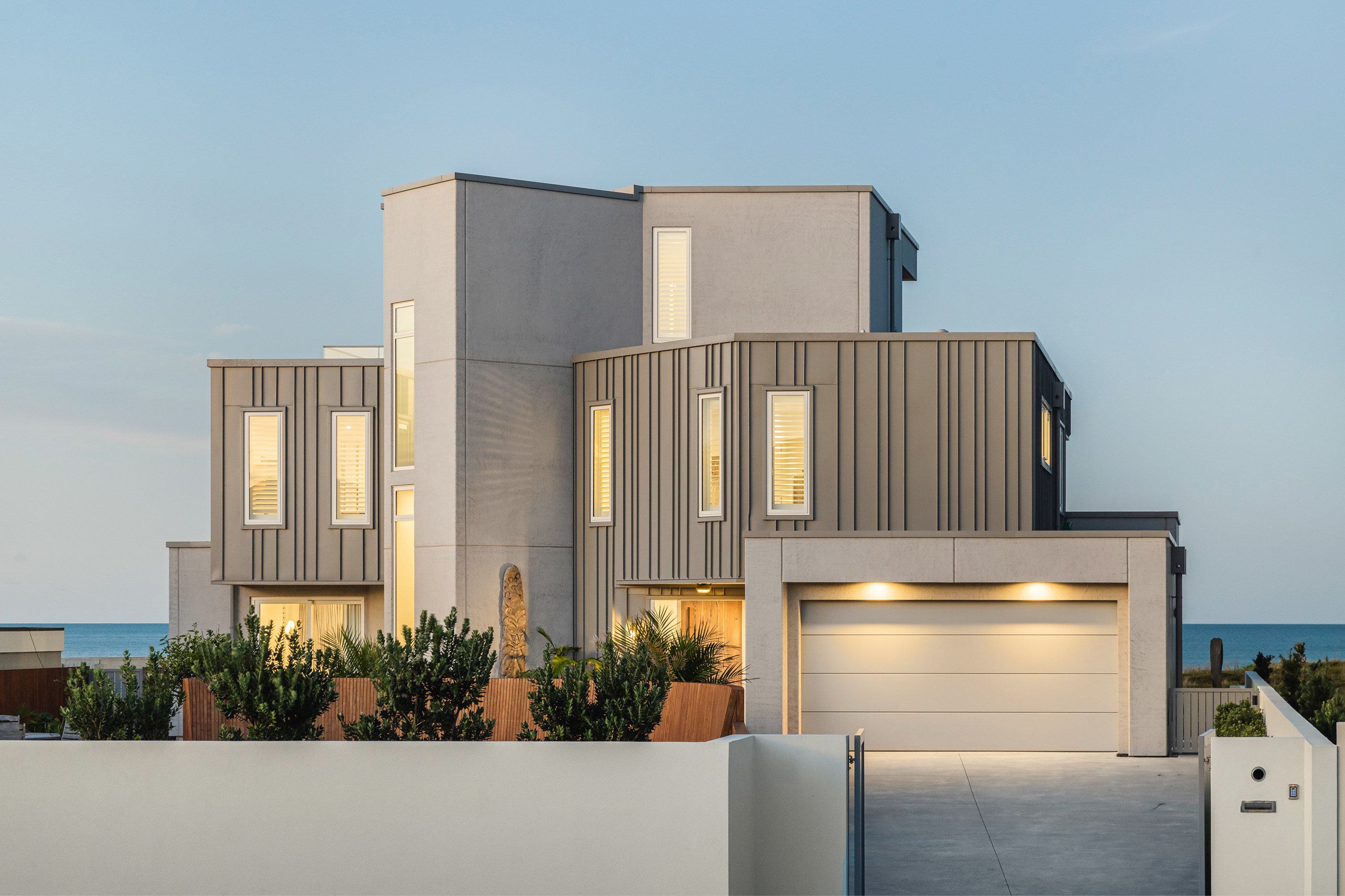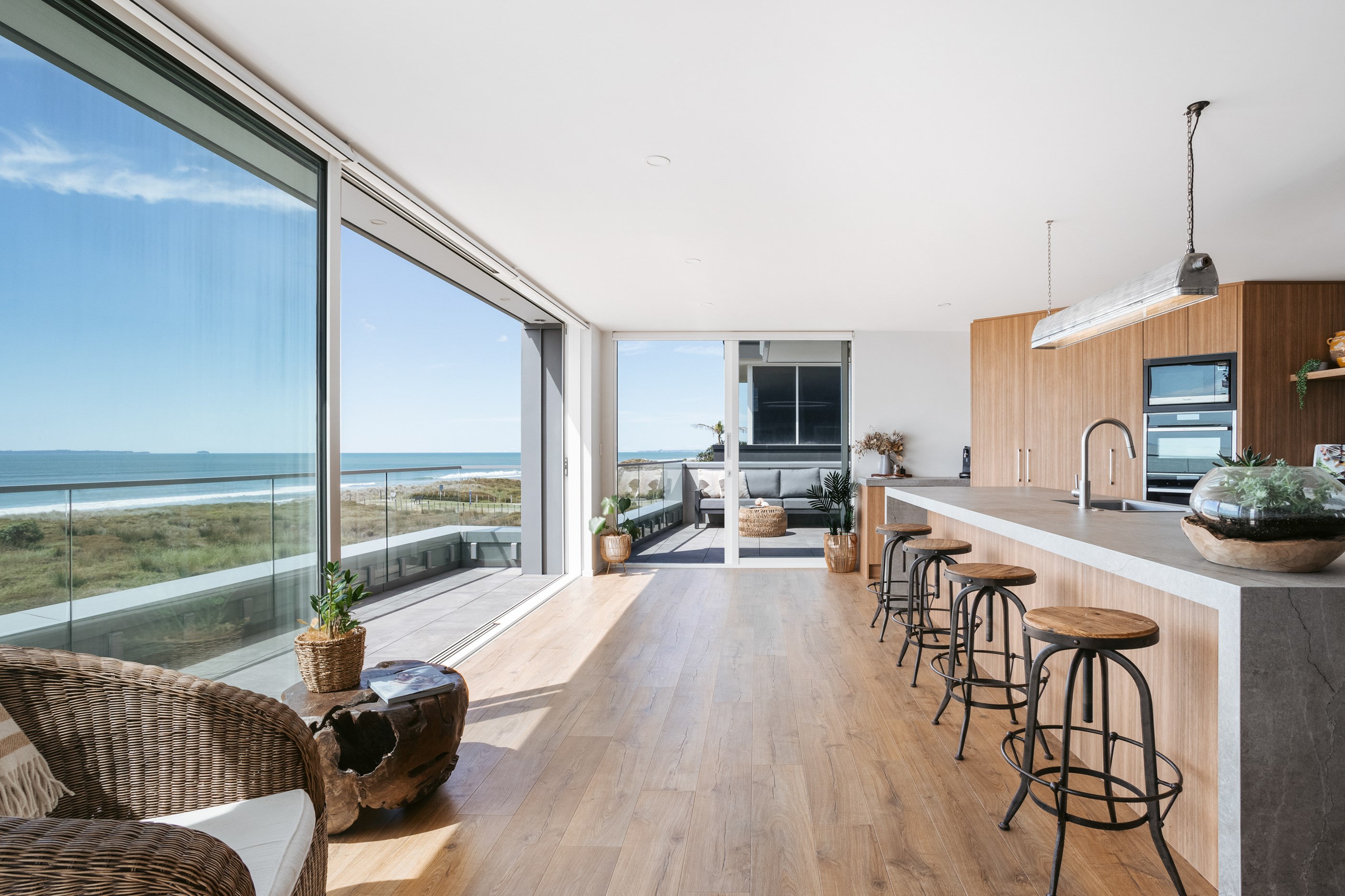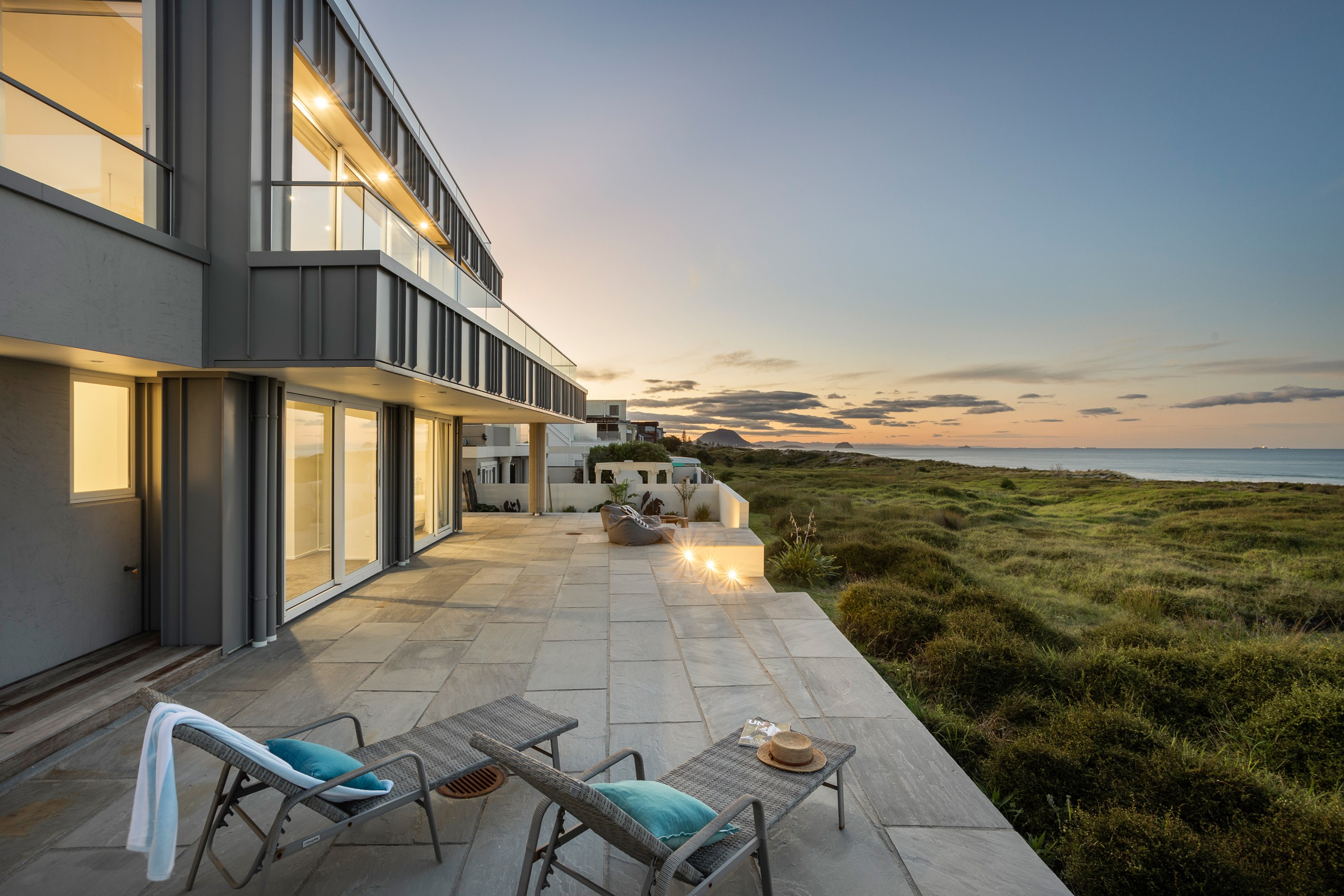 Nestling serenely among the sand dunes of Mount Maunganui beach, a high-end metamorphosis has breathed new life into a dated waterfront property that now stands as a testament to the power of restoration, craftsmanship and innovative design. The ambitious project has infused modern aesthetics into every facet of the residence, including reshaping the structure. A lowmaintenance concrete-plaster system, with the look of precast concrete panels, rejuvenates the exterior adding sophistication, robustness and timeless appeal. Vertical rolled-seam trays, arranged in a captivating pattern, add contrast and texture. Making the most of the panoramic coastal views, all interior spaces have been opened up for comfortable living, with swathes of glass doors allowing the indoors to seamlessly integrate with the outdoors and the ocean beyond.